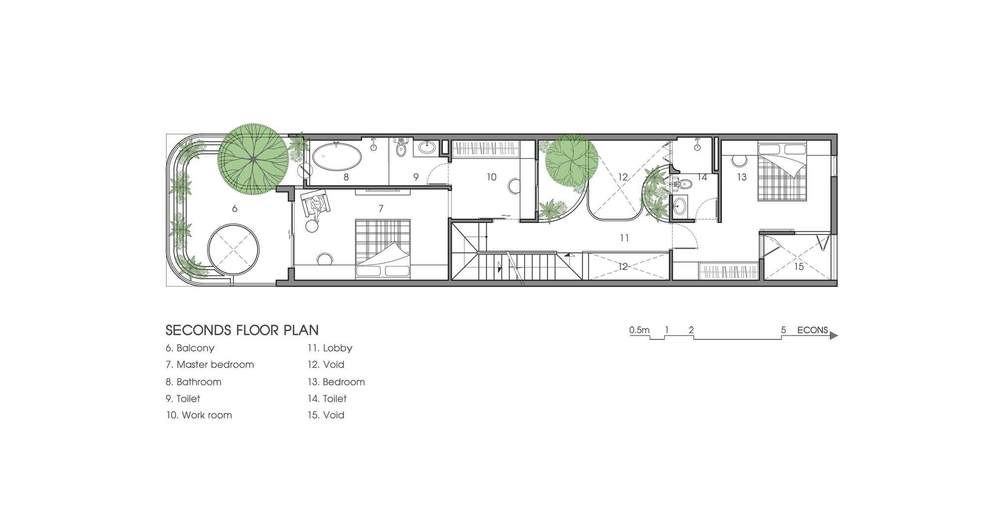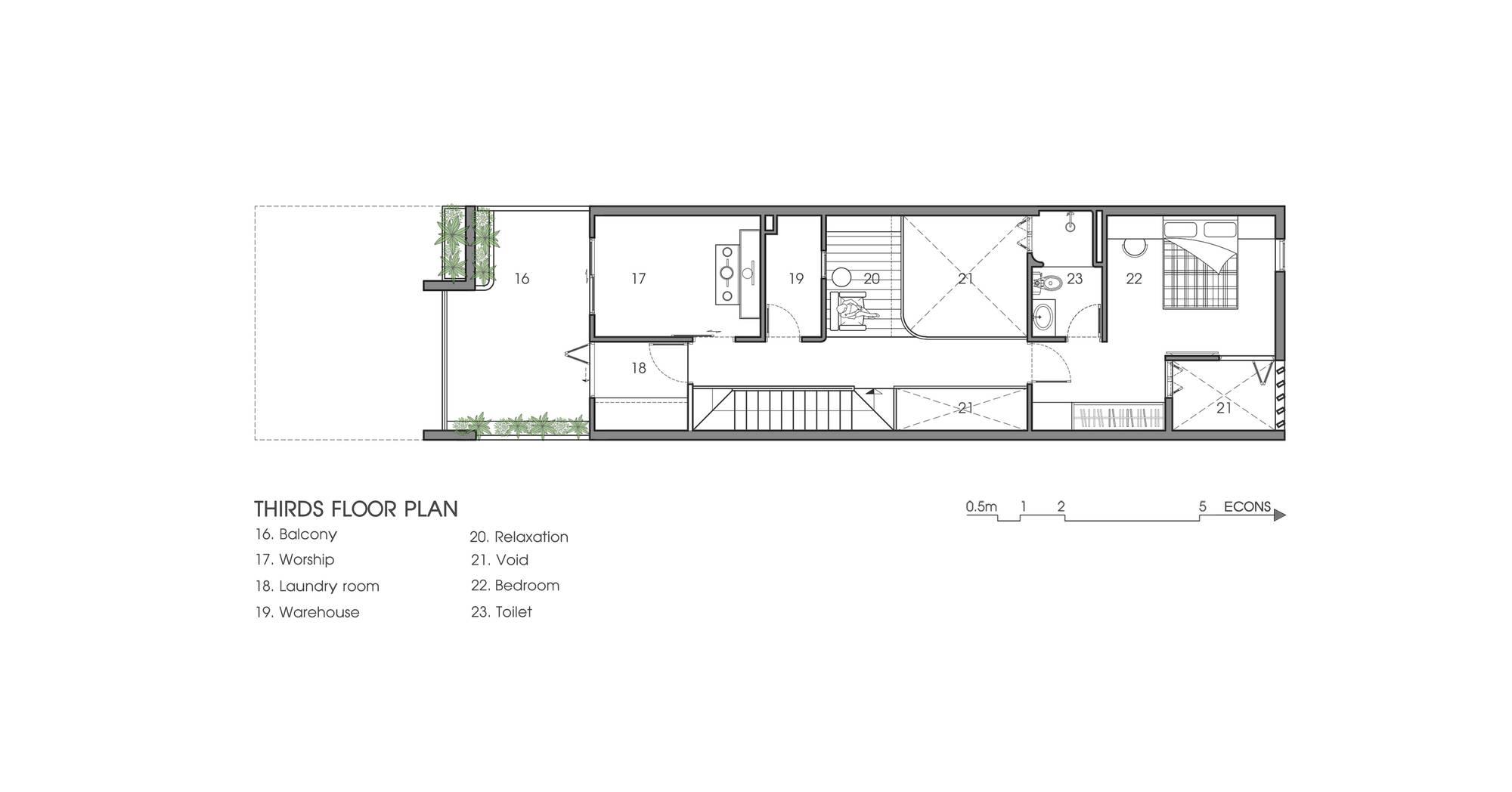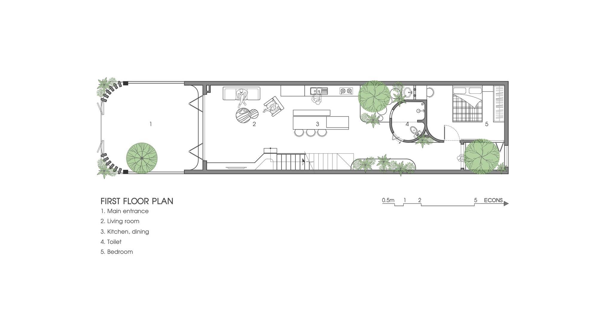 Với việc bố trí không gian chung ở tầng 1 và các không gian sân vườn, các KTS của chúng tôi mong muốn đẩy mạnh sự giao lưu, kết nối giữa những người sống trong nhà, tại các khoảng thông tầng mọi người có thể giao lưu với các không gian khác trong nhà. Từ đó khuyến khích các hoạt động chung của gia đình.