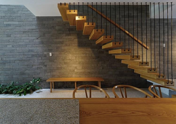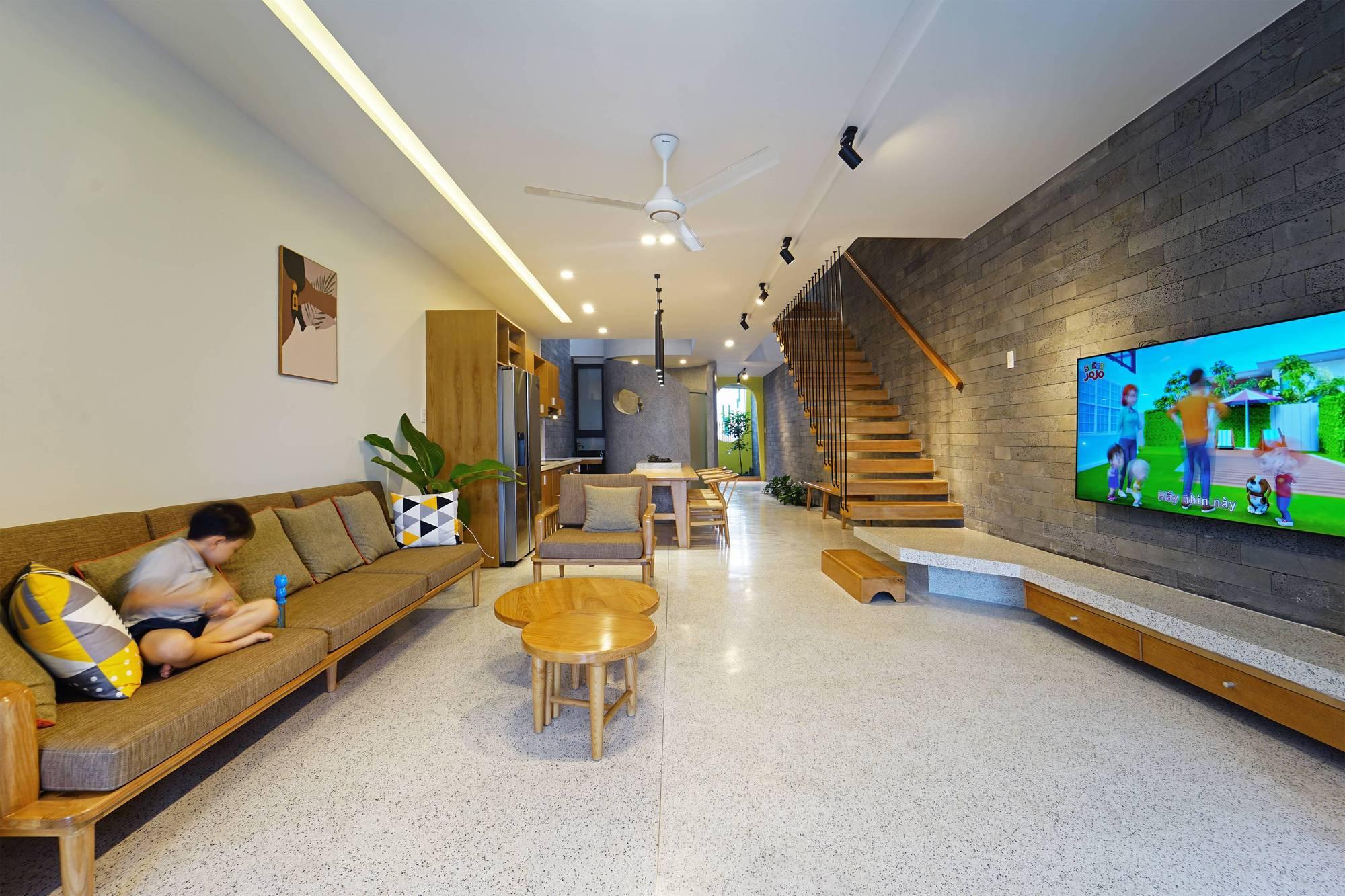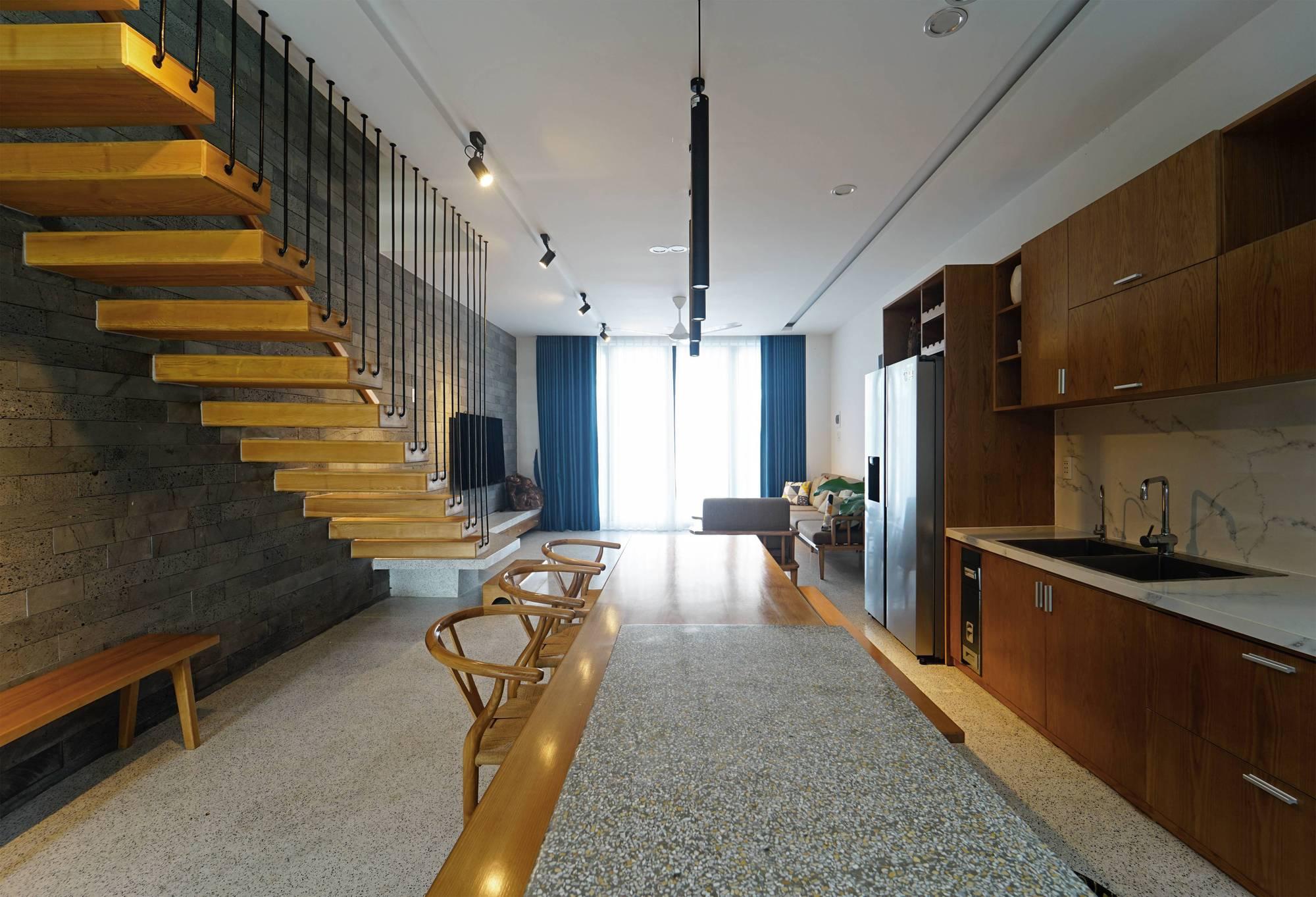 Về không gian nội thất, gỗ được sử dụng làm chất liệu nội thất chính tạo cảm giác ấm cúng cho ngôi nhà. Bên cạnh đó, kết hợp các gam màu trung tính xung quanh thông tầng để giảm nhiệt độ cao và điều hòa nhiệt độ bên trong ngôi nhà một cách đáng kể. Từ những yếu tố trên mới có một “Dzmoon” đủ riêng tư - đủ kết nối - không gian sống chan hòa nắng gió.