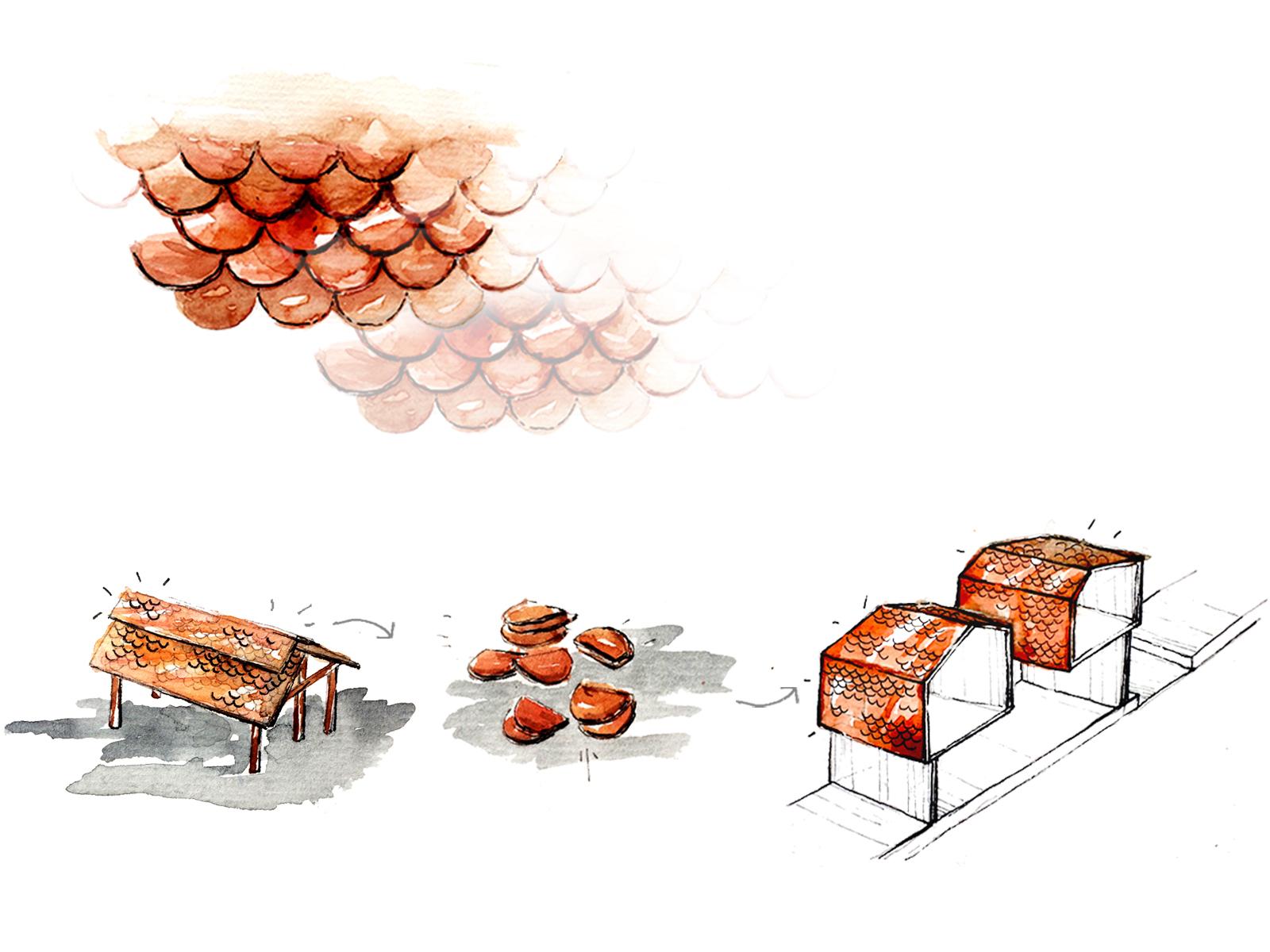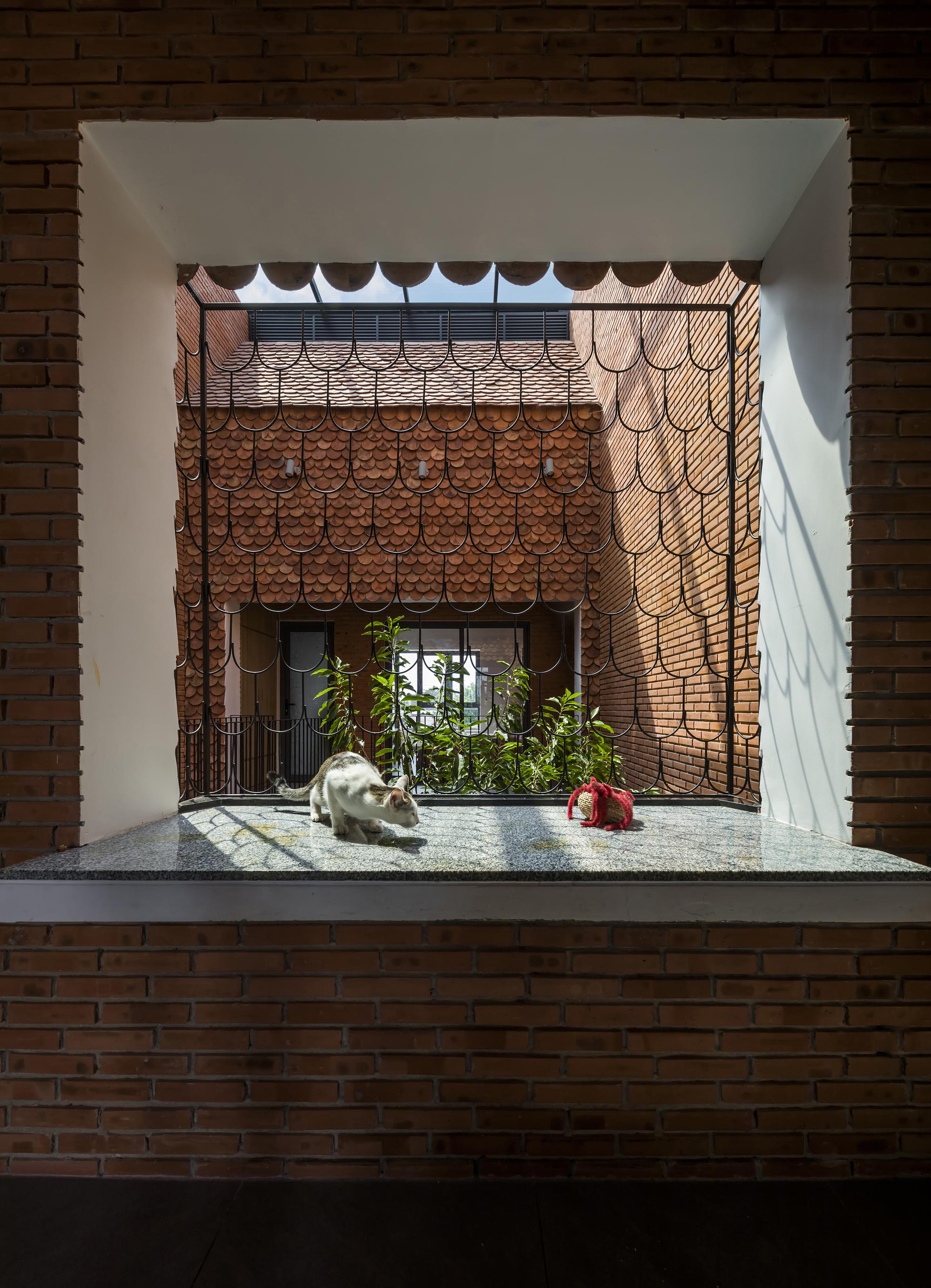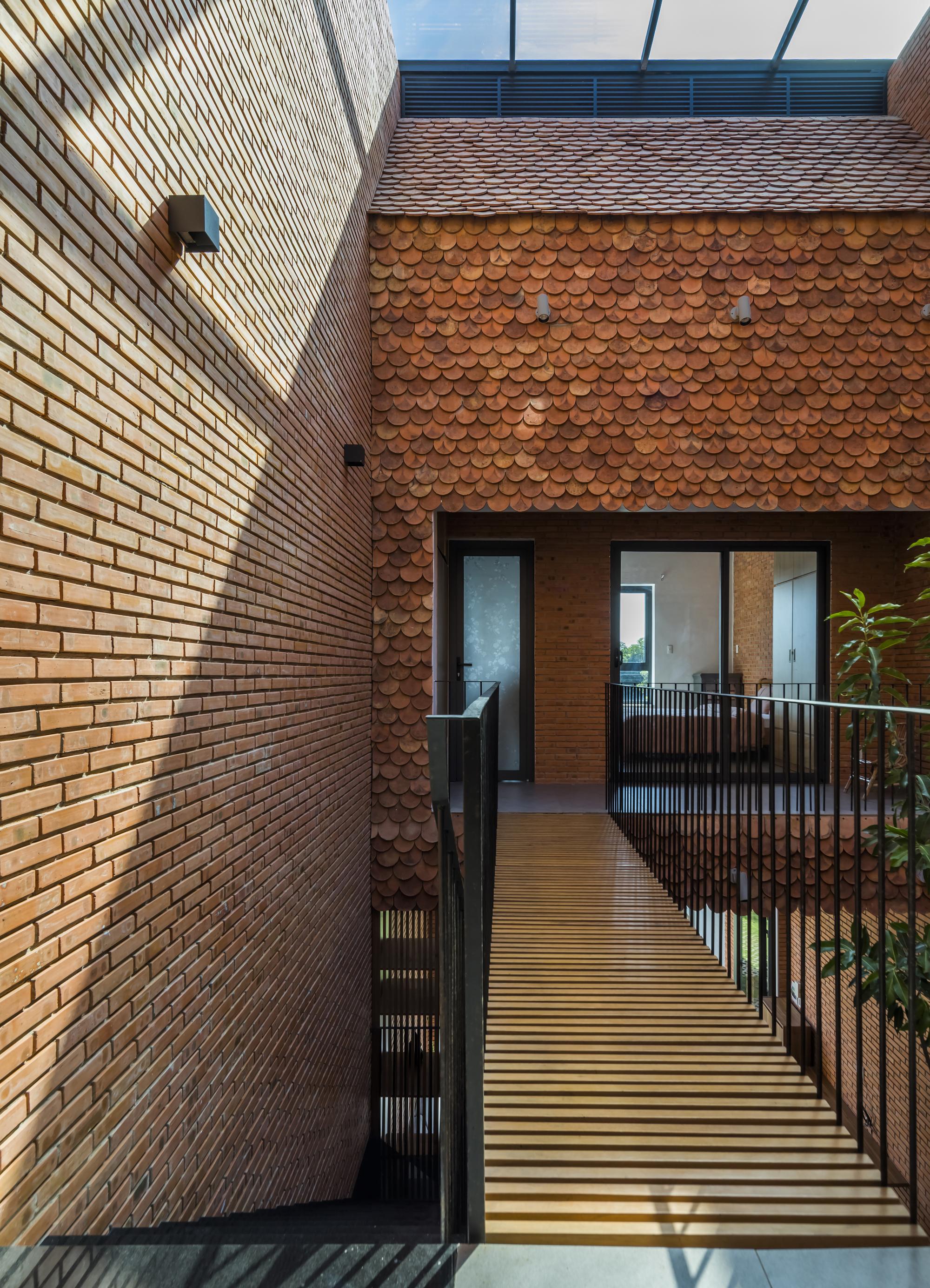 Ngoài việc xác định đủ nhu cầu xây dựng, việc sử dụng tường gạch thô còn giúp giảm chi phí hoàn thiện tường hay chi phí bảo dưỡng chống nứt, sơn, sửa tường hàng năm. Ngói vảy cá cũ được tái chế đã mang màu thời gian, cho ta cảm giác mộc mạc, gần gũi mà màu ngói mới khó có được. Hệ thống ngói vảy cá bao bọc bốn mái hiên trong và ngoài nhà tạo nên hình khối hài hòa với công năng sử dụng. Tất cả tạo nên một “hiên ngang bình yên” của riêng mình, một chốn bình yên lưu giữ mọi kỷ niệm của gia đình.