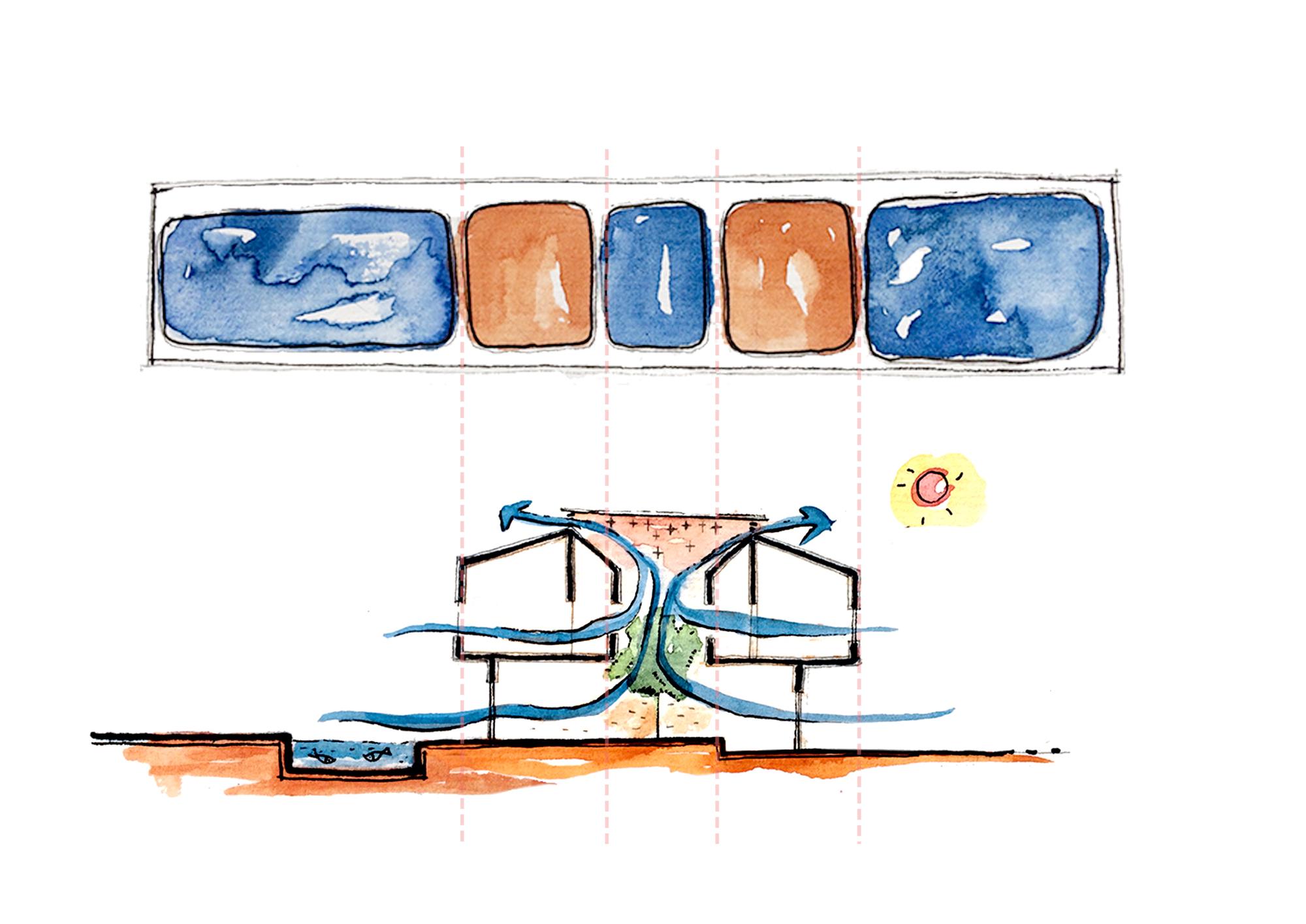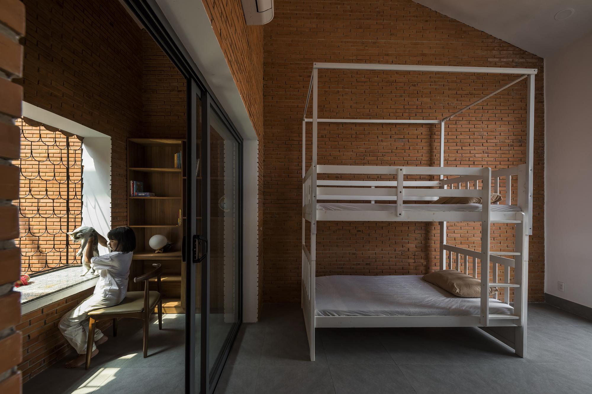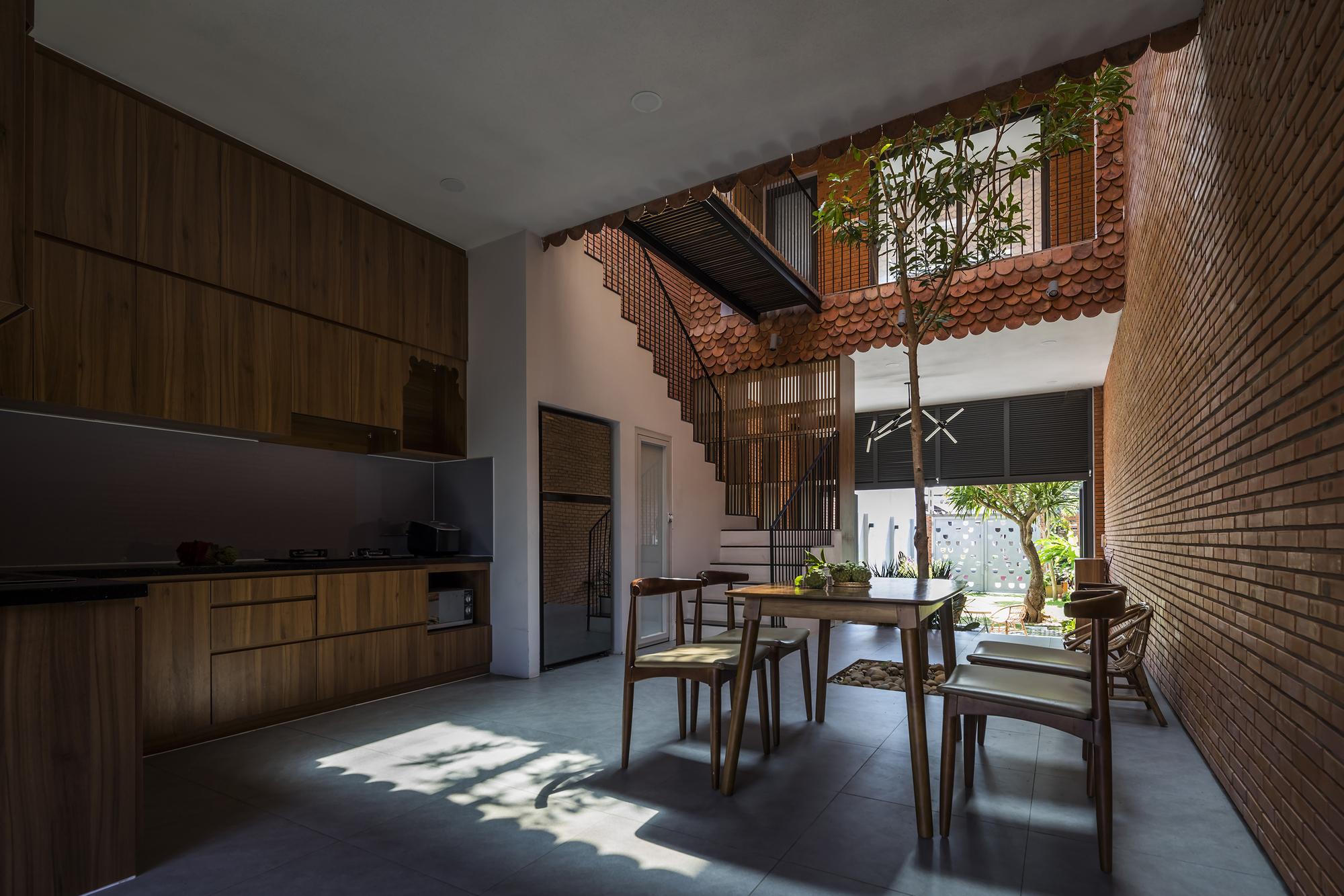 Sự ngăn cách giữa các khối công trình đảm bảo sự thông thoáng, tận dụng tối đa ánh sáng tự nhiên cho mọi không gian, hạn chế năng lượng chiếu sáng và làm mát. Không gian hai hiên bên trong ngôi nhà là nơi sinh hoạt chung của gia đình, gắn kết các thành viên, giúp mọi người có thể dễ dàng nhìn thấy nhau. Đây là nơi cả gia đình cùng nhau dùng bữa, nơi các con học bài, bố nằm võng, mẹ thư giãn, đọc sách hoặc nấu ăn. Mái hiên được hạ thấp, bao bọc lấy không gian học tập của hai bé, tạo nên một không gian vừa có cảm giác ấm áp, an toàn nhưng vẫn thông thoáng, uyển chuyển.