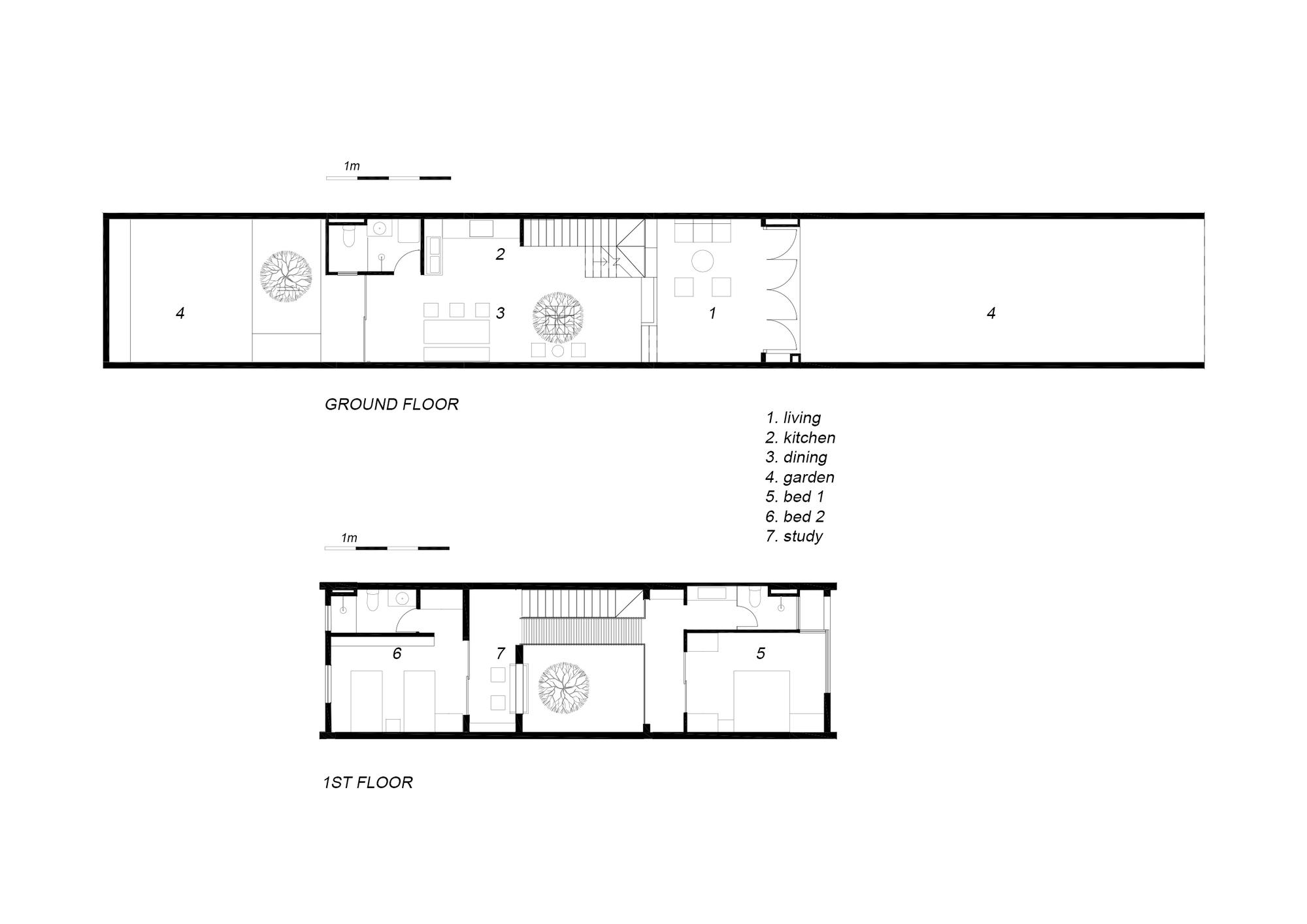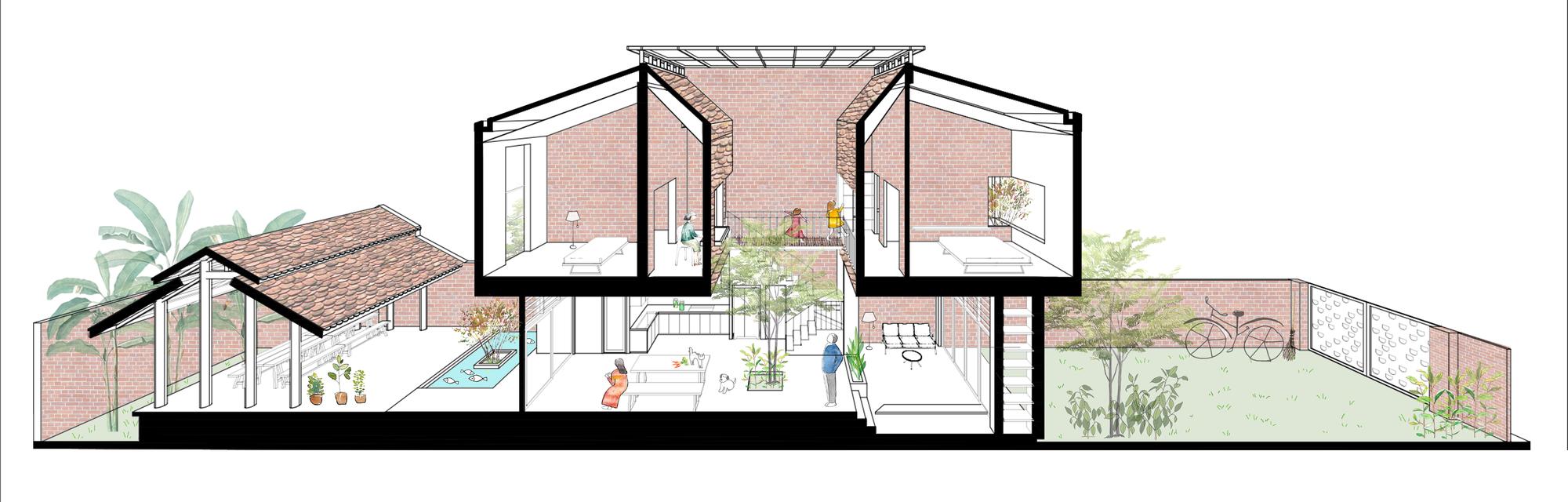 Nó được đề xuất là một ngôi nhà hai tầng, chiếm ít hơn một nửa diện tích đất. Phần đất còn lại làm vườn trước và sau nhà vừa là cảnh quan vừa là không gian tụ tập bạn bè, nơi chồng chăm cây, vợ trồng rau, con cái vui chơi. Khu vườn cung cấp gió và ánh sáng tự nhiên cho ngôi nhà trong một khu đô thị mà các tòa nhà bê tông liên tục mọc lên.