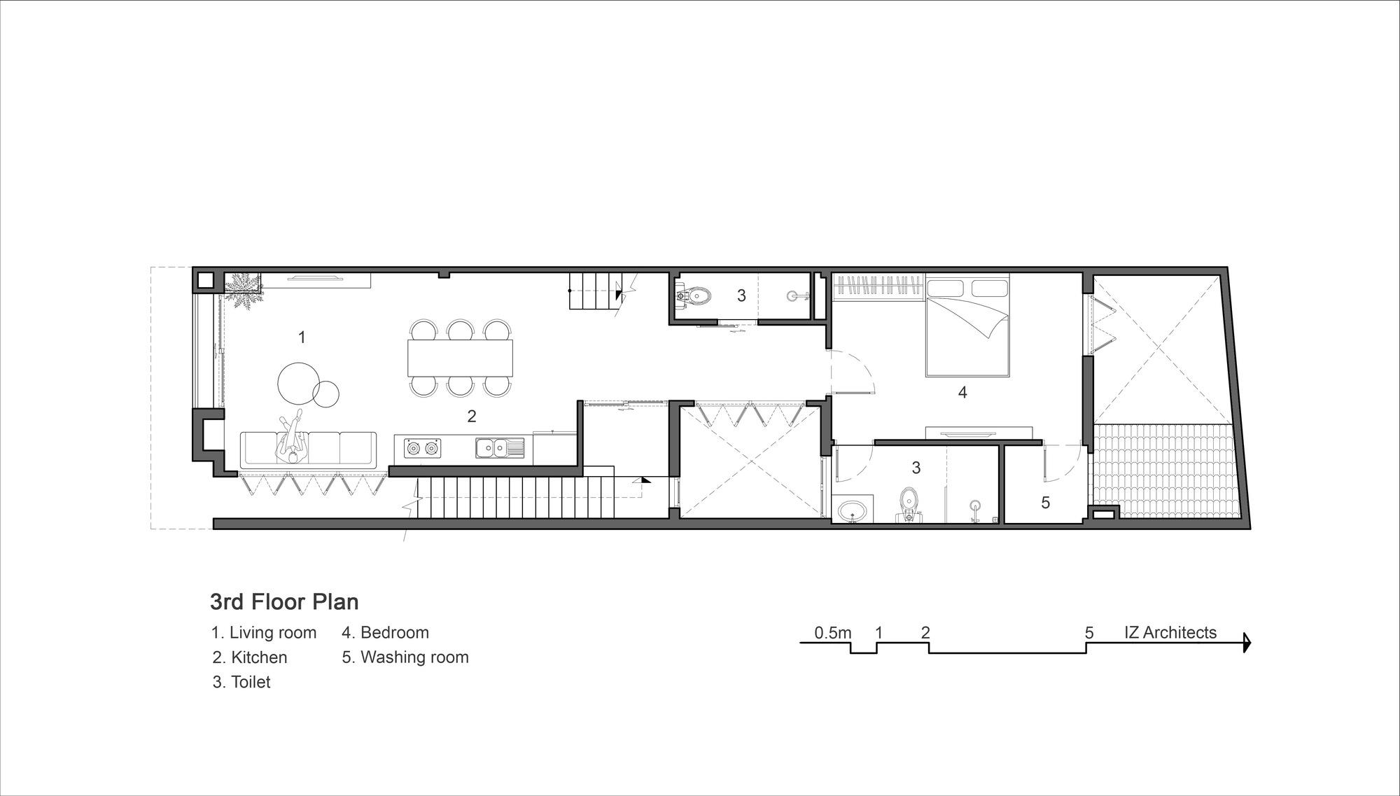 - Vấn đề của tất cả các công trình nhà phố ở Việt Nam là diện tích chật hẹp, công trình liền kề, thiếu ánh sáng và gió tự nhiên. Trong số đó, việc thiếu ánh sáng và gió tự nhiên là vấn đề quan trọng nhất cần được giải quyết. Vì vậy, DT nhà được bố trí khoảng sân trước rộng với hai cầu thang liên kết hai tầng nhằm tạo ra khoảng thông thủy cực lớn bên trong ngôi nhà cũng như tạo nguồn ánh sáng và gió tự nhiên lý tưởng. Không khí bên trong ngôi nhà, nhờ đó, luôn được lưu thông như một lá phổi.