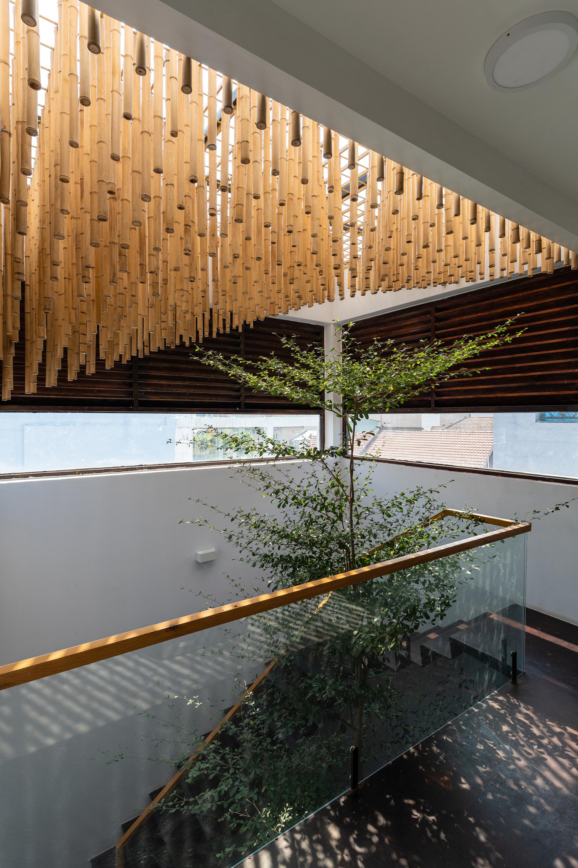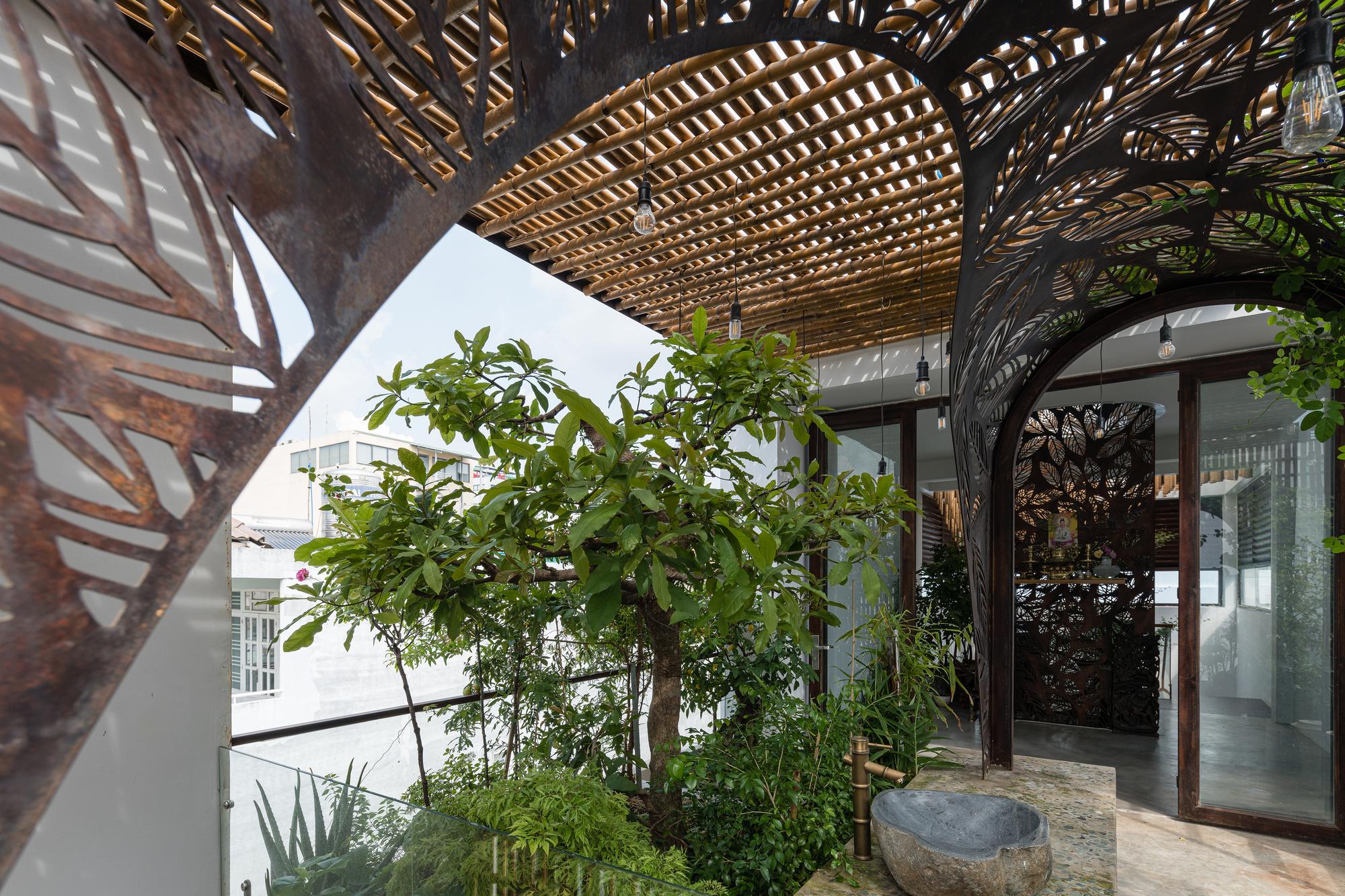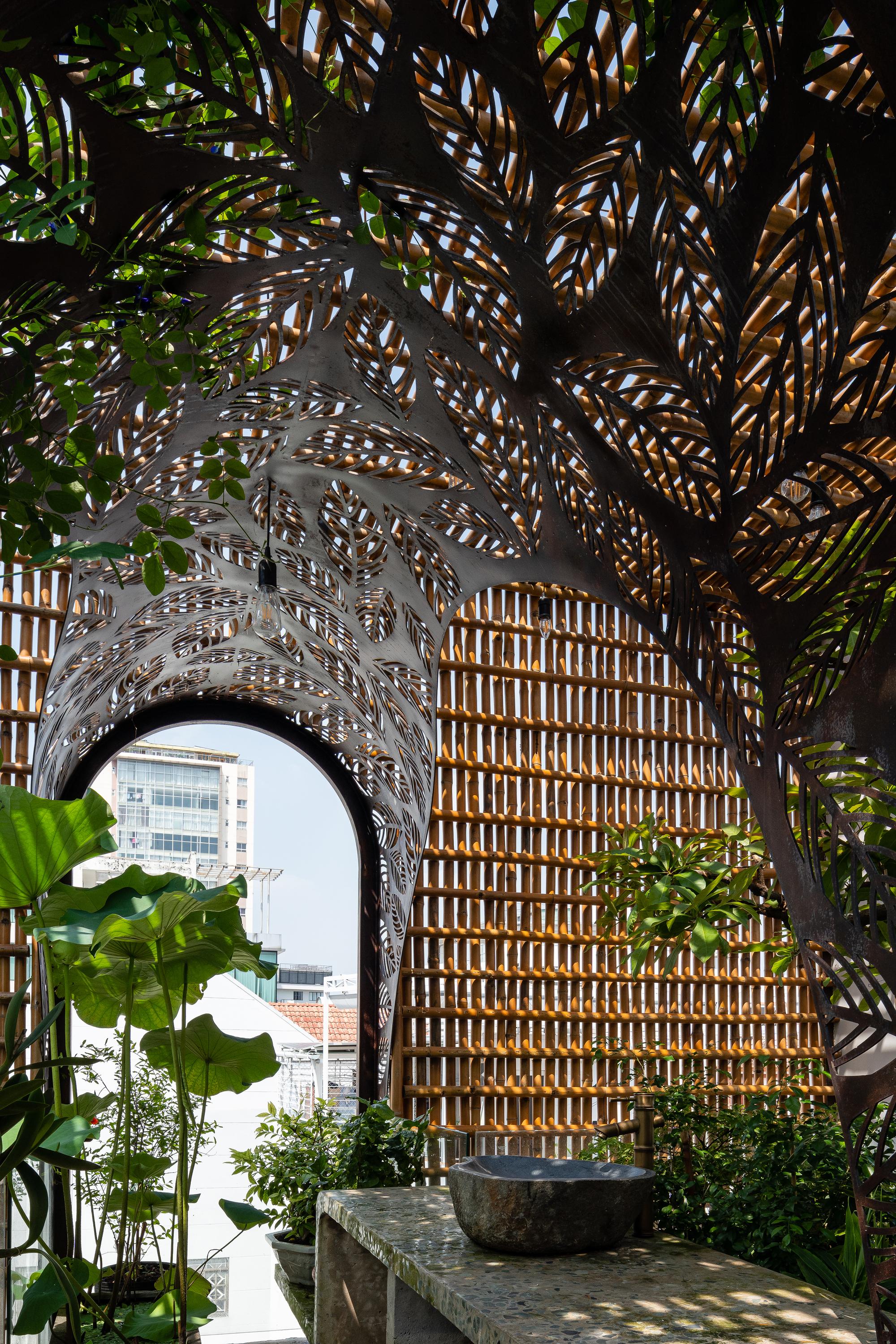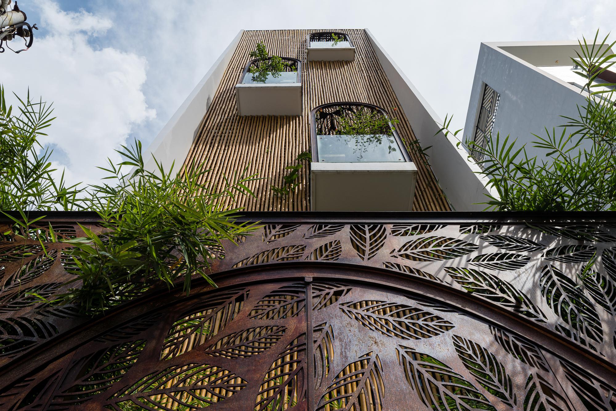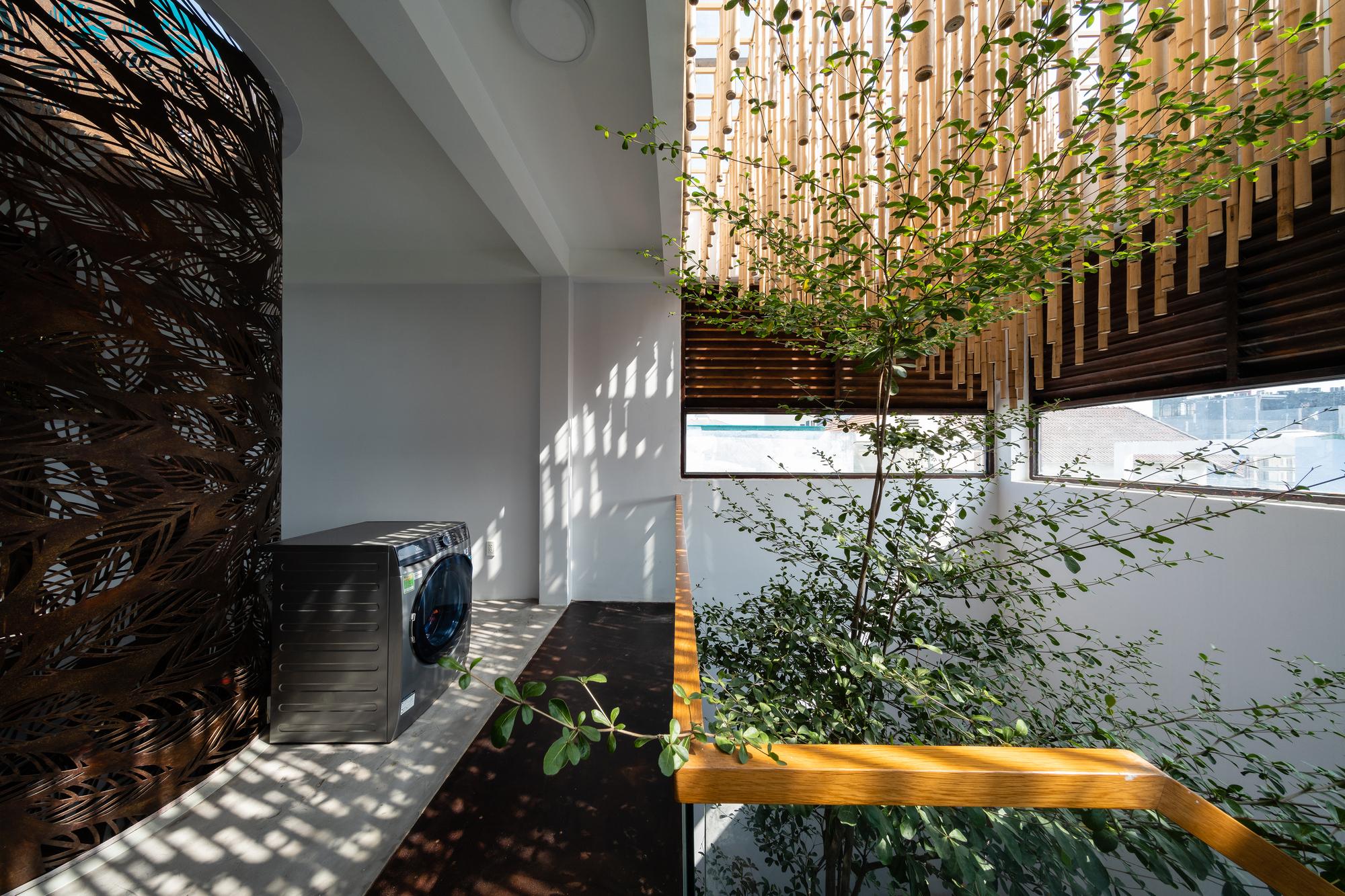 Bên cạnh đó, các nan tre đan cho phép thông gió tự nhiên. Tấm mành tre này cuộn lại để che nắng cho sân thượng. Thanh chắn gió bằng sắt CNC với những hình cắt lá, một phiên bản cách điệu của tấm chắn gió truyền thống (bình phong), có chức năng như một thiết bị đối lưu ánh sáng và không khí. Sắt CNC còn được dùng làm lam che nắng ban công, cửa cổng ra vào. Chúng hoàn toàn tạo ra cảm giác ngôi nhà như một tổng thể mở, kết nối. Trần tre ở giếng trời sân sau, ngay cầu thang, được tạo nên từ những thanh tre thẳng đứng. Điều này cho phép kết nối trực quan với mặt tiền đồng thời đóng vai trò che nắng. Nó cũng cho phép ánh sáng đi qua, không chỉ tạo ra những bóng râm thú vị mà còn tạo ra những âm thanh vui tai như chuông gió treo trong vườn.