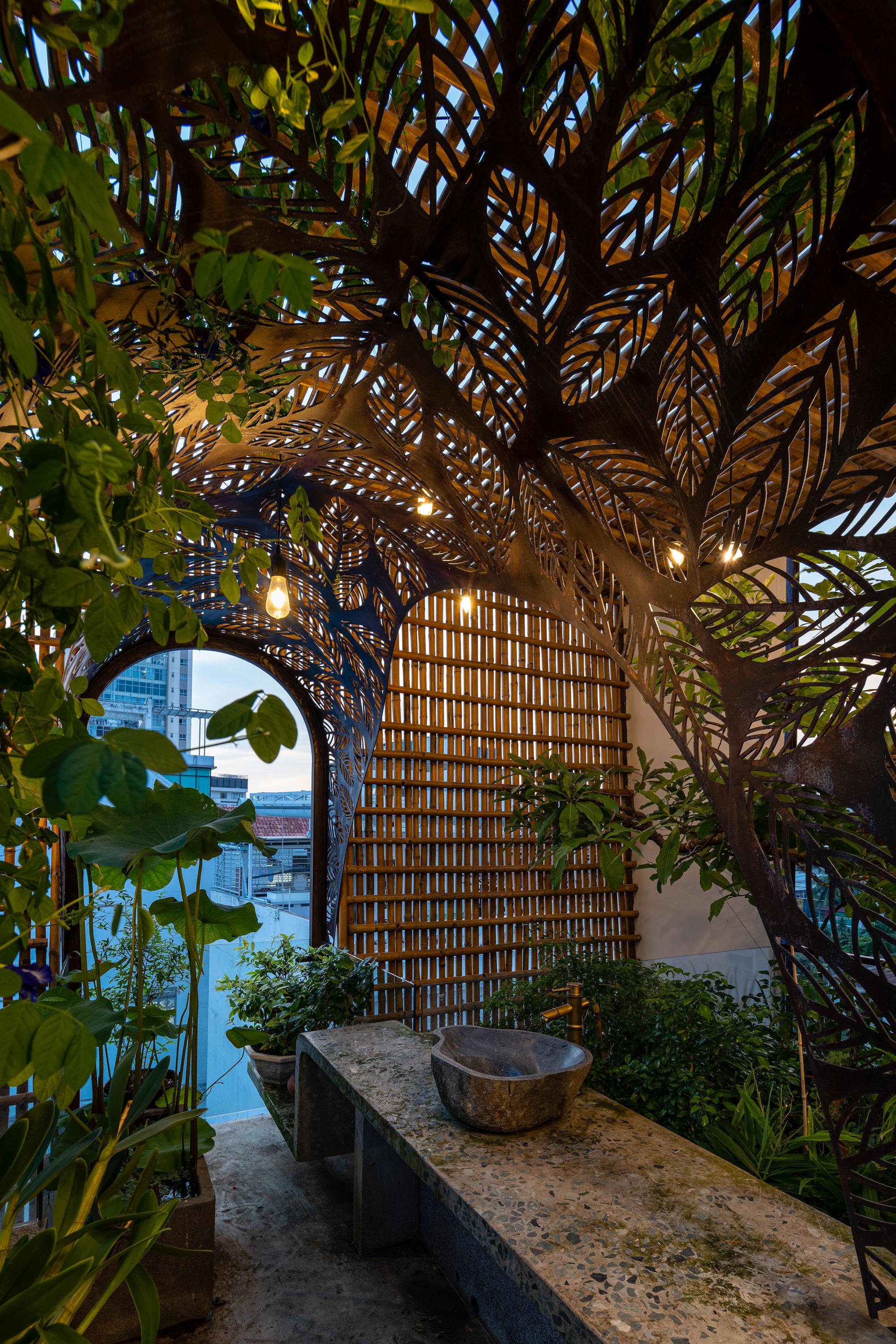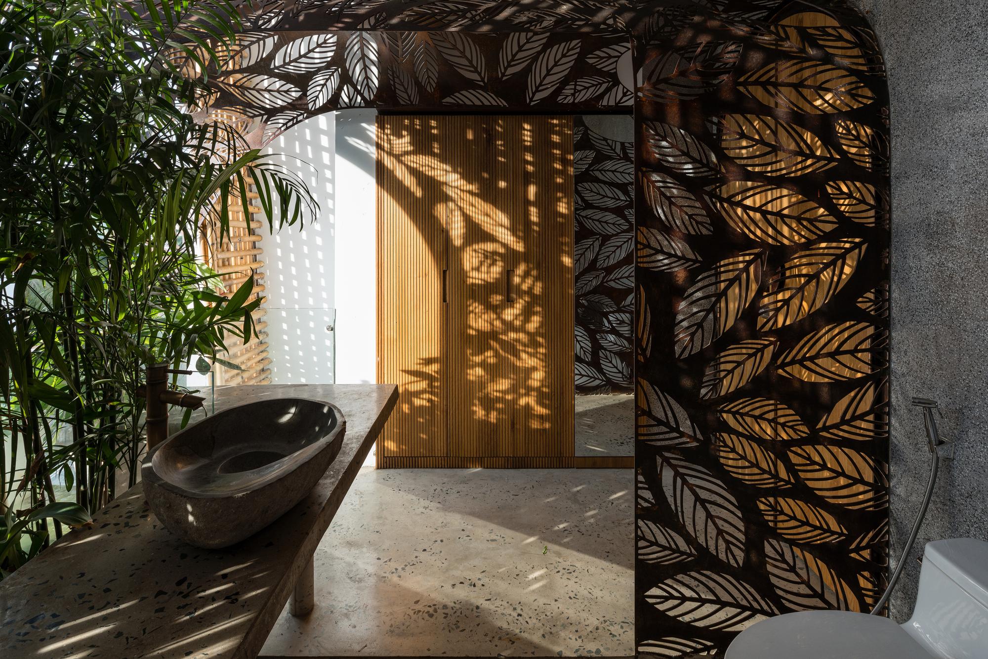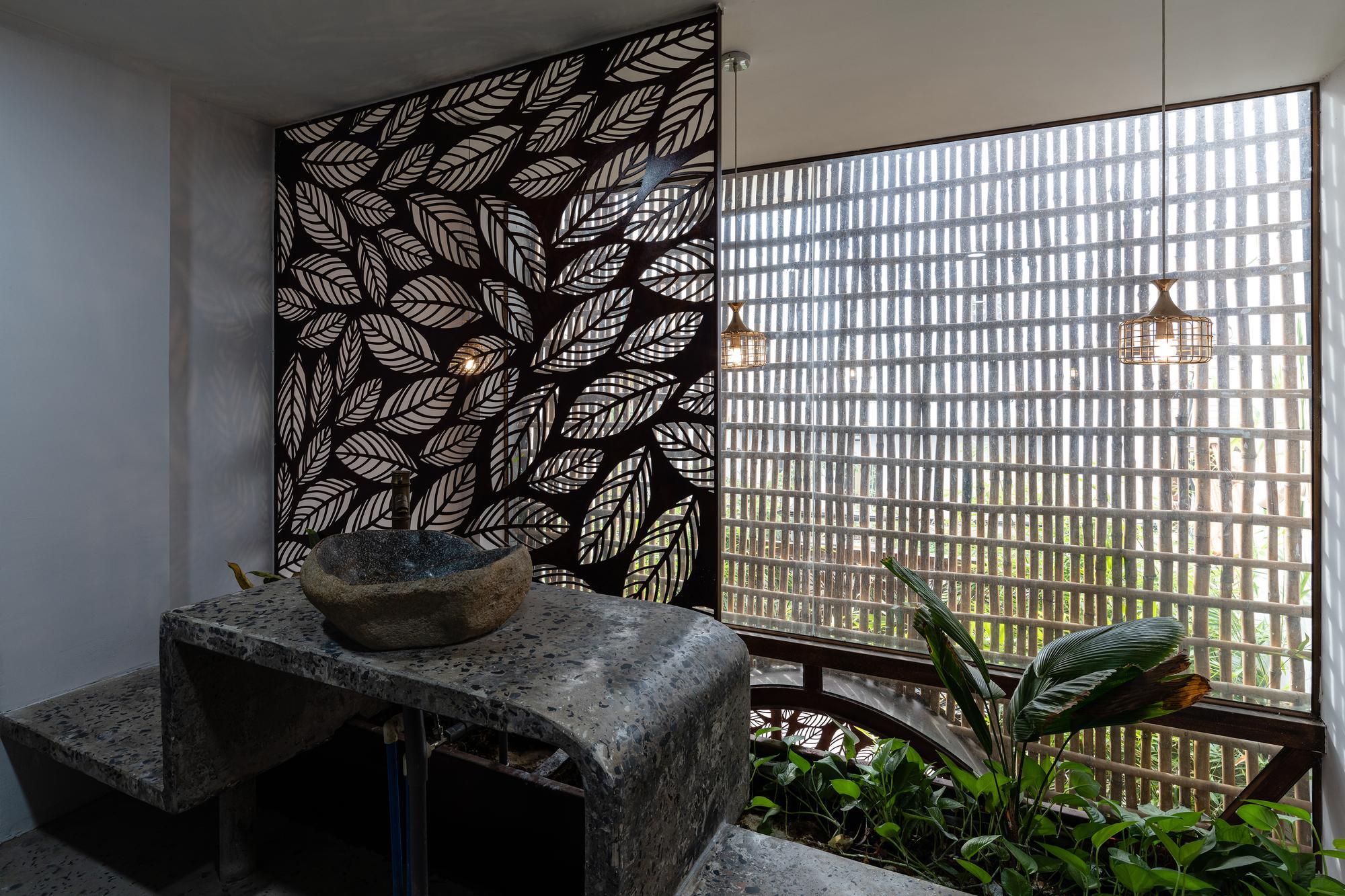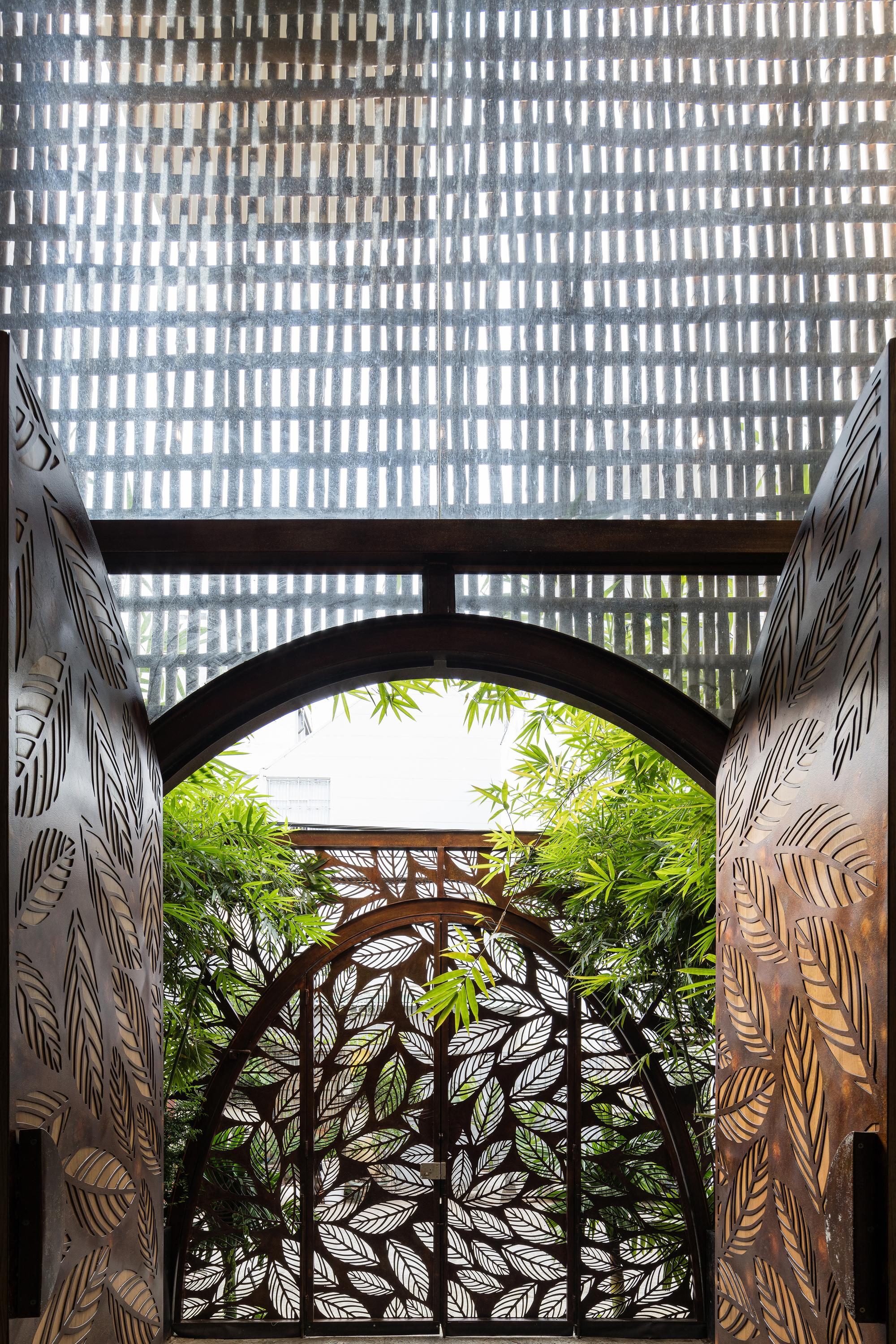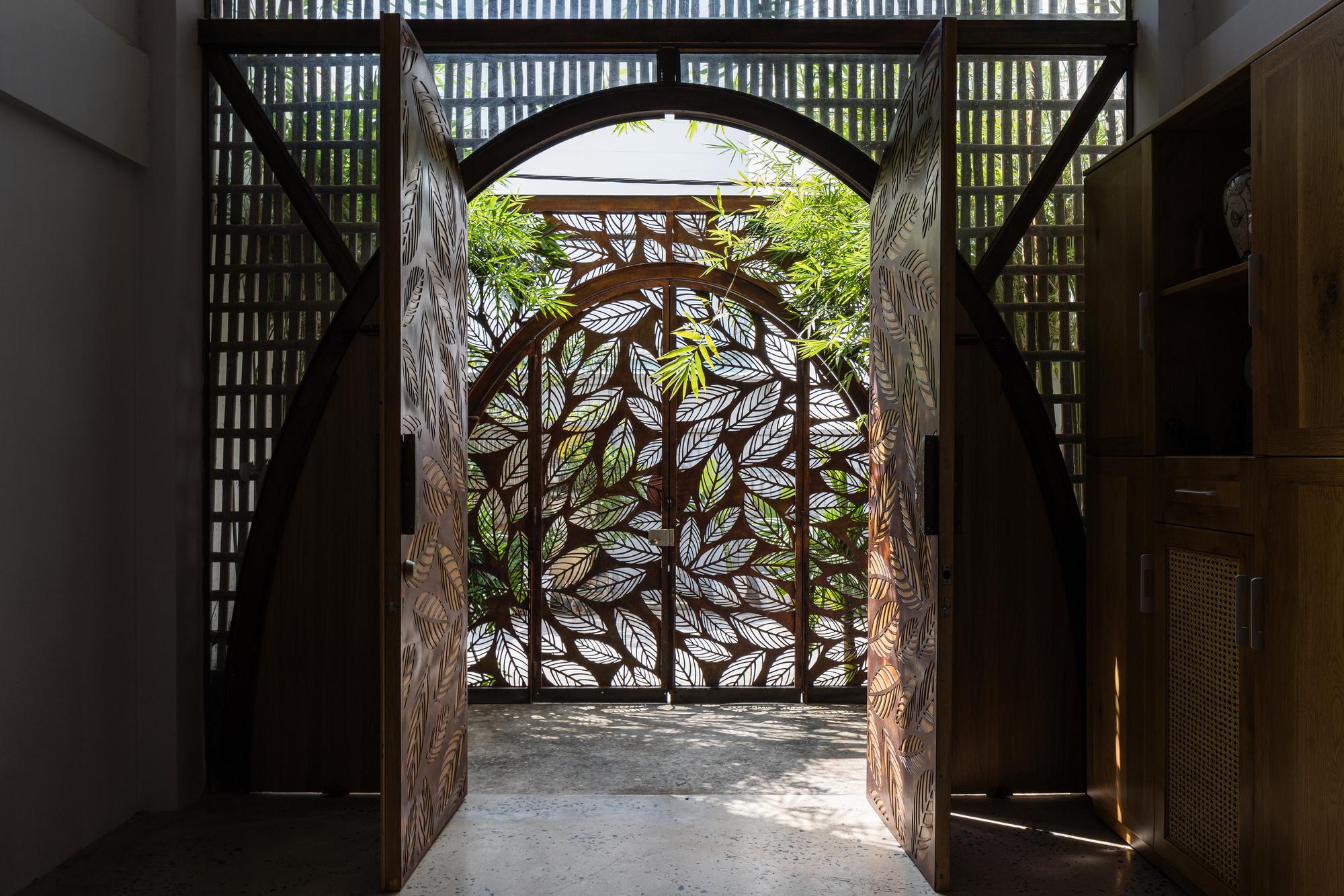 Bên cạnh đó, các nan tre đan cho phép thông gió tự nhiên. Tấm mành tre này cuộn lại để che nắng cho sân thượng. Thanh chắn gió bằng sắt CNC với những hình cắt lá, một phiên bản cách điệu của tấm chắn gió truyền thống (bình phong), có chức năng như một thiết bị đối lưu ánh sáng và không khí. Sắt CNC còn được dùng làm lam che nắng ban công, cửa cổng ra vào. Chúng hoàn toàn tạo ra cảm giác ngôi nhà như một tổng thể mở, kết nối. Trần tre ở giếng trời sân sau, ngay cầu thang, được tạo nên từ những thanh tre thẳng đứng. Điều này cho phép kết nối trực quan với mặt tiền đồng thời đóng vai trò che nắng. Nó cũng cho phép ánh sáng đi qua, không chỉ tạo ra những bóng râm thú vị mà còn tạo ra những âm thanh vui tai như chuông gió treo trong vườn.