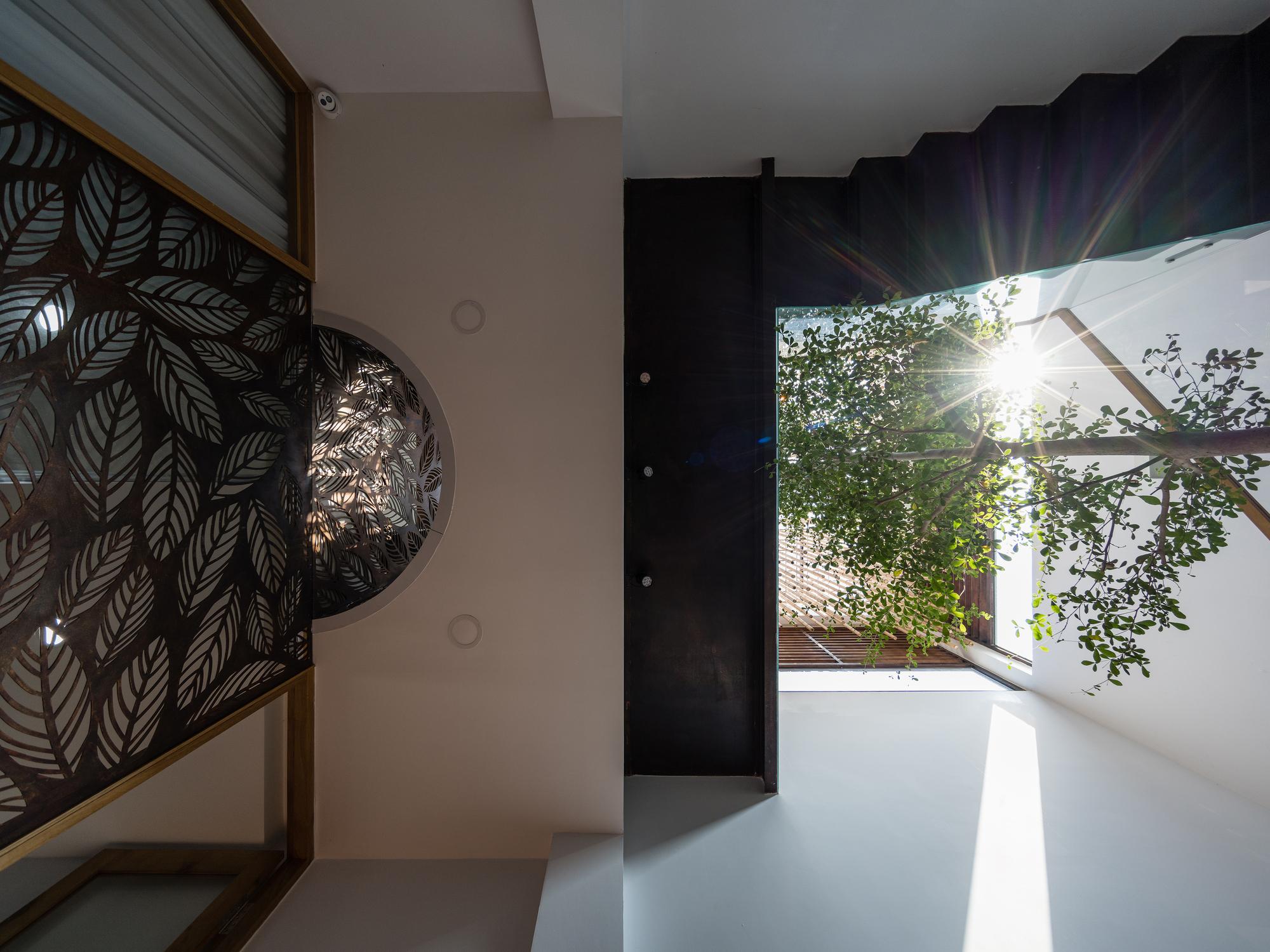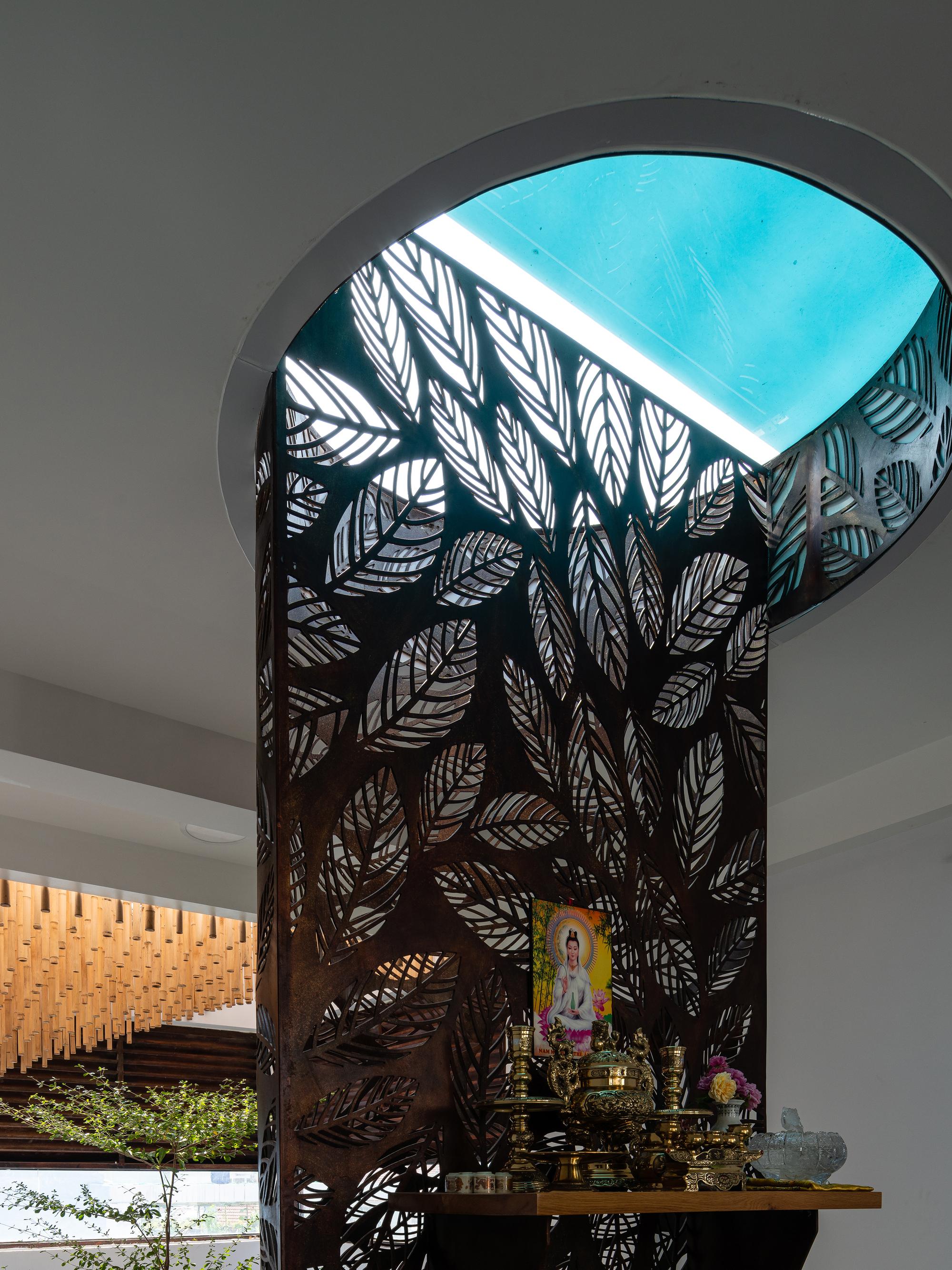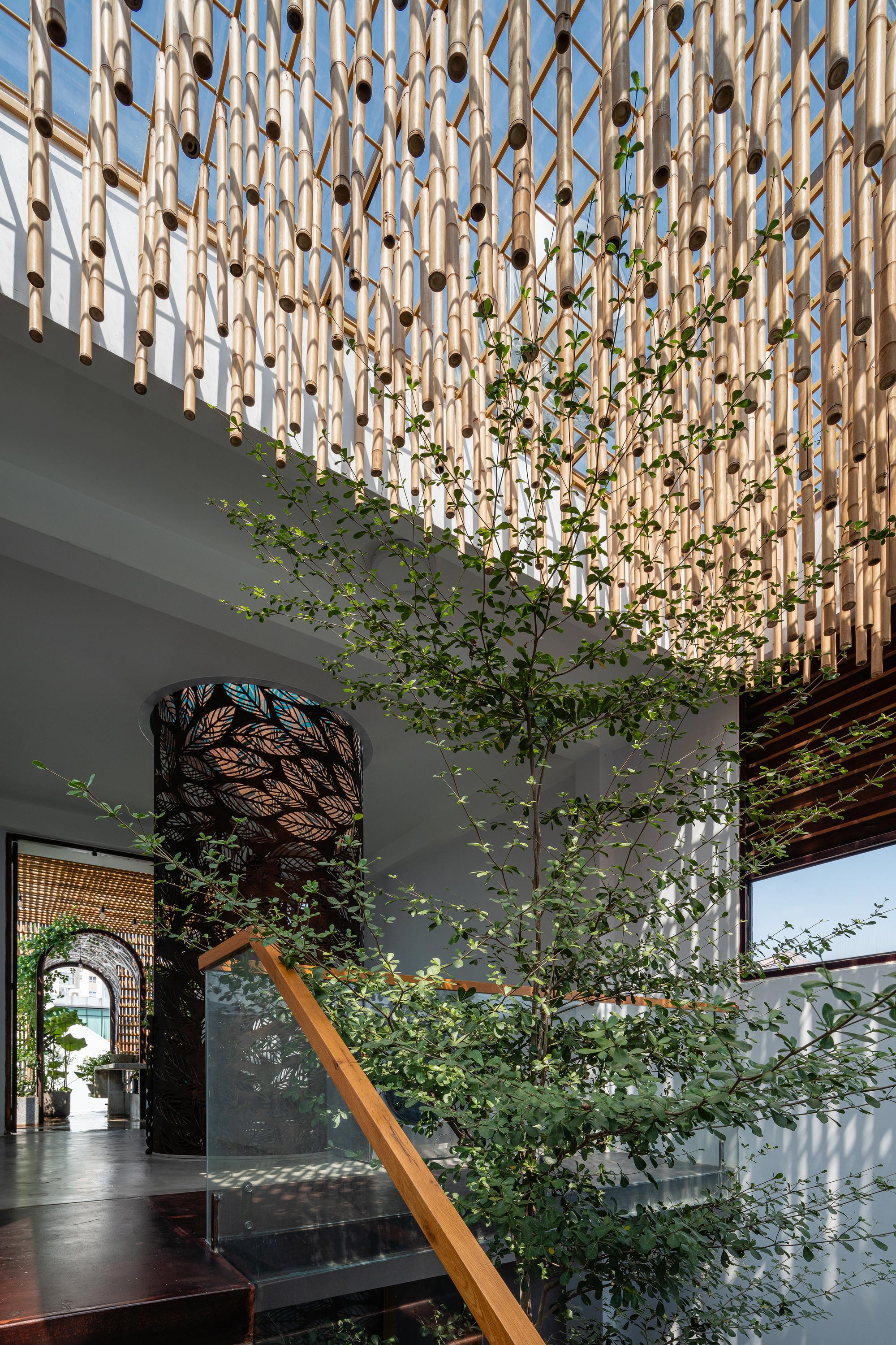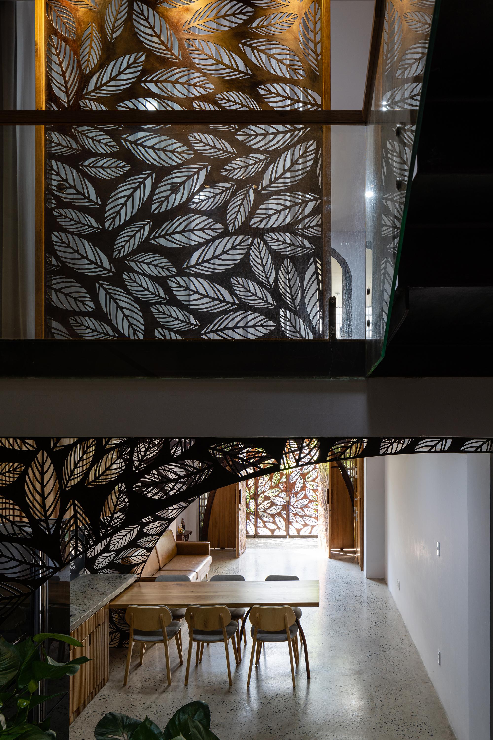 Bên cạnh đó, các nan tre đan cho phép thông gió tự nhiên. Tấm mành tre này cuộn lại để che nắng cho sân thượng. Thanh chắn gió bằng sắt CNC với những hình cắt lá, một phiên bản cách điệu của tấm chắn gió truyền thống (bình phong), có chức năng như một thiết bị đối lưu ánh sáng và không khí. Sắt CNC còn được dùng làm lam che nắng ban công, cửa cổng ra vào. Chúng hoàn toàn tạo ra cảm giác ngôi nhà như một tổng thể mở, kết nối. Trần tre ở giếng trời sân sau, ngay cầu thang, được tạo nên từ những thanh tre thẳng đứng. Điều này cho phép kết nối trực quan với mặt tiền đồng thời đóng vai trò che nắng. Nó cũng cho phép ánh sáng đi qua, không chỉ tạo ra những bóng râm thú vị mà còn tạo ra những âm thanh vui tai như chuông gió treo trong vườn.