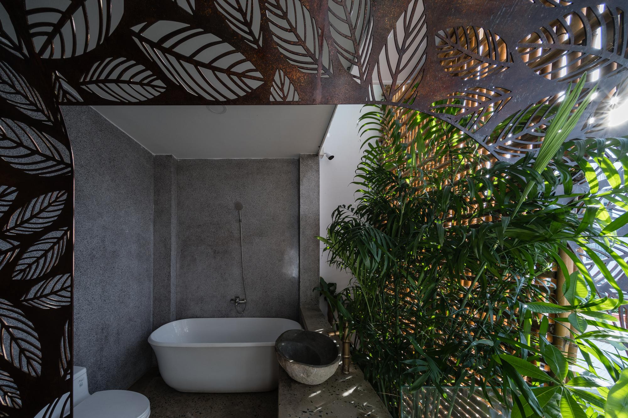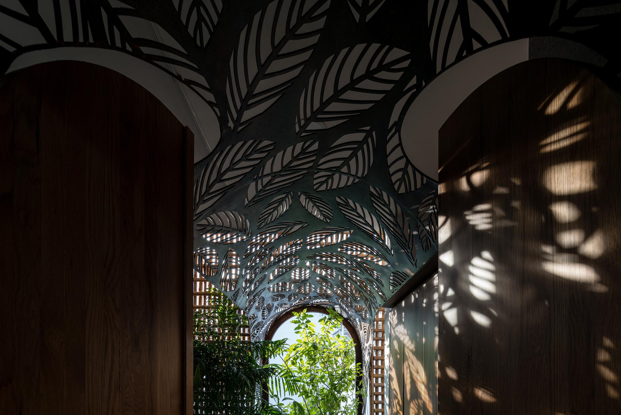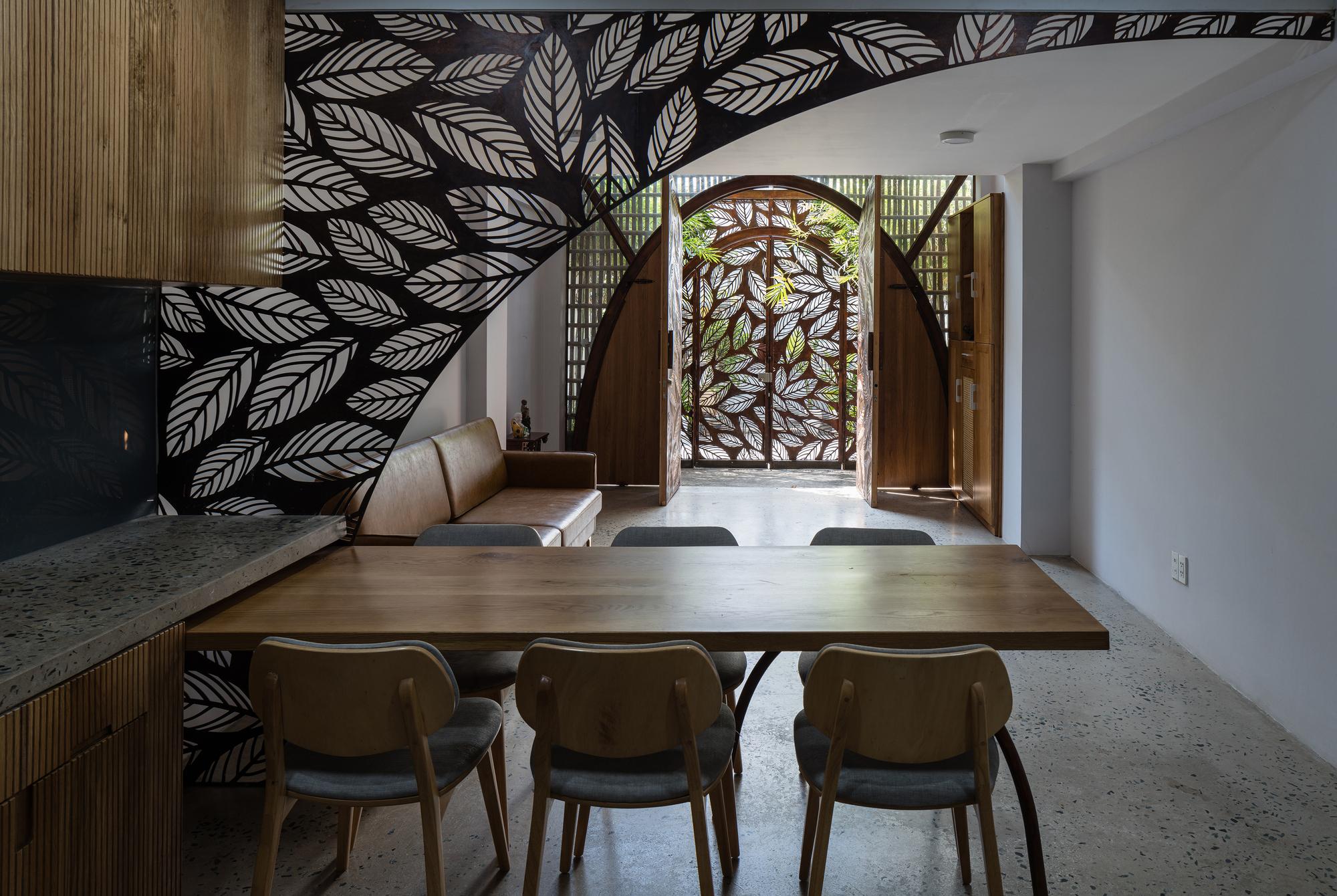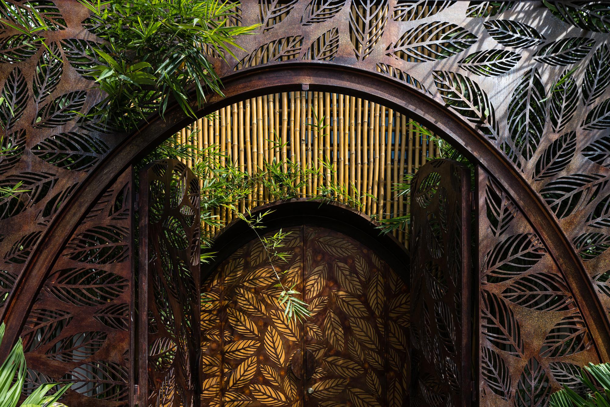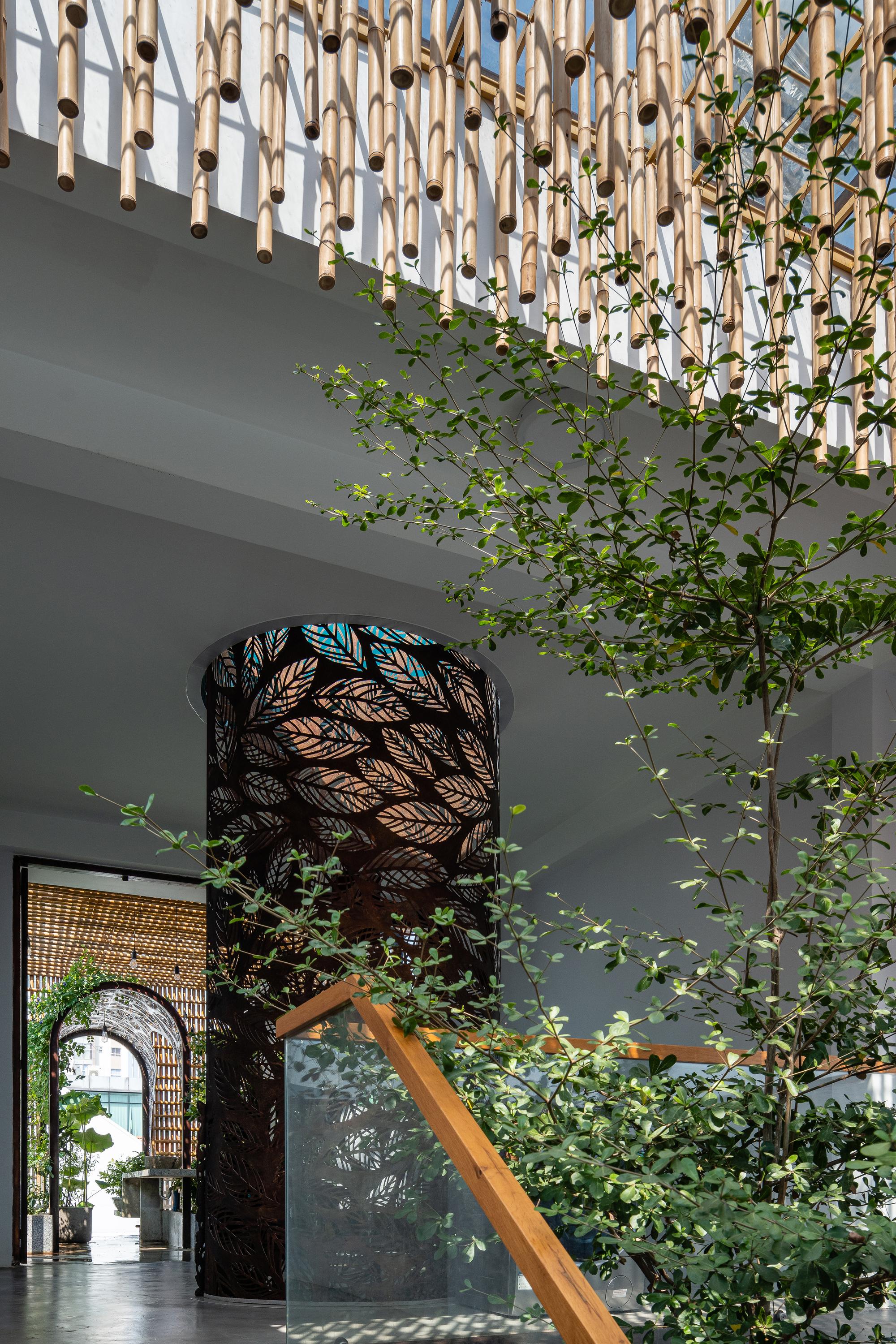 Bên cạnh đó, các nan tre đan cho phép thông gió tự nhiên. Tấm mành tre này cuộn lại để che nắng cho sân thượng. Thanh chắn gió bằng sắt CNC với những hình cắt lá, một phiên bản cách điệu của tấm chắn gió truyền thống (bình phong), có chức năng như một thiết bị đối lưu ánh sáng và không khí. Sắt CNC còn được dùng làm lam che nắng ban công, cửa cổng ra vào. Chúng hoàn toàn tạo ra cảm giác ngôi nhà như một tổng thể mở, kết nối. Trần tre ở giếng trời sân sau, ngay cầu thang, được tạo nên từ những thanh tre thẳng đứng. Điều này cho phép kết nối trực quan với mặt tiền đồng thời đóng vai trò che nắng. Nó cũng cho phép ánh sáng đi qua, không chỉ tạo ra những bóng râm thú vị mà còn tạo ra những âm thanh vui tai như chuông gió treo trong vườn.