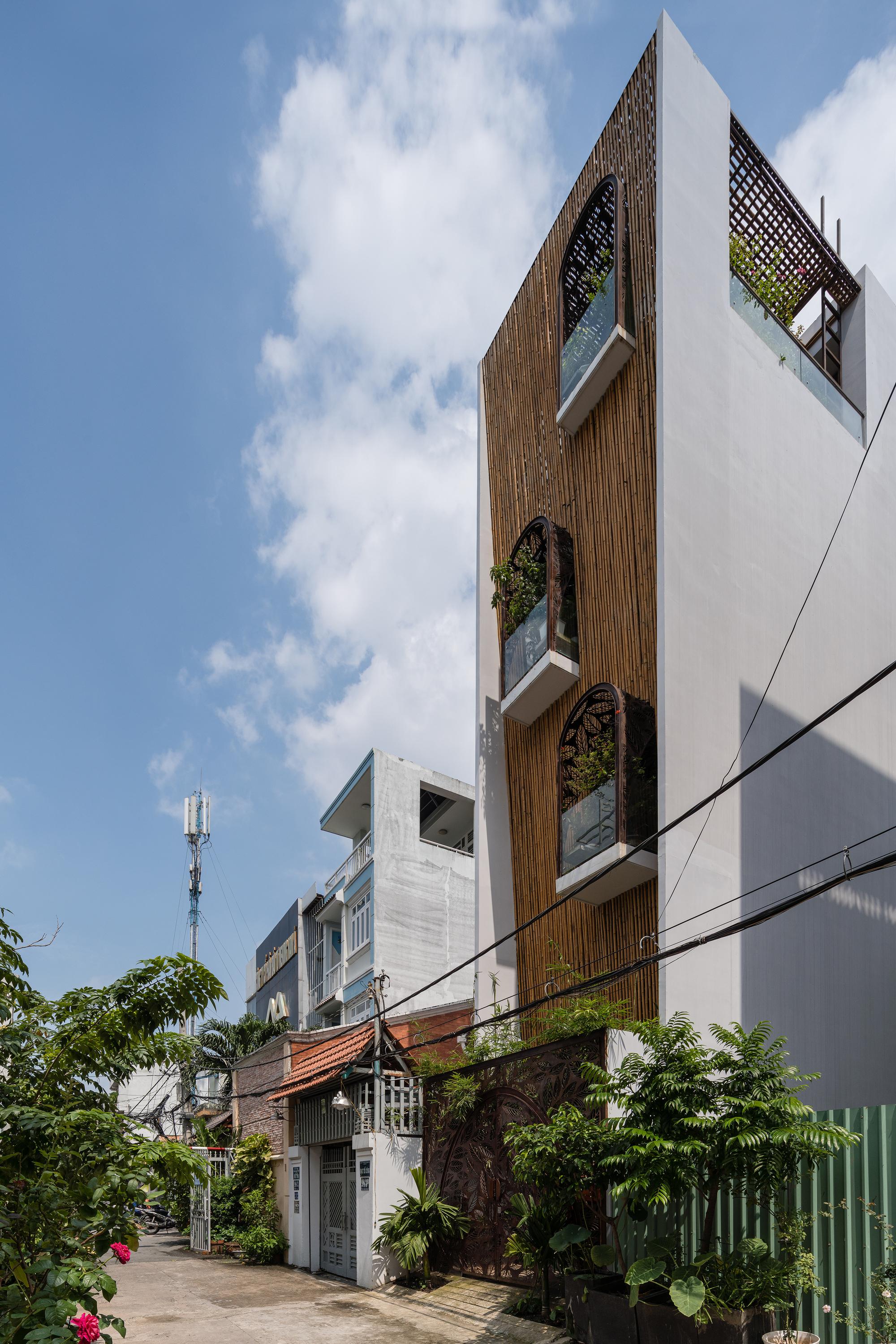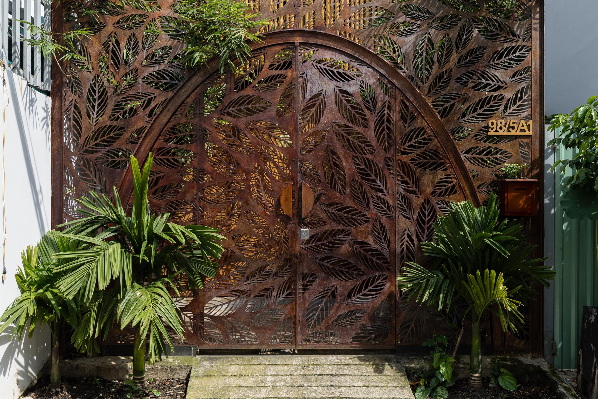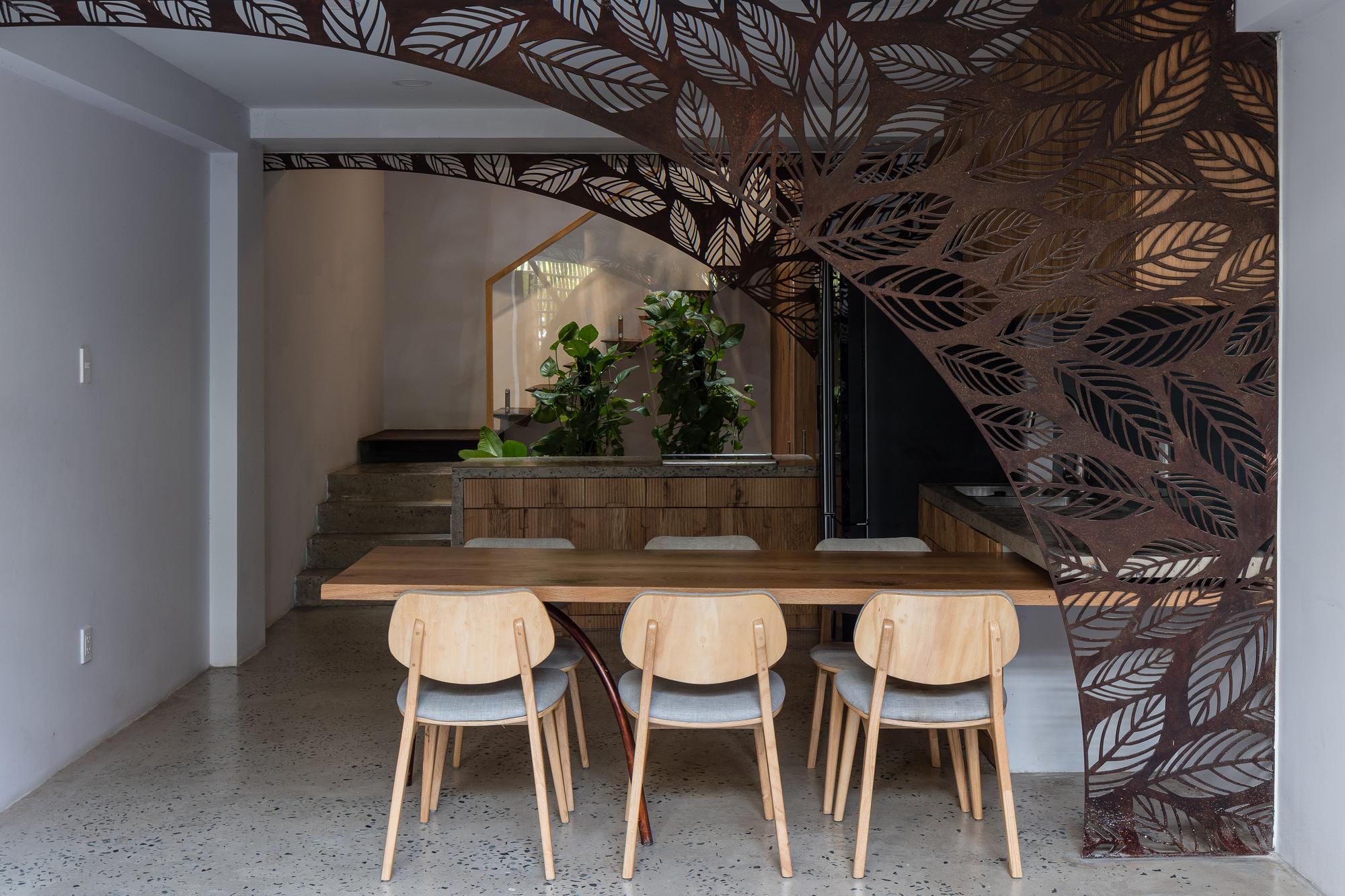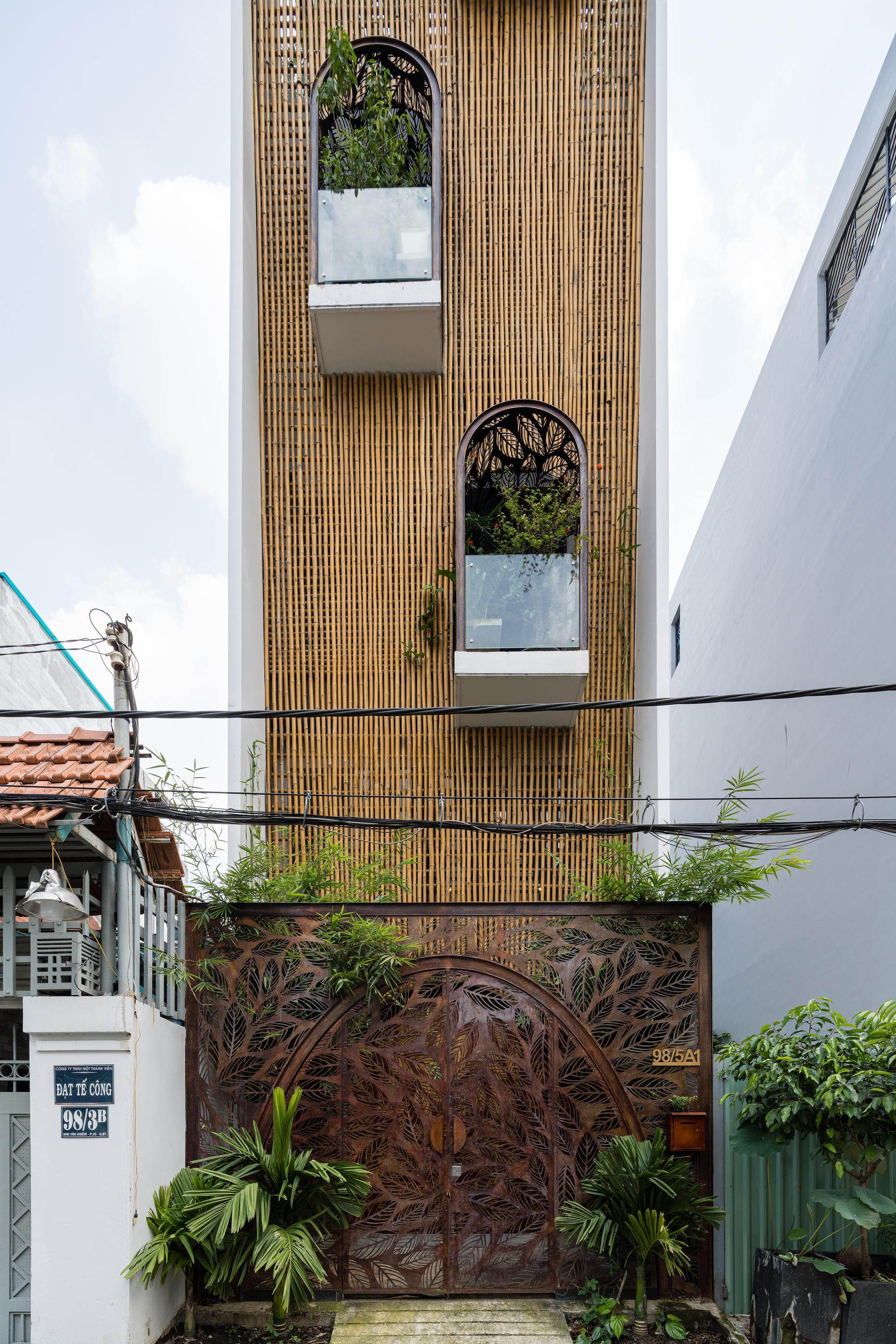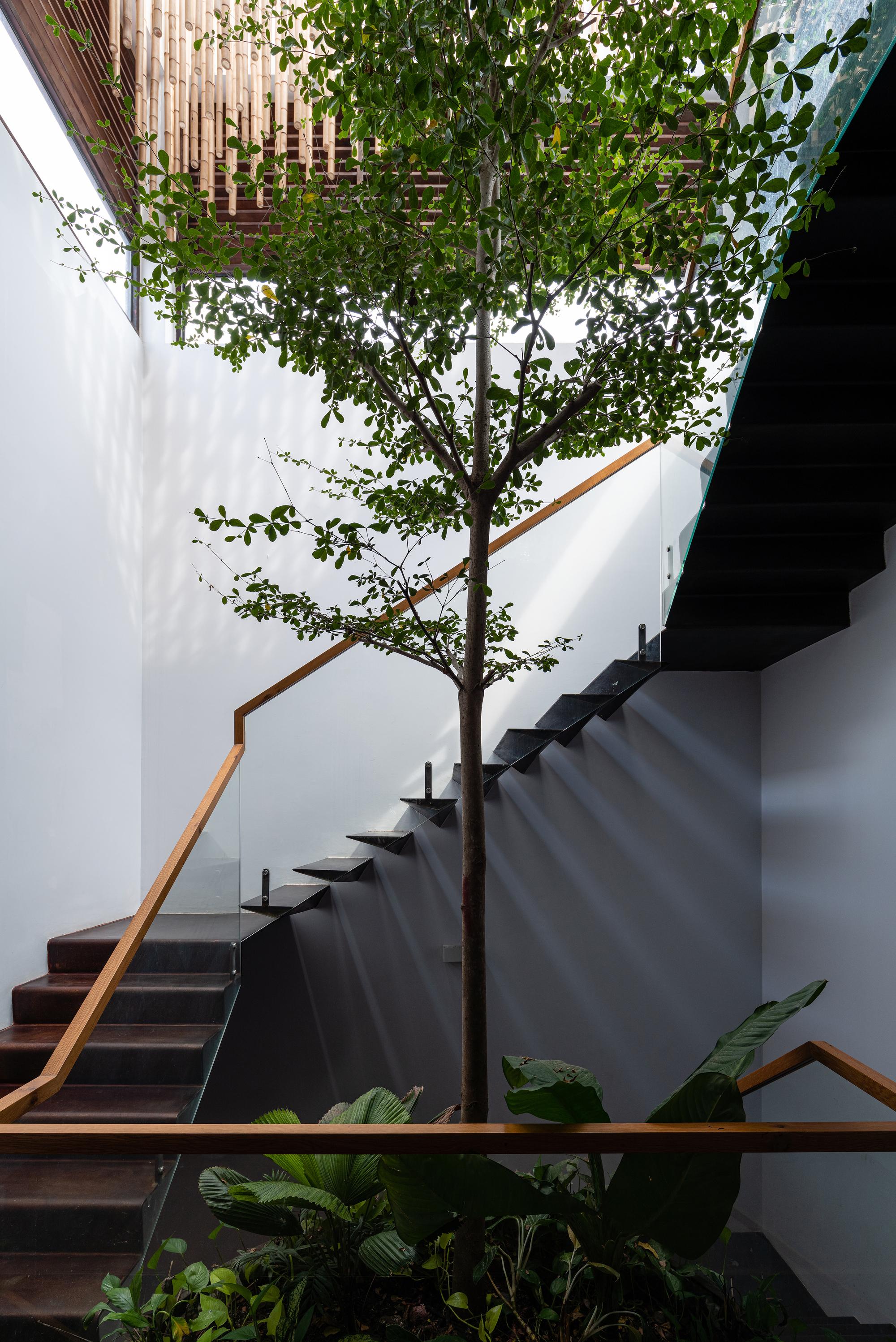 Bên cạnh đó, các nan tre đan cho phép thông gió tự nhiên. Tấm mành tre này cuộn lại để che nắng cho sân thượng. Thanh chắn gió bằng sắt CNC với những hình cắt lá, một phiên bản cách điệu của tấm chắn gió truyền thống (bình phong), có chức năng như một thiết bị đối lưu ánh sáng và không khí. Sắt CNC còn được dùng làm lam che nắng ban công, cửa cổng ra vào. Chúng hoàn toàn tạo ra cảm giác ngôi nhà như một tổng thể mở, kết nối. Trần tre ở giếng trời sân sau, ngay cầu thang, được tạo nên từ những thanh tre thẳng đứng. Điều này cho phép kết nối trực quan với mặt tiền đồng thời đóng vai trò che nắng. Nó cũng cho phép ánh sáng đi qua, không chỉ tạo ra những bóng râm thú vị mà còn tạo ra những âm thanh vui tai như chuông gió treo trong vườn.