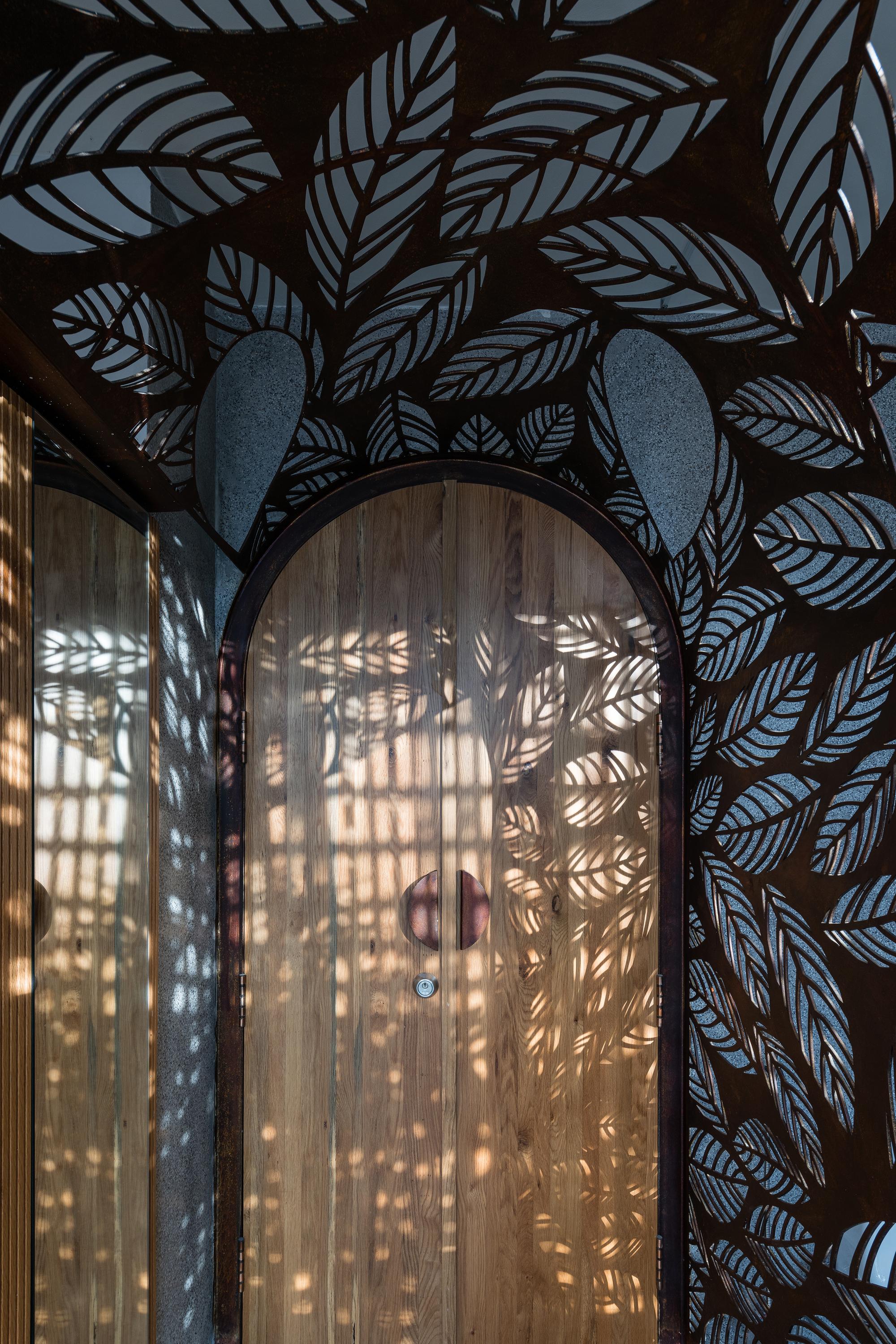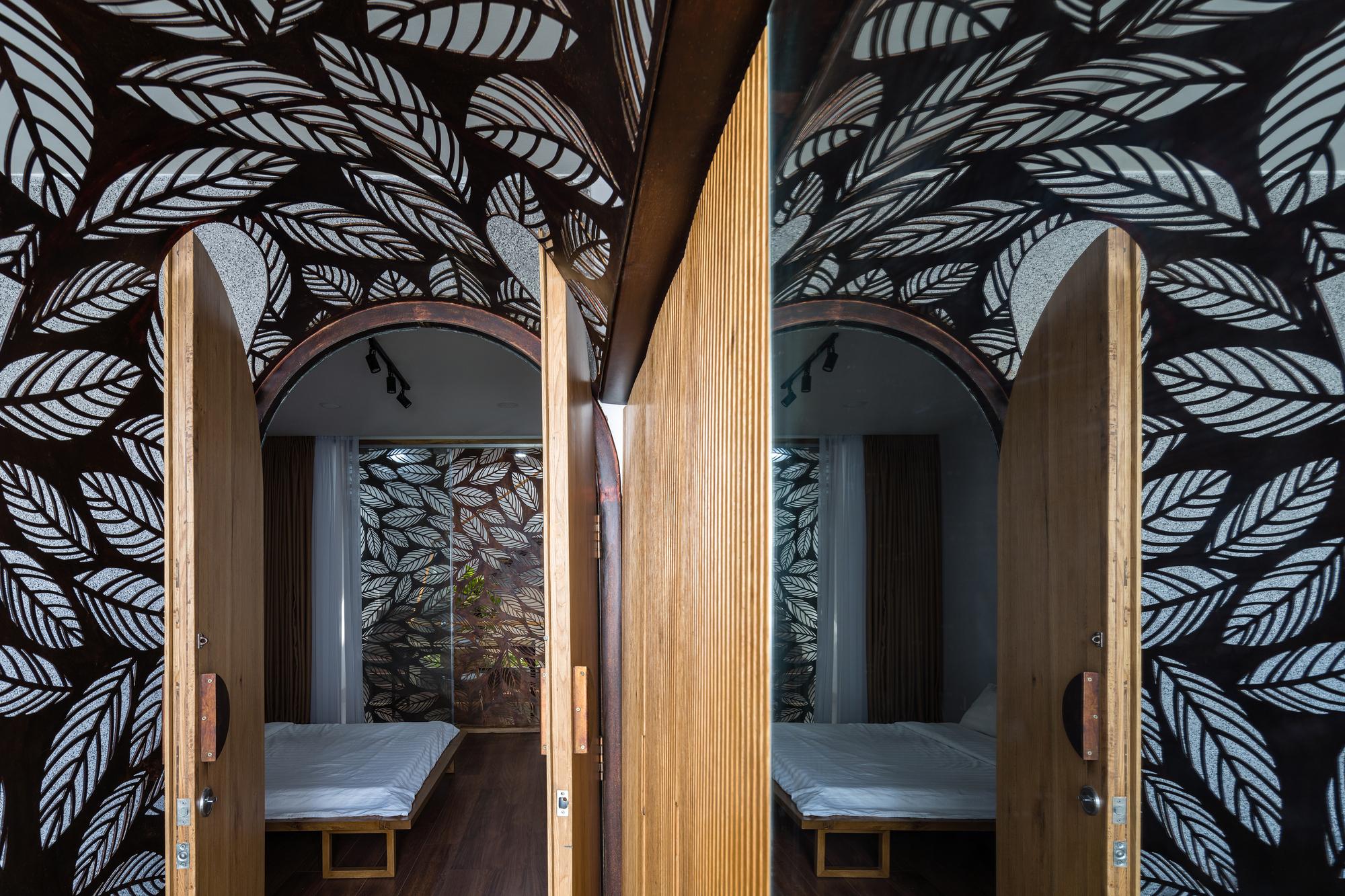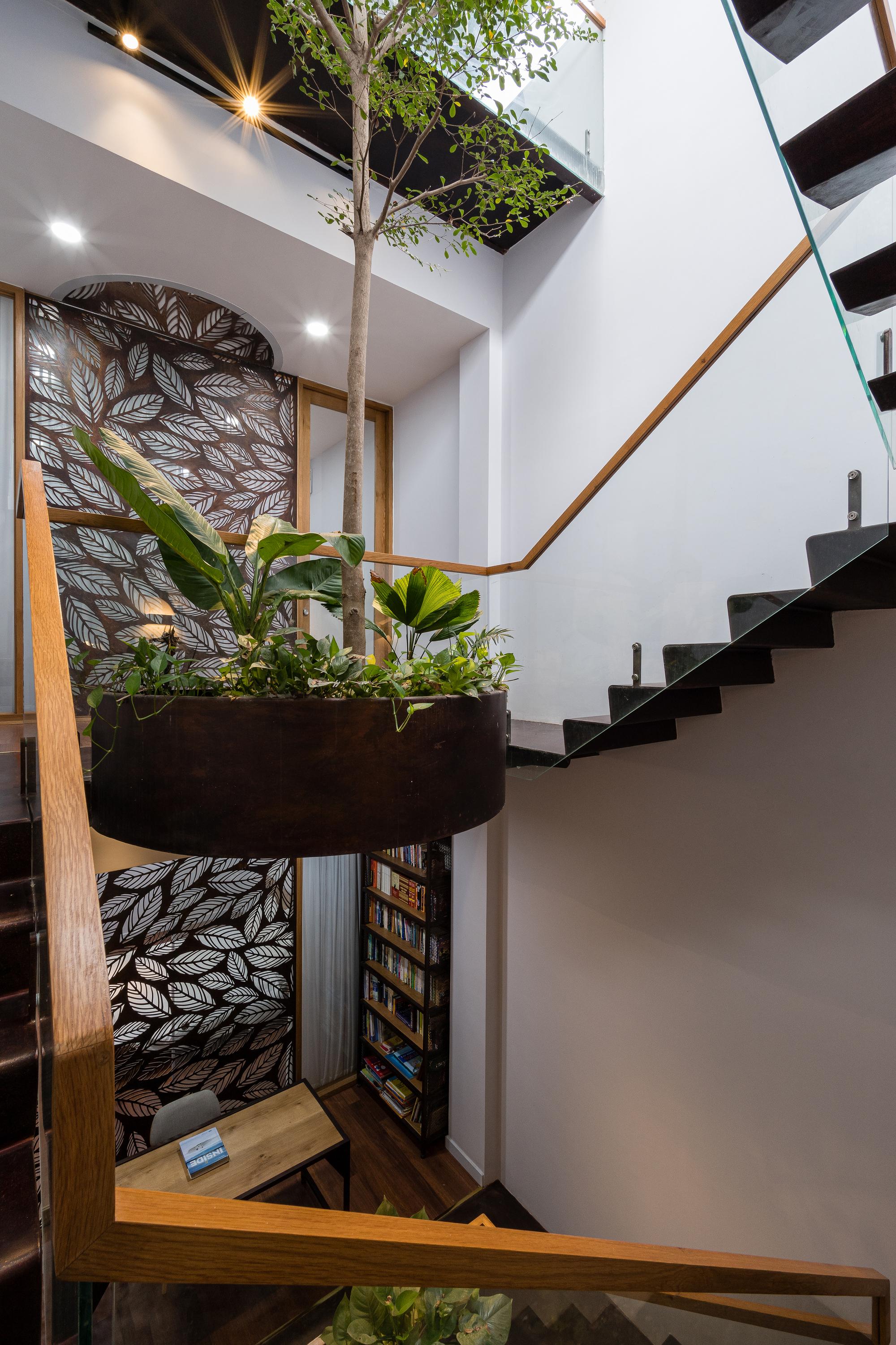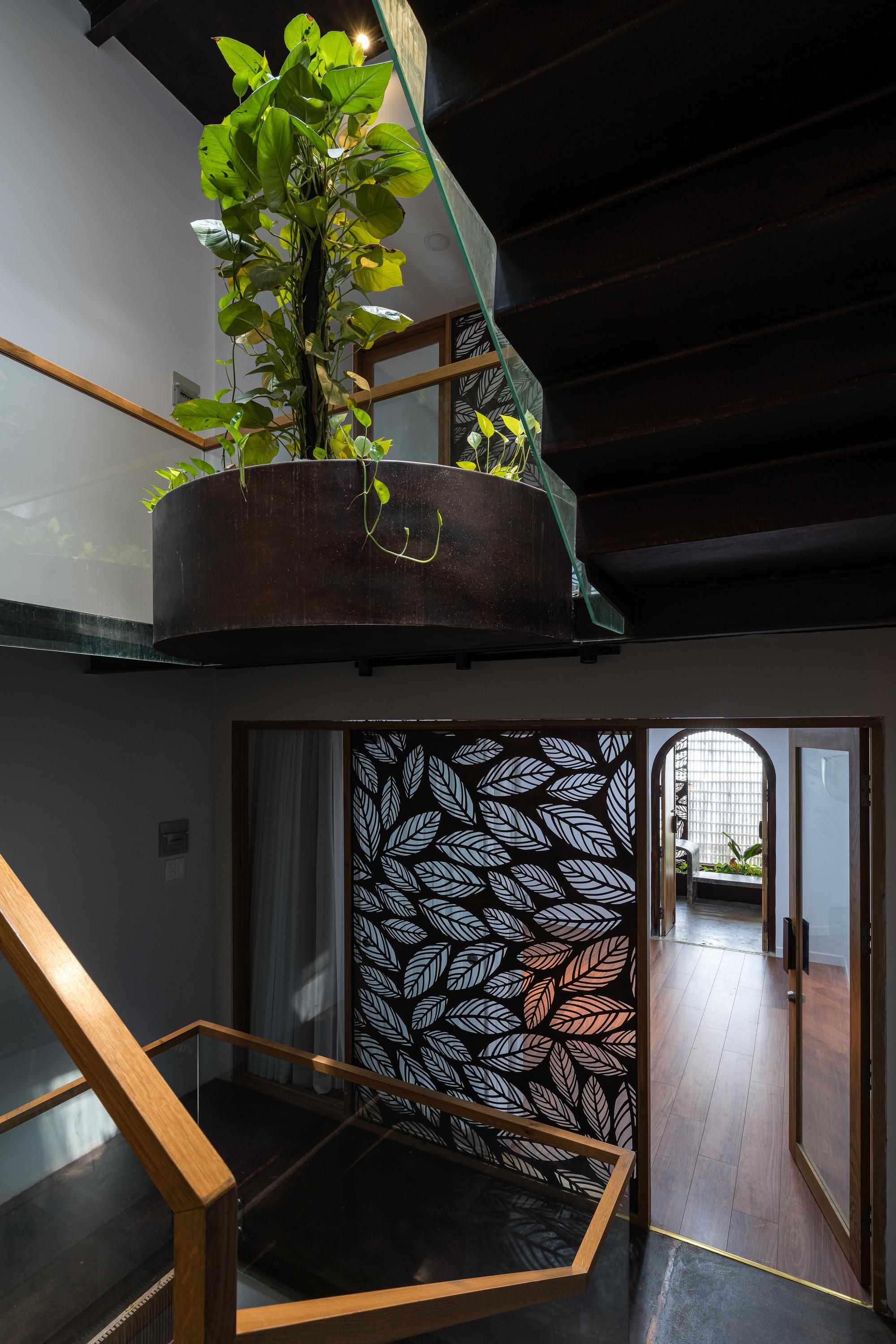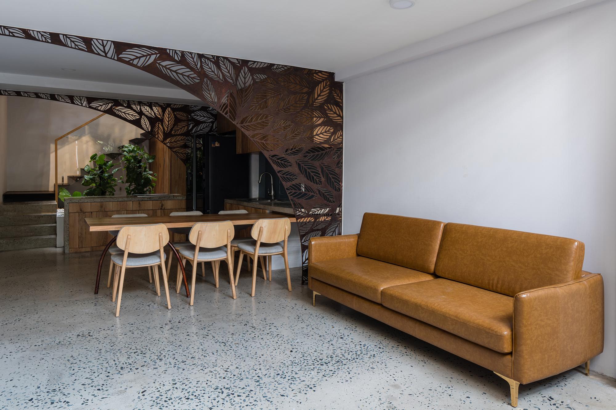 Bên cạnh đó, các nan tre đan cho phép thông gió tự nhiên. Tấm mành tre này cuộn lại để che nắng cho sân thượng. Thanh chắn gió bằng sắt CNC với những hình cắt lá, một phiên bản cách điệu của tấm chắn gió truyền thống (bình phong), có chức năng như một thiết bị đối lưu ánh sáng và không khí. Sắt CNC còn được dùng làm lam che nắng ban công, cửa cổng ra vào. Chúng hoàn toàn tạo ra cảm giác ngôi nhà như một tổng thể mở, kết nối. Trần tre ở giếng trời sân sau, ngay cầu thang, được tạo nên từ những thanh tre thẳng đứng. Điều này cho phép kết nối trực quan với mặt tiền đồng thời đóng vai trò che nắng. Nó cũng cho phép ánh sáng đi qua, không chỉ tạo ra những bóng râm thú vị mà còn tạo ra những âm thanh vui tai như chuông gió treo trong vườn.