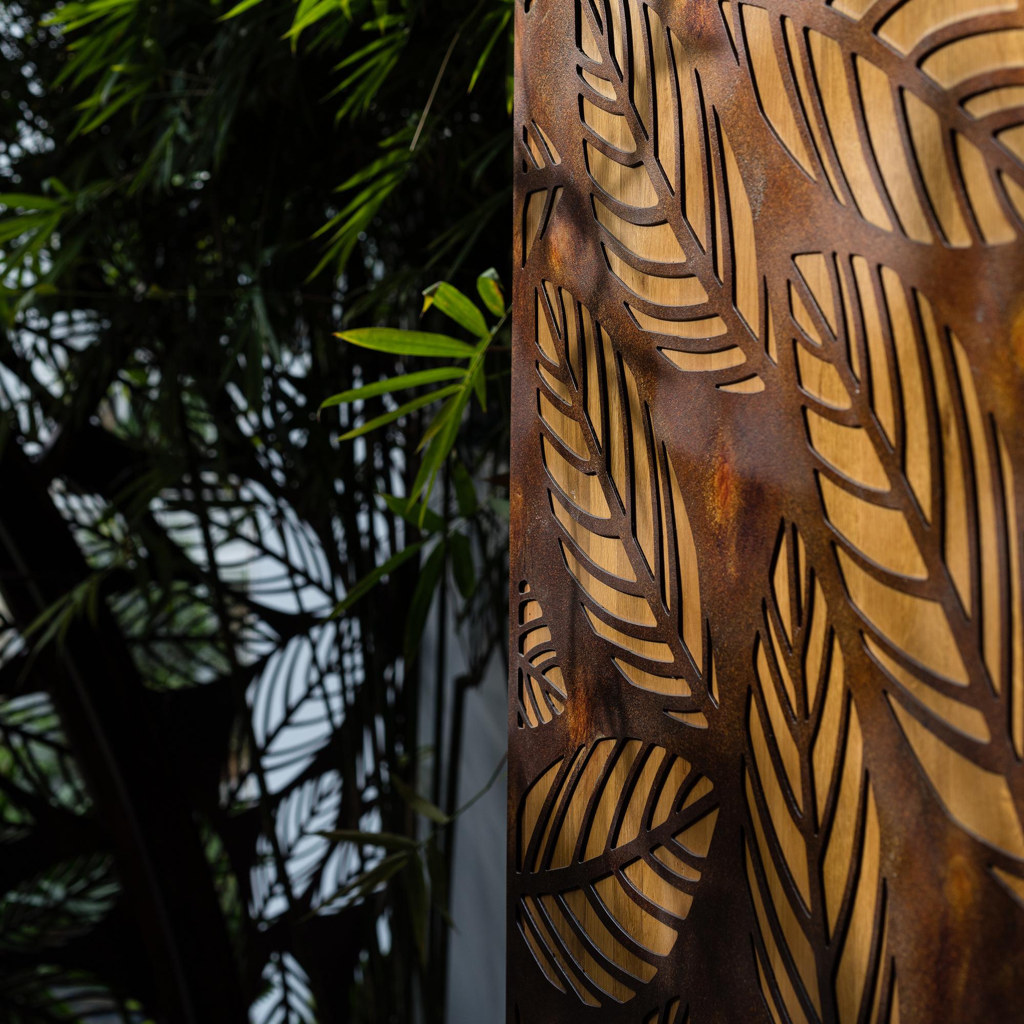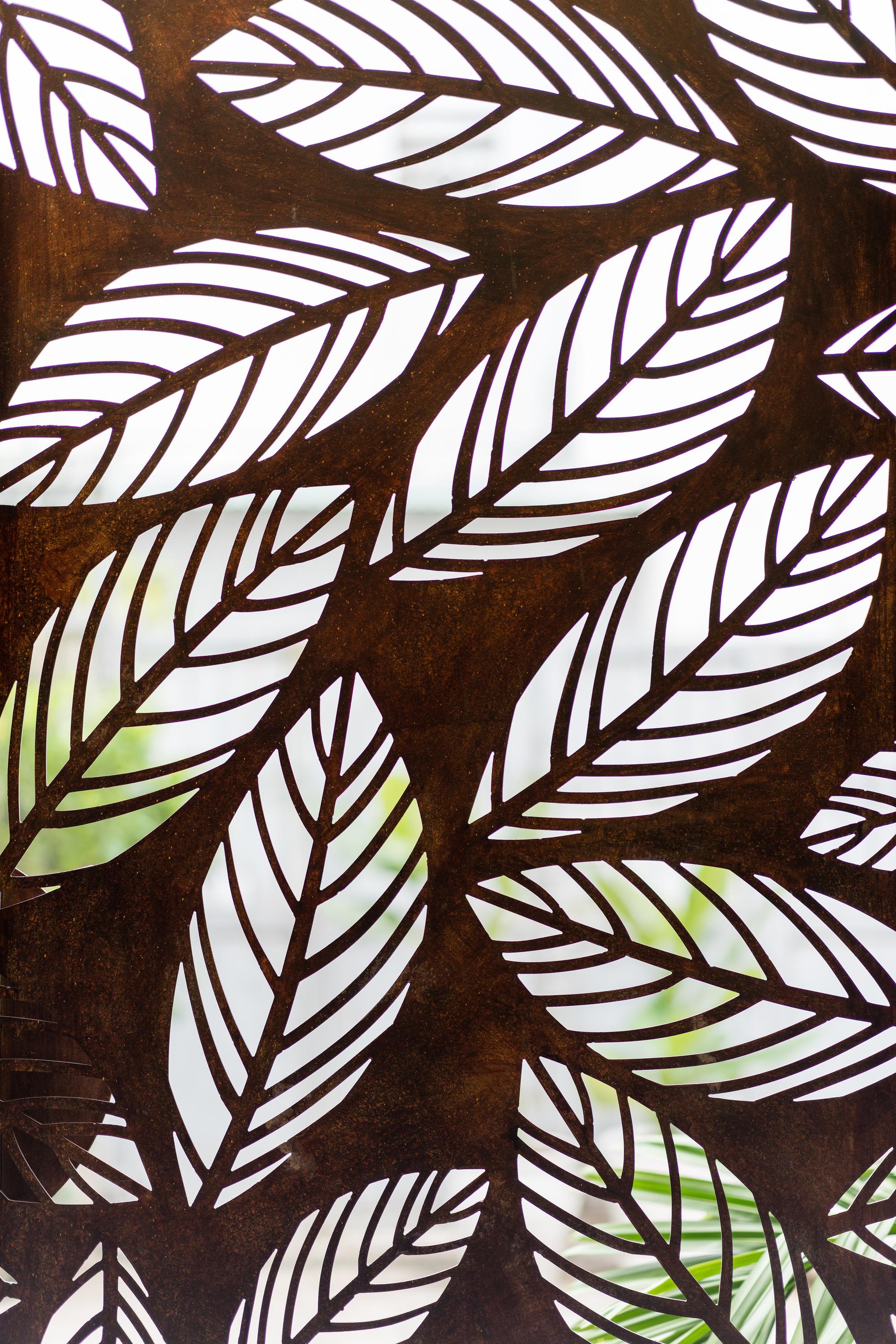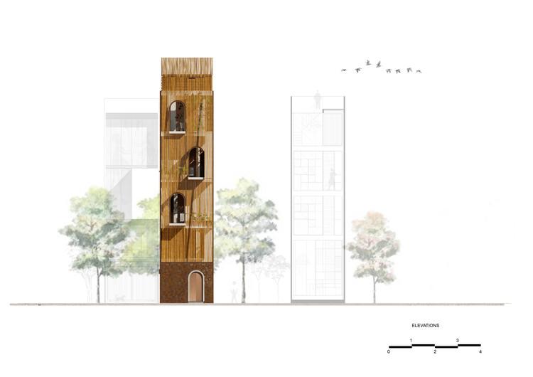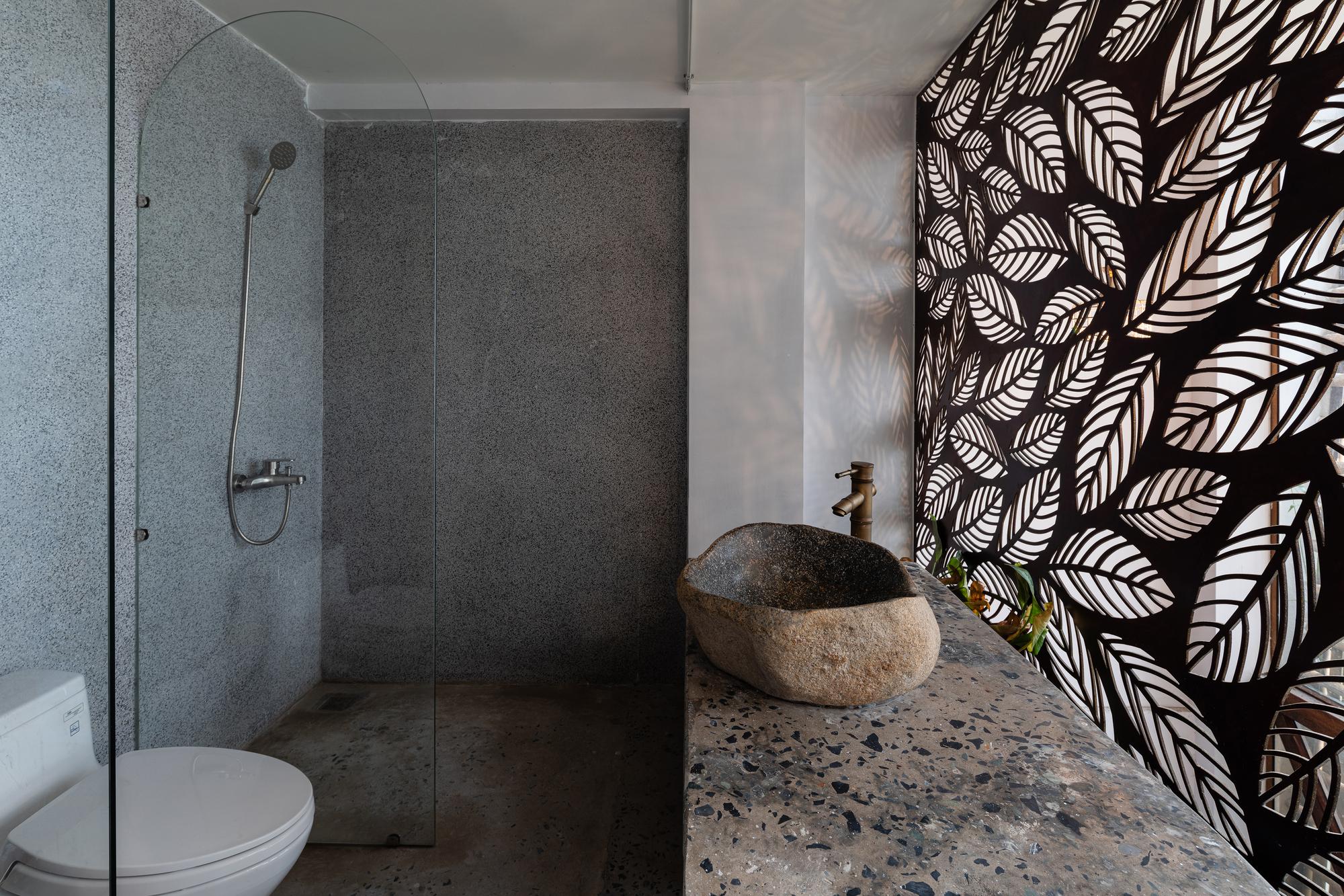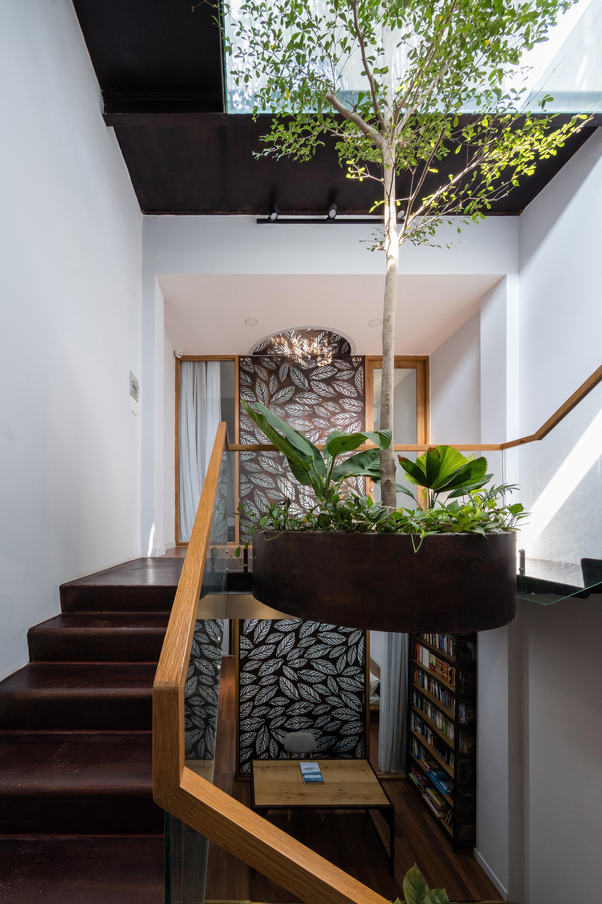 Bên cạnh đó, các nan tre đan cho phép thông gió tự nhiên. Tấm mành tre này cuộn lại để che nắng cho sân thượng. Thanh chắn gió bằng sắt CNC với những hình cắt lá, một phiên bản cách điệu của tấm chắn gió truyền thống (bình phong), có chức năng như một thiết bị đối lưu ánh sáng và không khí. Sắt CNC còn được dùng làm lam che nắng ban công, cửa cổng ra vào. Chúng hoàn toàn tạo ra cảm giác ngôi nhà như một tổng thể mở, kết nối. Trần tre ở giếng trời sân sau, ngay cầu thang, được tạo nên từ những thanh tre thẳng đứng. Điều này cho phép kết nối trực quan với mặt tiền đồng thời đóng vai trò che nắng. Nó cũng cho phép ánh sáng đi qua, không chỉ tạo ra những bóng râm thú vị mà còn tạo ra những âm thanh vui tai như chuông gió treo trong vườn.