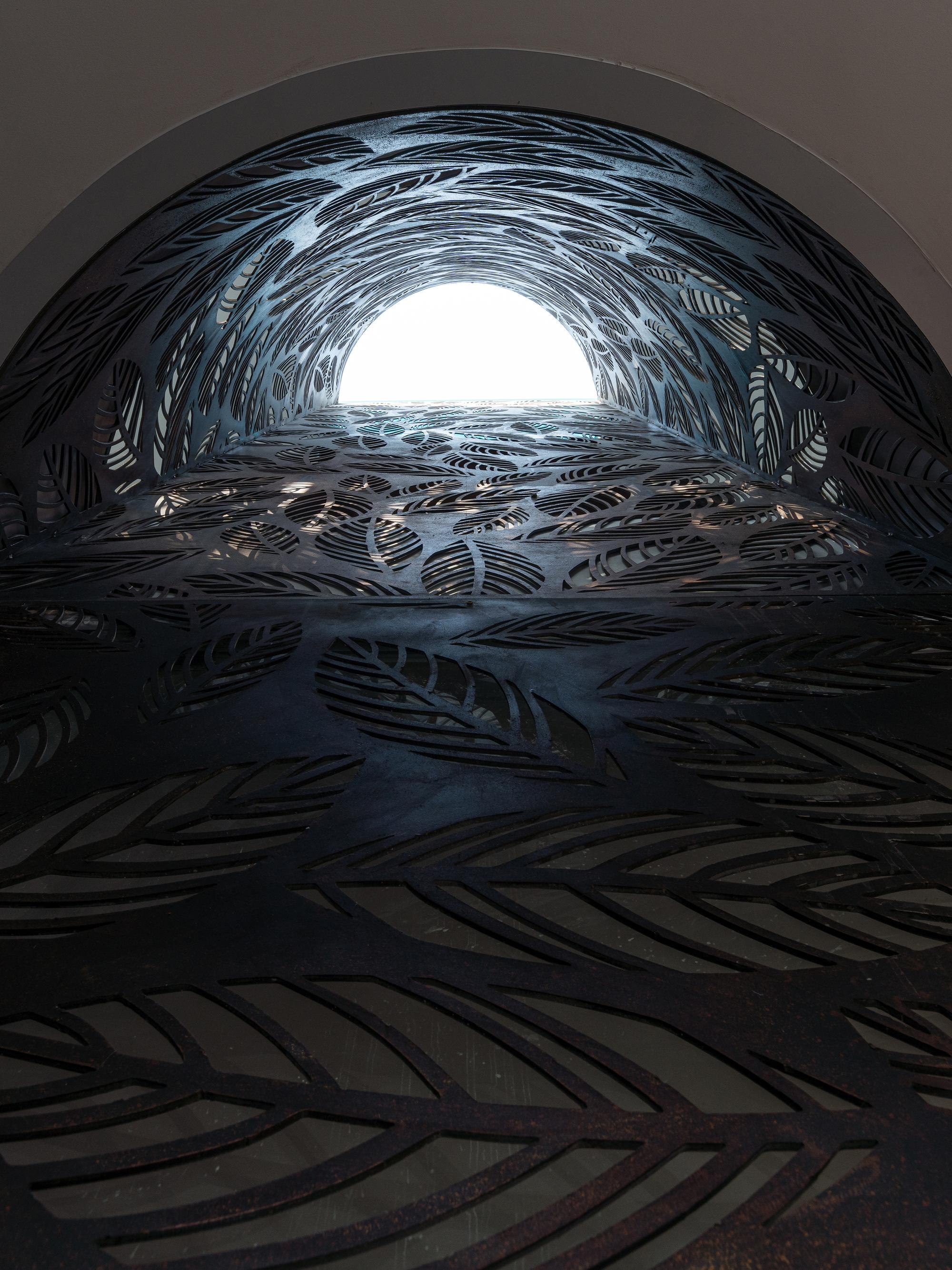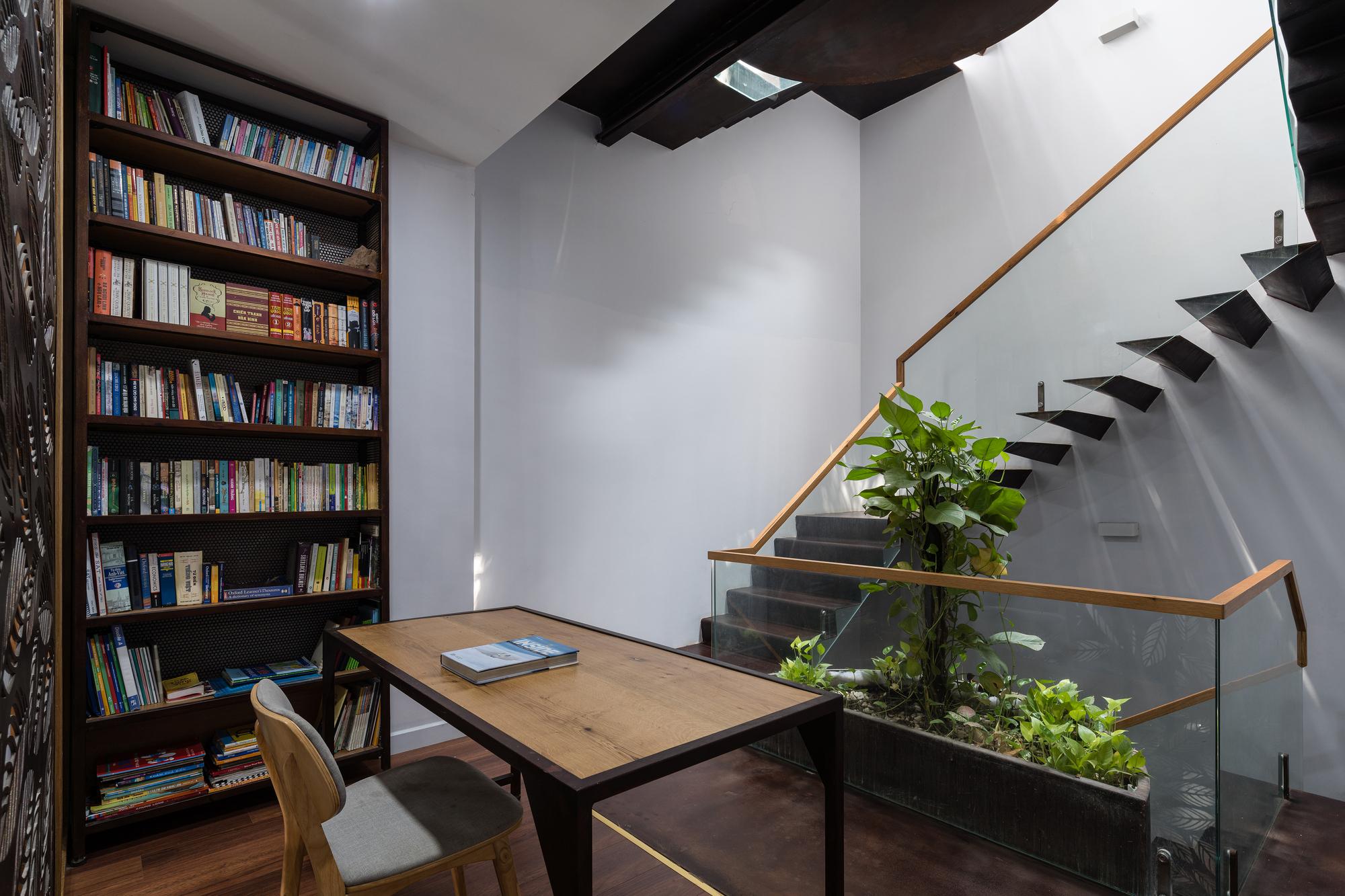 Sắt tấm mỏng được sử dụng cho các cấu kiện kiến trúc thường được xây dựng bằng bê tông như cầu thang, chậu cây, ban công, lam che nắng nhằm giảm trọng lượng kết cấu. Hơn nữa, chúng được thiết kế để trông giống như được treo tự do trên không trung. Vật liệu này cũng được sử dụng làm bối cảnh cho khu vực thay thế, thờ cúng - không gian quan trọng nhất trong ngôi nhà, kéo dài xuống tầng dưới và trở thành không gian thiền định.