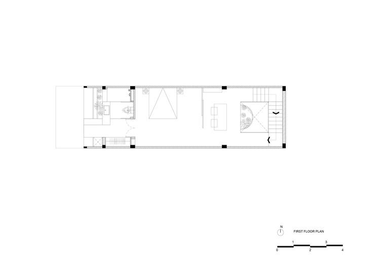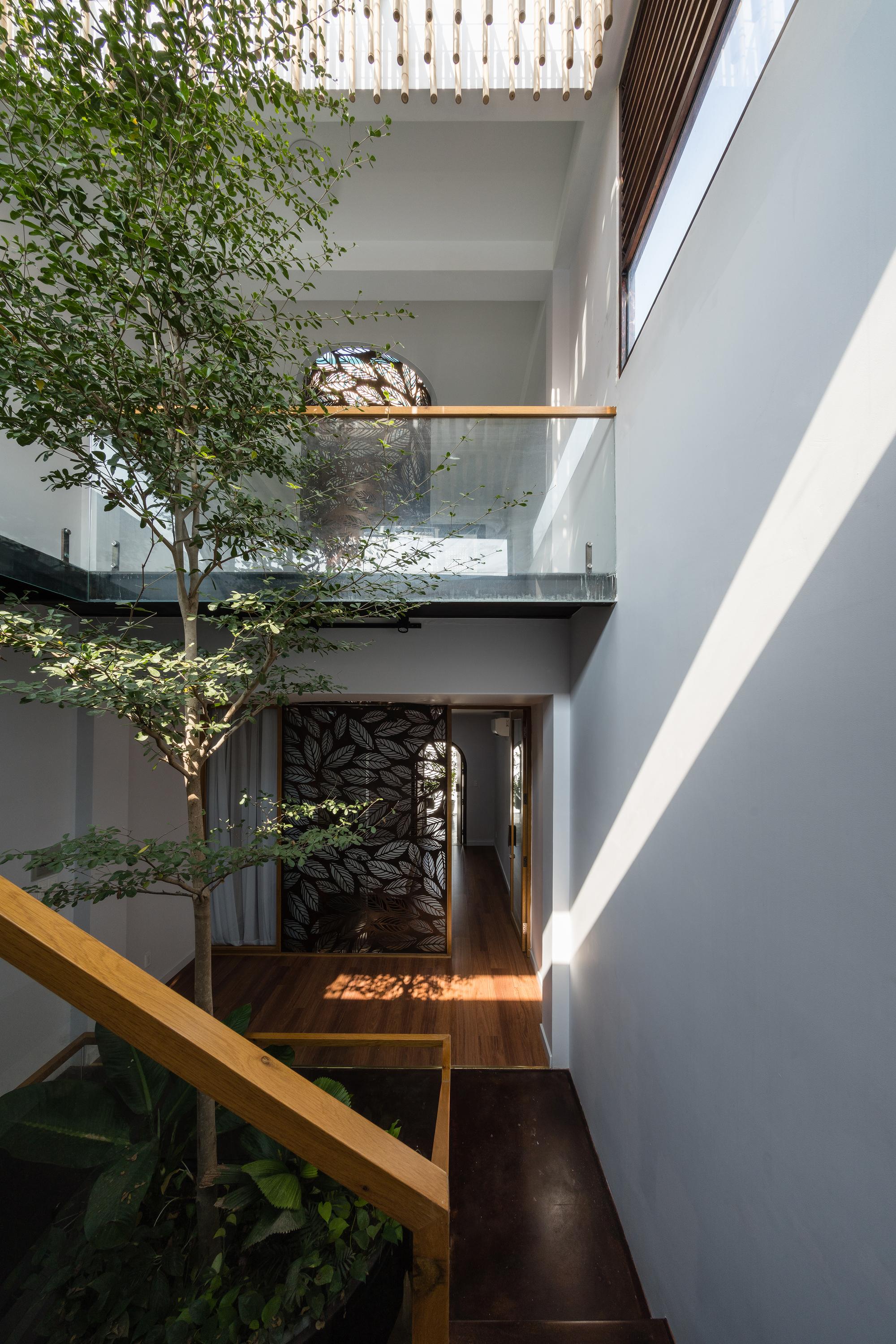 Để giải quyết những hạn chế nêu trên, đồng thời tăng cường chiếu sáng và thông gió tự nhiên, chúng tôi quyết định lược bỏ tường ngăn trong nhà, sử dụng "cây xanh" và "khoảng trống" để phân tách các không gian chức năng. Có ba khoảng trống lớn: vườn trước và vườn sau, kéo dài cả ba tầng, ngăn cách giữa đường và nhà; giếng ánh sáng trung tâm, xuyên suốt hai tầng trên, ngăn cách cơ quan gia chủ với khu nghỉ ngơi, sân vườn với nơi thờ tự.