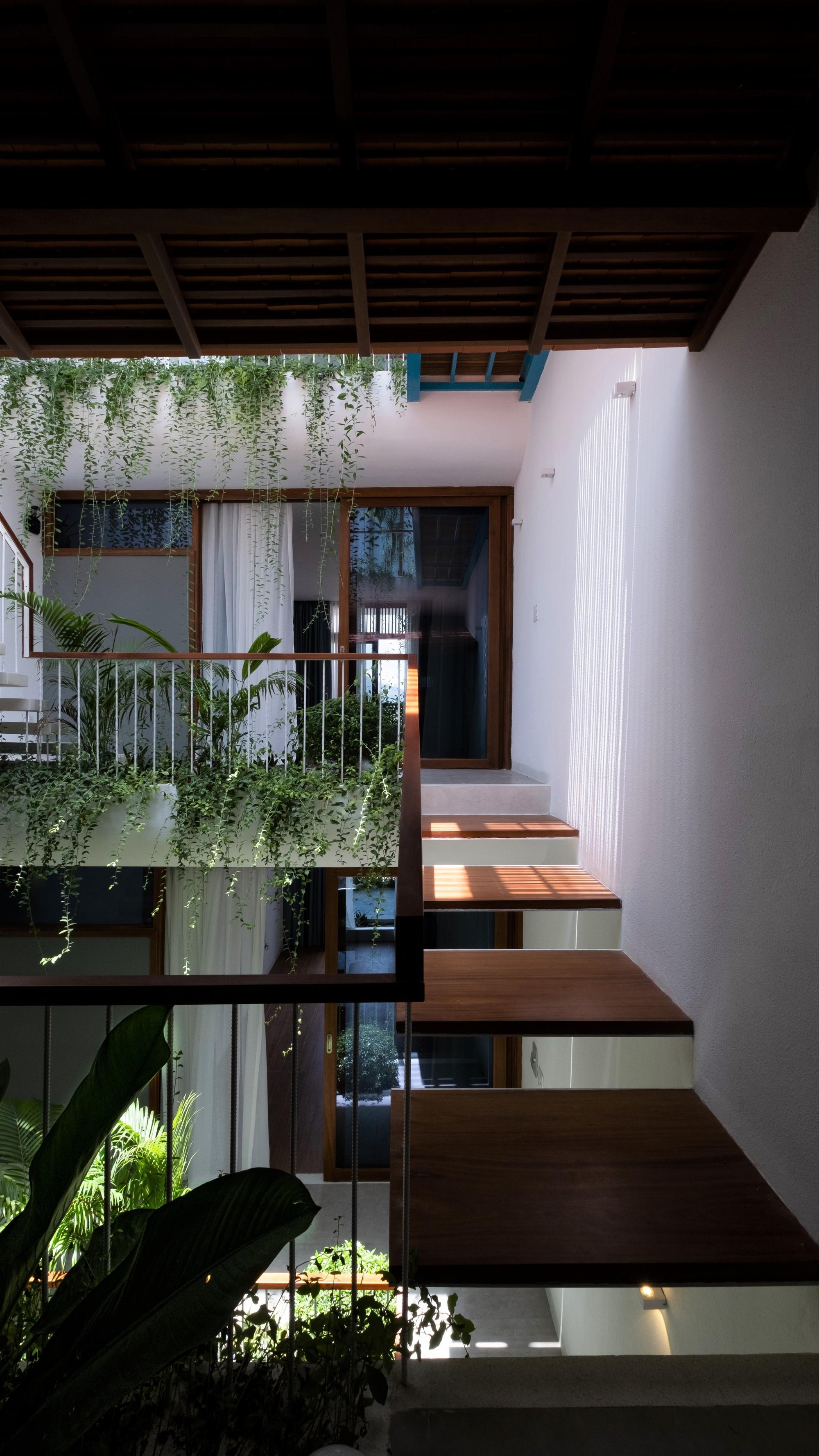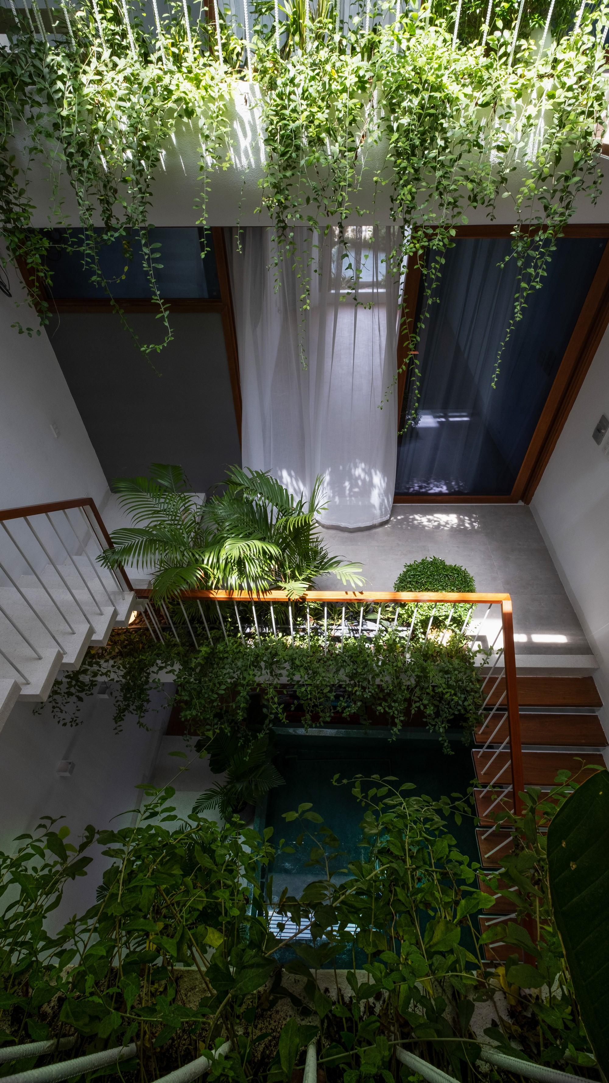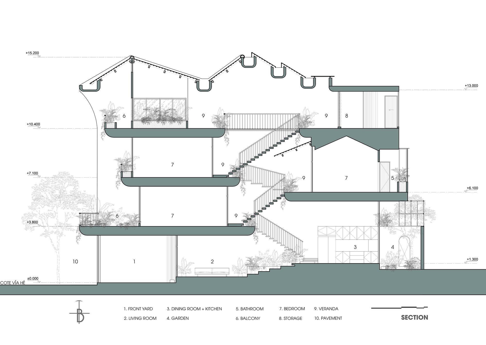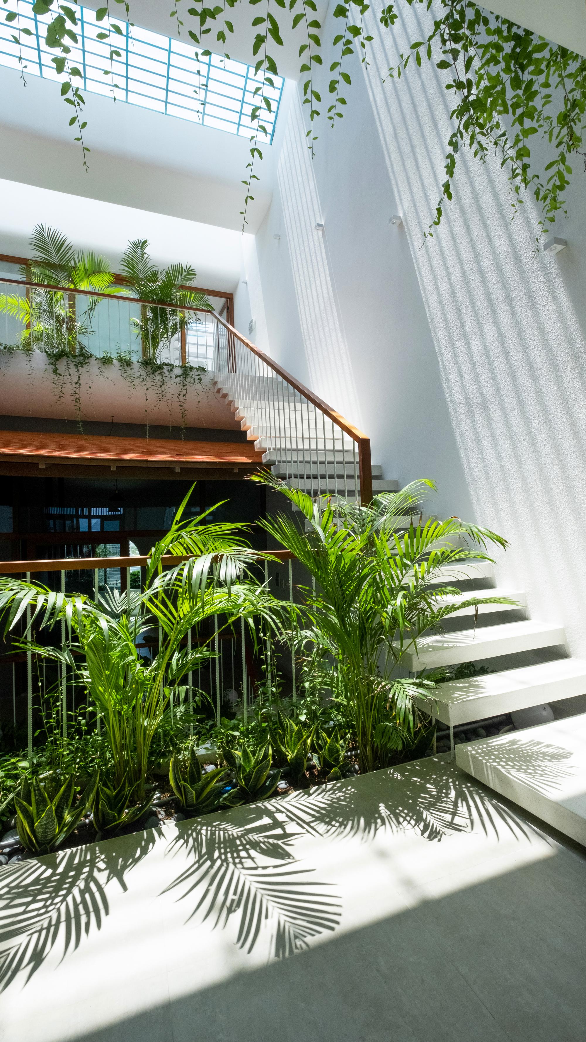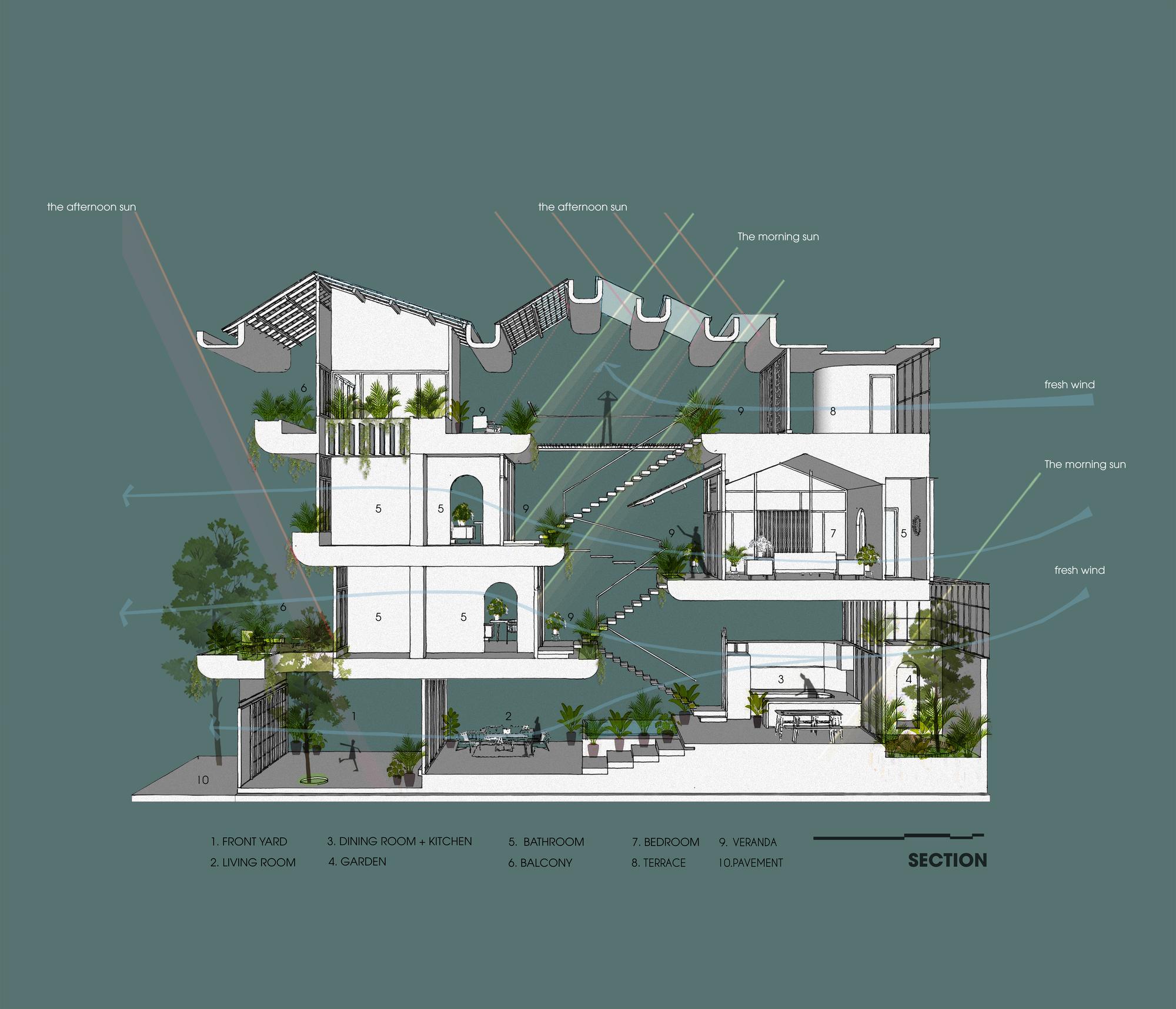 Không gian bậc thang và hệ thống mái thái tạo nên những khu vườn thông tầng liên hoàn, có khoảng lùi sâu che chắn nắng nóng buổi trưa. Từ mỗi phòng ngủ, mọi người cảm nhận được ánh nắng ban mai chiếu qua những tán lá xanh mướt bên những khung cửa lớn. Với hành lang công cộng, ban công, chúng tôi muốn tạo ra một số khoảng thông tầng giữa không gian chung và không gian riêng. Đó là sự chuyển đổi ánh sáng, không gian thiên nhiên, tầm nhìn và sự kết nối của con người trong các không gian vừa mở, vừa bao trùm, vừa riêng tư và nhạy cảm.