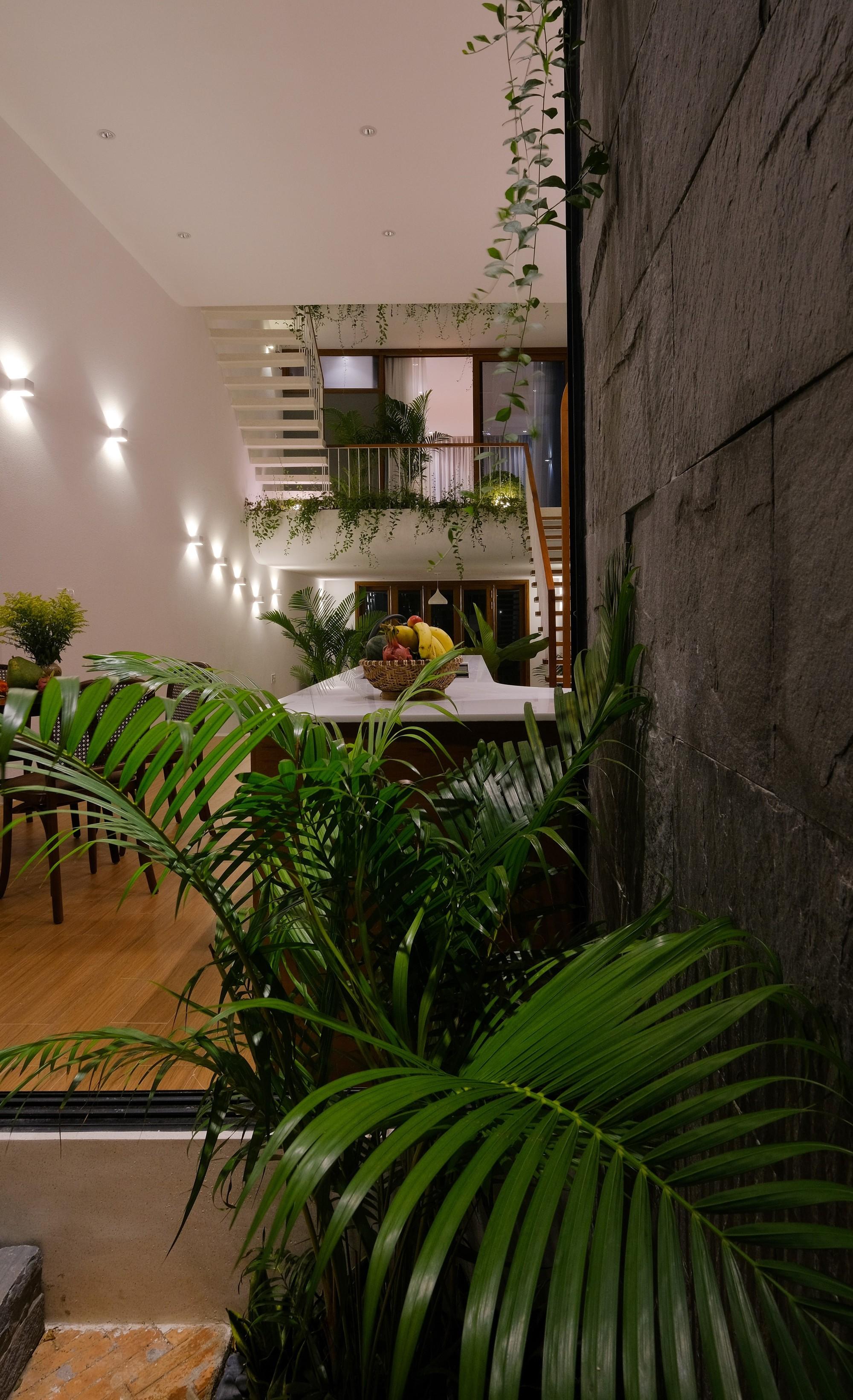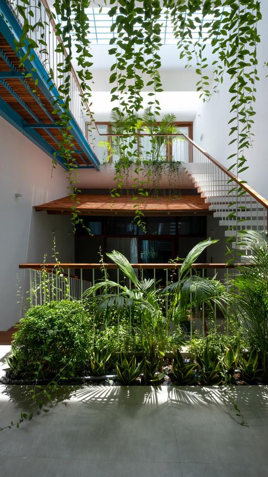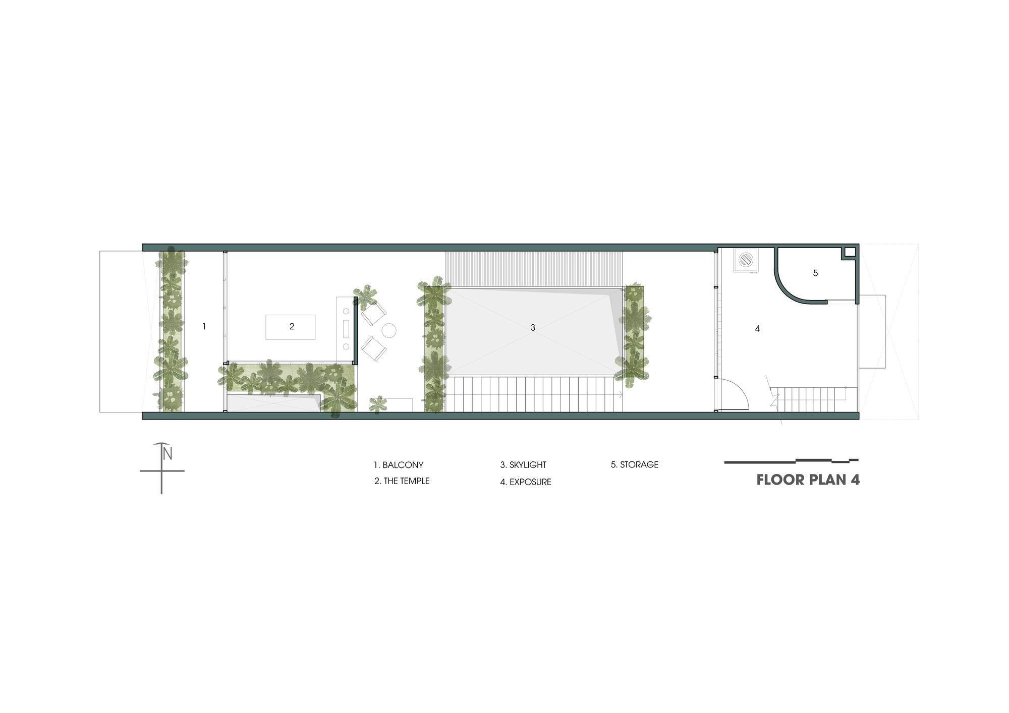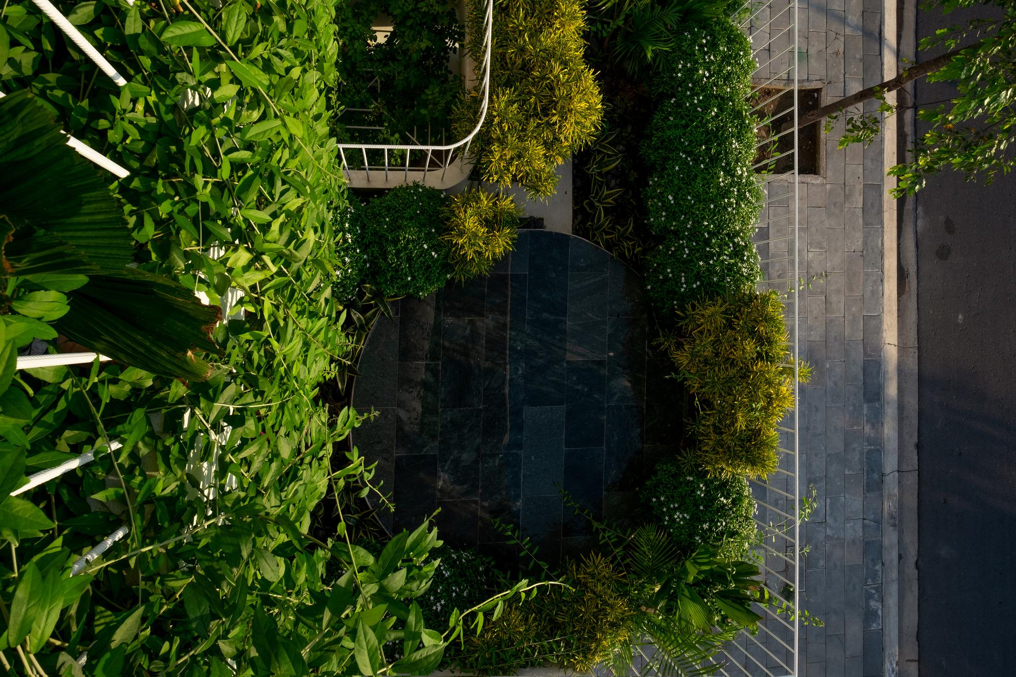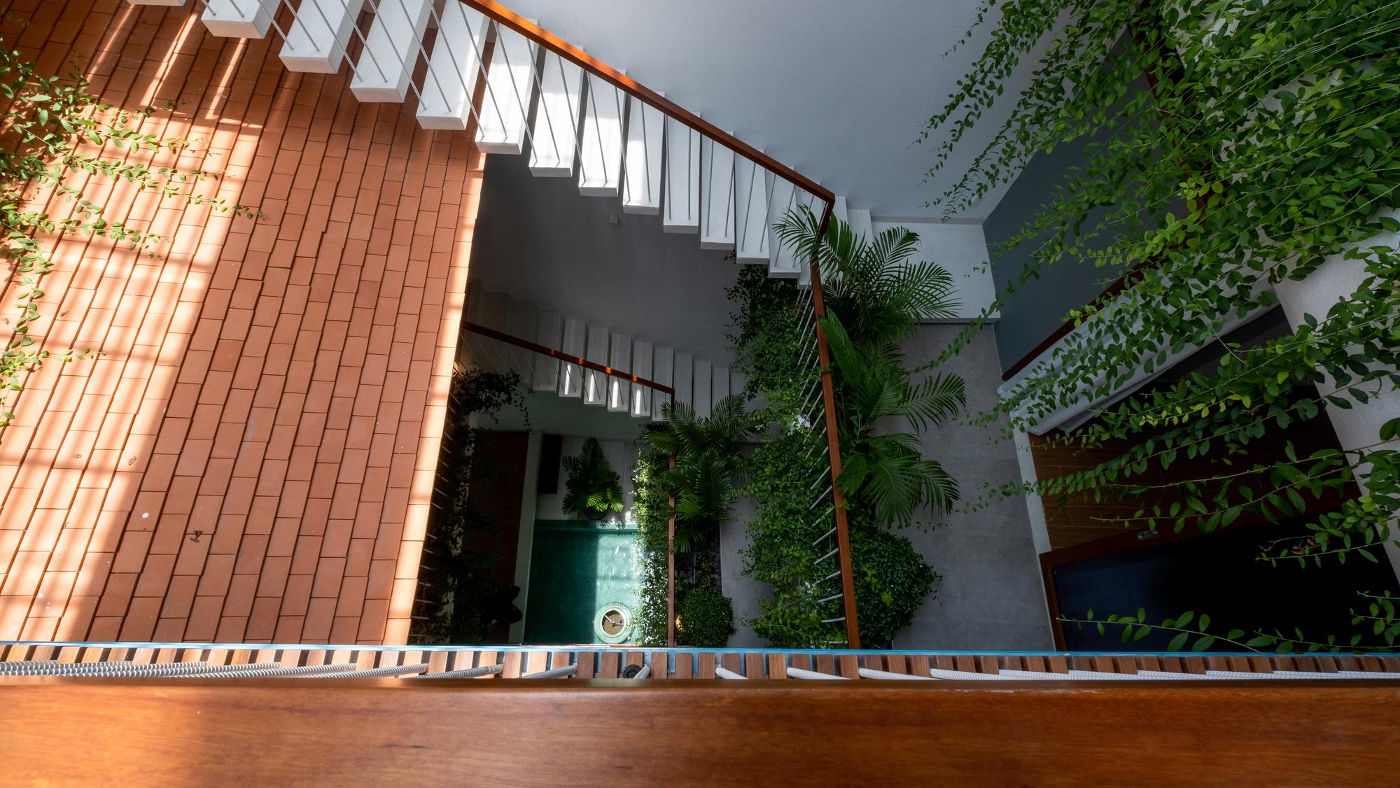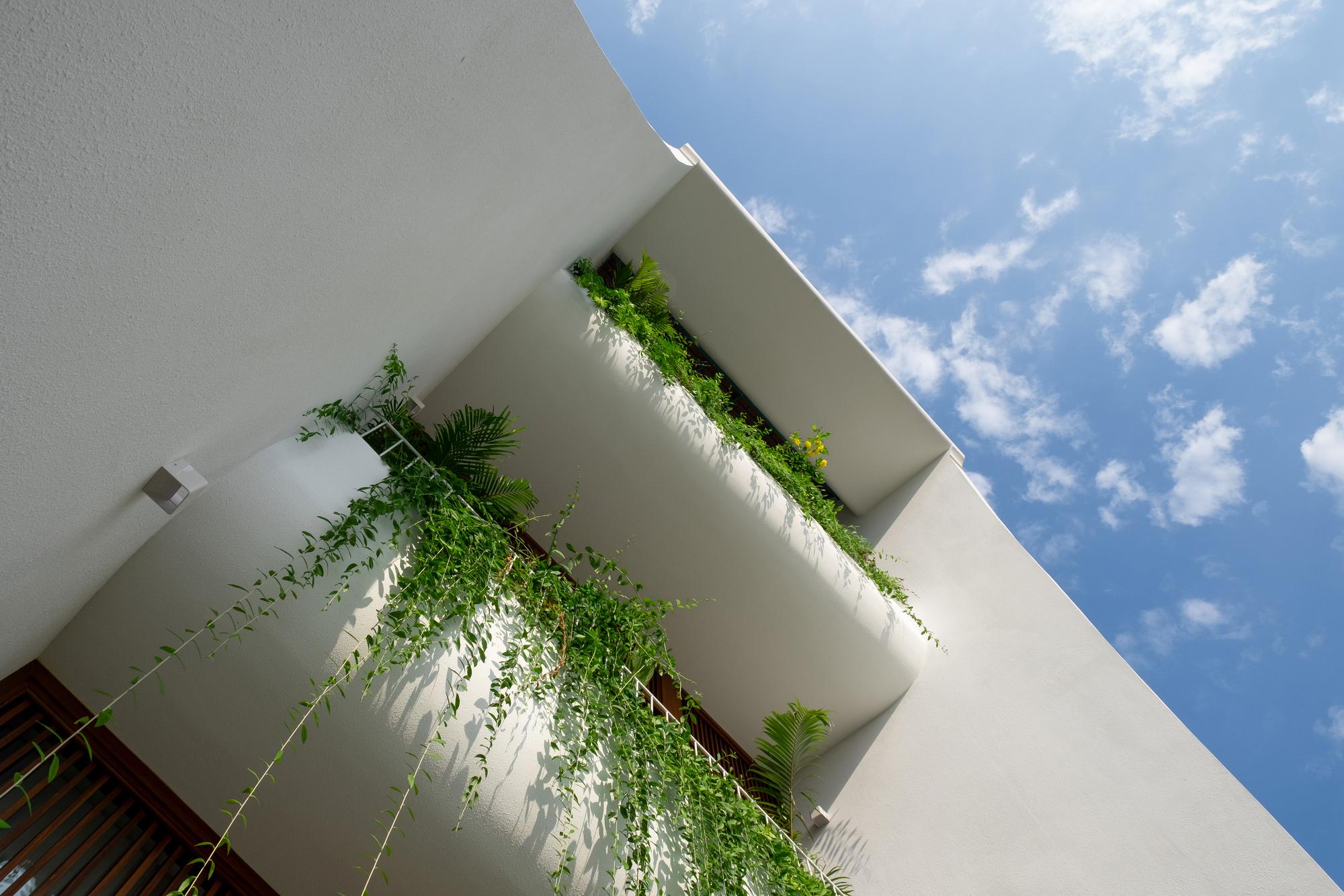 Không gian bậc thang và hệ thống mái thái tạo nên những khu vườn thông tầng liên hoàn, có khoảng lùi sâu che chắn nắng nóng buổi trưa. Từ mỗi phòng ngủ, mọi người cảm nhận được ánh nắng ban mai chiếu qua những tán lá xanh mướt bên những khung cửa lớn. Với hành lang công cộng, ban công, chúng tôi muốn tạo ra một số khoảng thông tầng giữa không gian chung và không gian riêng. Đó là sự chuyển đổi ánh sáng, không gian thiên nhiên, tầm nhìn và sự kết nối của con người trong các không gian vừa mở, vừa bao trùm, vừa riêng tư và nhạy cảm.