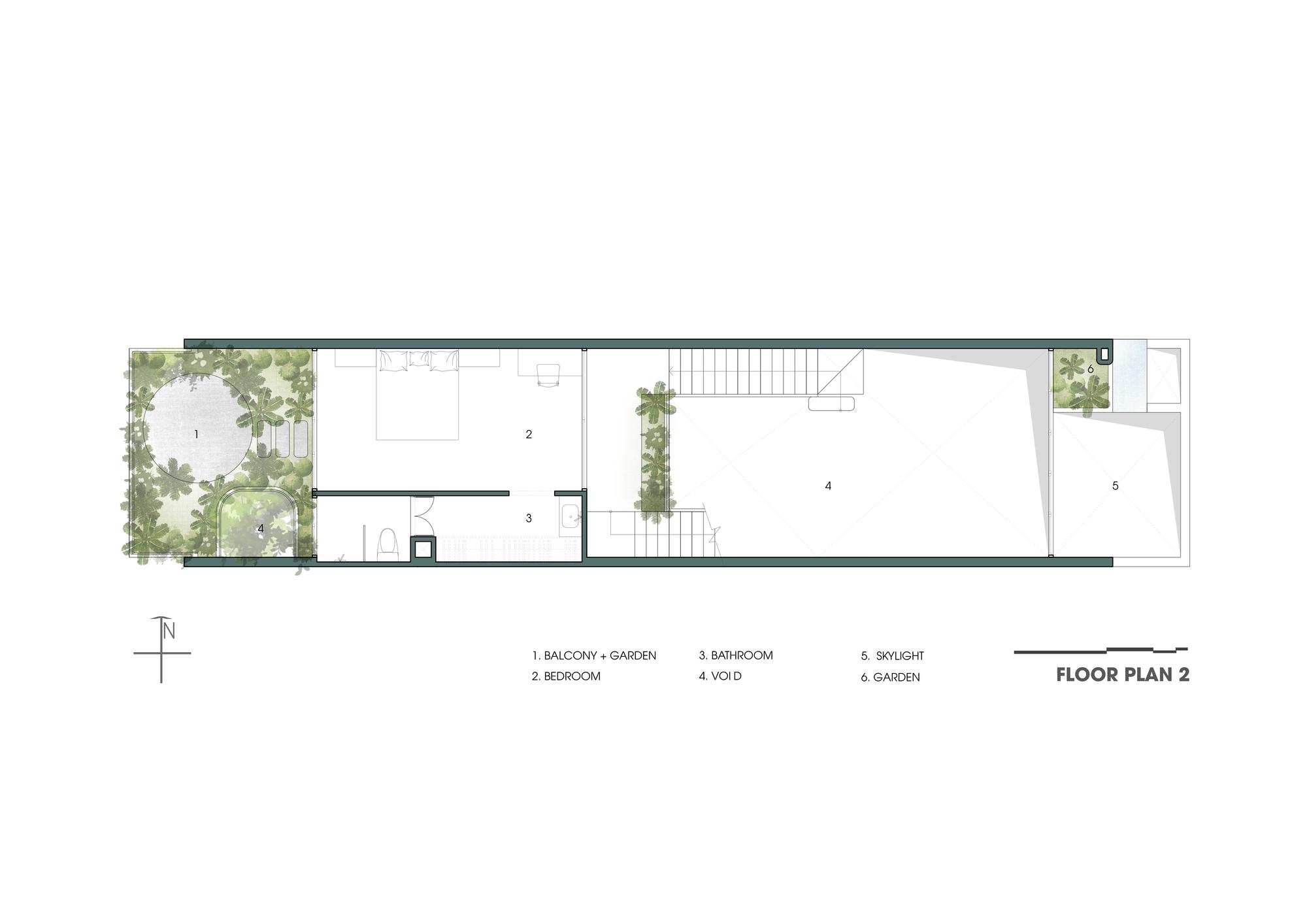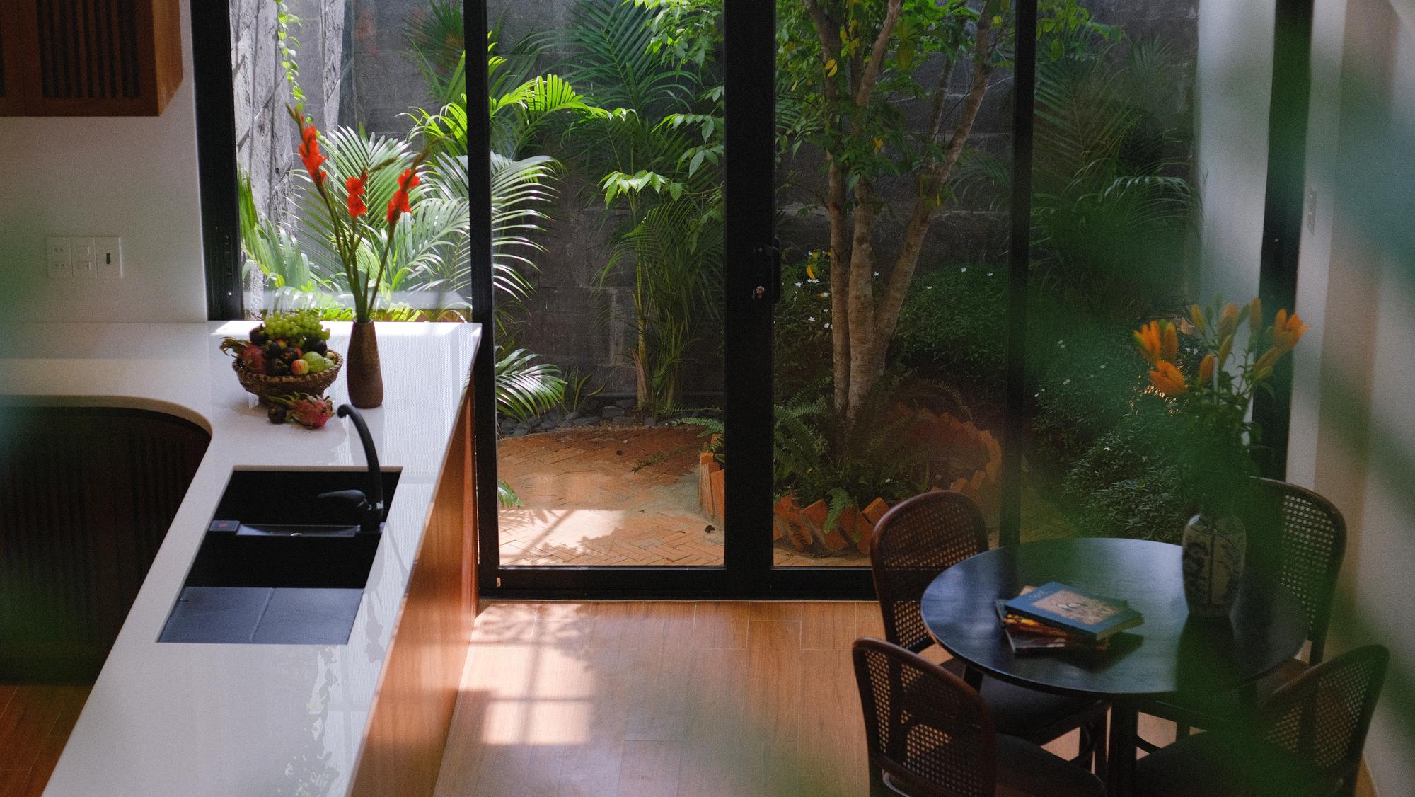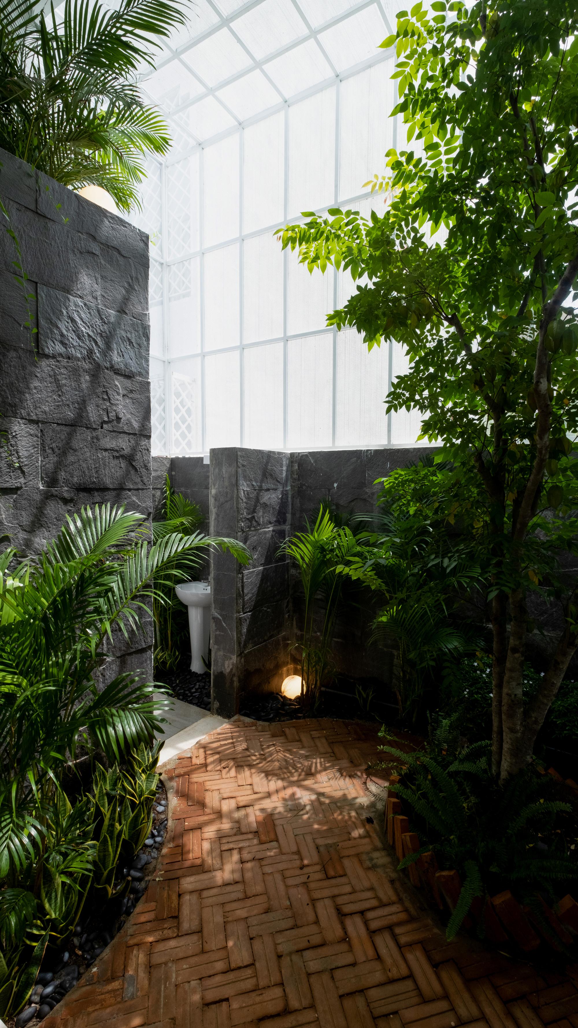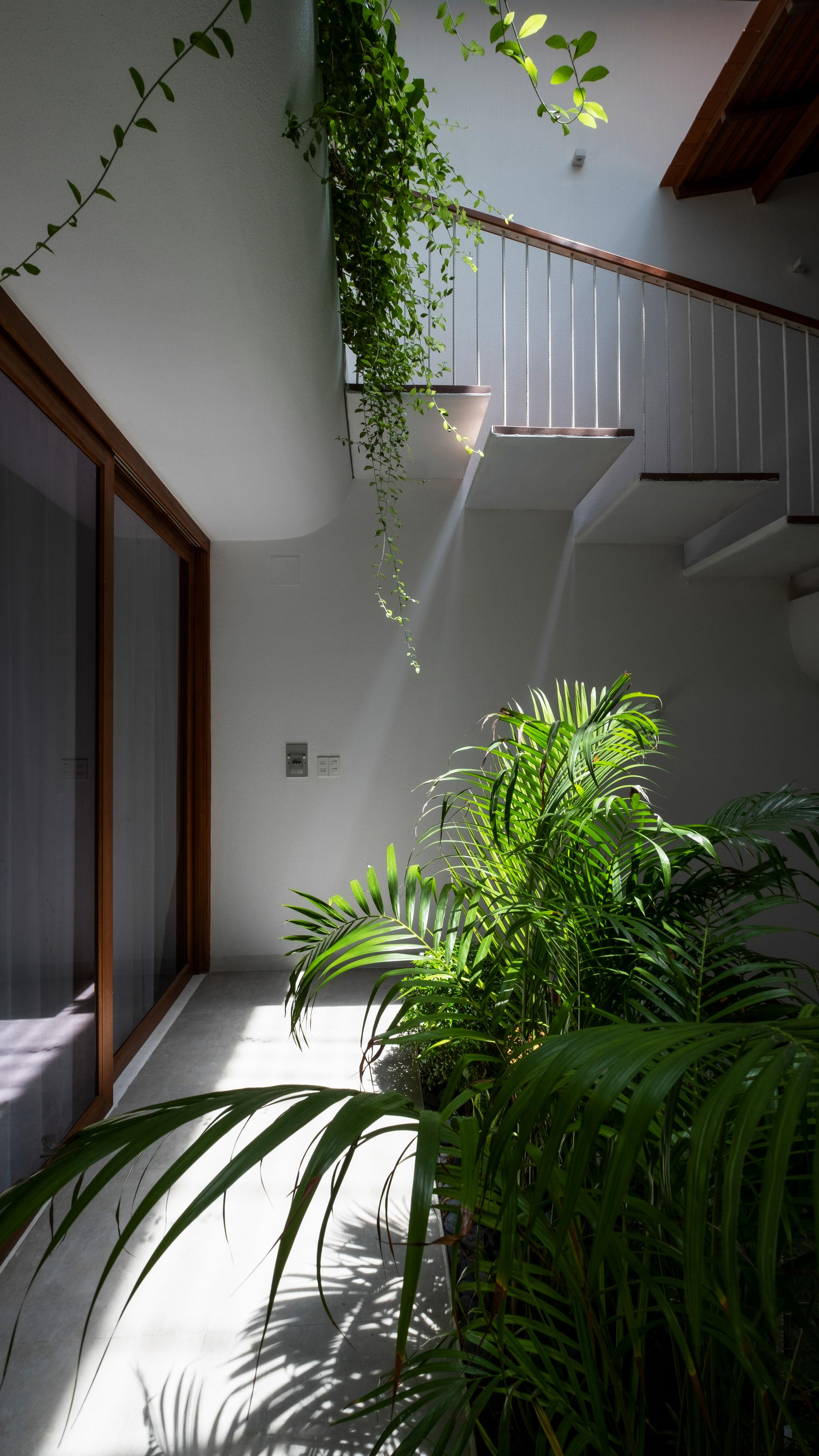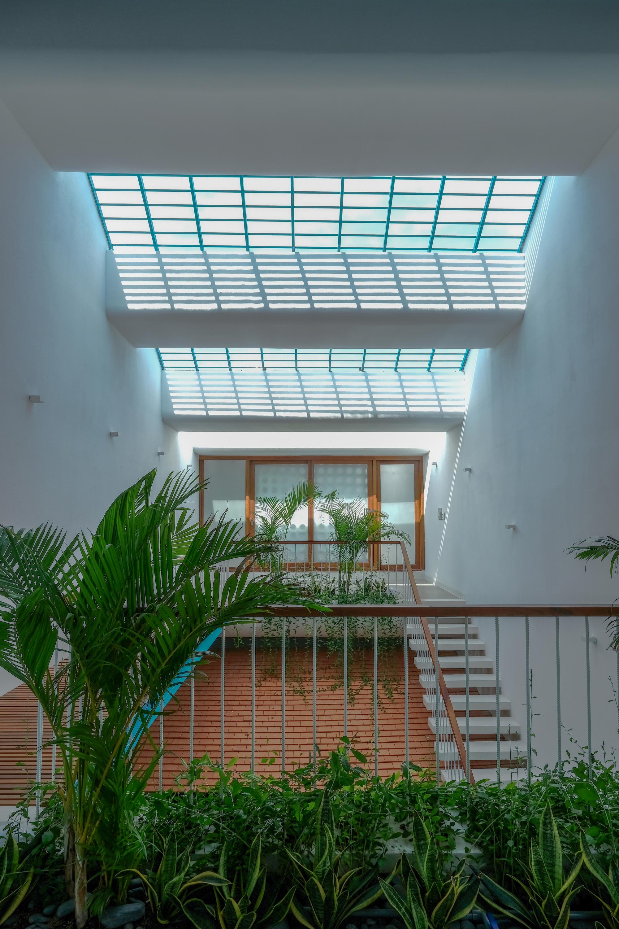 Không gian bậc thang và hệ thống mái thái tạo nên những khu vườn thông tầng liên hoàn, có khoảng lùi sâu che chắn nắng nóng buổi trưa. Từ mỗi phòng ngủ, mọi người cảm nhận được ánh nắng ban mai chiếu qua những tán lá xanh mướt bên những khung cửa lớn. Với hành lang công cộng, ban công, chúng tôi muốn tạo ra một số khoảng thông tầng giữa không gian chung và không gian riêng. Đó là sự chuyển đổi ánh sáng, không gian thiên nhiên, tầm nhìn và sự kết nối của con người trong các không gian vừa mở, vừa bao trùm, vừa riêng tư và nhạy cảm.