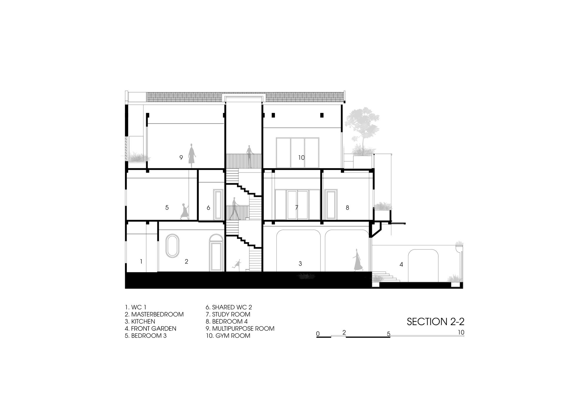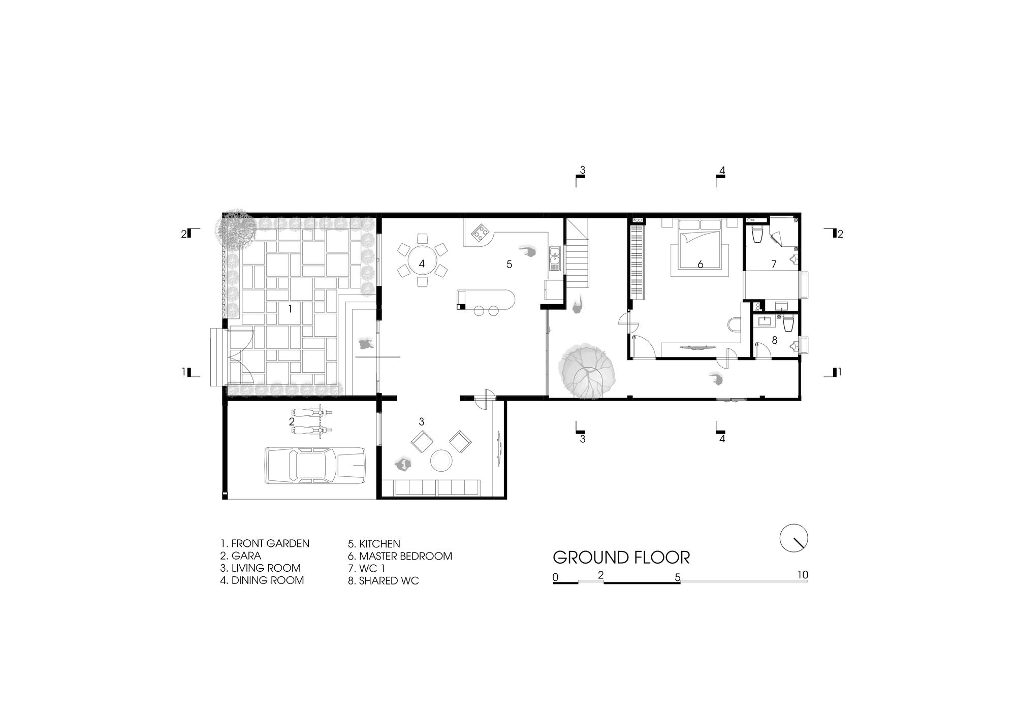 Phần sân trước hiện tại đã bị che lấp, nằm sát đường và khá cao so với vỉa hè nên kiến trúc sư đã hạ nền đồng thời dỡ bỏ mái che để trả lại sân vườn. Điều này vừa tạo khoảng lùi vừa hạn chế ô nhiễm tiếng ồn, khói bụi từ bên ngoài đồng thời khu vườn này còn hấp thụ và giảm nhiệt mặt trời.