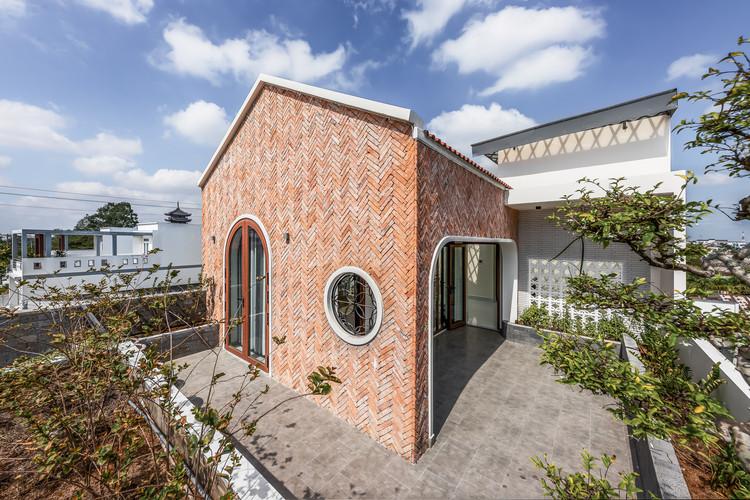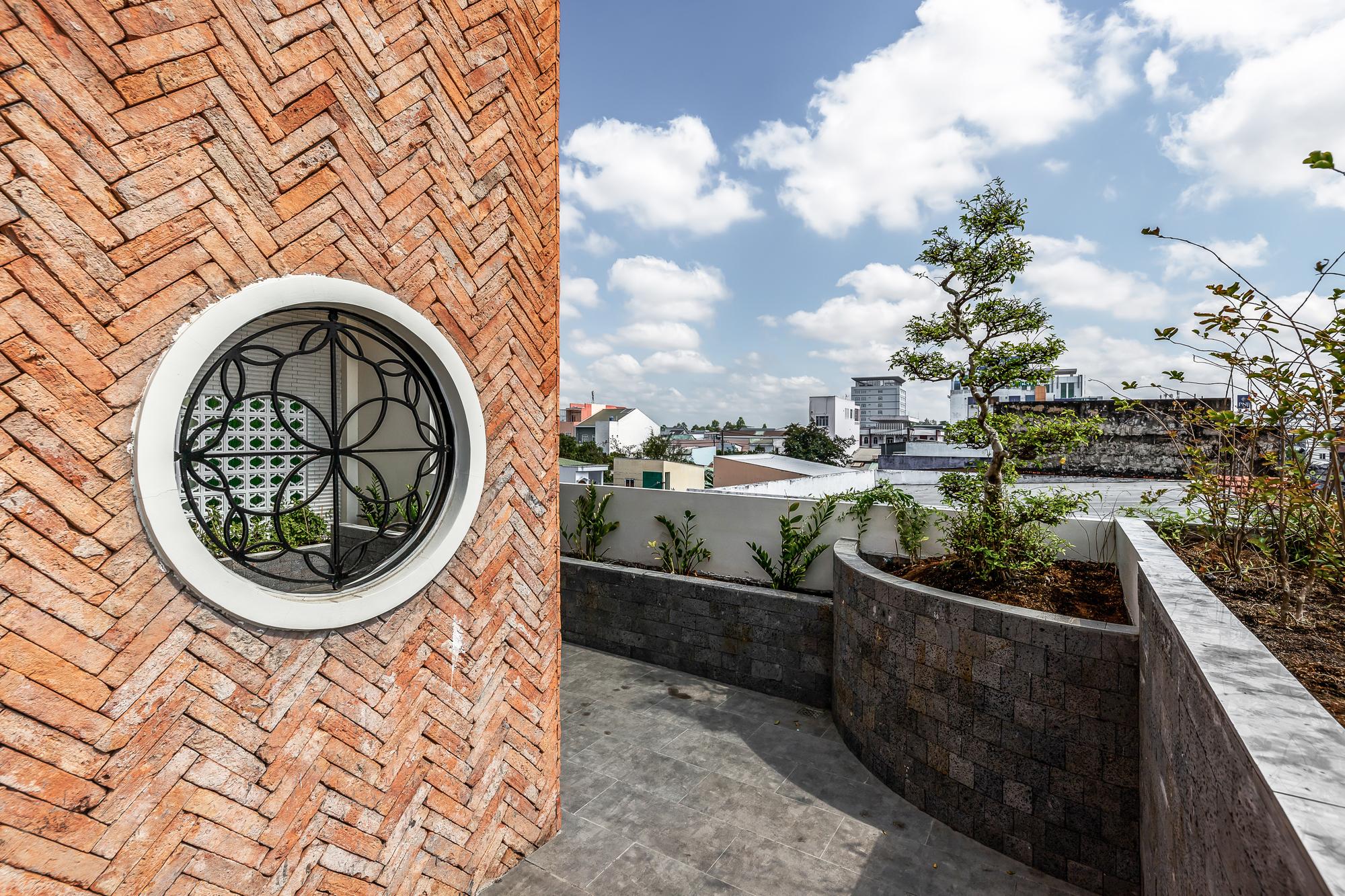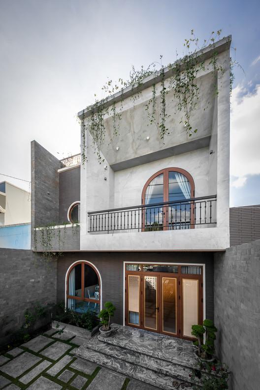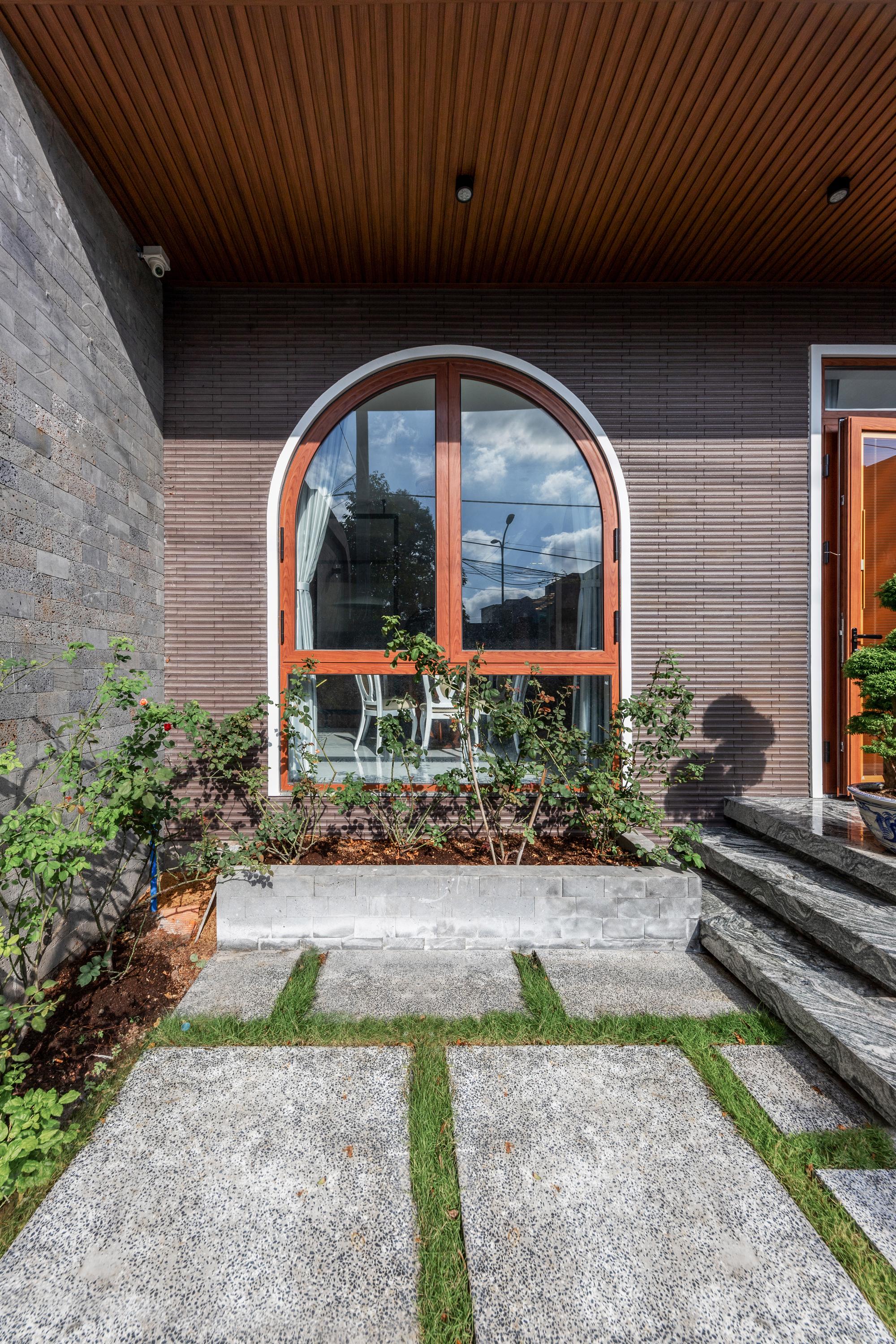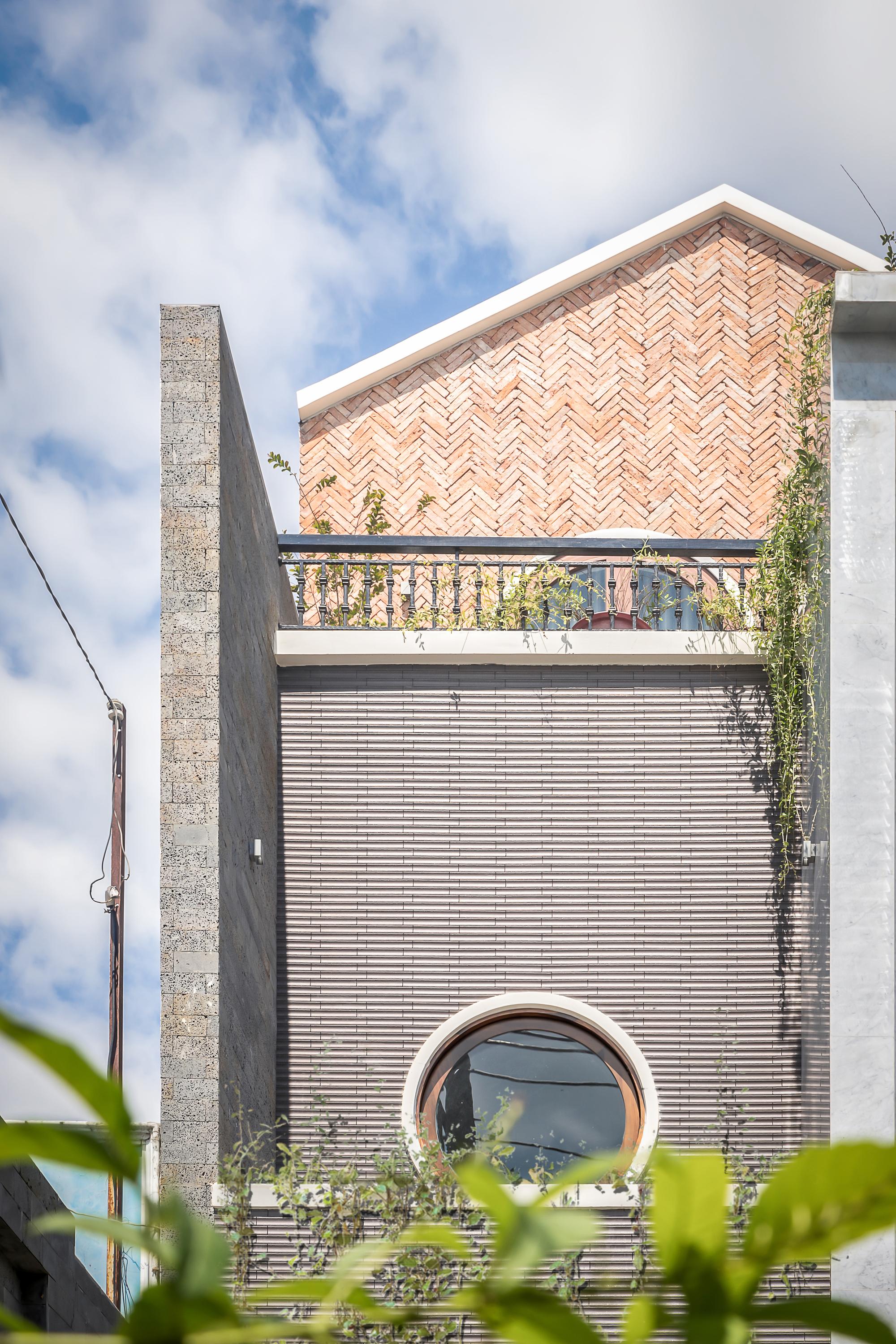 Mặt tiền mới là sự kết hợp hoàn hảo giữa hiện đại và truyền thống. Mái đầu hồi và những vòm cong gợi lên những ký ức quen thuộc về những ngôi nhà cổ mà vẫn giữ được nét hài hòa về hình thức kiến trúc với những ngôi nhà lân cận. Những viên gạch nung cũ được tái sử dụng mang lại giá trị truyền thống hồi sinh và màu gạch đỏ cùng họa tiết gạch ngoằn ngoèo giúp ngôi nhà được nhận diện từ xa và tạo nên nét cá tính rất riêng cho ngôi nhà. Các ô thoáng được bố trí ở những vị trí phù hợp để đón ánh sáng, thông gió tự nhiên nhưng vẫn giữ được sự riêng tư cho gia chủ và giúp ngôi nhà tự “thở”.