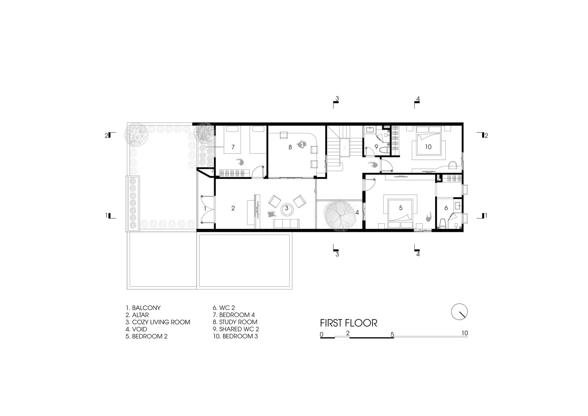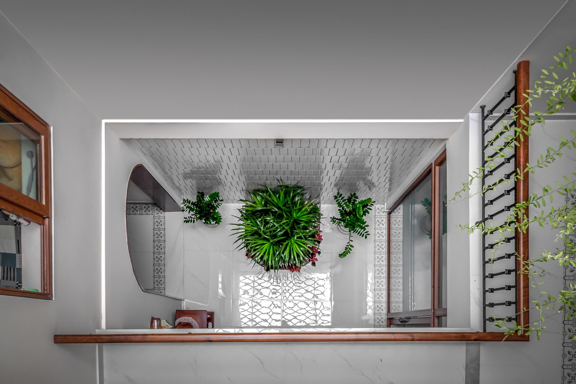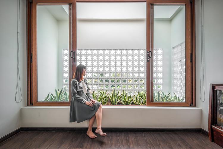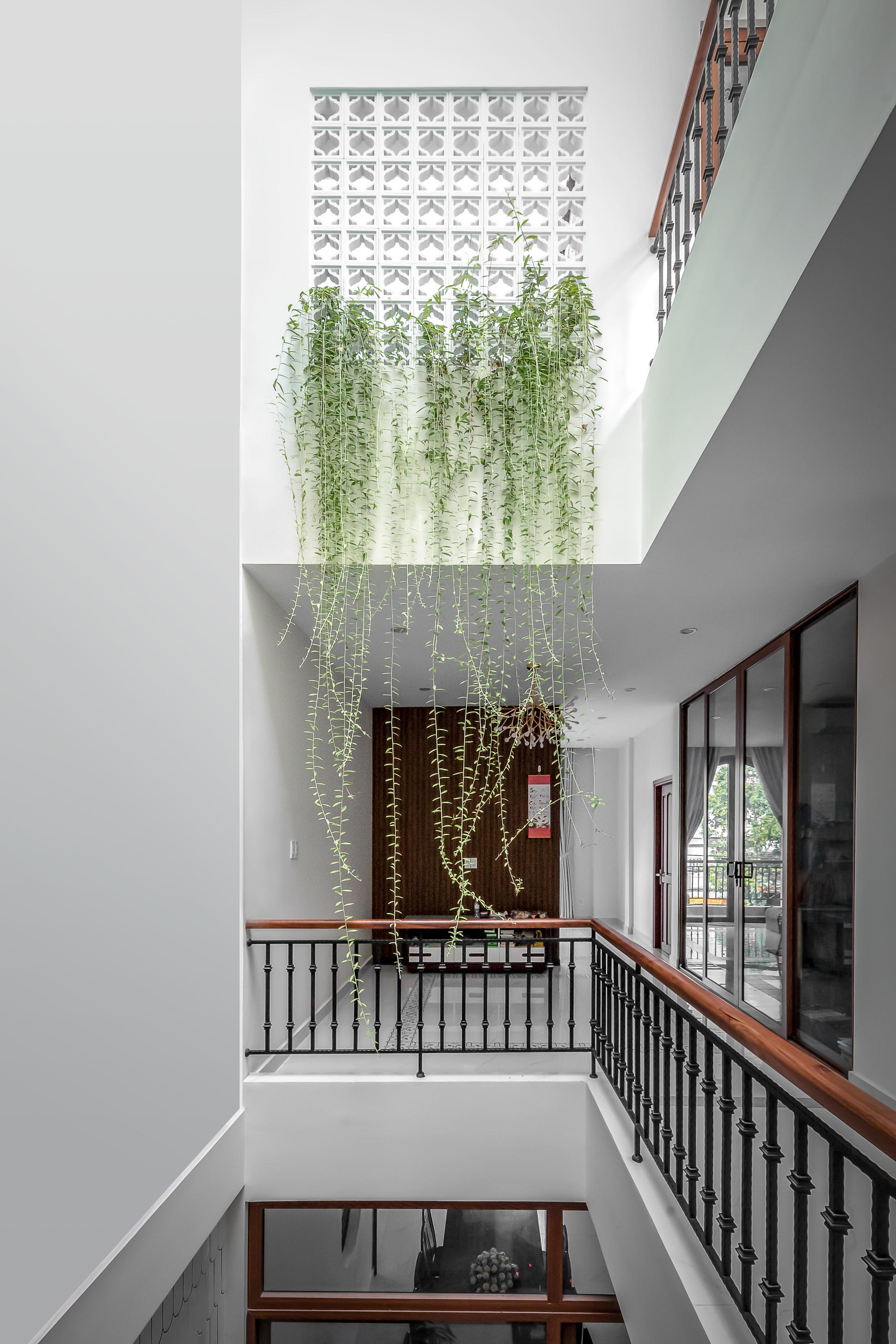 Nội thất - Nội thất của ngôi nhà được thiết kế với phong cách hiện đại xen lẫn nét truyền thống Á Đông. Tầng 1 là không gian mở hoàn toàn, tràn ngập ánh sáng tự nhiên gồm bếp, bàn trà gia đình, phòng khách. Không sử dụng vách ngăn để tạo sự thân mật, ấm cúng và gắn kết các thành viên trong gia đình.