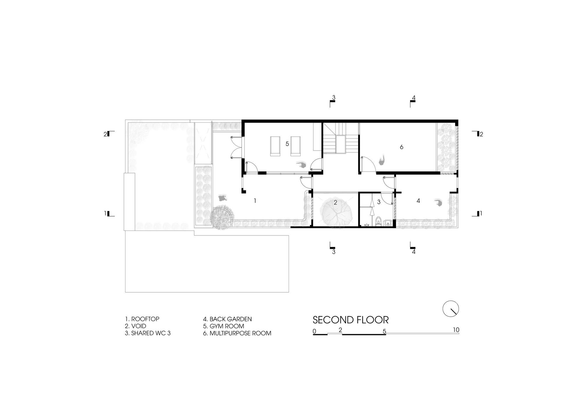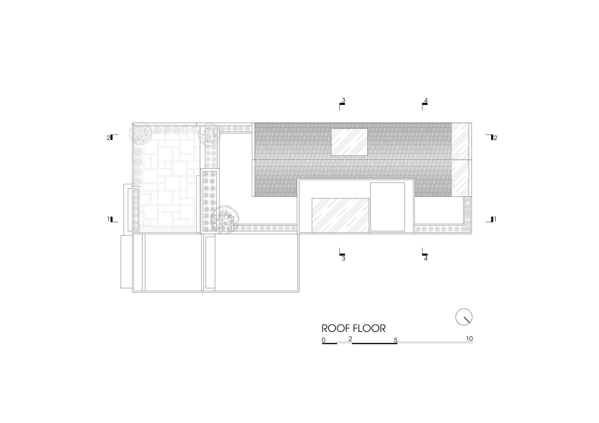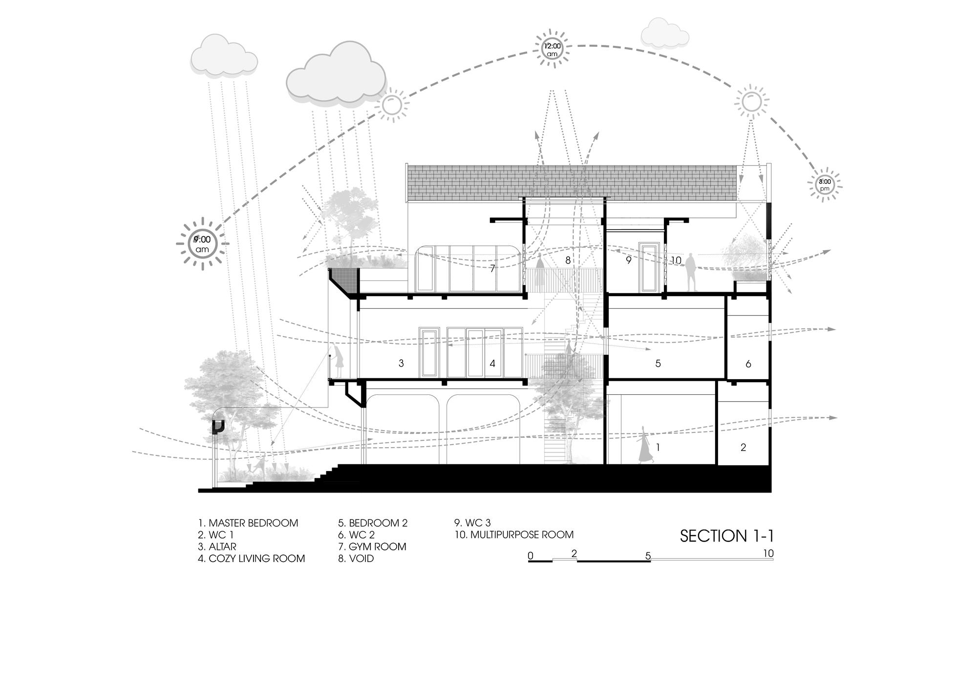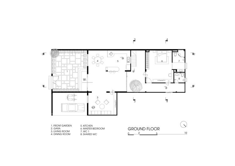 Toàn bộ phần móng và cột đều được giữ lại để hạn chế ảnh hưởng đến kết cấu của ngôi nhà. Những bức tường ngăn cách giữa các ngôi nhà cũ được xóa bỏ, mang đến những không gian rộng lớn và liên thông, đáp ứng đầy đủ nhu cầu ở lâu dài của gia chủ. Cầu thang thừa được thay thế bằng giếng trời lớn đủ để ánh sáng tự nhiên khuếch tán vào mọi ngóc ngách trong nhà và cây cối bên trong vẫn có thể phát triển tự nhiên. Dựa trên ánh sáng tự nhiên, ngôi nhà không phải sử dụng đèn điện vào ban ngày để giảm và tiết kiệm năng lượng tiêu thụ.