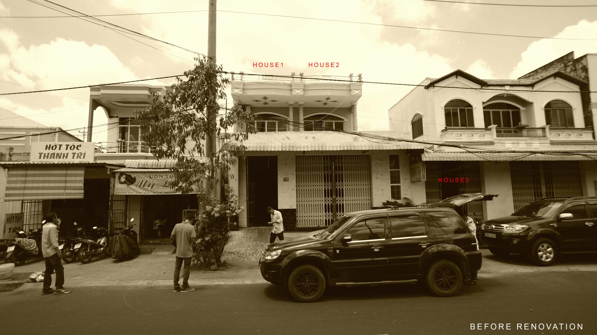 Kiến trúc - Ngôi nhà 3become1 được cải tạo từ ba ngôi nhà ống riêng biệt trở thành một thể thống nhất và đáp ứng mọi yêu cầu công năng của gia chủ. Trước khi cải tạo, ngôi nhà này có nhiều hạn chế: phòng ngủ nhỏ, thiếu ánh sáng tự nhiên, ngột ngạt, phòng tắm ẩm ướt và xuống cấp, hành lang dài và tối, không có sân vườn, tiểu cảnh. Mặt tiền của ngôi nhà trước khi cải tạo không tương đồng, chưa tạo được điểm nhấn về hình khối và màu sắc dù nằm trên mặt đường lớn, sầm uất.
