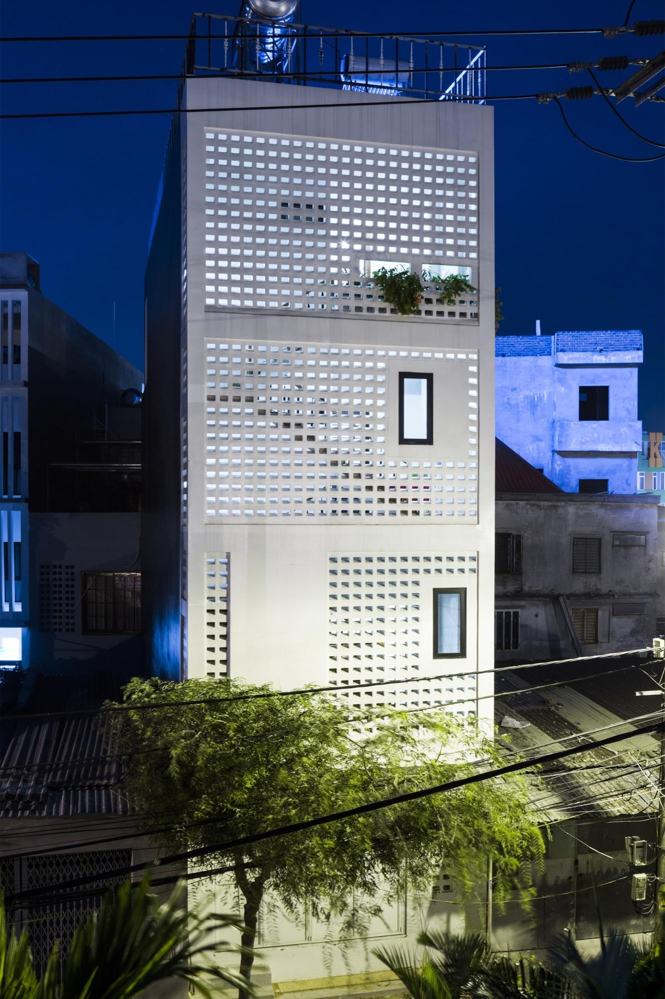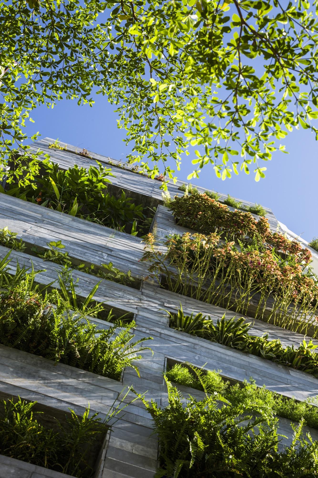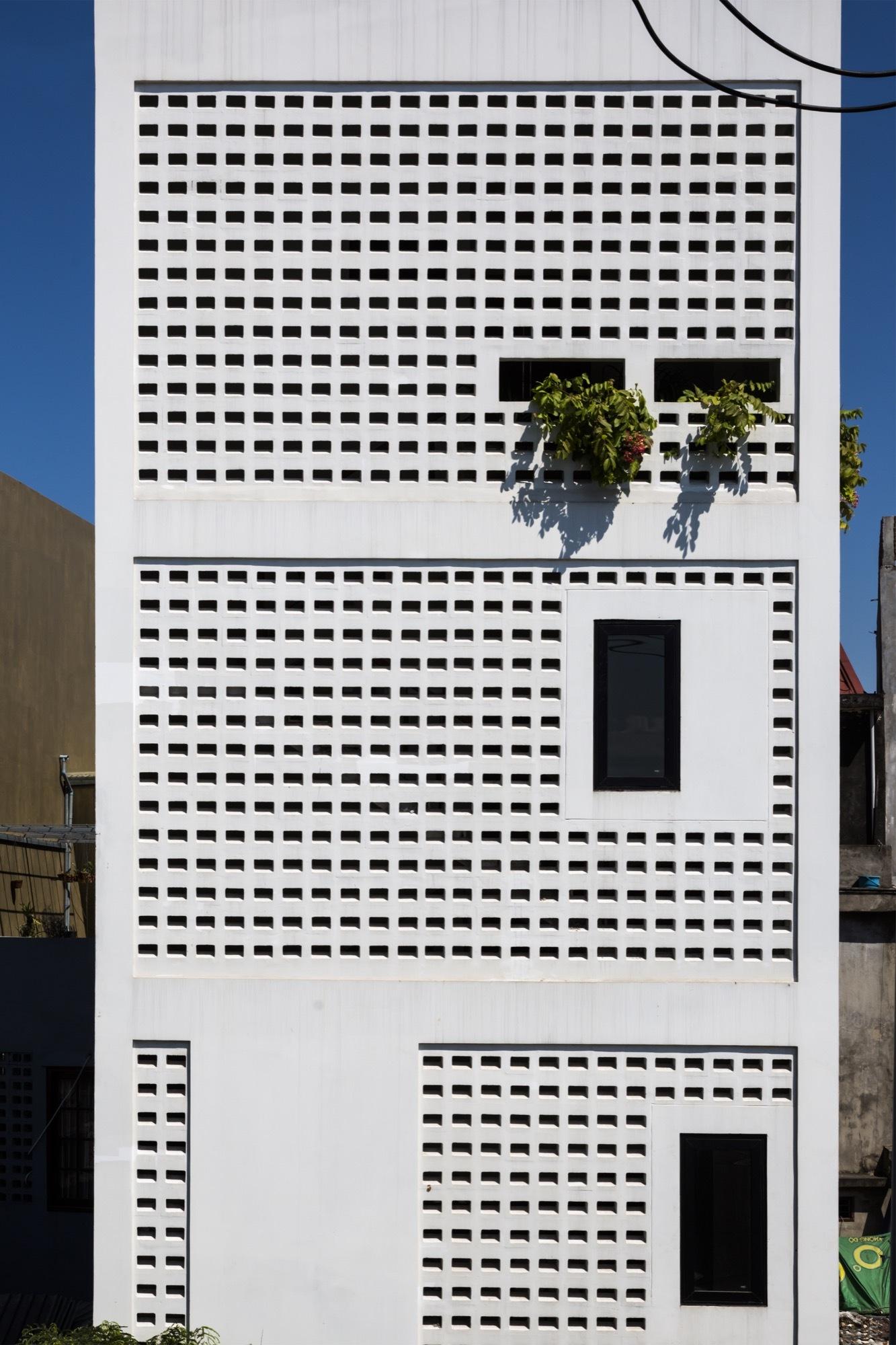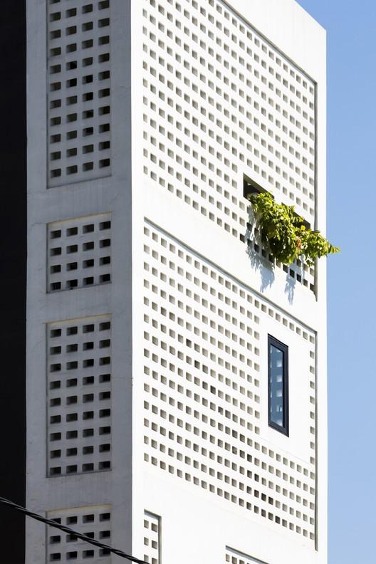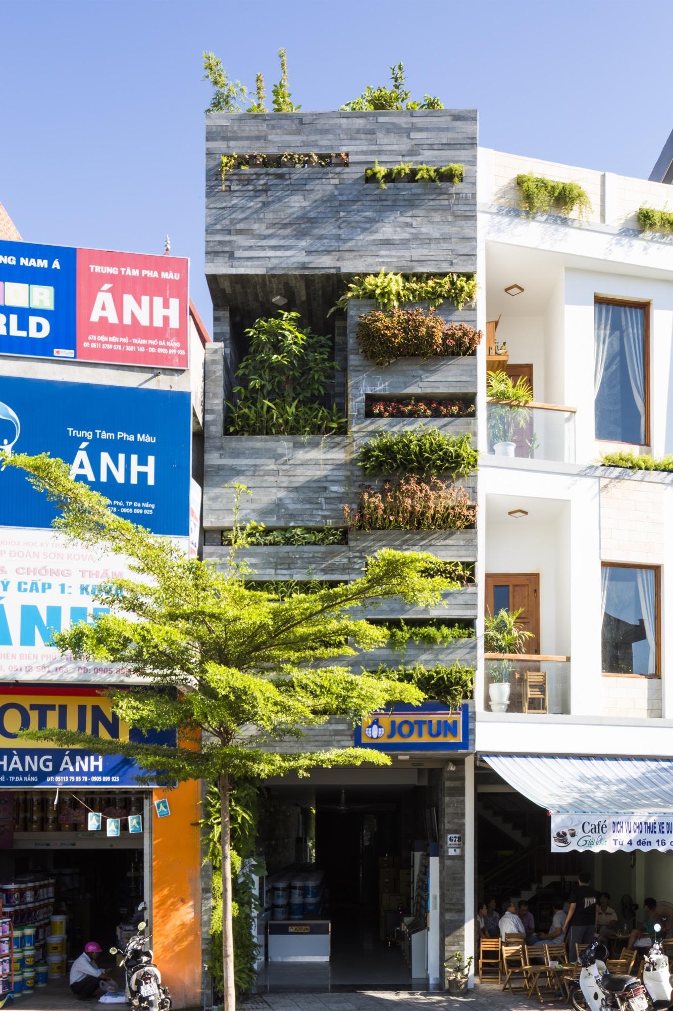 Mặt tiền của ngôi nhà 4 tầng này được bao phủ bởi cây cối và những chiếc hộp trồng cây để thu hút trí tưởng tượng của những người đi trên con đường thương mại rất bận rộn này Điện Biên Phủ gần cầu vượt hoàn thành gần đây. Các tấm bê tông và gạch mộc mạc được xếp chồng lên nhau gần nhau với chỉ đủ cây phát triển để giảm bụi và tiếng ồn từ đường phố. Điều này cung cấp sự thanh lọc tự nhiên và liên tục của không khí bên trong ngôi nhà.