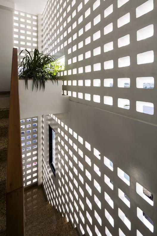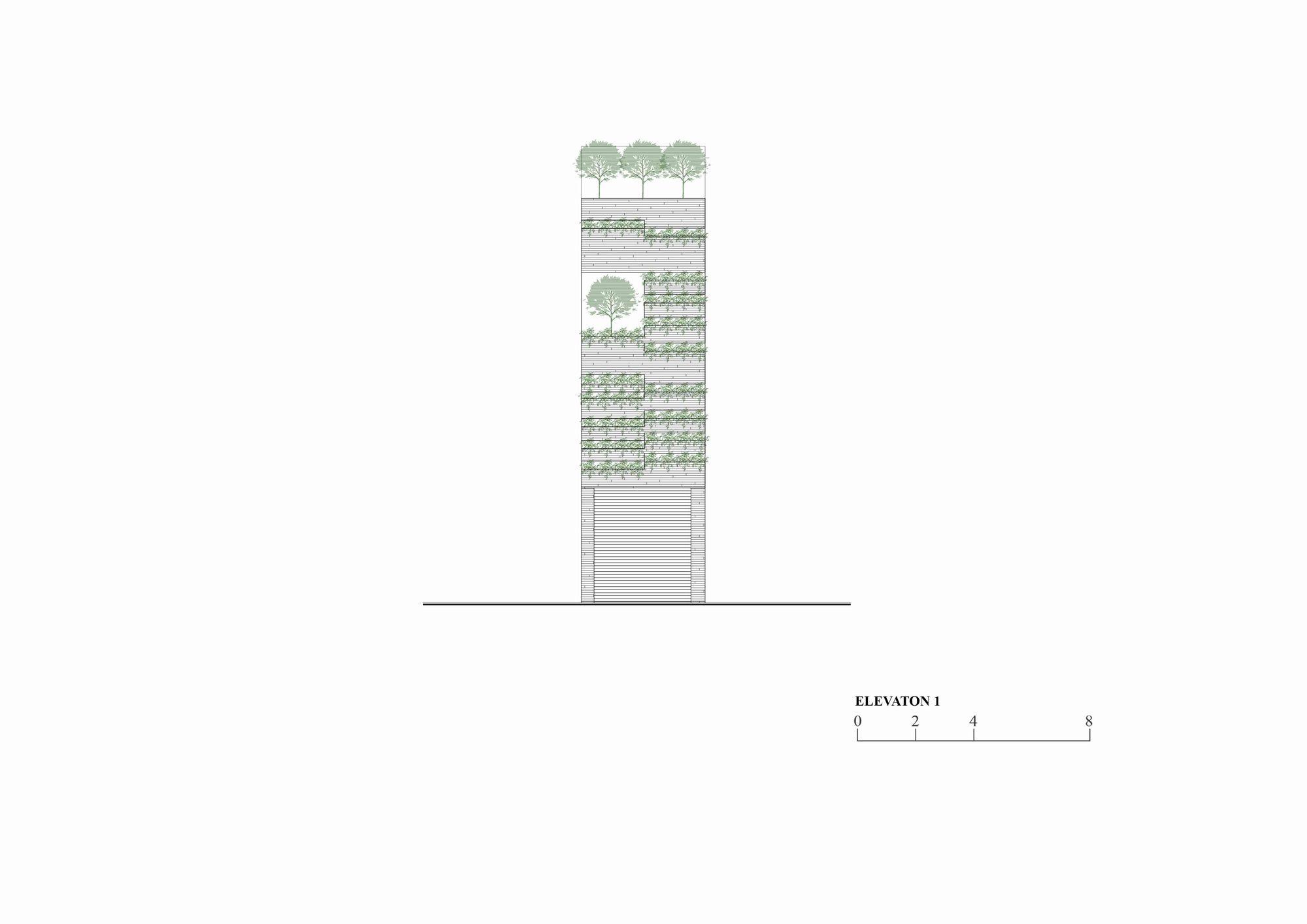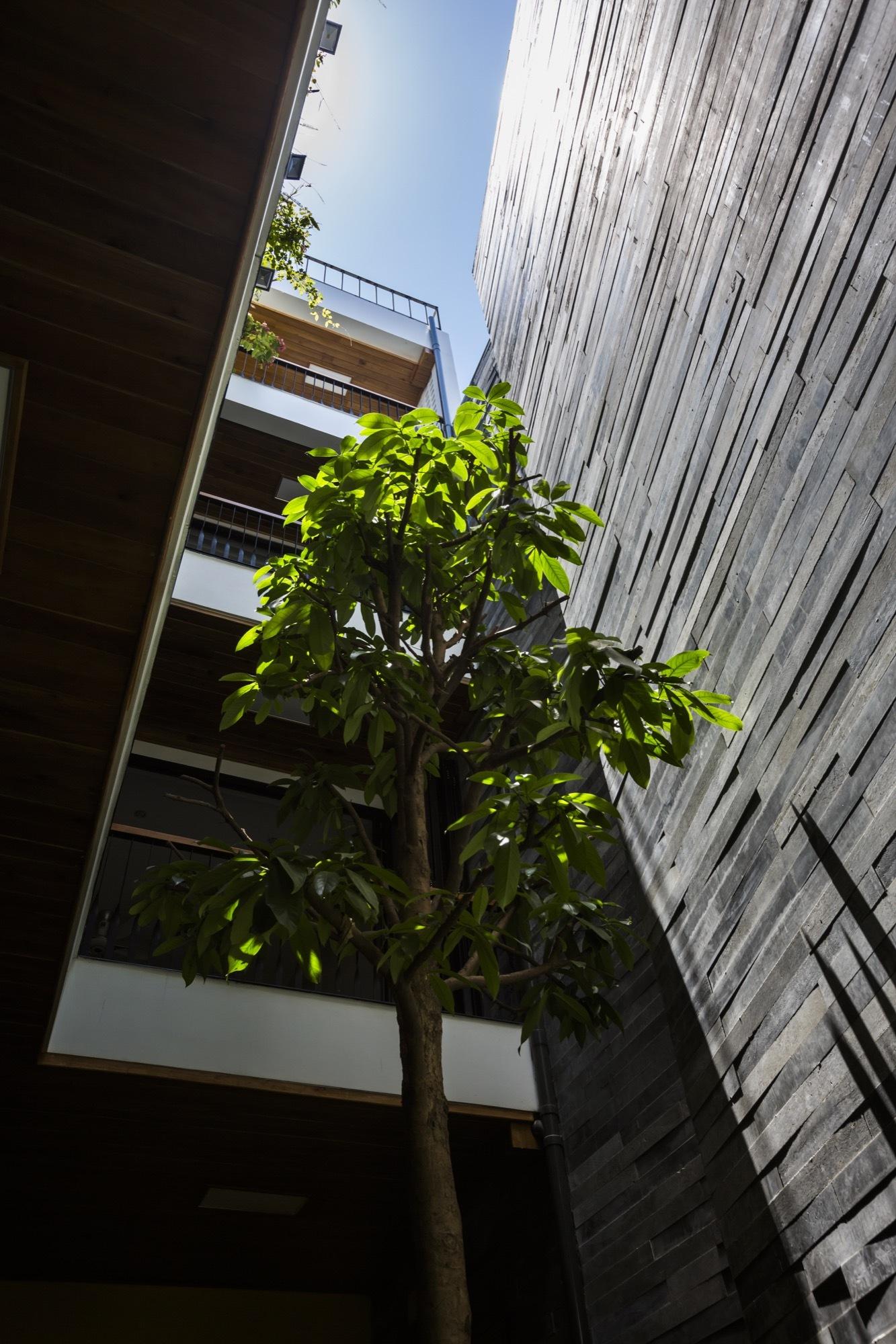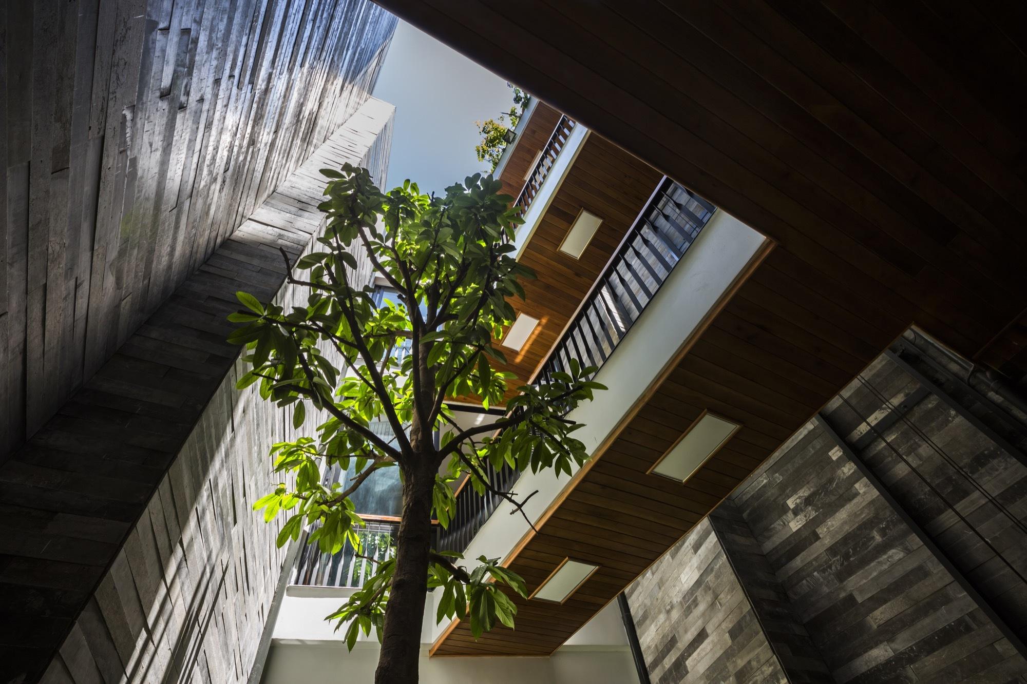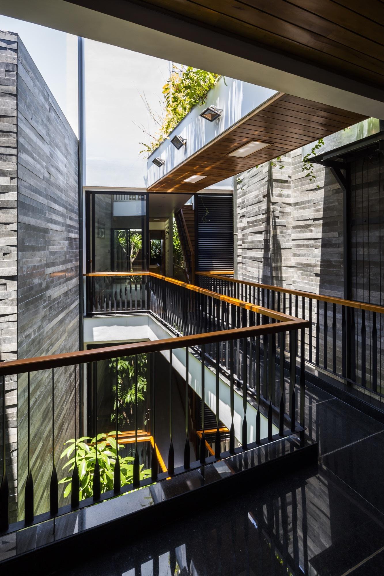 Mặt tiền của ngôi nhà 4 tầng này được bao phủ bởi cây cối và những chiếc hộp trồng cây để thu hút trí tưởng tượng của những người đi trên con đường thương mại rất bận rộn này Điện Biên Phủ gần cầu vượt hoàn thành gần đây. Các tấm bê tông và gạch mộc mạc được xếp chồng lên nhau gần nhau với chỉ đủ cây phát triển để giảm bụi và tiếng ồn từ đường phố. Điều này cung cấp sự thanh lọc tự nhiên và liên tục của không khí bên trong ngôi nhà.