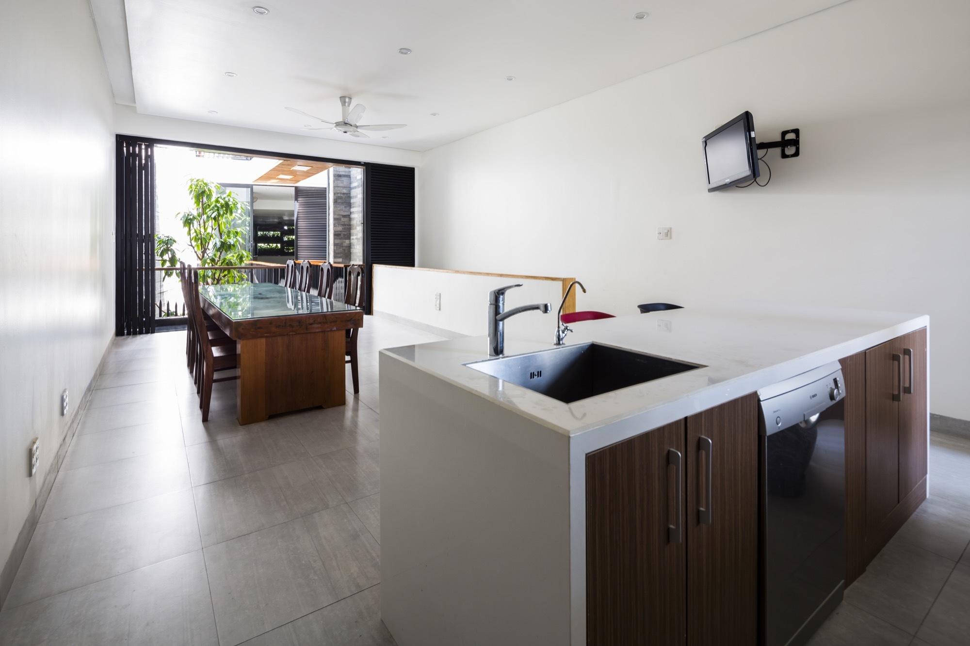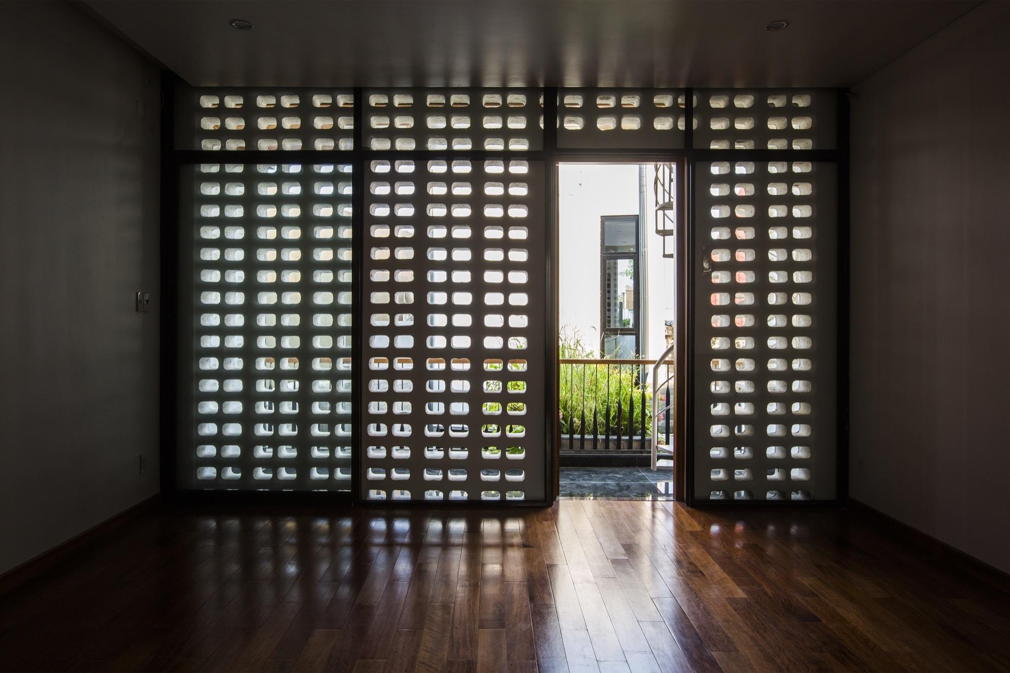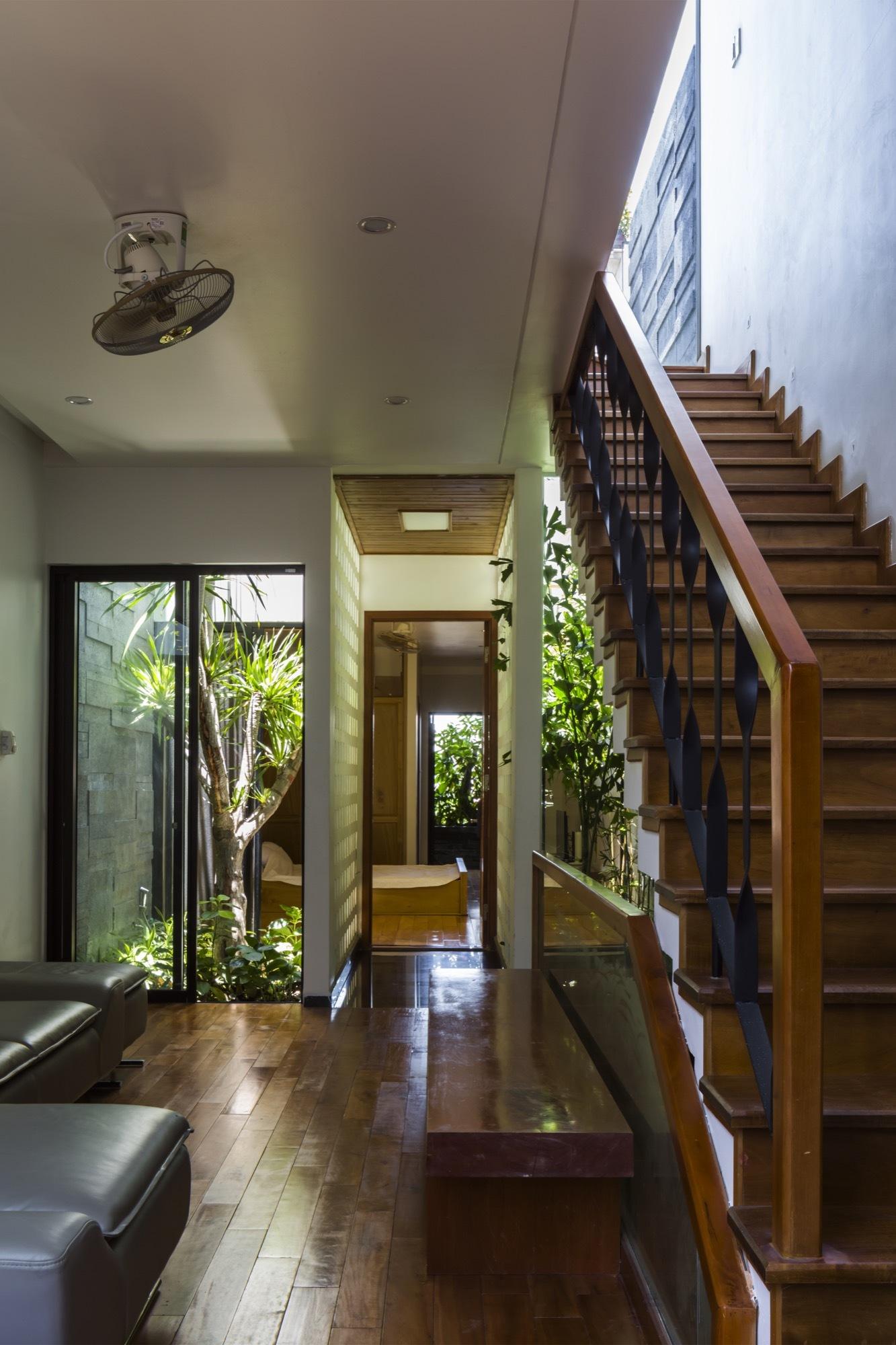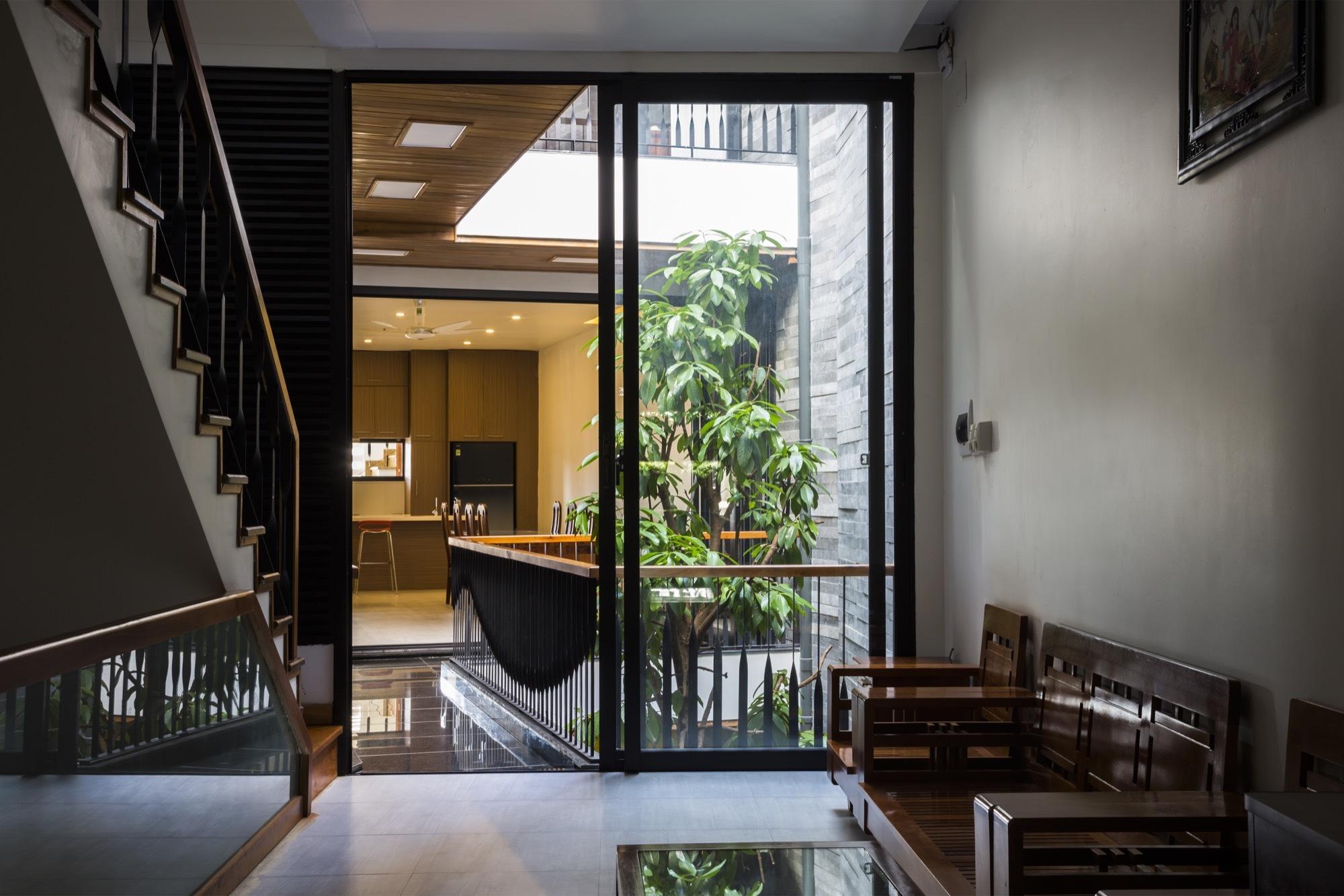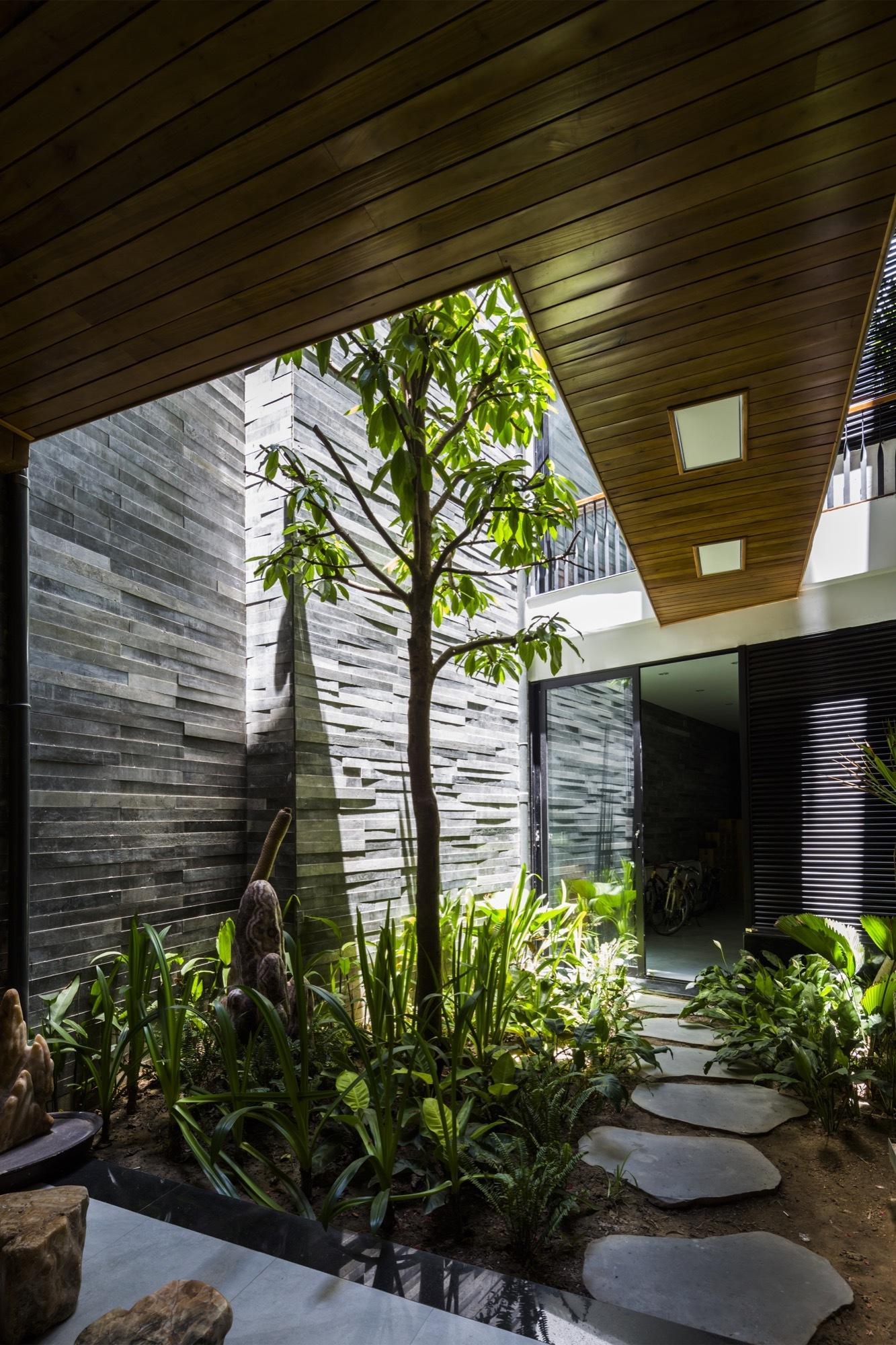 Mặt tiền của ngôi nhà 4 tầng này được bao phủ bởi cây cối và những chiếc hộp trồng cây để thu hút trí tưởng tượng của những người đi trên con đường thương mại rất bận rộn này Điện Biên Phủ gần cầu vượt hoàn thành gần đây. Các tấm bê tông và gạch mộc mạc được xếp chồng lên nhau gần nhau với chỉ đủ cây phát triển để giảm bụi và tiếng ồn từ đường phố. Điều này cung cấp sự thanh lọc tự nhiên và liên tục của không khí bên trong ngôi nhà.