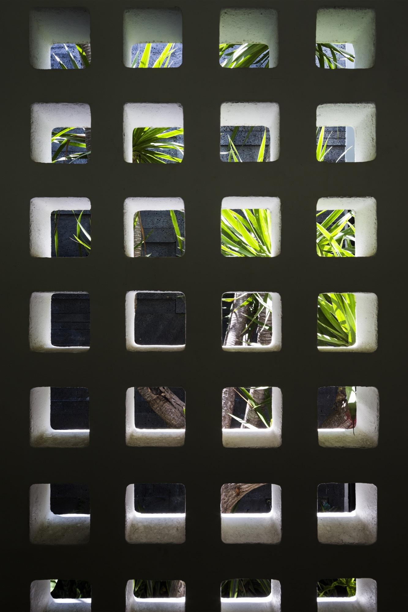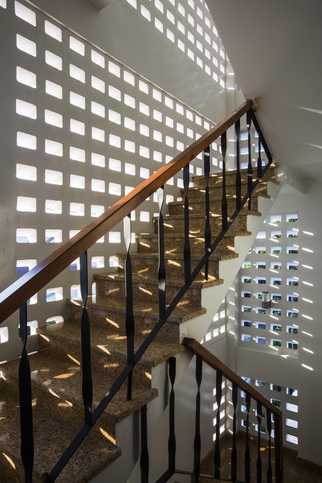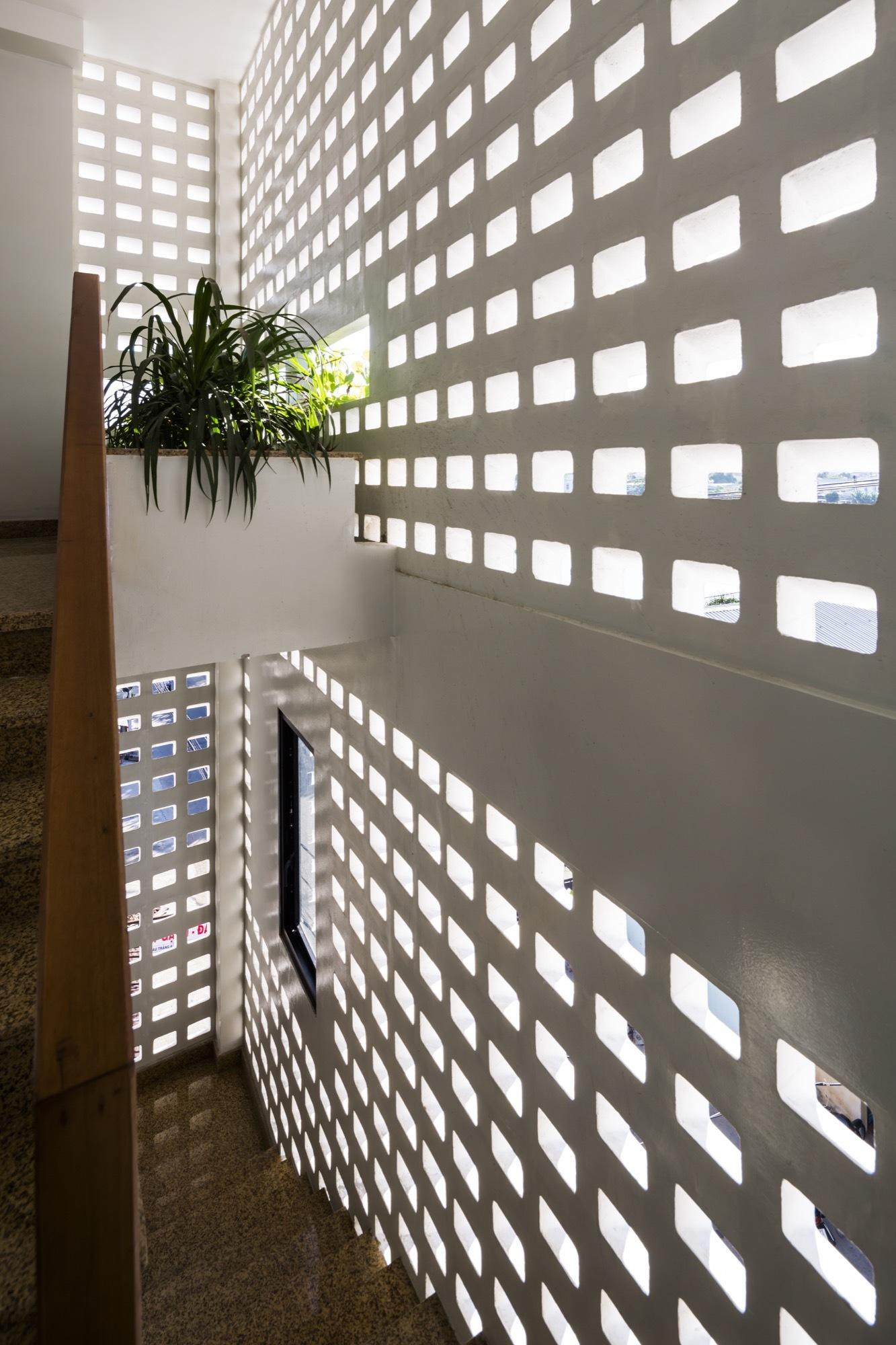 Phía sau của tòa nhà có đường rộng 5,5 m và chịu ảnh hưởng nặng nề của mặt trời nóng và gió mạnh từ phía tây bắc. Bức tường phía sau của cầu thang phía sau được xây dựng bằng cách sử dụng gạch của chúng tôi với lỗ thông hơi nhỏ trên tường. Chúng được thiết kế để ngăn không cho mưa xâm nhập vào nhà trong khi cung cấp thông gió ở mọi cấp độ. Mặt tiền này luôn mát mẻ, khô ráo, và cung cấp ánh sáng tự nhiên mà không có bất kỳ nhiệt điển hình nào của cửa sổ lớn hơn và mở ra.