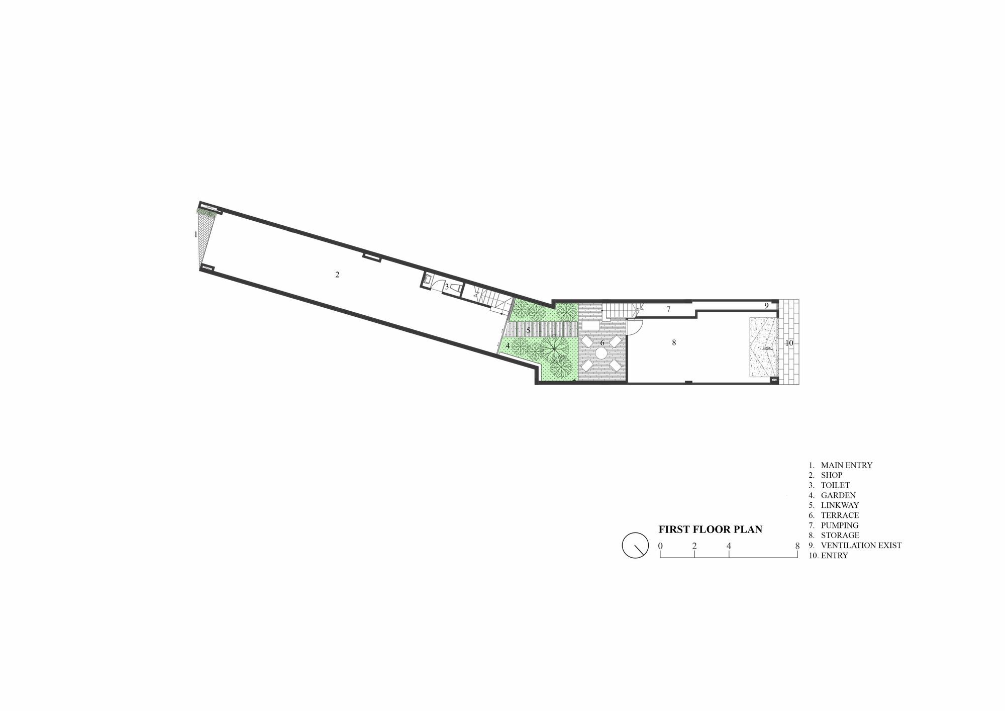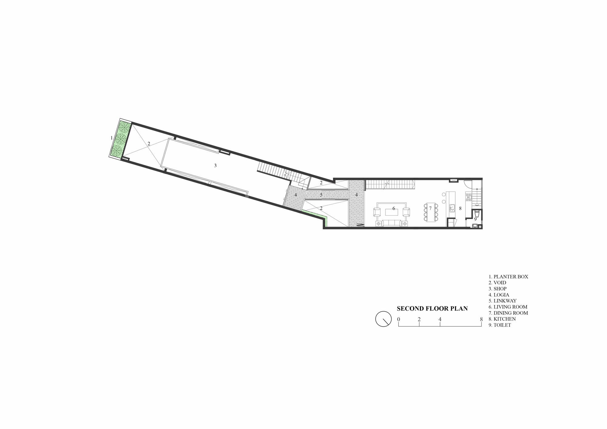 Kích thước nhà đất hẹp 4 mét (w) x 40 mét. Các yếu tố chính và thách thức có liên quan đến tỷ lệ chiều dài đến chiều rộng có hiệu lực chiếu sáng tự nhiên và thông gió. Các giải pháp thiết kế đột phá đã tạo ra hai khối riêng biệt với một khu vườn xanh tự nhiên nằm ở lõi trung tâm.