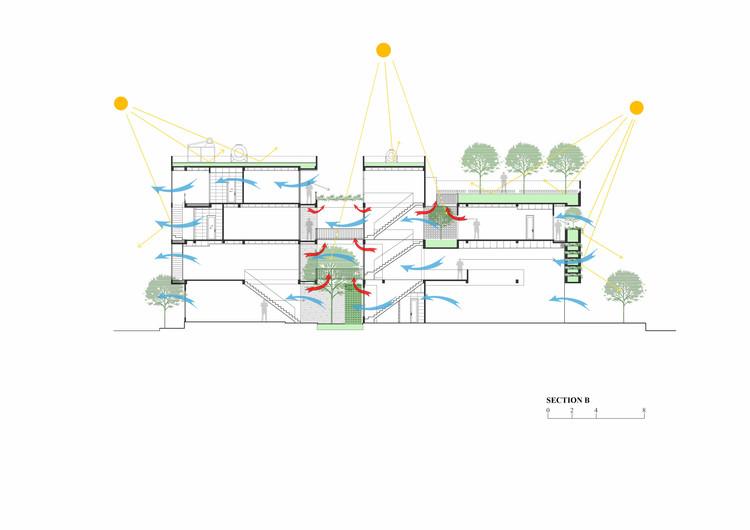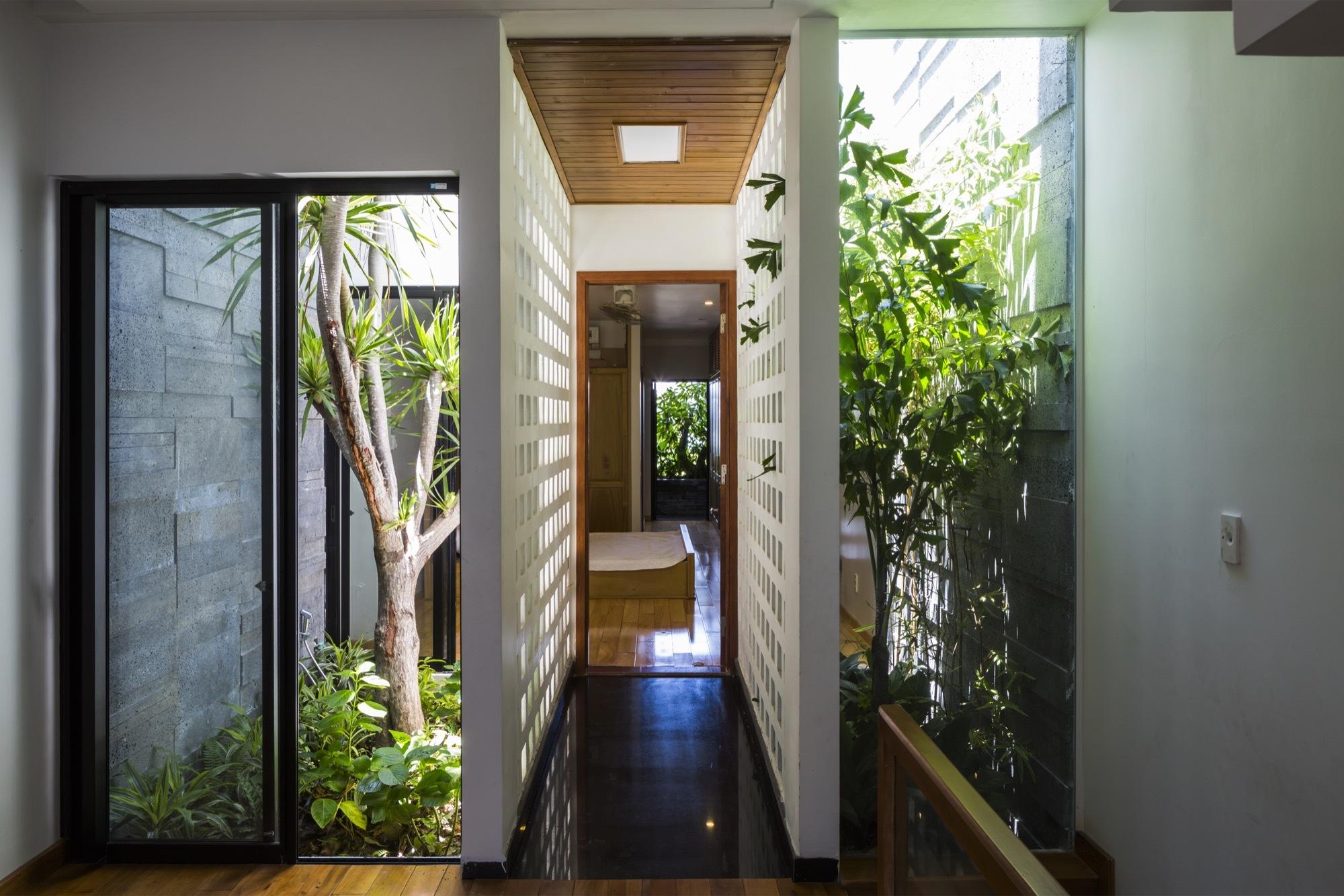 Những cây cầu đẹp nối hai khối thông qua hành lang với cây và gạch trang trí. Khu vực sân vườn mở tập trung này cho phép thở và thông gió trong nhà ngoài việc cho phép ánh sáng tự nhiên vào tất cả các phòng.
