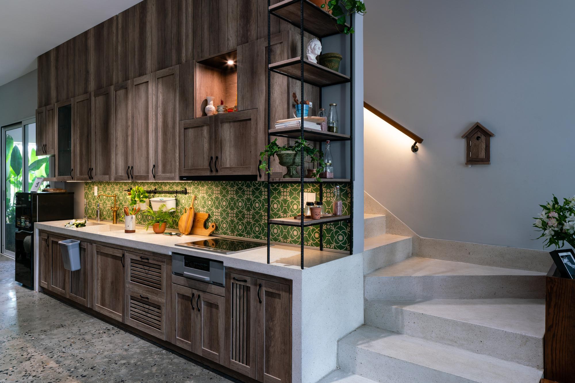 Phòng bếp được thiết kế hiện đại gần giếng trời thoáng mát, đầy đủ tiện nghi cho người sử dụng. Cách bố trí bàn ăn hướng ra khu vườn nhỏ cũng đủ khiến bữa cơm gia đình trở nên ấm cúng, ngọt ngào và gần gũi với thiên nhiên hơn. Sự chăm chút tỉ mỉ đến từng chi tiết của vô số đồ đạc bên trong đủ thấy sự đầu tư nghiêm túc của chủ nhân, khiến người xem không bao giờ mỏi mắt.