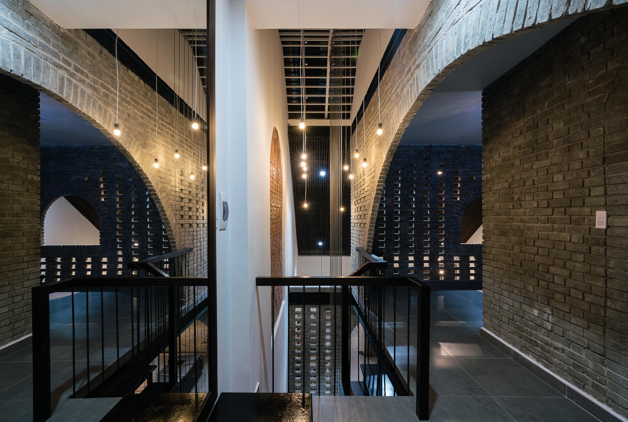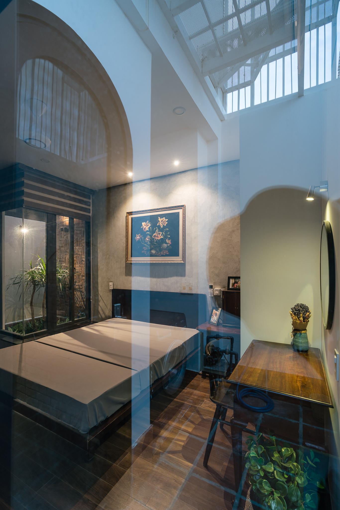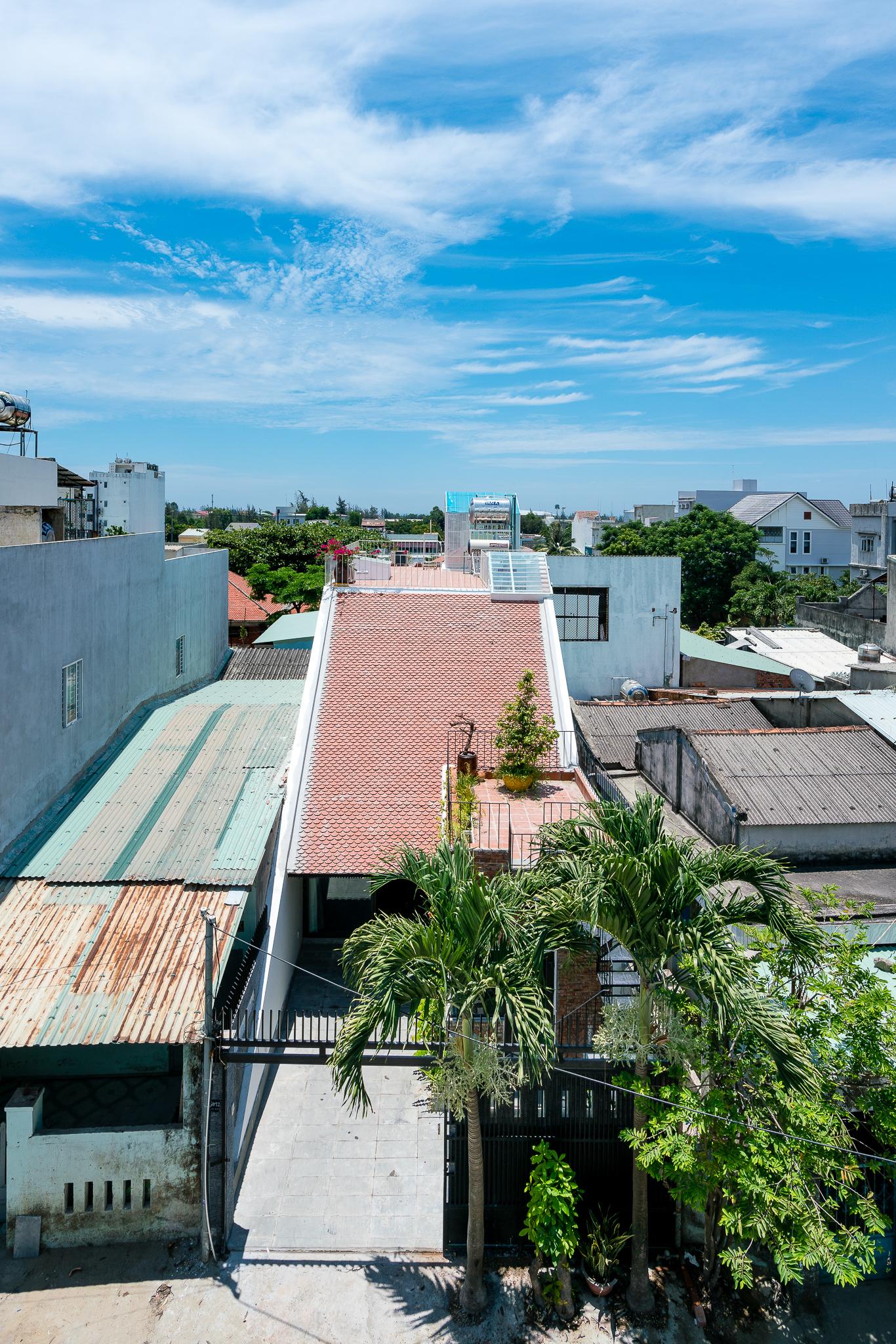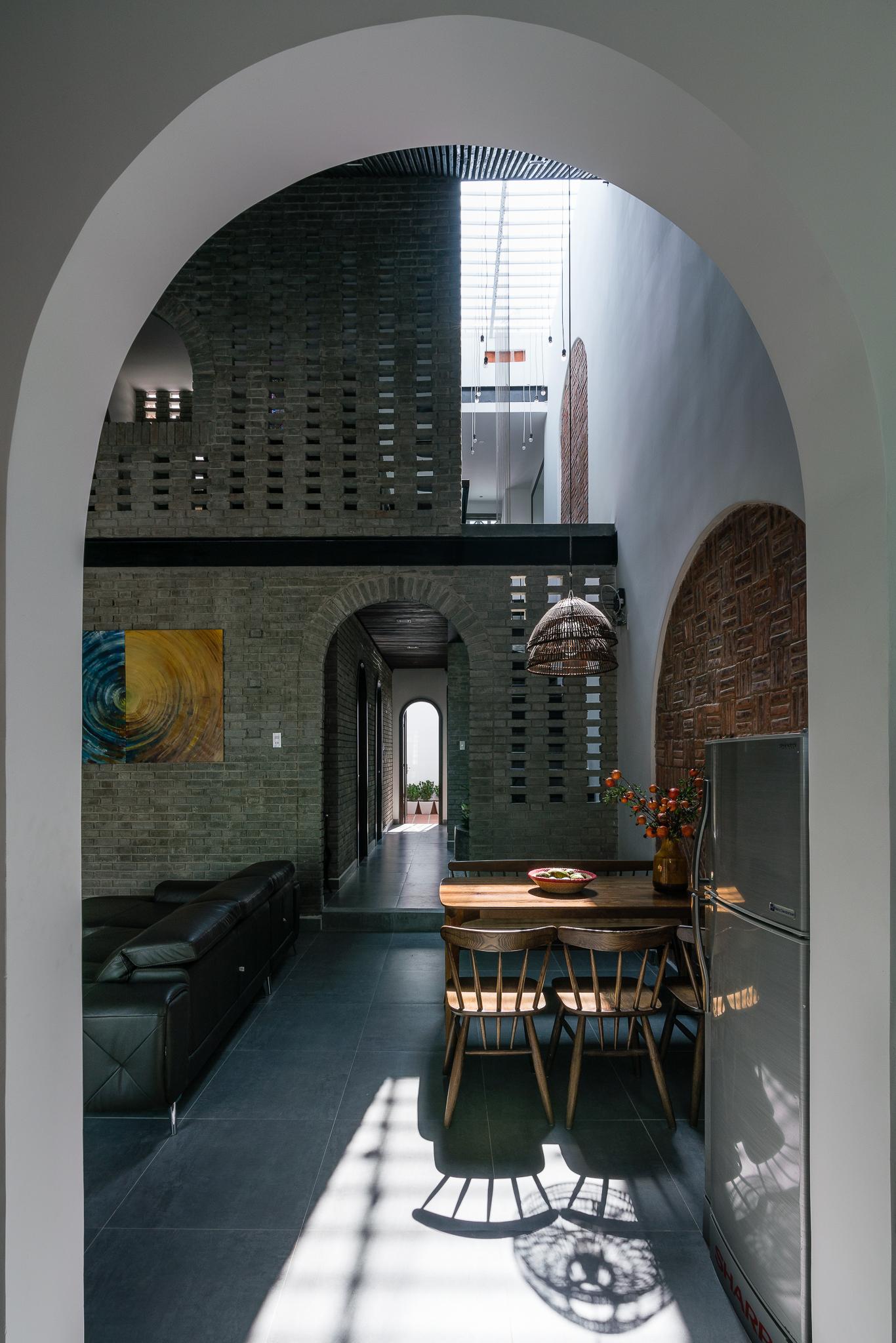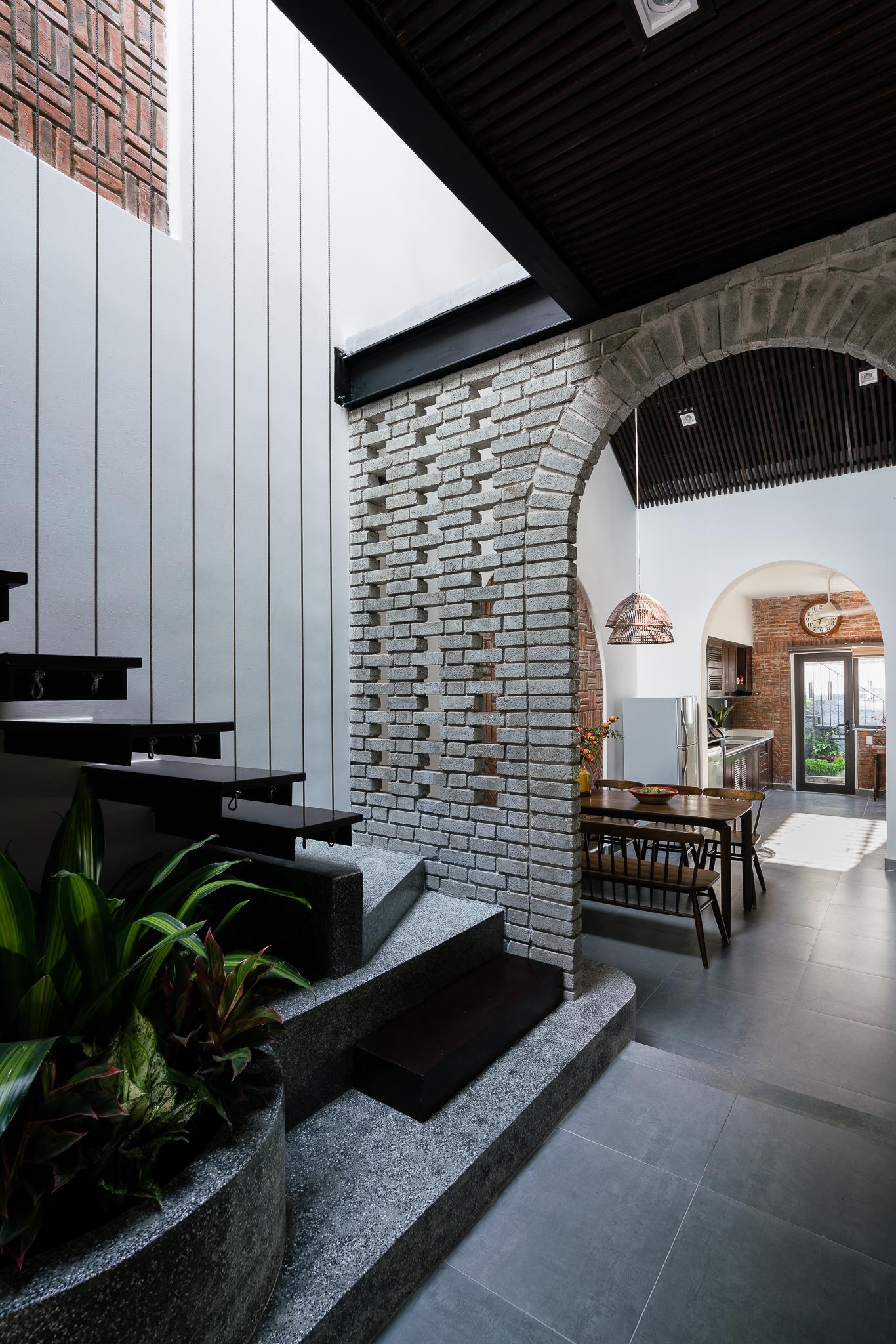 Từ tất cả những nơi trong nhà, thậm chí từ phòng ngủ, chúng ta có thể cảm thấy những thay đổi của ánh sáng, không khí và gió. Các vật liệu chính là gạch trần và gỗ tự nhiên. Hình dạng mái nhà và vật liệu gợi ý hình ảnh ngôi nhà ở vùng nông thôn Việt Nam. Đây là nguồn cảm hứng chính của khái niệm này.