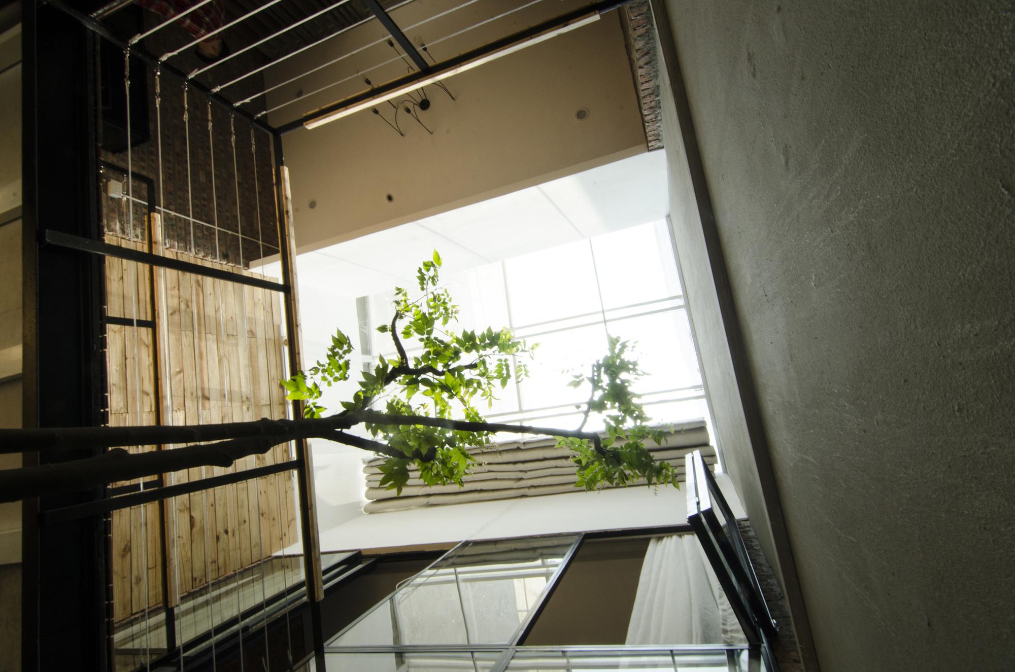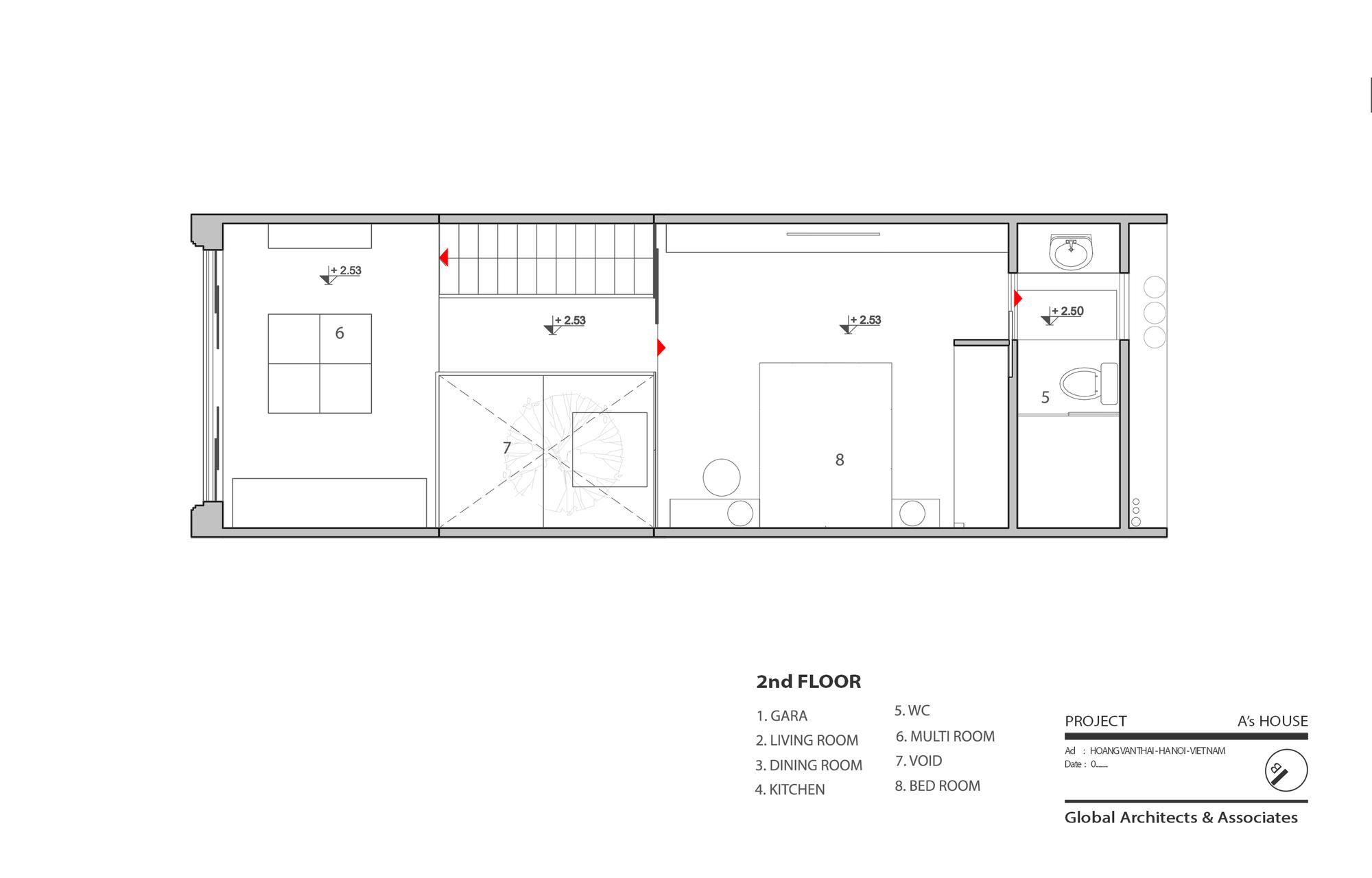 Tầng hai là một không gian dành riêng cho sự riêng tư của chủ nhân, với phòng ngủ có cửa sổ mở trực tiếp vào không gian thông tầng, nơi các chủ nhà có thể hít thở không khí trong lành vào mỗi buổi sáng, và từ đây có thể dễ dàng kết nối với không gian làm việc. . Mục đích chính của nơi này là để làm việc, nhưng nó cũng là một không gian lưu trữ, phục vụ nhu cầu sử dụng trong tương lai khi các cặp vợ chồng trẻ chào đón offsprings của họ.