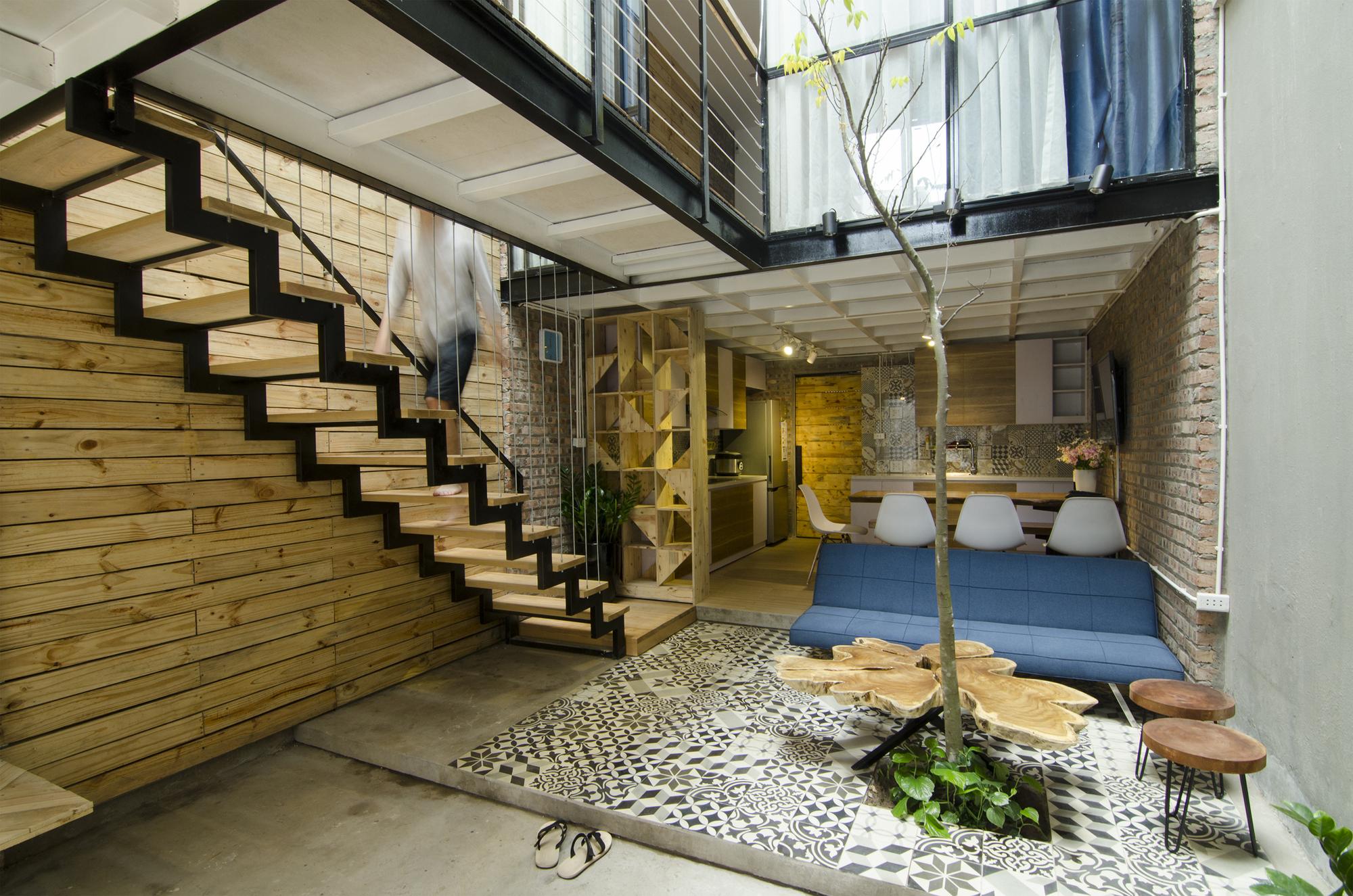 Đồ nội thất của ngôi nhà sử dụng màu sắc ấm áp và mộc mạc, từ các mảng gạch trần và gỗ thông được xử lý mối, đến các mảng gạch hoa gợi lại quá khứ hoài cổ và các chi tiết trên bàn làm từ khối gỗ không chỉ độc đáo mà còn một điểm nhấn cho ngôi nhà ..., tất cả pha trộn với nhau để tạo nên một không khí mộc mạc, chân thực nhất, nhưng không thiếu sự quan tâm đối với cặp vợ chồng trẻ.