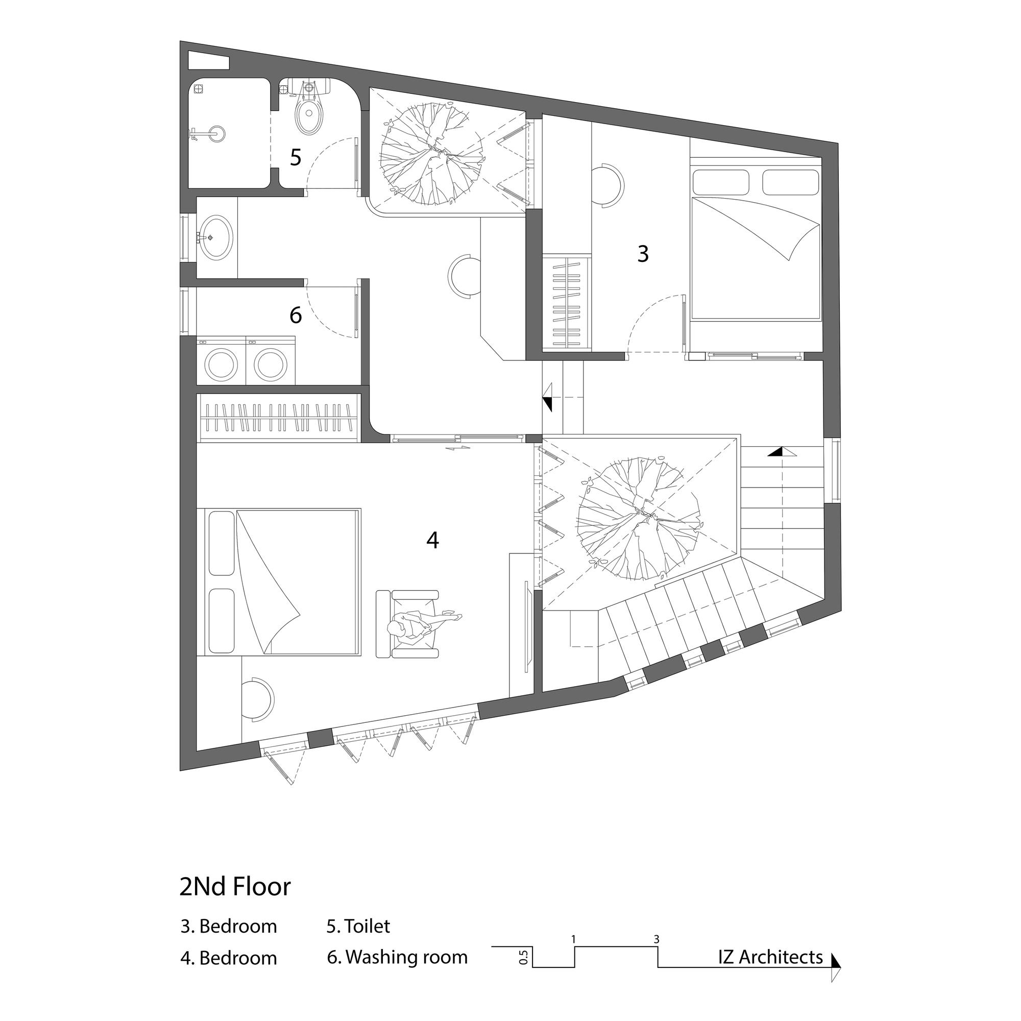 Mô tả văn bản do các kiến trúc sư cung cấp. Lấy cảm hứng từ sở thích của chủ nhân ngôi nhà - một người phụ nữ yêu cúc và muốn ngắm nhìn nó mỗi khi thức dậy trong ngôi nhà của mình, hình ảnh và màu sắc của loài hoa này được thiết kế và sắp xếp một cách ẩn dụ trong cả tổng thể và chi tiết của ngôi nhà. Với diện tích nhỏ và cách bố trí xéo thì ngôi nhà phải được tận dụng tối đa vì như vậy sẽ làm cho không gian của ngôi nhà cũng trở nên tối đa và tạo cảm giác rộng rãi hơn.