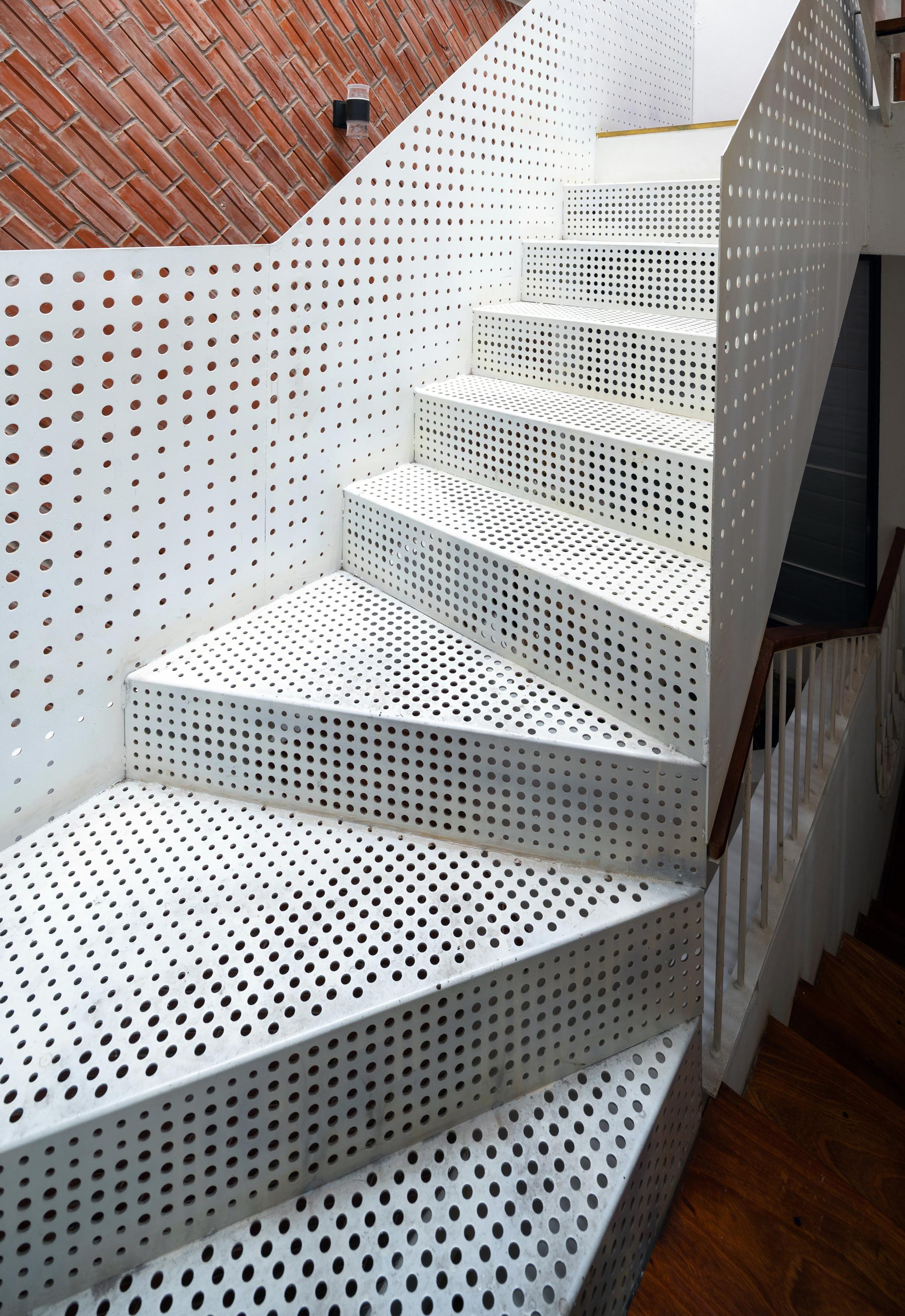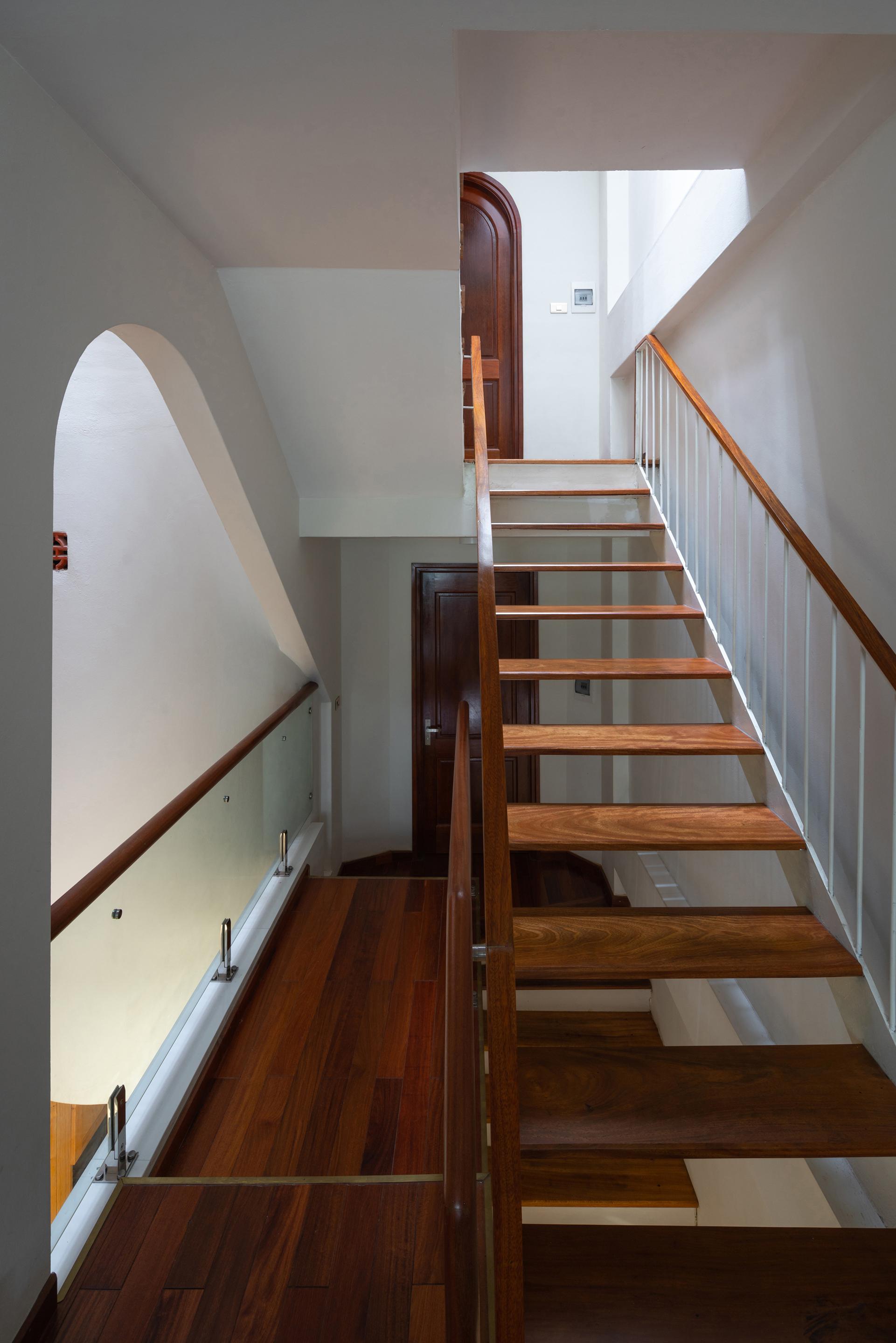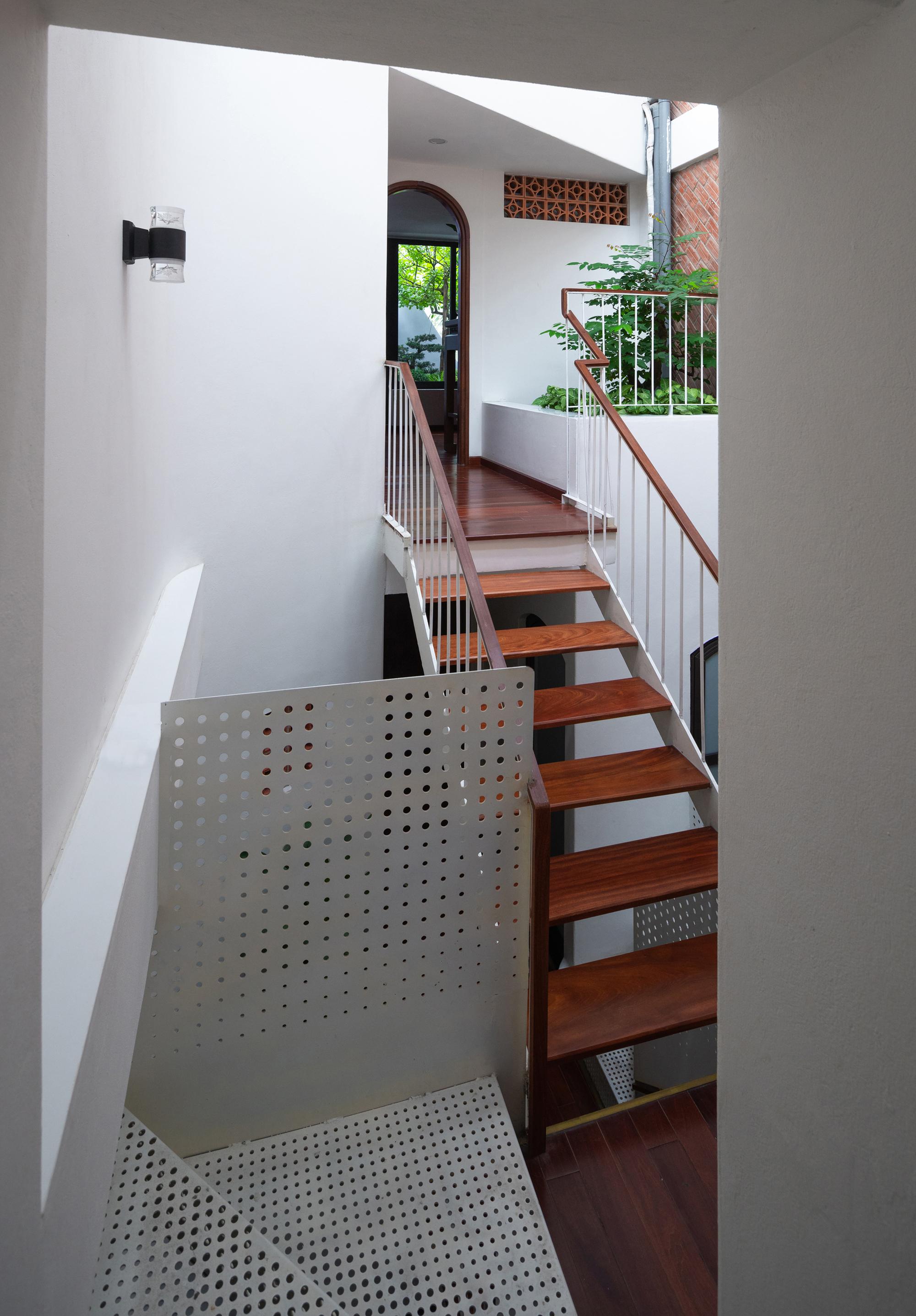 Toàn bộ cầu thang được làm bằng khung sắt và bề mặt gỗ thay vì bê tông. Do đó, ánh sáng và gió có thể tự do đi đến tất cả các không gian của tòa nhà để tạo cảm giác thoáng đãng và thẩm mỹ cho những người sống trong ngôi nhà Đại Kim.