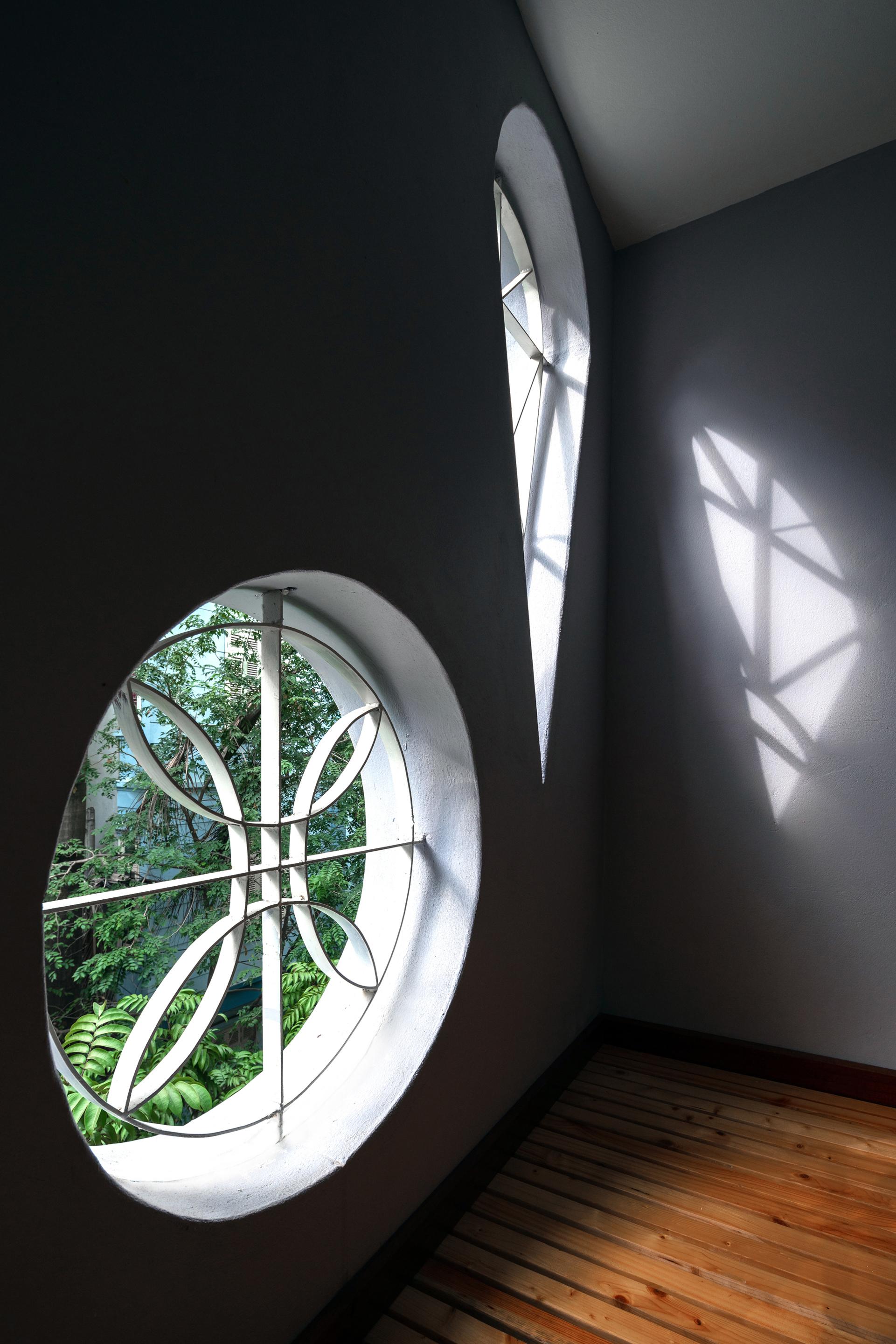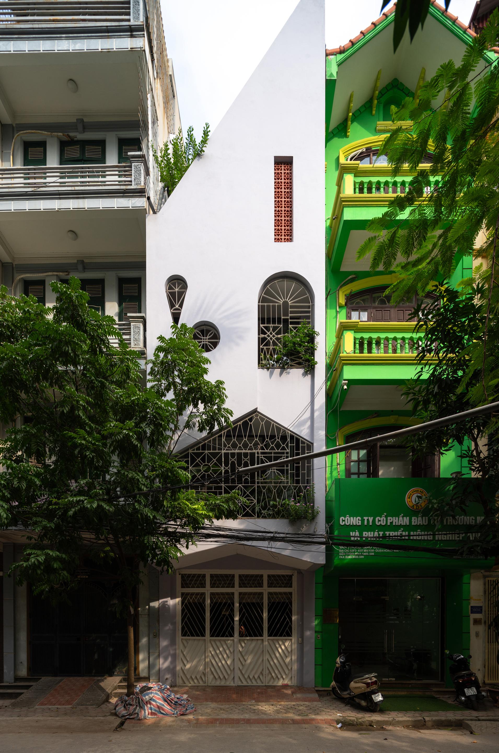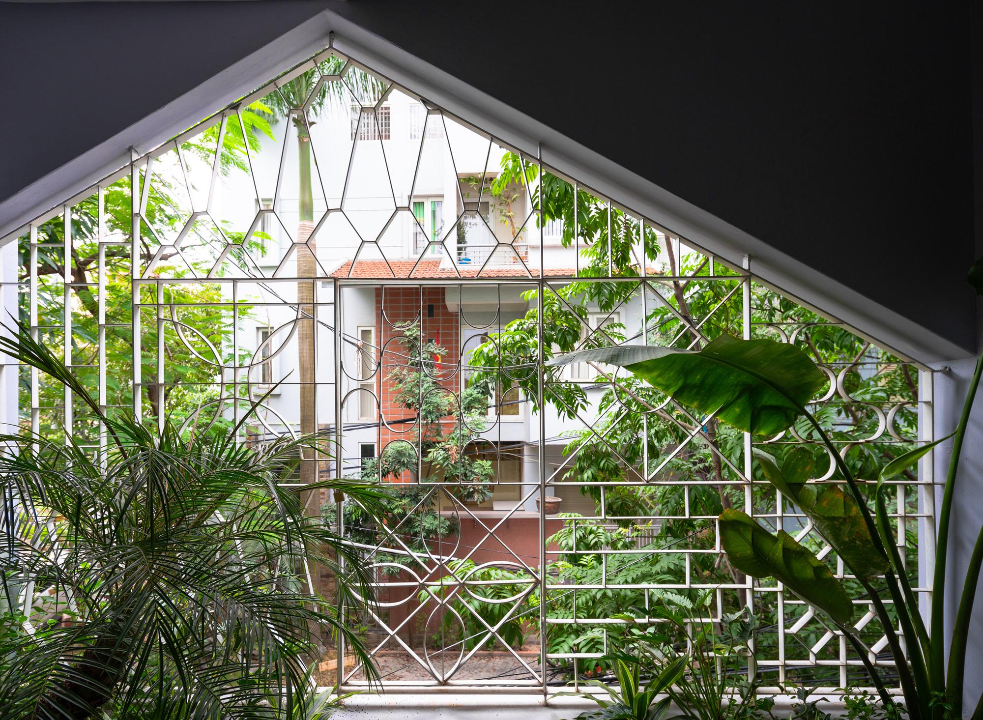 Là một ngôi nhà nằm ở hướng tây, bắt buộc phải tính toán giải pháp chống nóng vào mùa hè. Chúng tôi sử dụng dung dịch 3 lớp để chống nóng. Lớp thứ nhất là tường ngoài 220 mm để ngăn ánh sáng mặt trời trực tiếp, lớp thứ hai là lớp đệm màu xanh lá cây ngăn chặn bụi, tạo ra oxy và đẩy không khí nóng ra bên ngoài; Lớp thứ ba là cửa kính để lấy ánh sáng và ngăn nhiệt gián tiếp vào nhà. Giải pháp này làm cho ngôi nhà luôn mát mẻ, tràn ngập ánh sáng và có tầm nhìn ra cây cối tự nhiên.