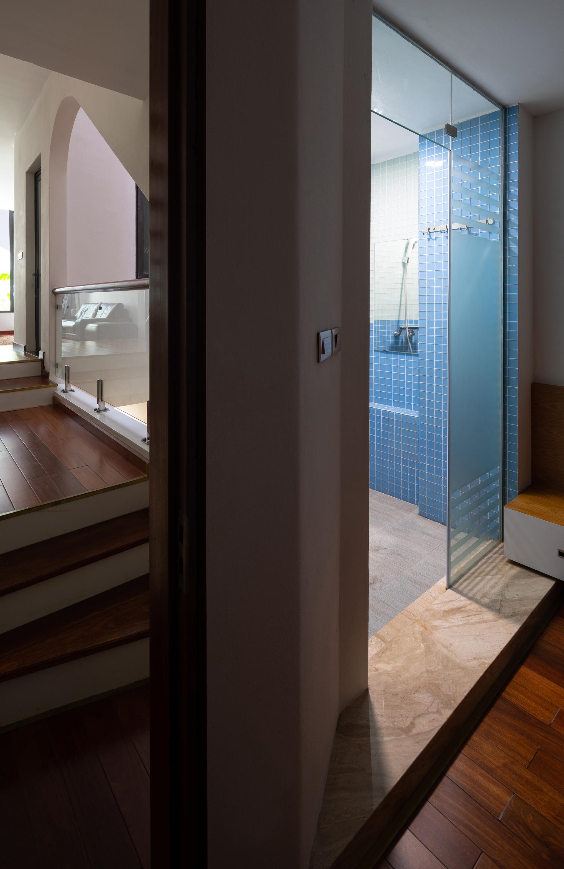 Giải pháp sàn lệch được thiết kế để làm mờ ranh giới giữa trên và dưới, tạo ra một kết nối liên tục và loại bỏ cảm giác của nhiều tầng (5 tầng). Chúng tôi tận dụng không gian cầu thang khi hạ cánh sàn được thiết kế là hội trường của căn phòng, tạo cảm giác riêng tư.
