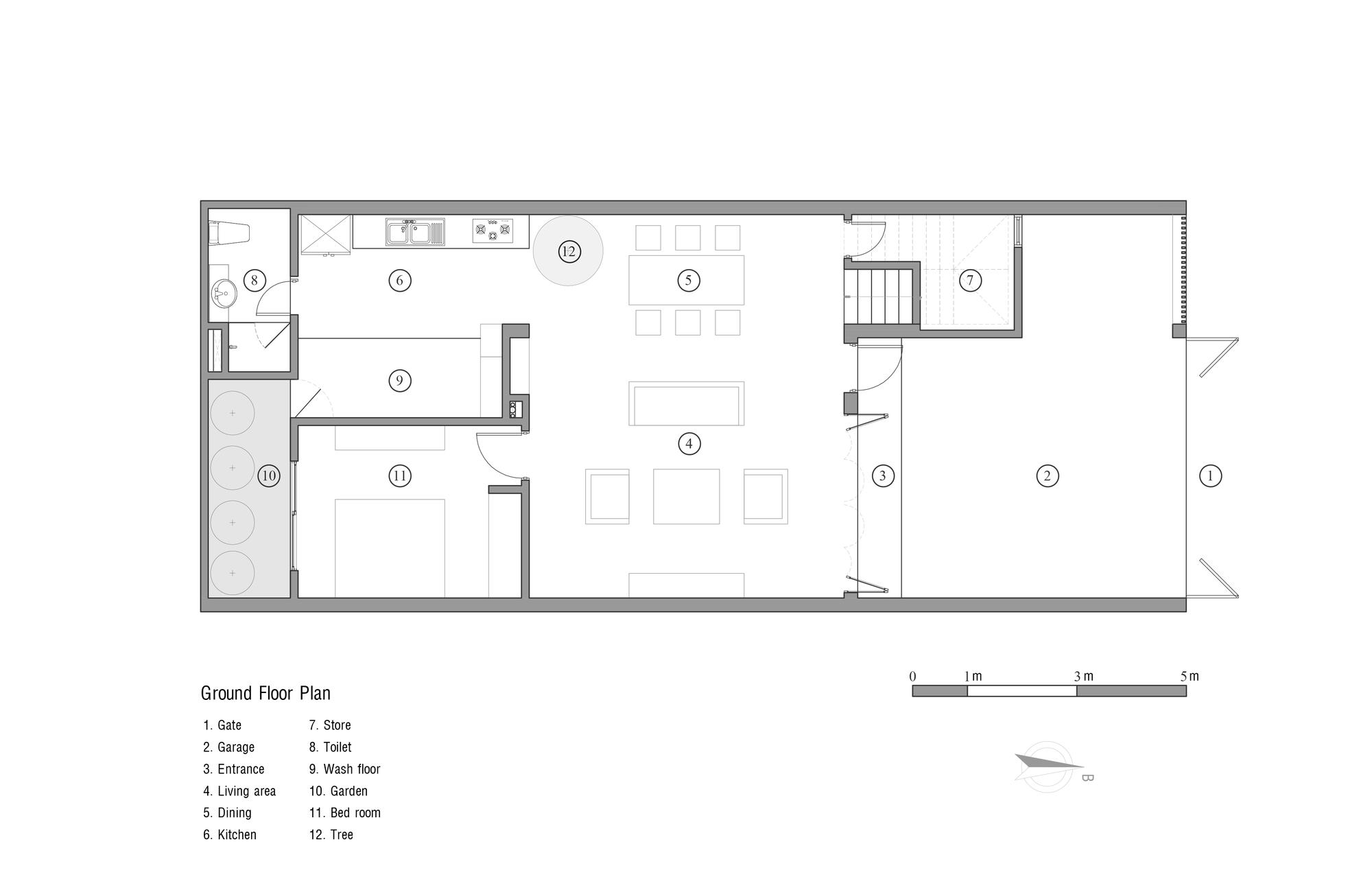 Bởi vì Khách hàng yêu cầu tiếp tục sử dụng toàn bộ nội thất cơ bản của ngôi nhà hiện tại sau khi cải tạo, điều quan trọng là phải tìm vật liệu hoàn thiện phù hợp có thể phù hợp với đồ nội thất cũ với phong cách hiện đại mở và đơn giản như “vật liệu kết nối”. Vật liệu chủ đạo là sàn đá mài có thể kết nối các yếu tố cũ và mới với nhau. Khách hàng muốn mang cây trong vườn hiện tại sang nhà mới nên cần thiết kế vị trí cho chúng. Chúng ta có thể tạo ra một không gian xanh và ghi lại khu vườn cũ quen thuộc. Cây khế đặt gần bàn ăn.
