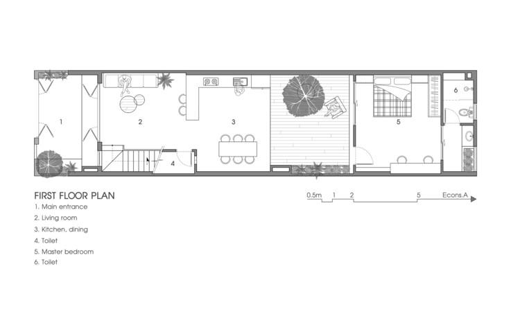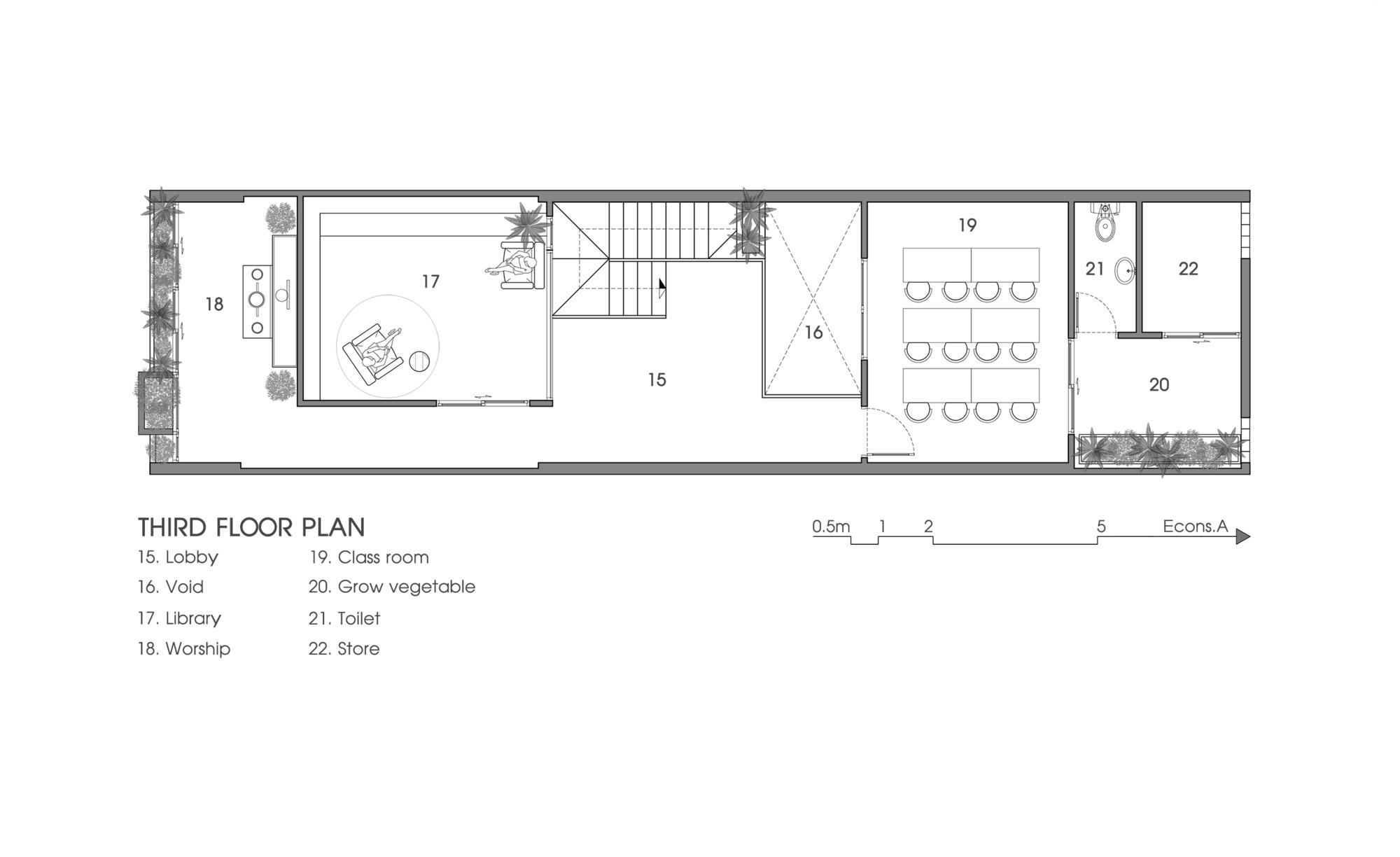 Chủ nhân của ngôi nhà là một cặp vợ chồng giáo viên trẻ sống cùng cô con gái nhỏ. Vì vậy, họ mong muốn tạo ra một không gian sống hài hòa giữa sinh hoạt và dạy học. Tất cả các không gian đều phải tận dụng được các yếu tố như thông gió và ánh sáng tự nhiên. Tuy nhiên, sự liên kết giữa các không gian cần được đảm bảo.