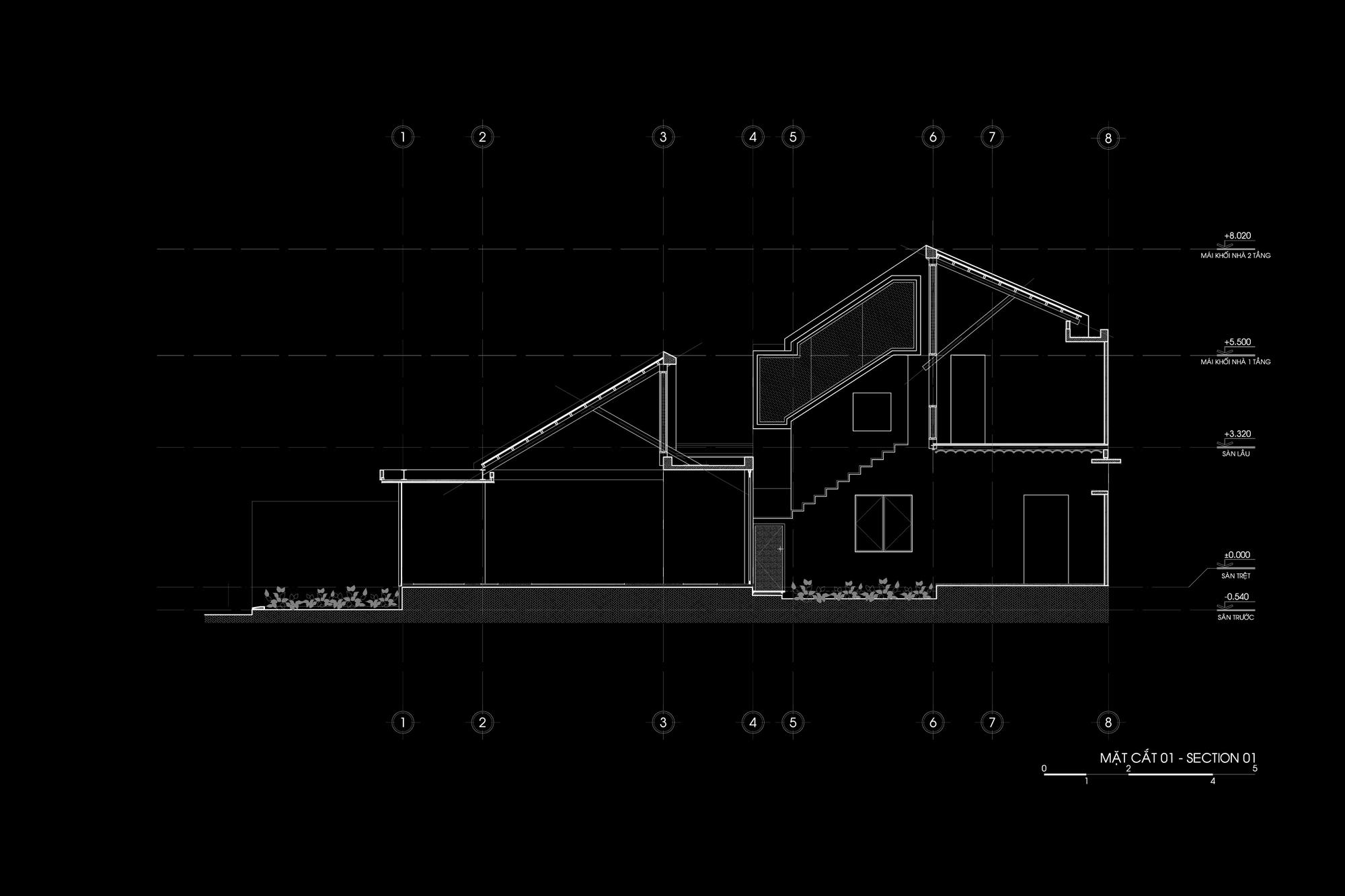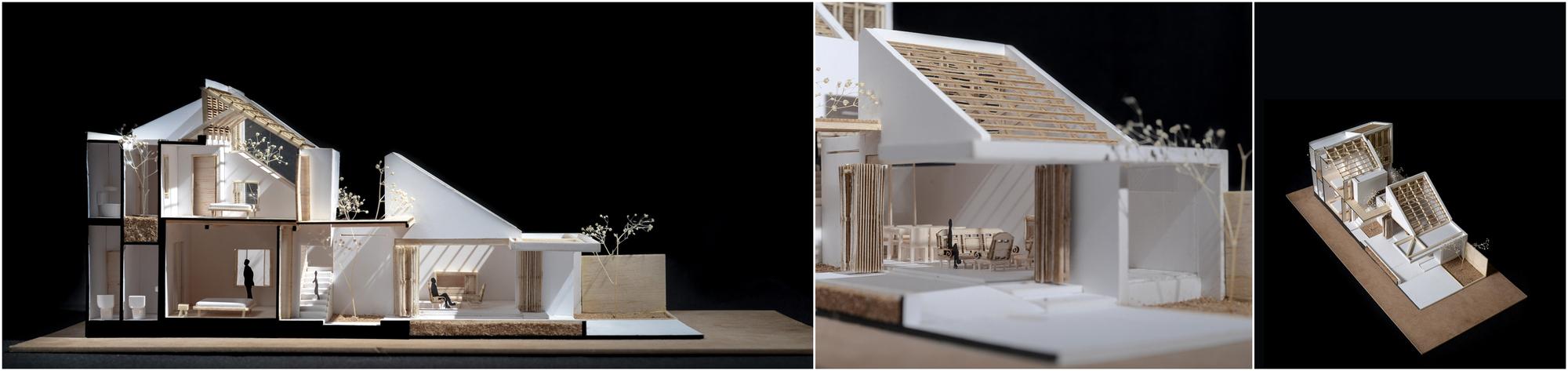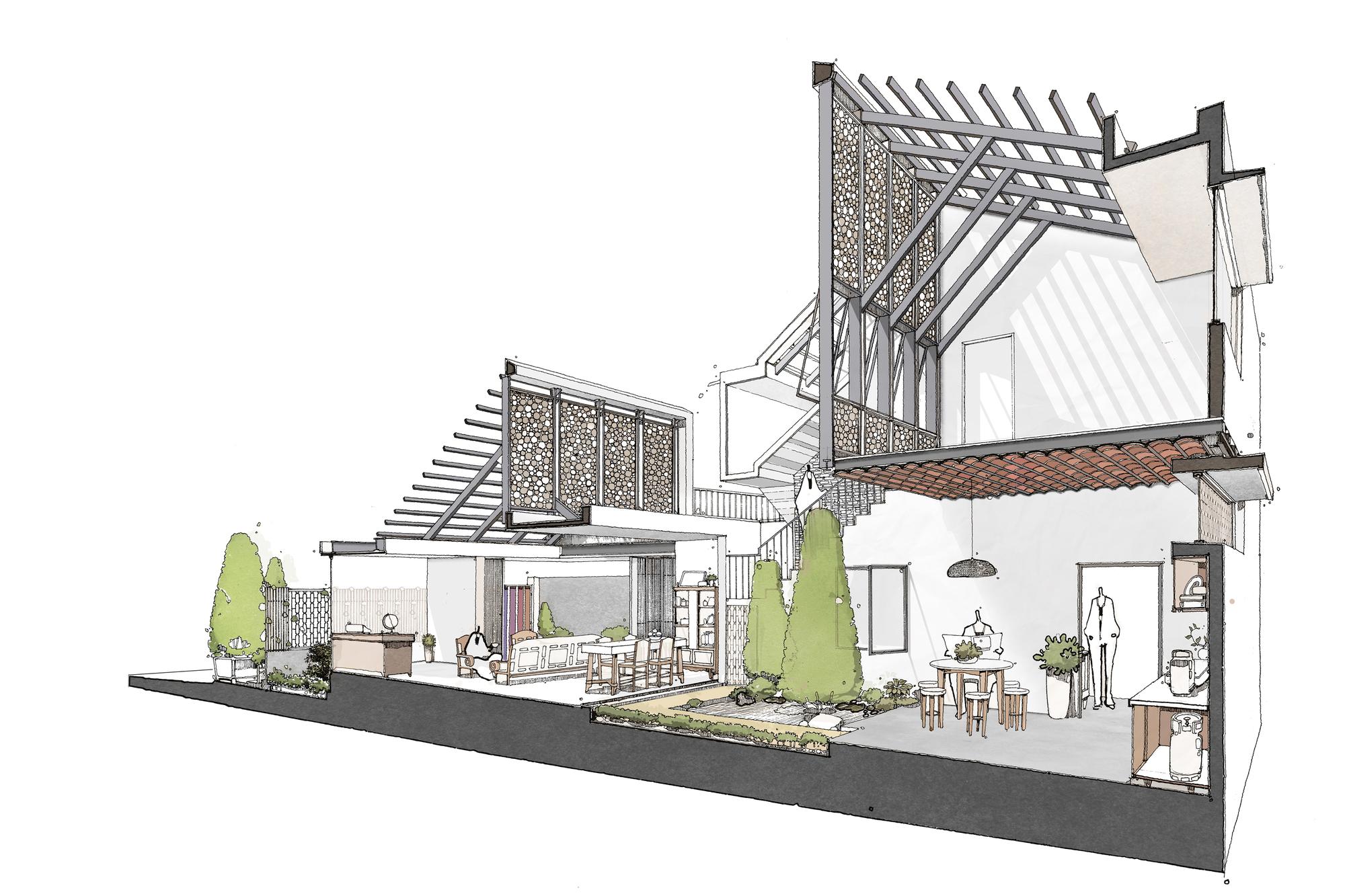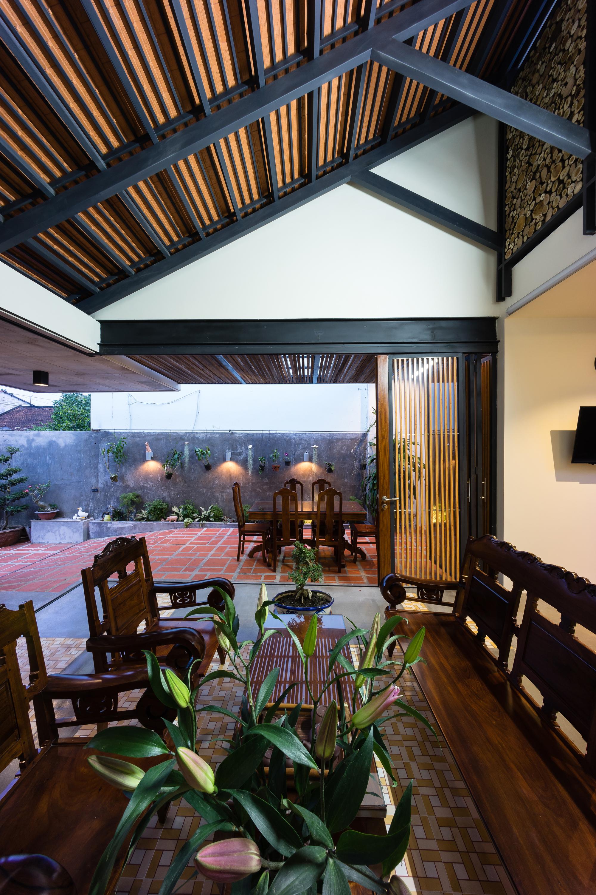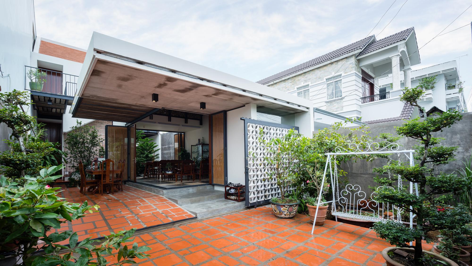 Phương pháp thiết kế là giữ một nửa mái nhà hiện có và máng xối để duy trì sự hài hòa cho toàn bộ khung cảnh và tinh thần của một ngôi nhà phía Nam. Từ đó, ngôn ngữ “HALF ROOF” được áp dụng cho khối sau để tạo sự đồng nhất cho tòa nhà. Ngôn ngữ hình thành bắt đầu từ ngôi nhà hiện tại sẽ làm cho ngôi nhà hiện đại nhưng quen thuộc. Cấu trúc cũ được xử lý theo một cách mới; các cột dưới máng xối được rút lui, kết cấu thép được sử dụng để tạo ra một khoảng 5 mét, tạo ra một không gian mở hoàn toàn, bên trong và bên ngoài của ngôi nhà được ngăn cách bởi cửa trượt được kết nối thông qua không gian này. Cây được đưa vào các nhóm bao gồm nhà nghỉ. Những điều này giúp chủ nhà giữ gìn thói quen sống của họ dưới mái hiên, xung quanh khu vườn nhưng trong một tòa nhà rộng rãi và hiện đại.