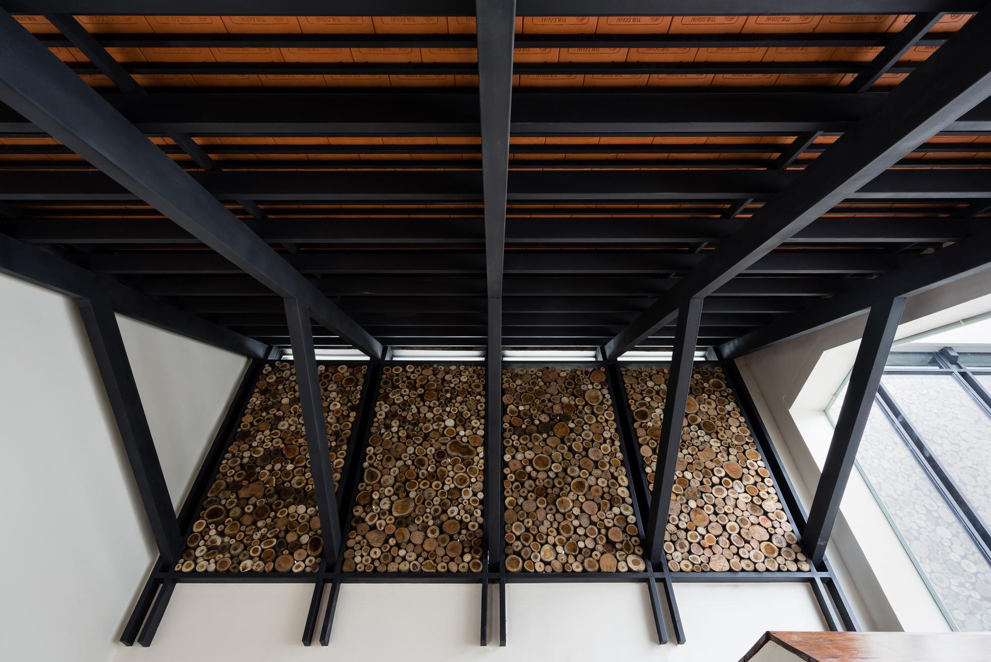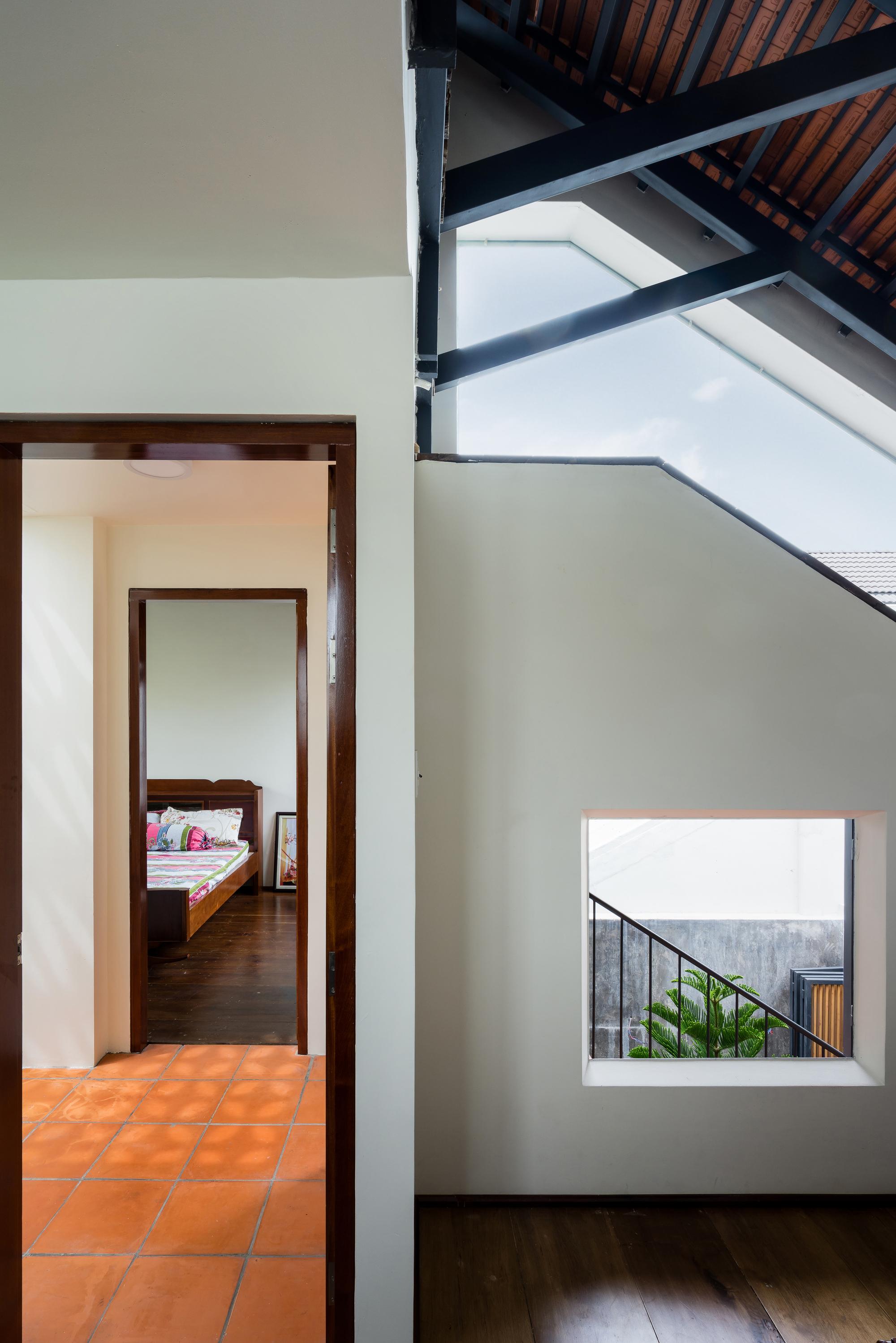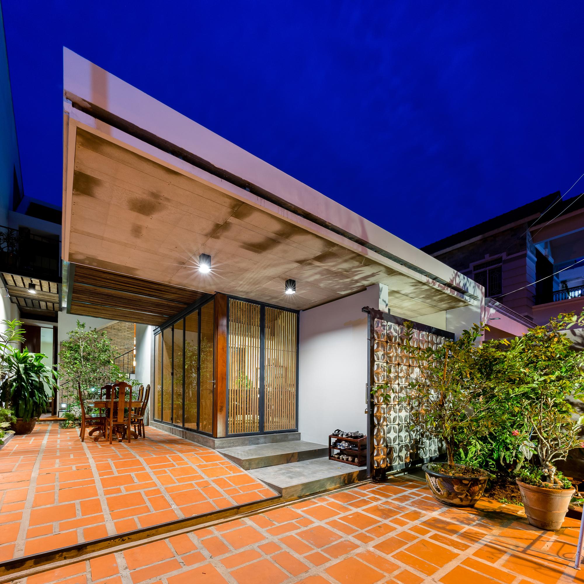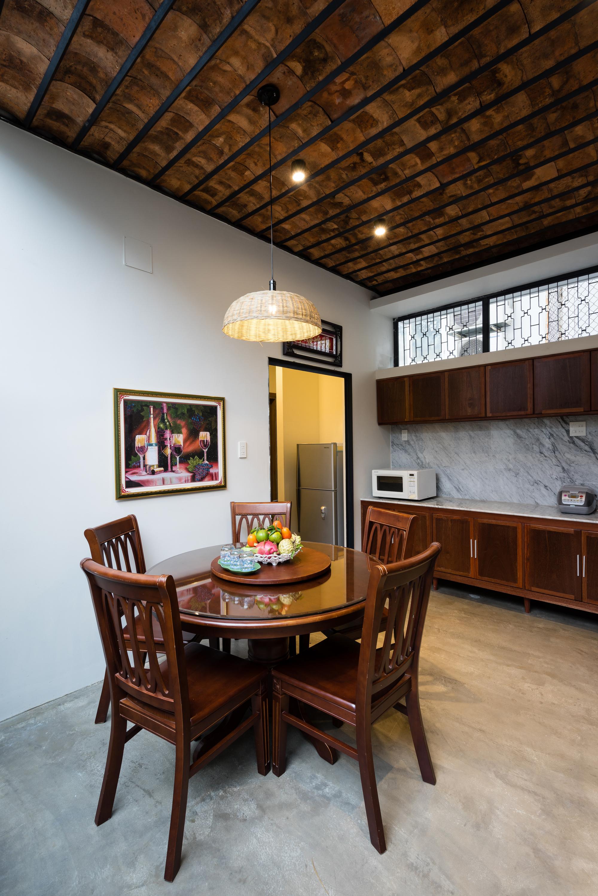 Mô tả Sản phẩm. Với ngân sách hạn chế, hầu hết các vật liệu tái chế của ngôi nhà cũ được tái sử dụng: gạch hoa văn được làm sạch và sử dụng để ốp lát sàn phòng khách, gạch mái cũ của không gian phụ để trang trí trần nhà bếp, khung cấu trúc tầng lửng và ván được tái sử dụng cho tầng trên mới, những chiếc máy tiện cũ, những mái vòm của mái nhà đã trở thành những cái cửa mái hiên.