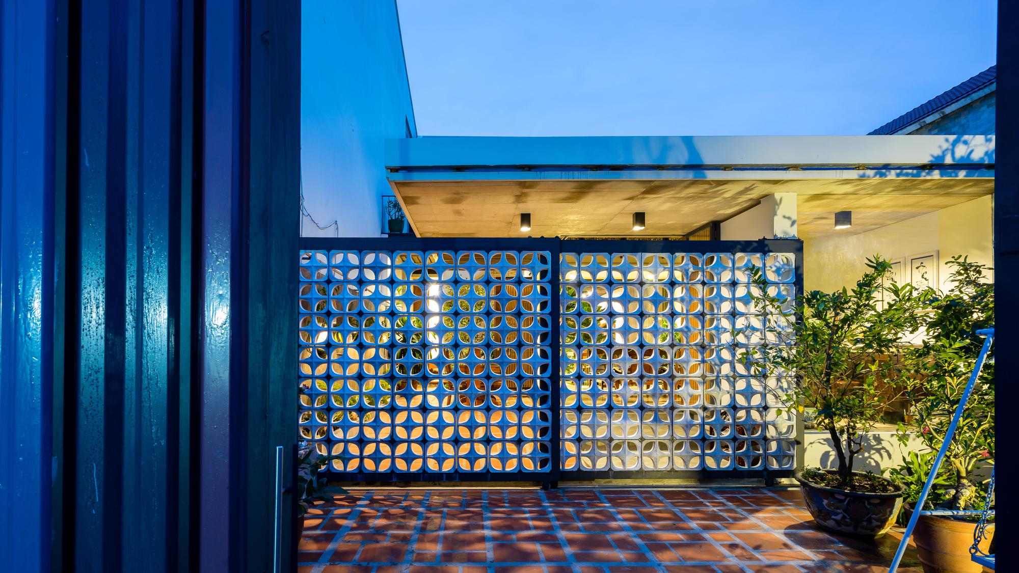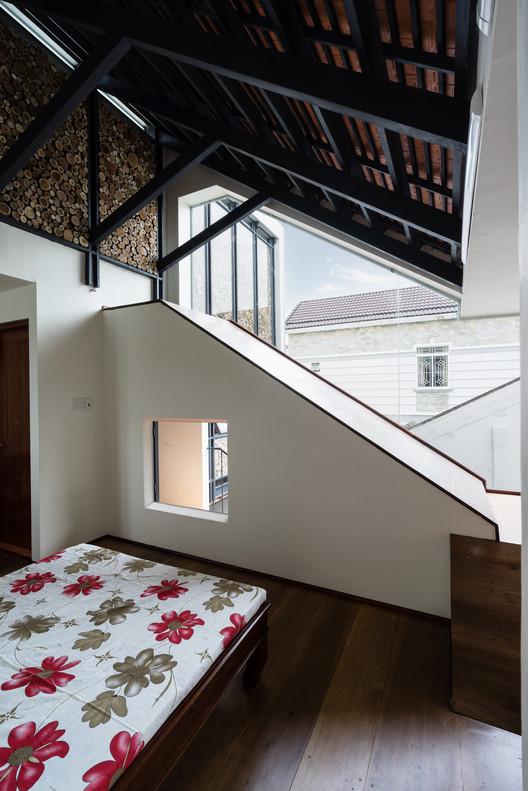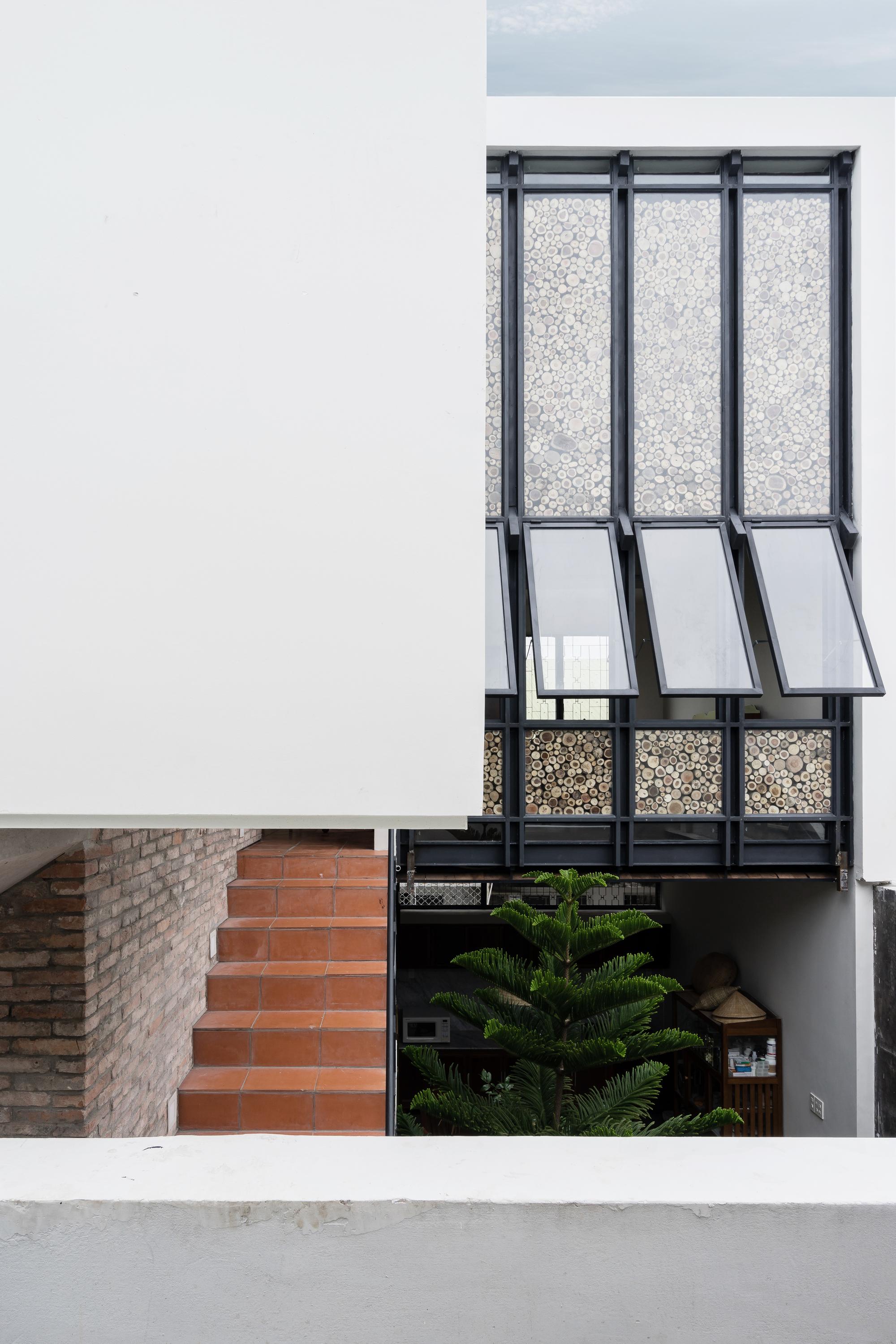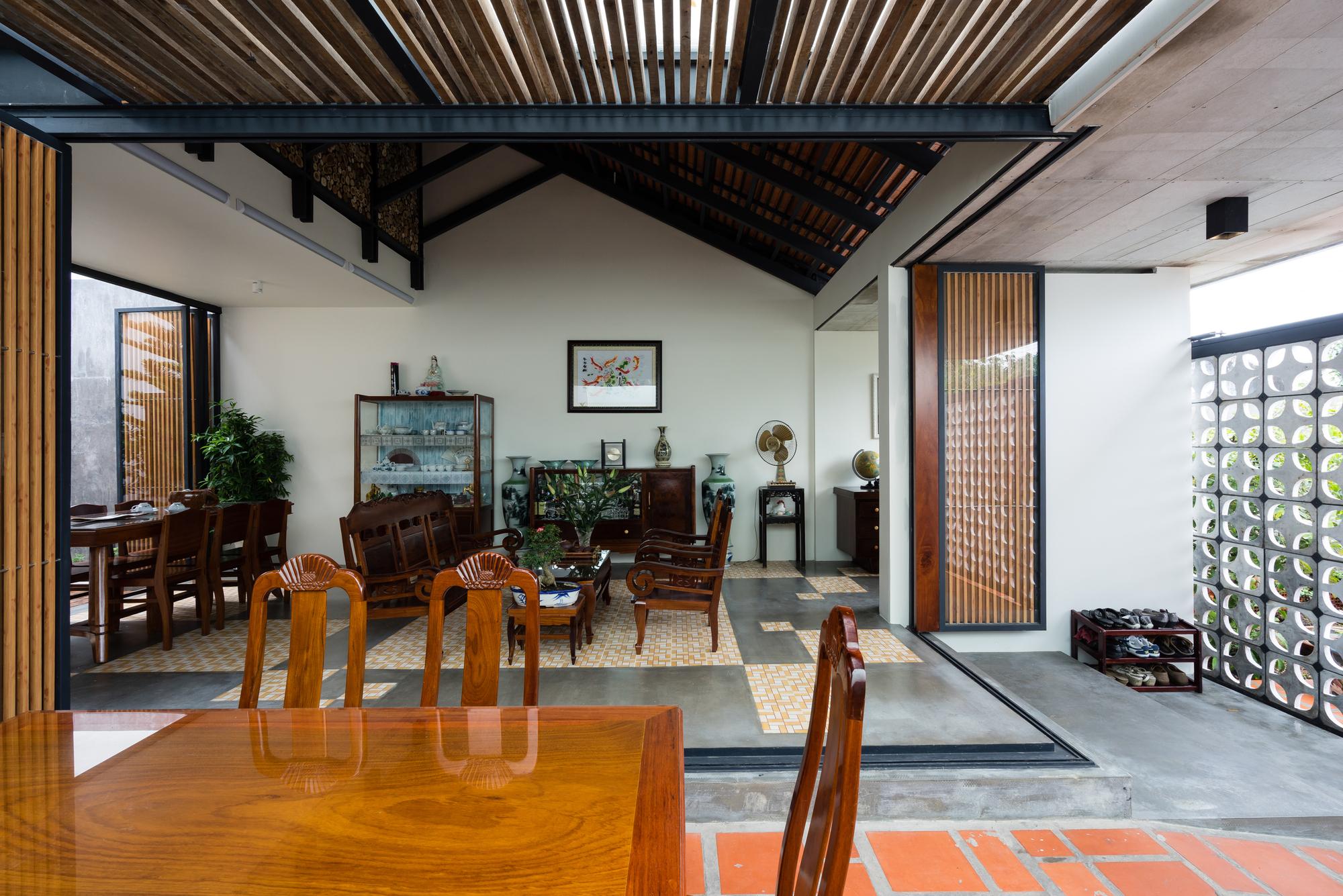 Mô tả Sản phẩm. Với ngân sách hạn chế, hầu hết các vật liệu tái chế của ngôi nhà cũ được tái sử dụng: gạch hoa văn được làm sạch và sử dụng để ốp lát sàn phòng khách, gạch mái cũ của không gian phụ để trang trí trần nhà bếp, khung cấu trúc tầng lửng và ván được tái sử dụng cho tầng trên mới, những chiếc máy tiện cũ, những mái vòm của mái nhà đã trở thành những cái cửa mái hiên.