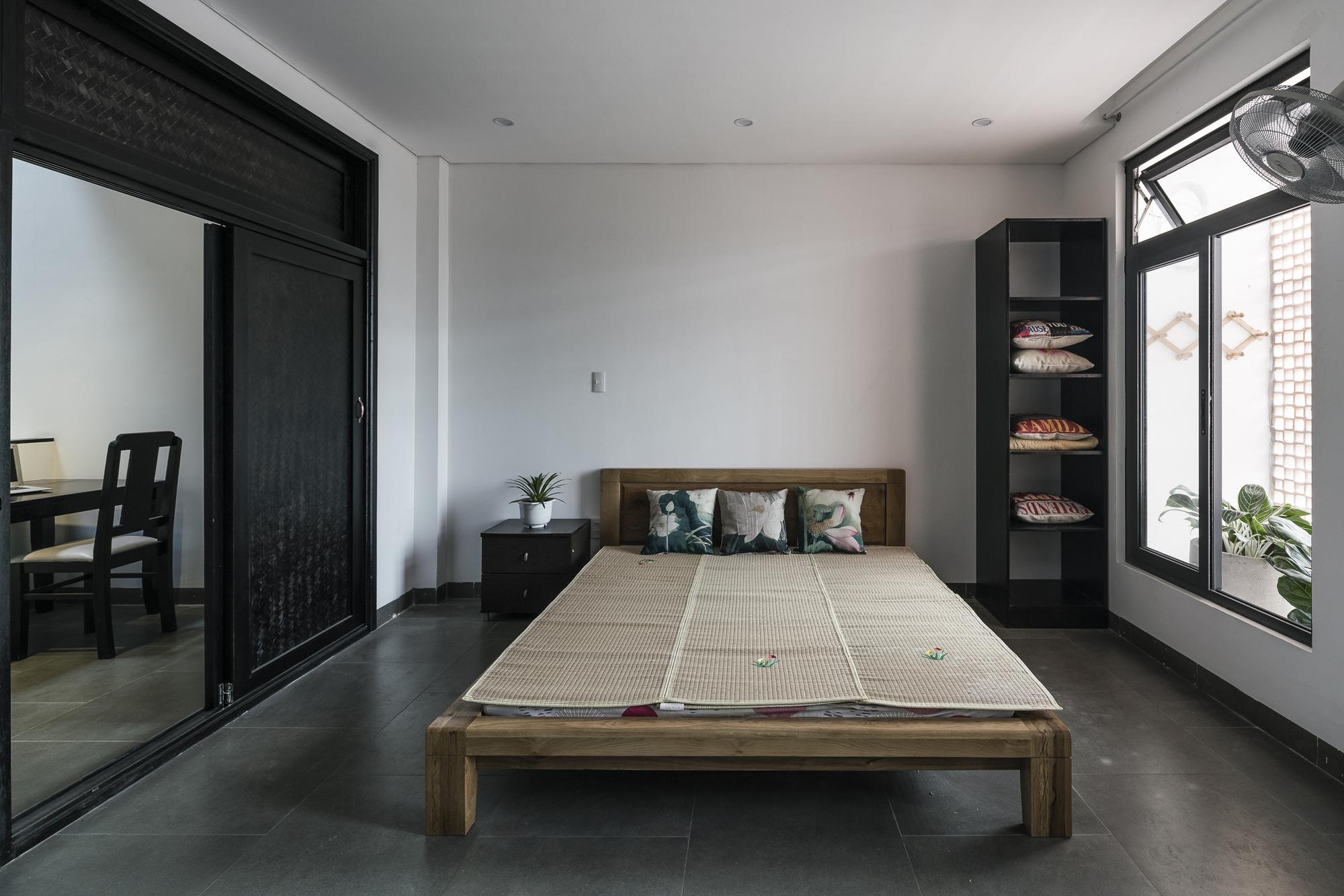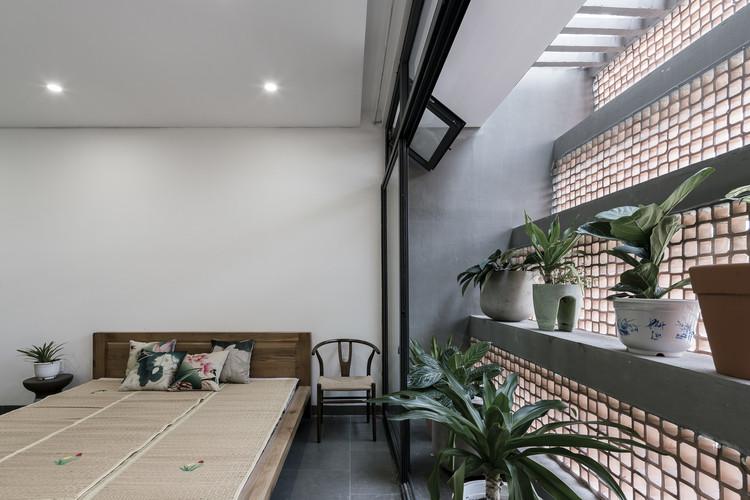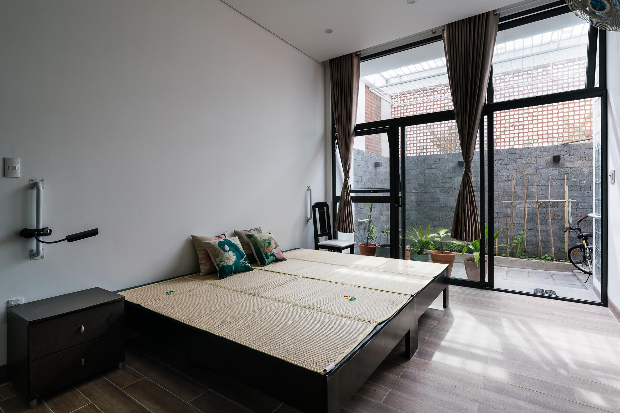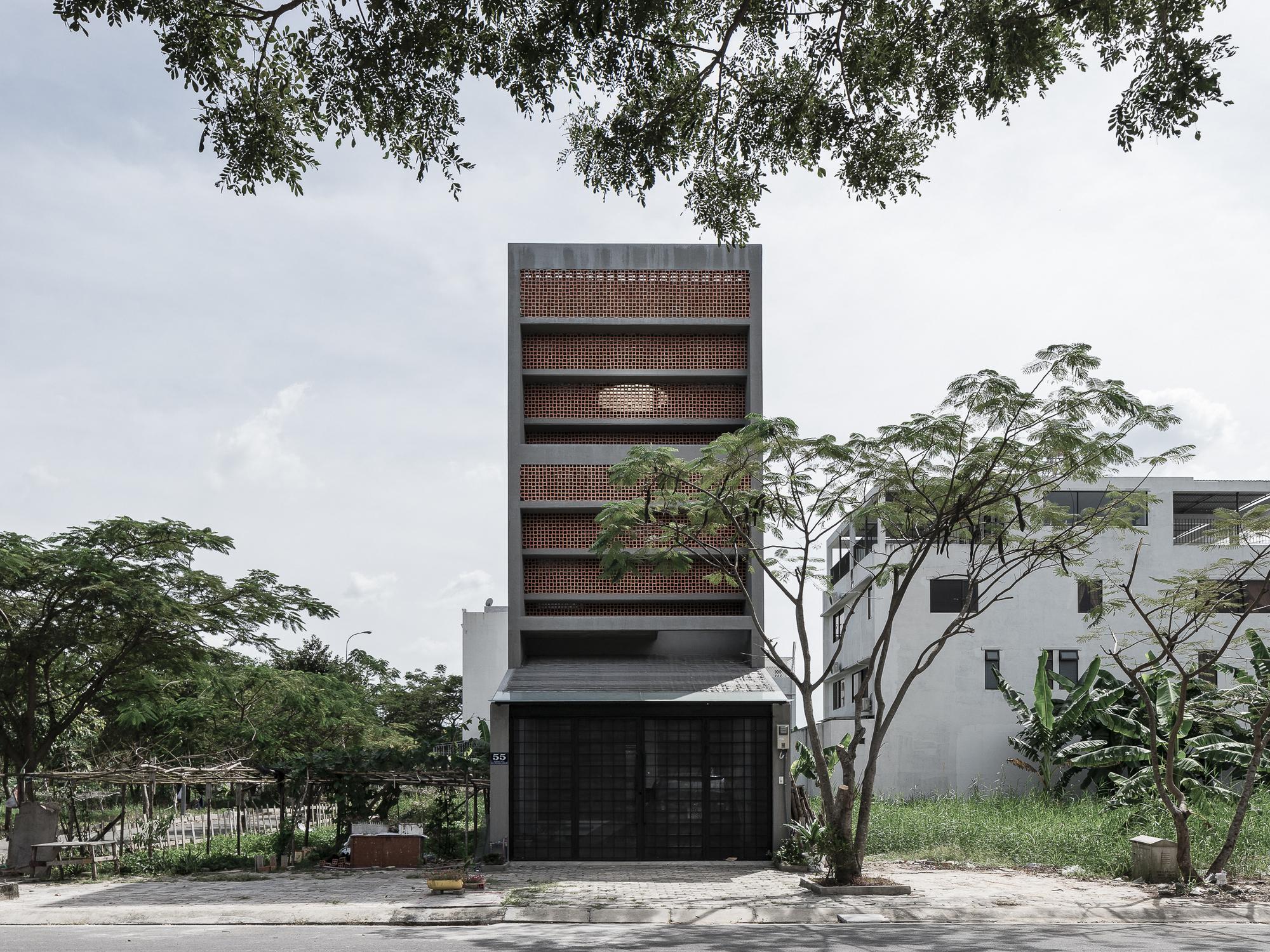Mặt tiền chính của ngôi nhà là dạng dầm bê tông đúc chéo được che bóng từ bên ngoài với chức năng chặn mưa và nắng cũng là một cấp độ đa chức năng để ngồi hoặc đặt chậu cây cảnh bên trong. Sự kết hợp của gạch thông gió và lưới chống côn trùng là một lớp màng bảo vệ, giống như một tấm lưới chống muỗi khổng lồ bao trùm các hoạt động bên trong gia đình.