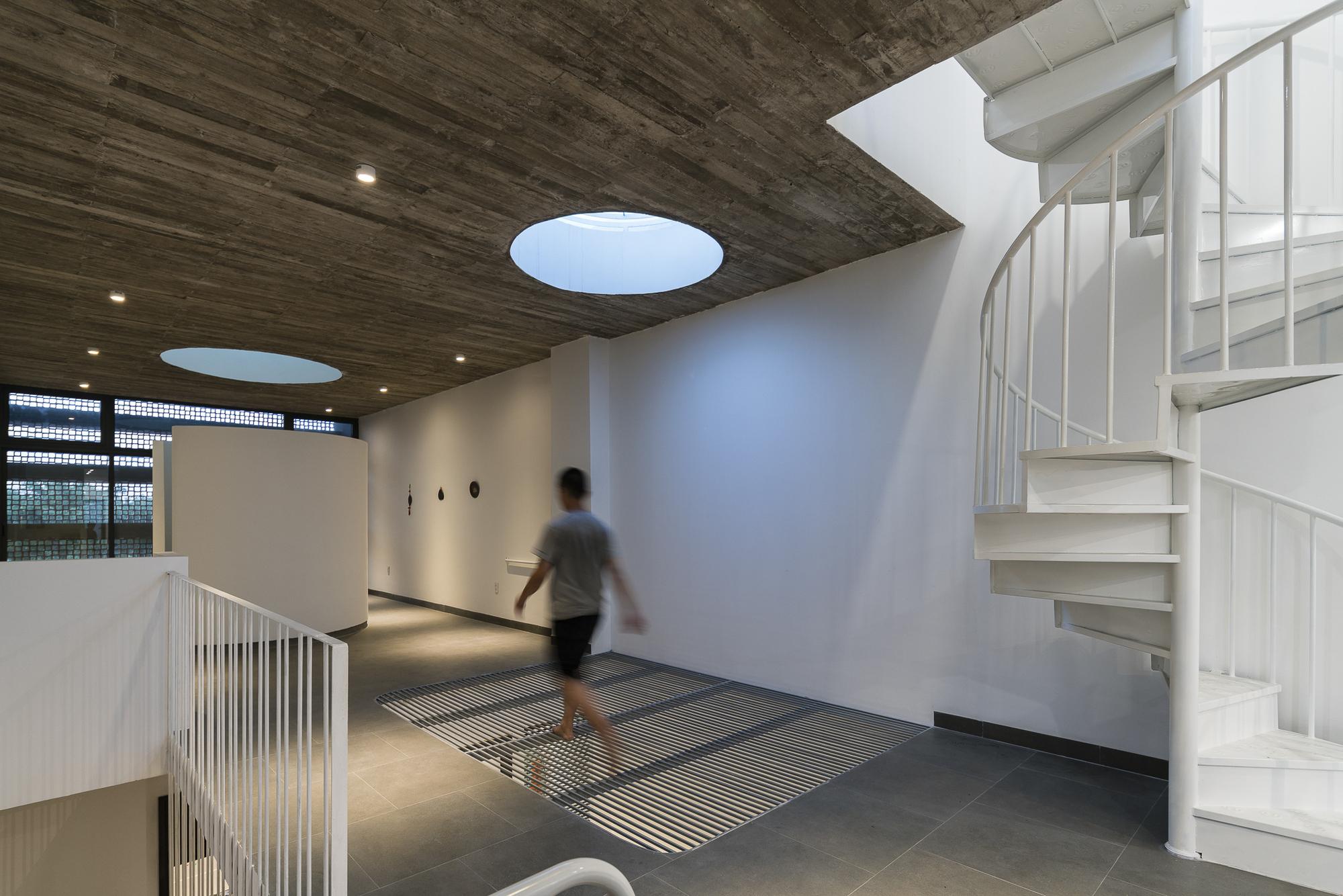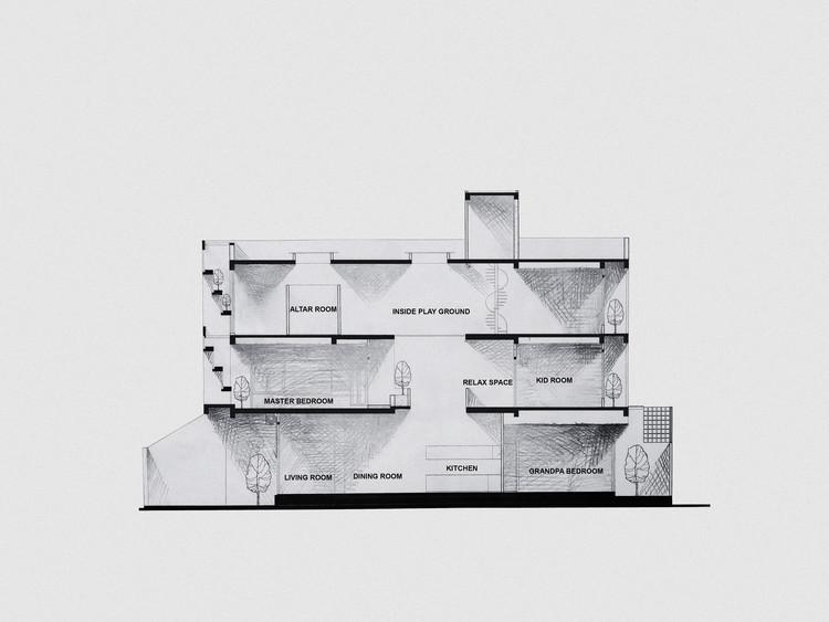 Thiết kế giải phóng không gian của chúng tôi theo chiều ngang ở tầng dưới cùng và trên cùng với sự tiếp tục của cuộc sống và ăn uống, tầng trên cùng hoàn toàn được phát hành là một sân chơi trong nhà và phòng thờ, trở thành một yếu tố hình khối trôi nổi trong không gian rộng lớn.