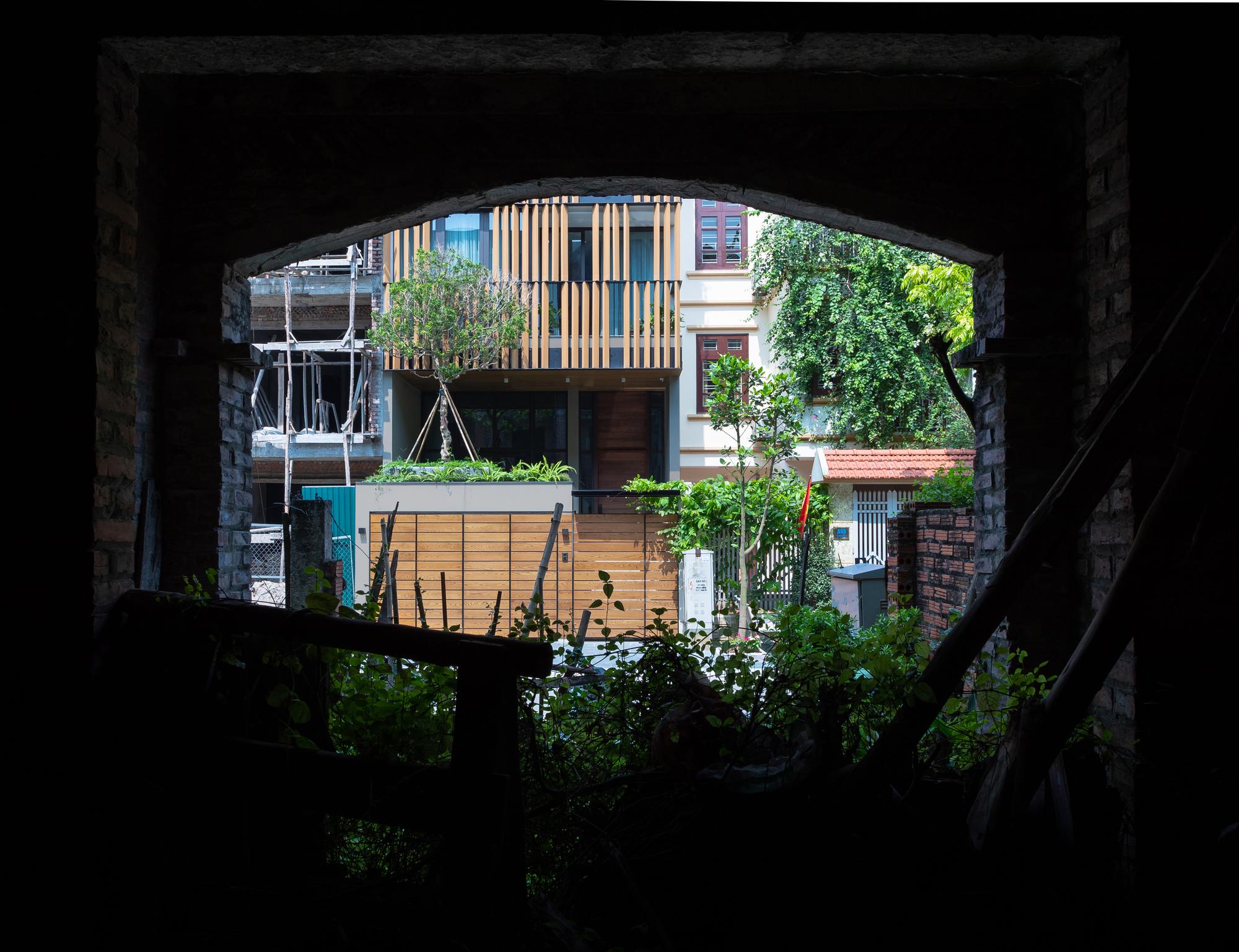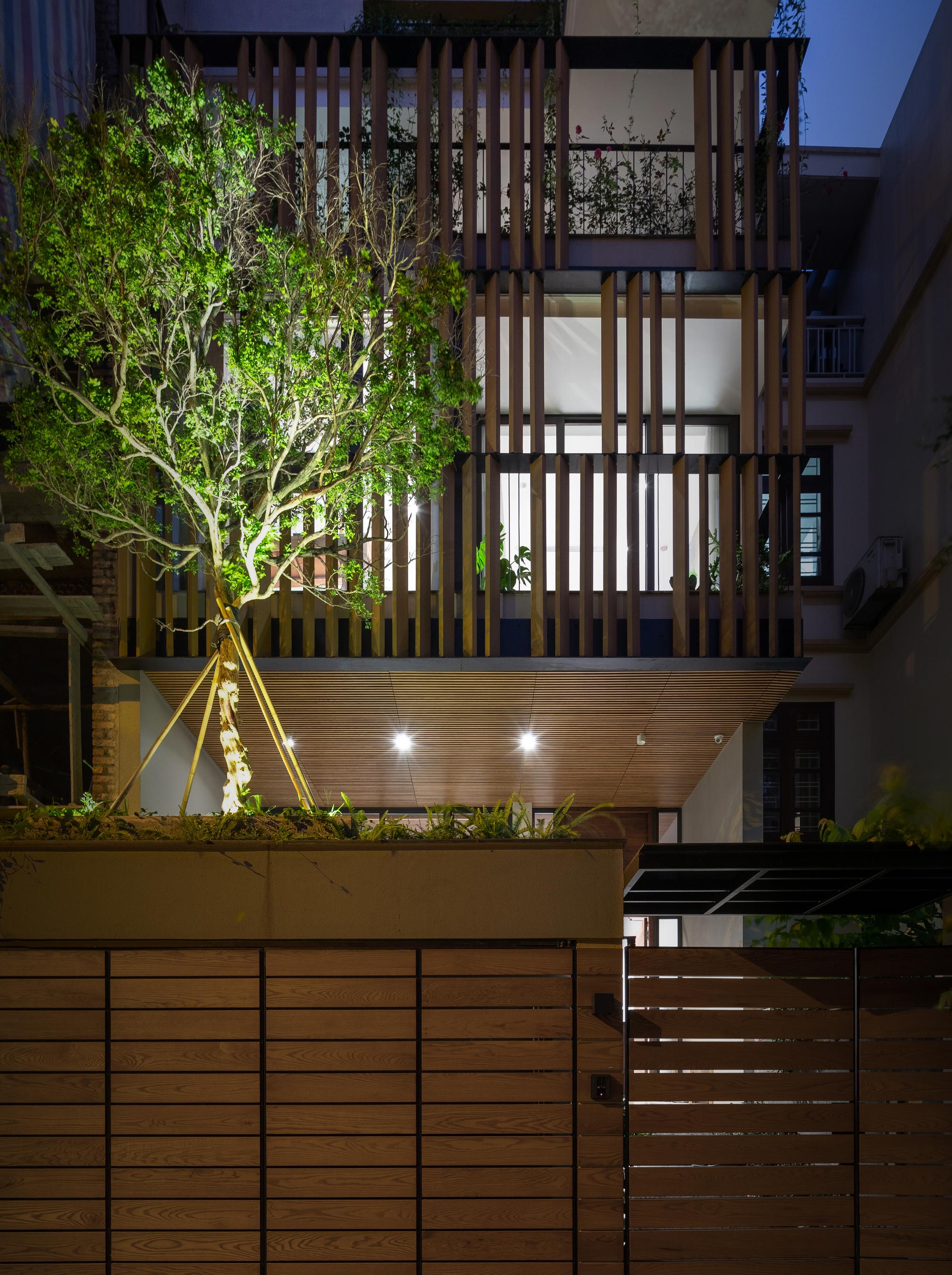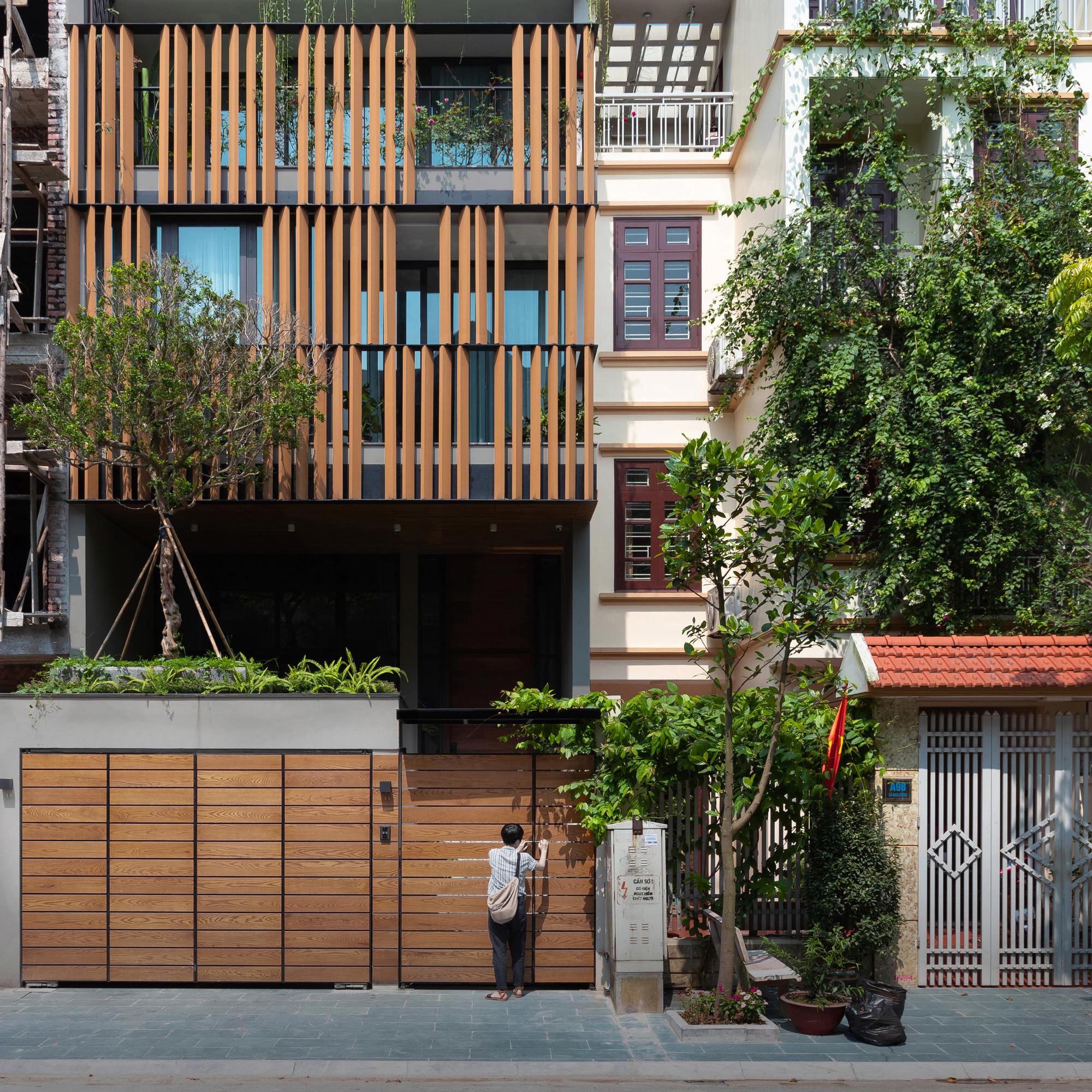 Vị trí Địa điểm Tình hình. Nhà nguyên căn là nhà liền kề, mặt tiền hướng Tây, 2 mặt thoáng đón ánh sáng và gió tự nhiên trước và sau nhà. Giải pháp cải tạo được đưa ra cho công trình là ưu tiên mở ra 2 mặt thoáng, đảm bảo ánh sáng và thông gió tối đa cho ngôi nhà. Các không gian mở đều hướng đến cây xanh. Mặt tiền hướng Tây giáp hệ lam gỗ ngoài tác dụng giảm bức xạ mặt trời còn có vai trò định hình cho công trình. Sân vườn phía trước được nâng lên tạo khoảng trống bên dưới làm gara cho gia đình, có vai trò giảm bức xạ, khói bụi và tiếng ồn đô thị.