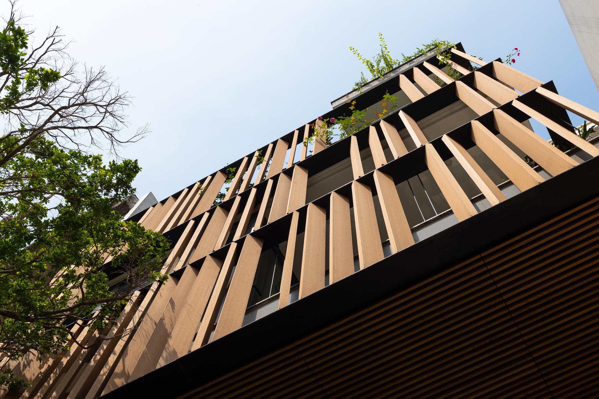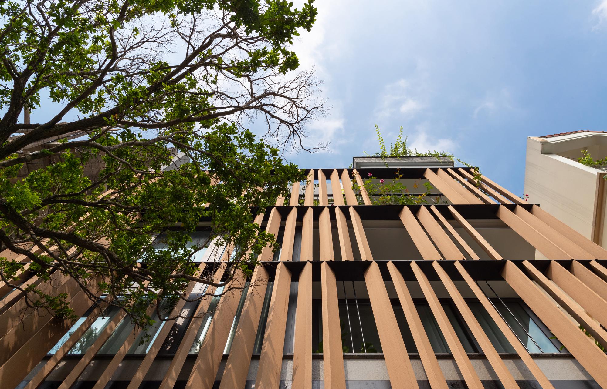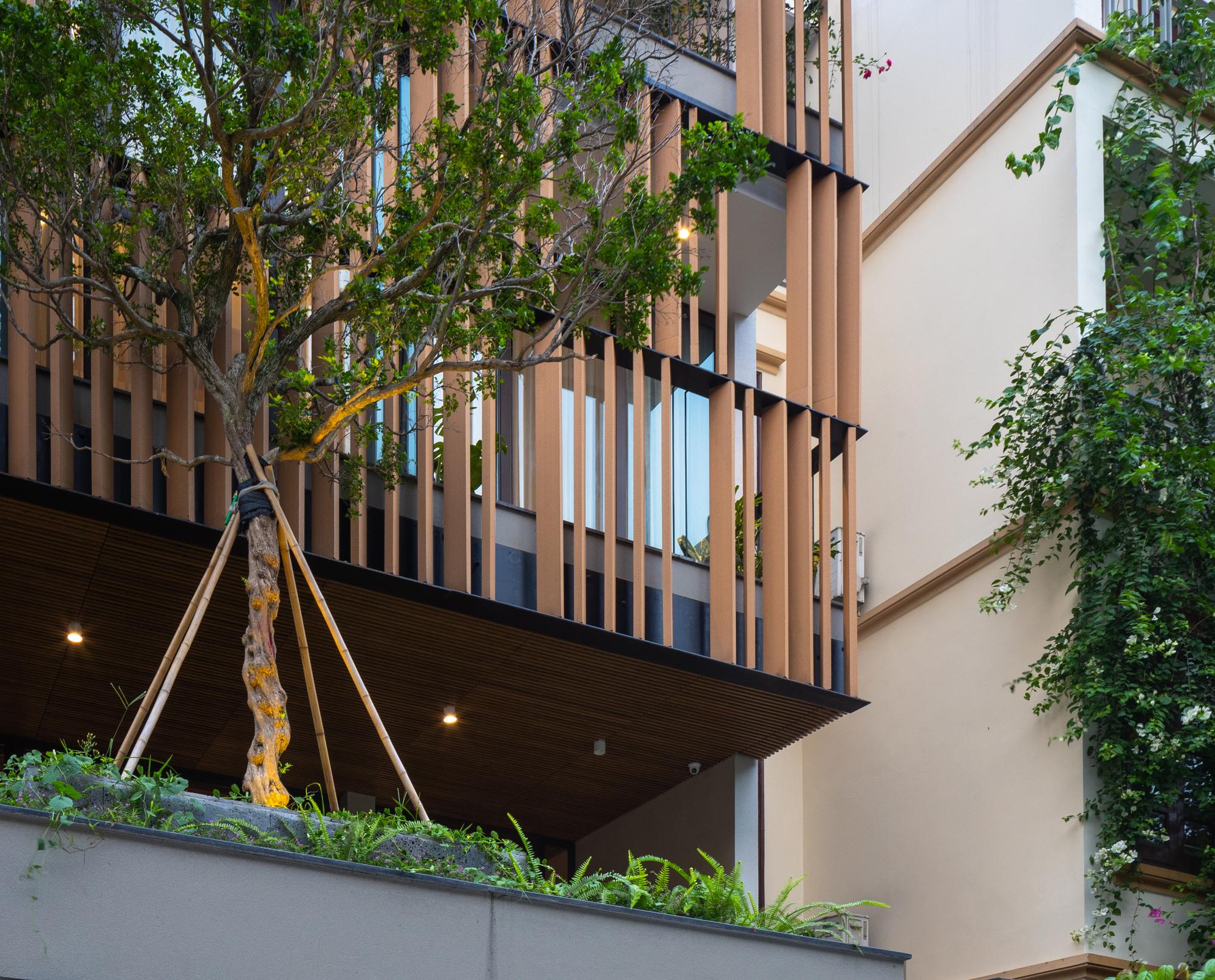 Vị trí Địa điểm Tình hình. Nhà nguyên căn là nhà liền kề, mặt tiền hướng Tây, 2 mặt thoáng đón ánh sáng và gió tự nhiên trước và sau nhà. Giải pháp cải tạo được đưa ra cho công trình là ưu tiên mở ra 2 mặt thoáng, đảm bảo ánh sáng và thông gió tối đa cho ngôi nhà. Các không gian mở đều hướng đến cây xanh. Mặt tiền hướng Tây giáp hệ lam gỗ ngoài tác dụng giảm bức xạ mặt trời còn có vai trò định hình cho công trình. Sân vườn phía trước được nâng lên tạo khoảng trống bên dưới làm gara cho gia đình, có vai trò giảm bức xạ, khói bụi và tiếng ồn đô thị.