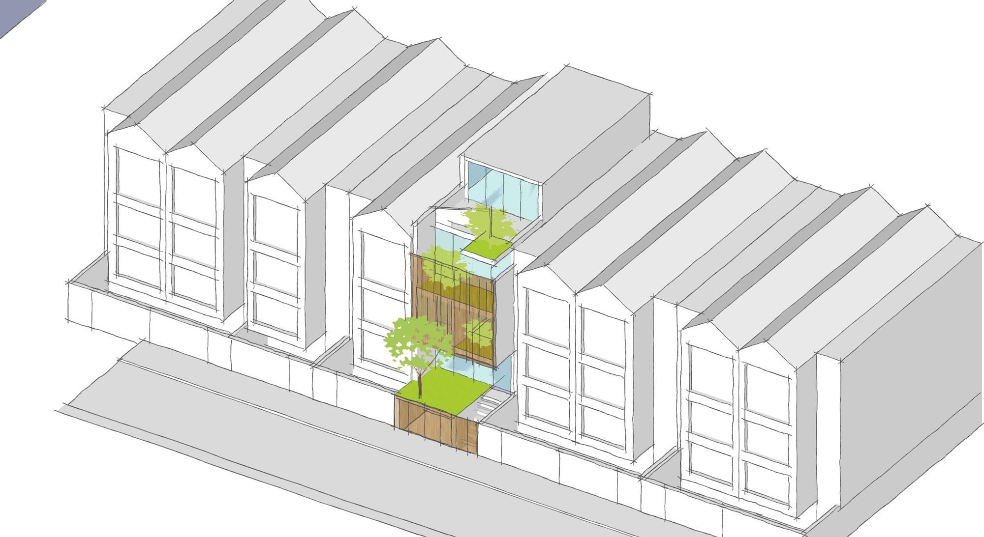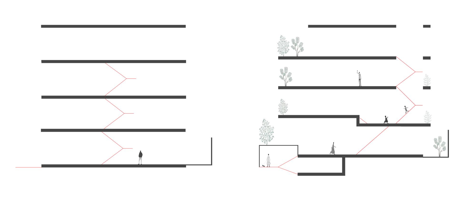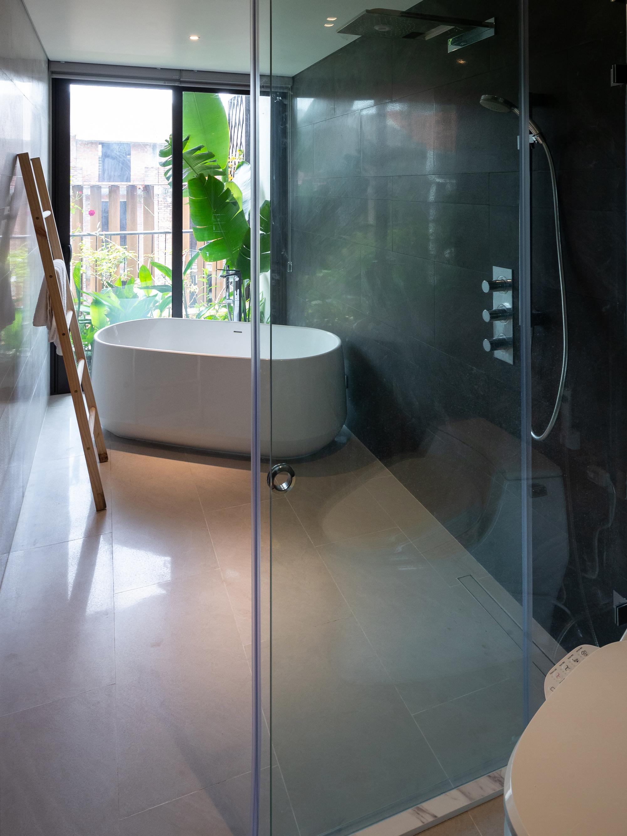 Mở rộng không gian. Cấu trúc không gian cơ bản của nhà ống thông thường thường có dạng: cầu thang đóng vai trò là trục giao thông chính và phần không gian hữu ích còn lại sẽ được phân bổ đều cho phía trước và phía sau nhà. Cấu trúc này tuy đơn giản, dễ trùng lặp nhưng khi đặt vào những tình huống và yêu cầu cụ thể của chủ nhà sẽ không phù hợp do sự nhàm chán của nó. Do cấu trúc nhà ống thường hẹp về chiều ngang nên việc mở rộng hay thu hẹp không gian theo chiều cao sẽ diễn ra để tăng thêm phần thú vị cho ngôi nhà.
