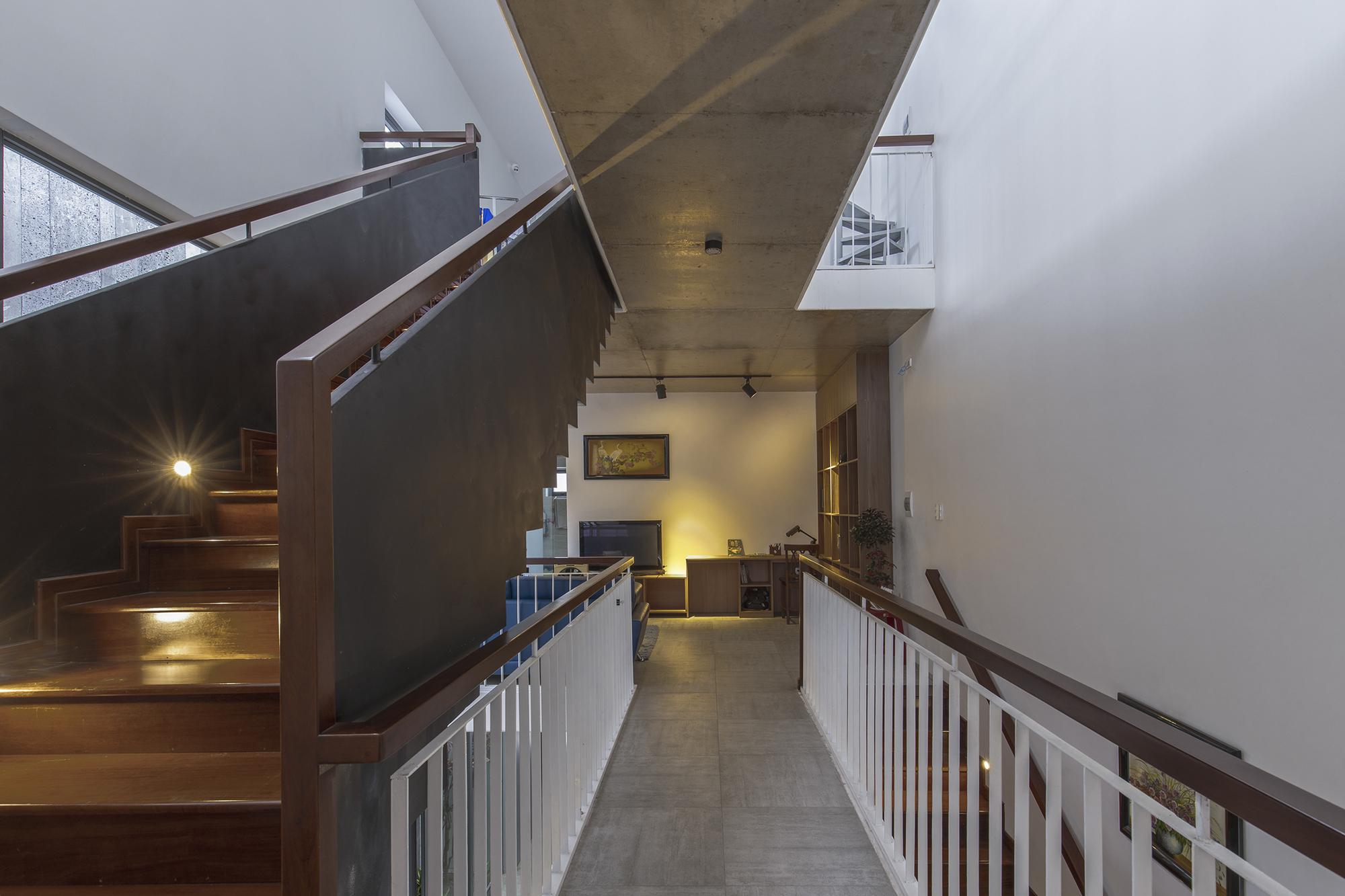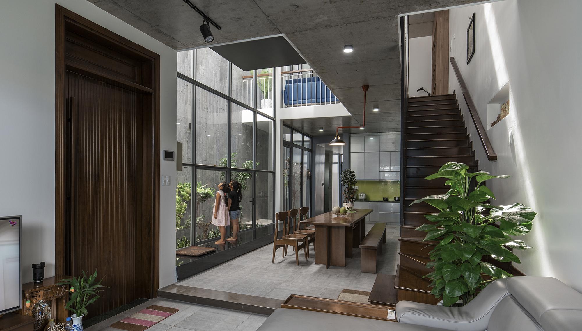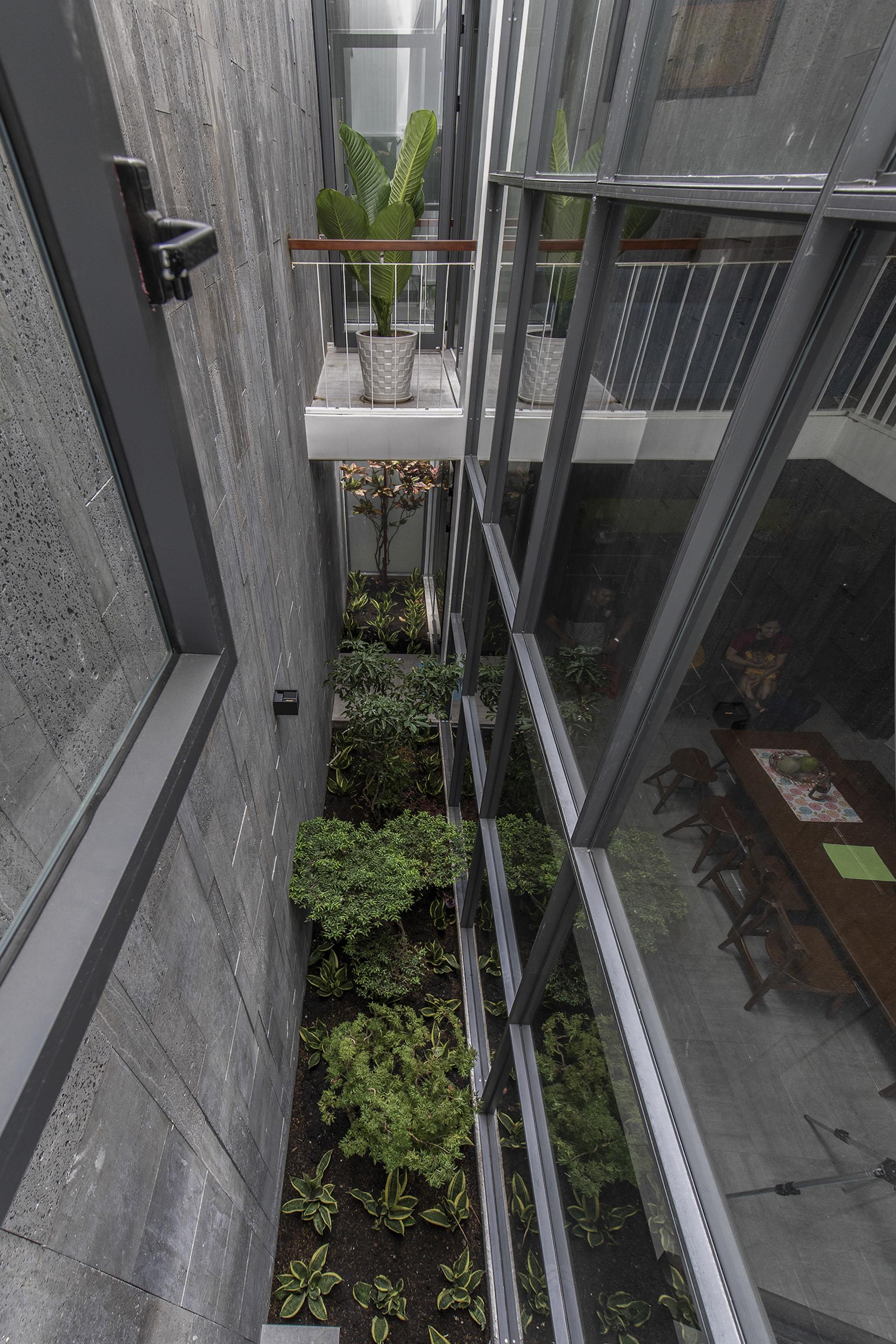 Qua một hành lang hẹp đi vào trong nhà mở ra một không gian liên hoàn theo trục ngang và trục dọc của lõi công trình, xung quanh là các phòng ngủ riêng ngăn cách trong và ngoài nhà. Để tận dụng điều kiện tự nhiên, chuỗi không gian từ phòng khách đến phòng ăn và phòng bếp được kết nối với một khu vườn nhỏ xen kẽ mở rộng làm hành lang thông gió cung cấp không khí trong lành và ánh sáng mặt trời cho toàn bộ không gian. chỉ là một yếu tố tương đối. Đây là một điểm cần thiết trong bối cảnh các thành phố thuộc đới khí hậu nhiệt đới ẩm.