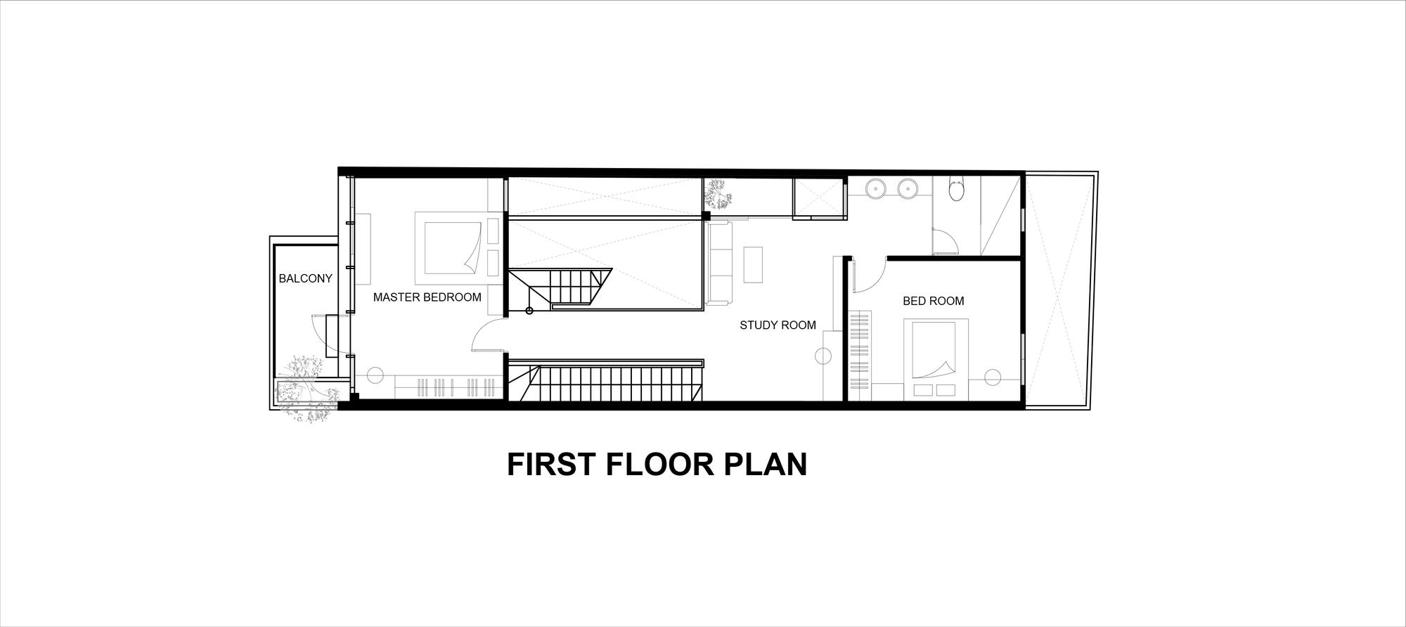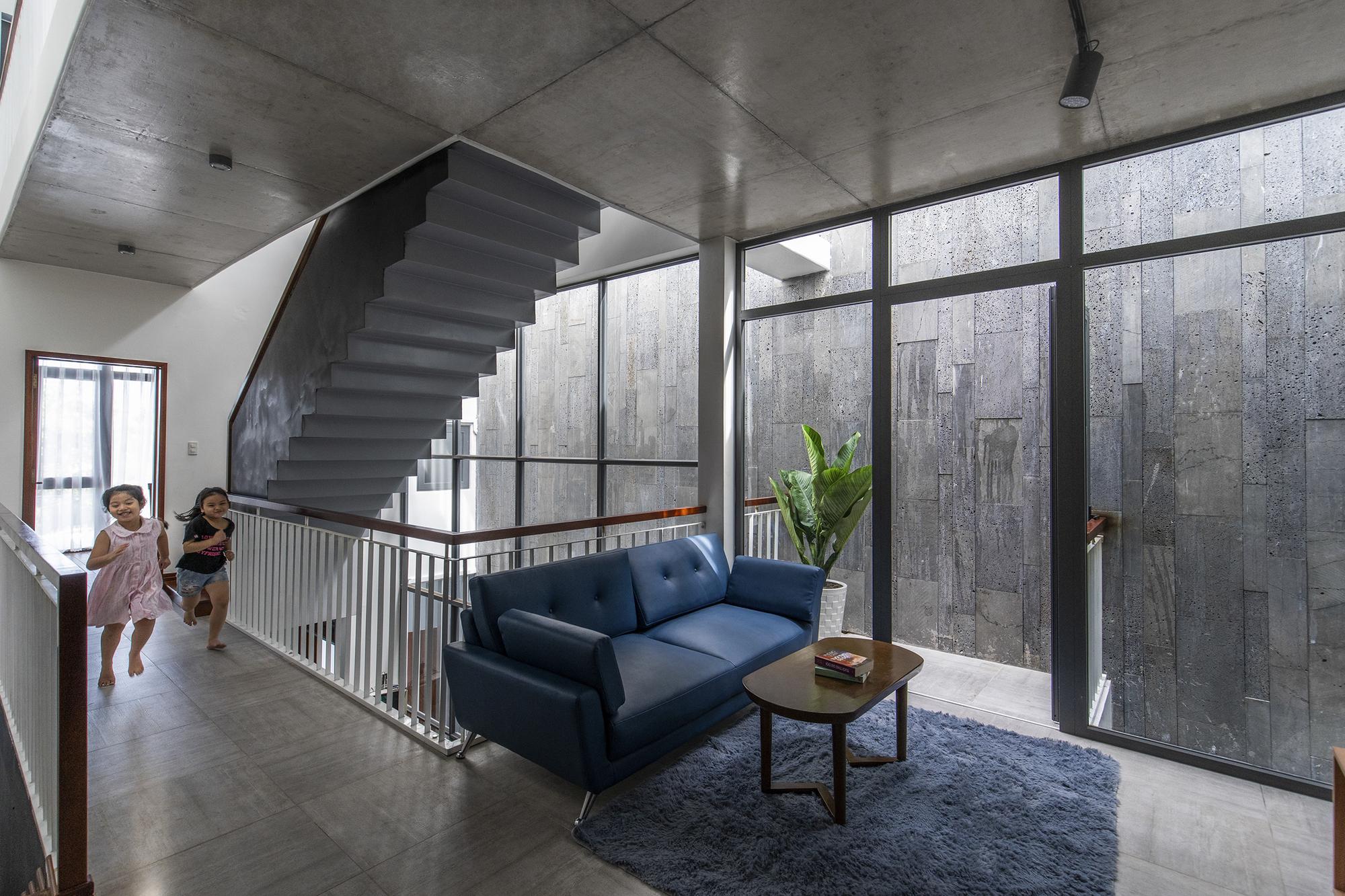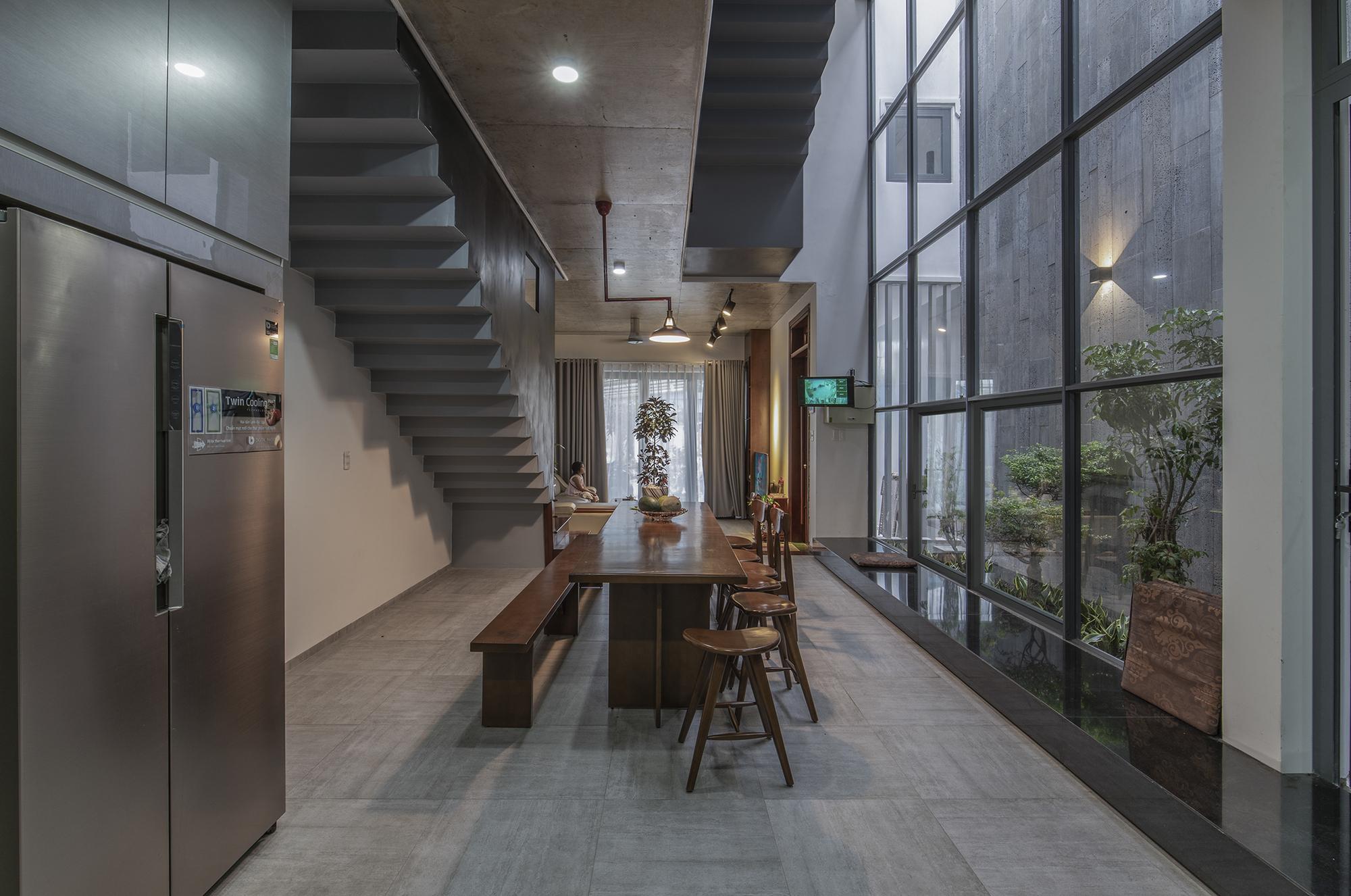 Qua một hành lang hẹp đi vào trong nhà mở ra một không gian liên hoàn theo trục ngang và trục dọc của lõi công trình, xung quanh là các phòng ngủ riêng ngăn cách trong và ngoài nhà. Để tận dụng điều kiện tự nhiên, chuỗi không gian từ phòng khách đến phòng ăn và phòng bếp được kết nối với một khu vườn nhỏ xen kẽ mở rộng làm hành lang thông gió cung cấp không khí trong lành và ánh sáng mặt trời cho toàn bộ không gian. chỉ là một yếu tố tương đối. Đây là một điểm cần thiết trong bối cảnh các thành phố thuộc đới khí hậu nhiệt đới ẩm.