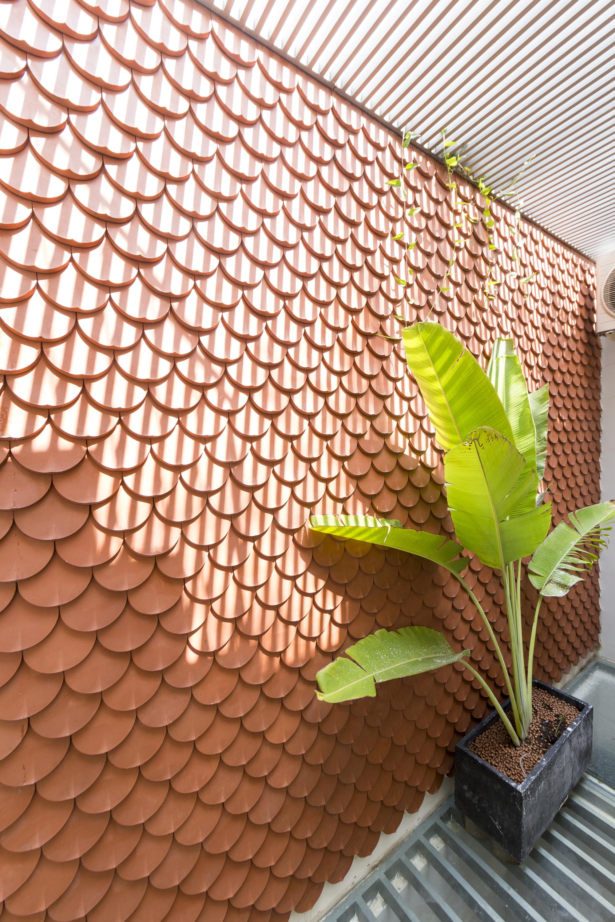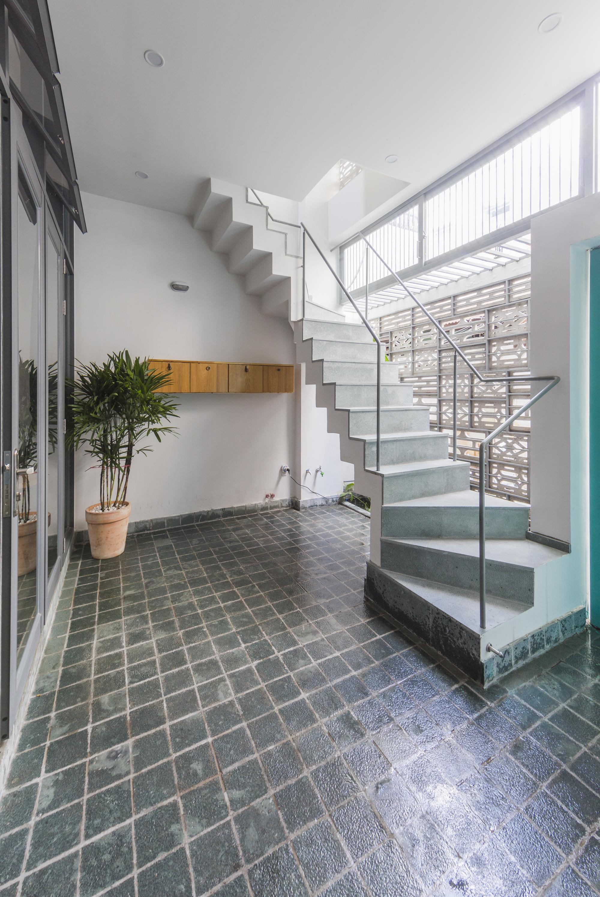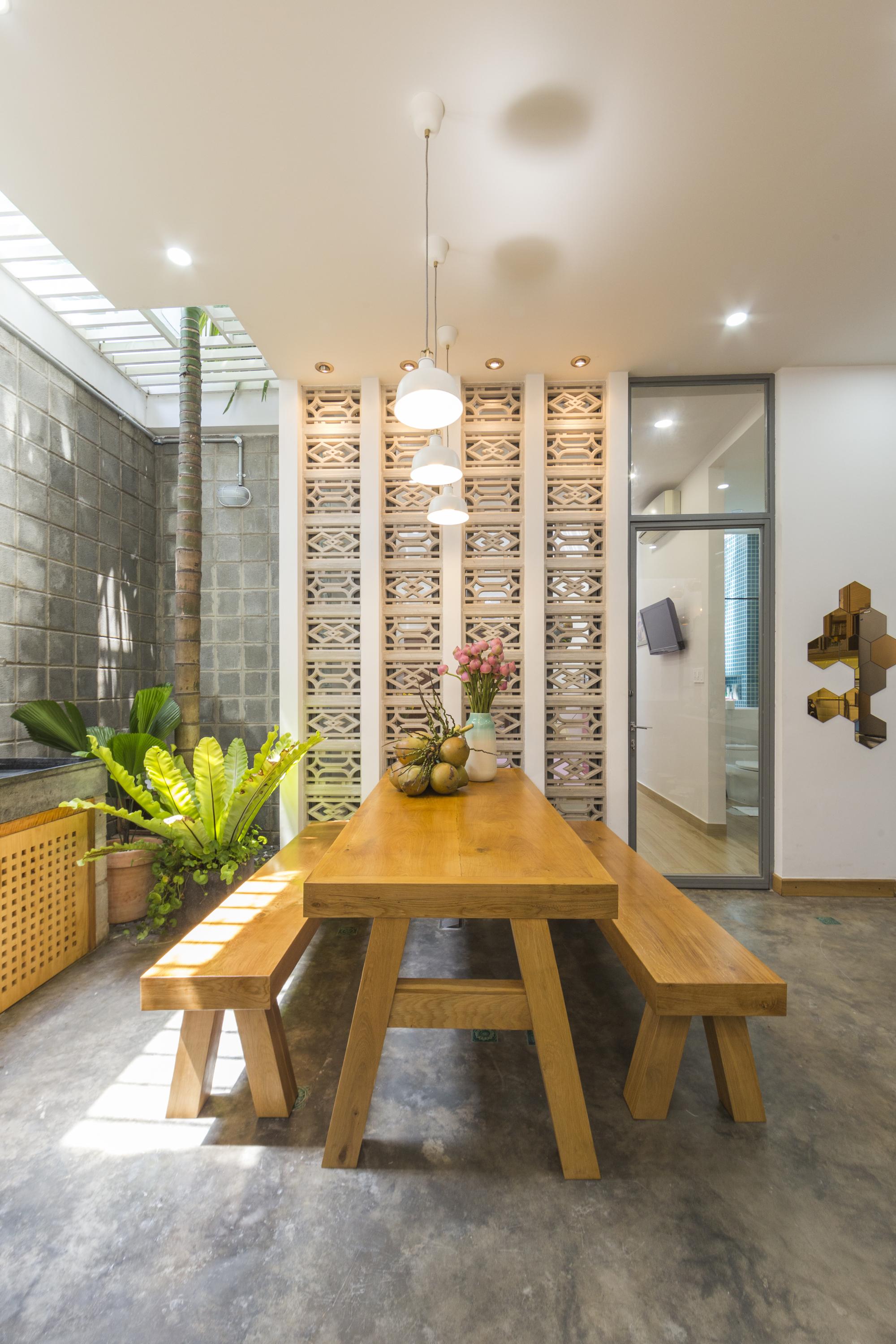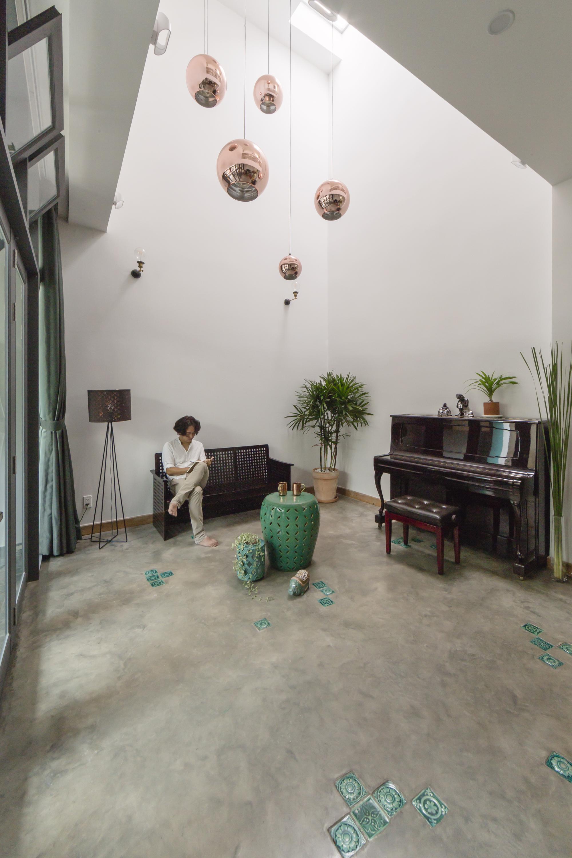 Là một nhà thiết kế, chủ sở hữu đóng góp rất lớn vào thiết kế nội thất, hoàn thành ngôi nhà của riêng mình với một bảng màu mộc mạc của sơn trắng, xi măng xám, và bê tông cùng với đất nung đỏ và đá. Một tính năng quan trọng khác của thiết kế là giếng trời rải rác với cây xanh. Những thứ này lấp đầy không gian bằng ánh sáng tự nhiên, một phương tiện kết hợp tất cả các màu sắc và vật liệu khác nhau của thiết kế.
